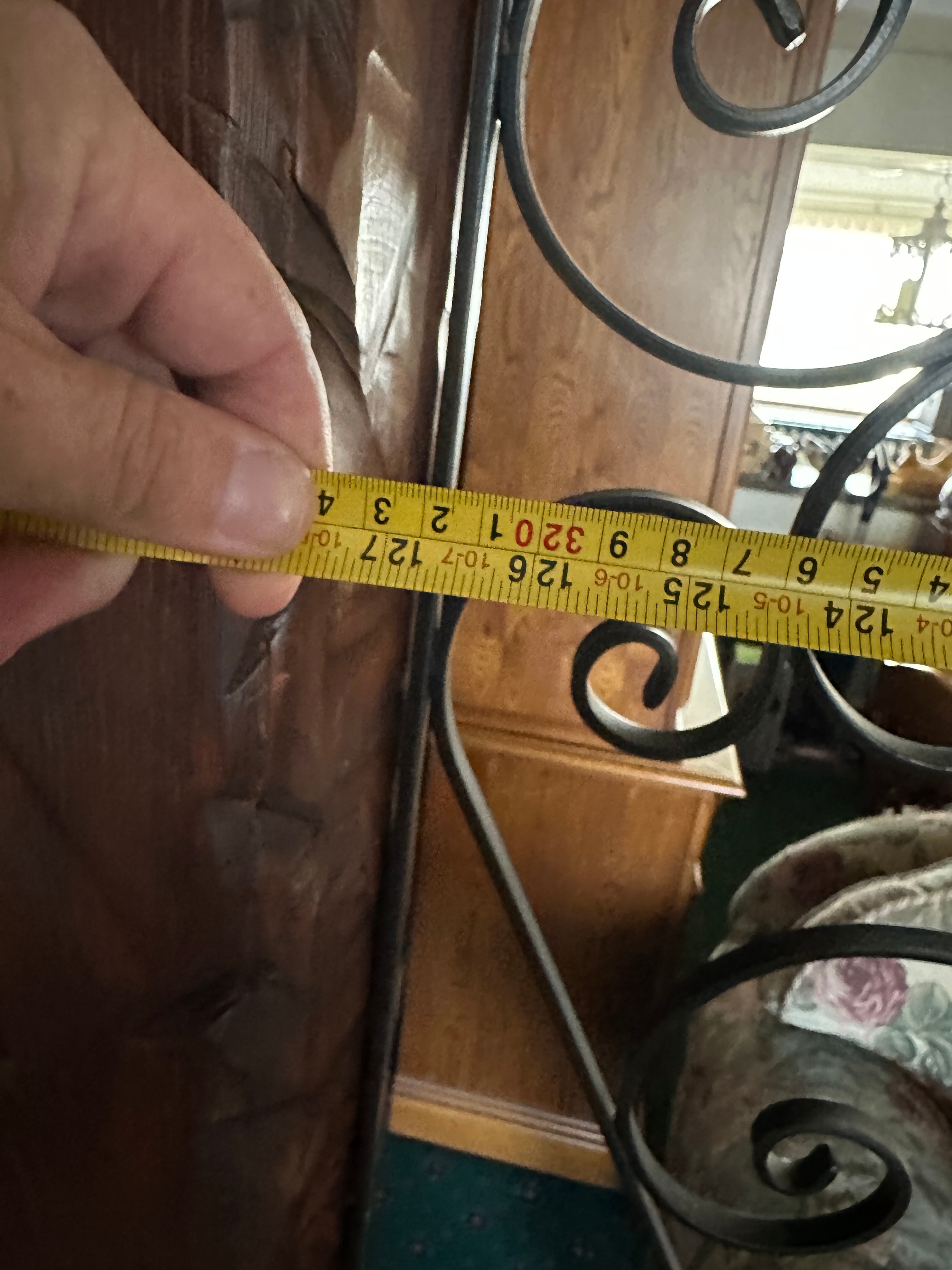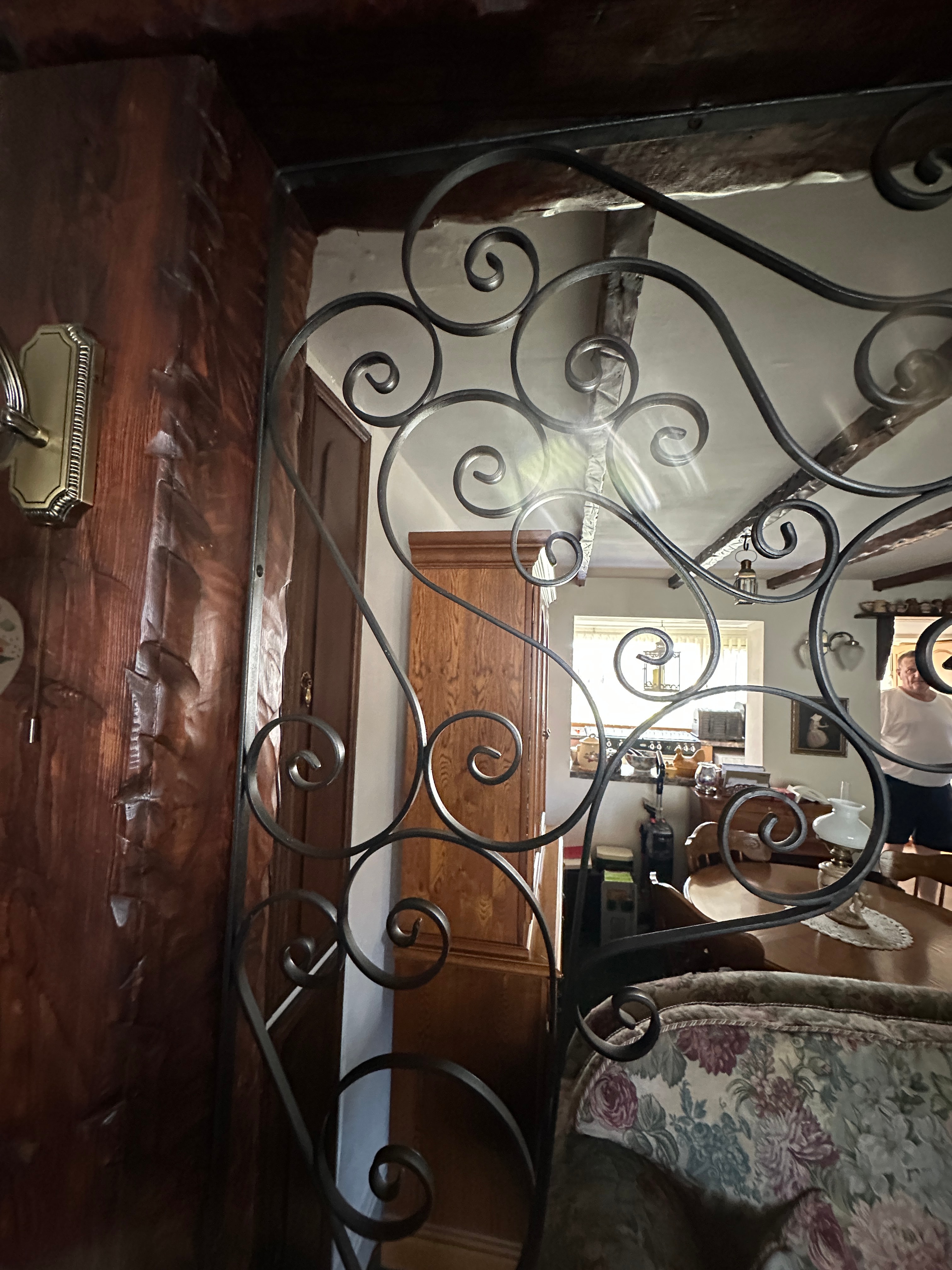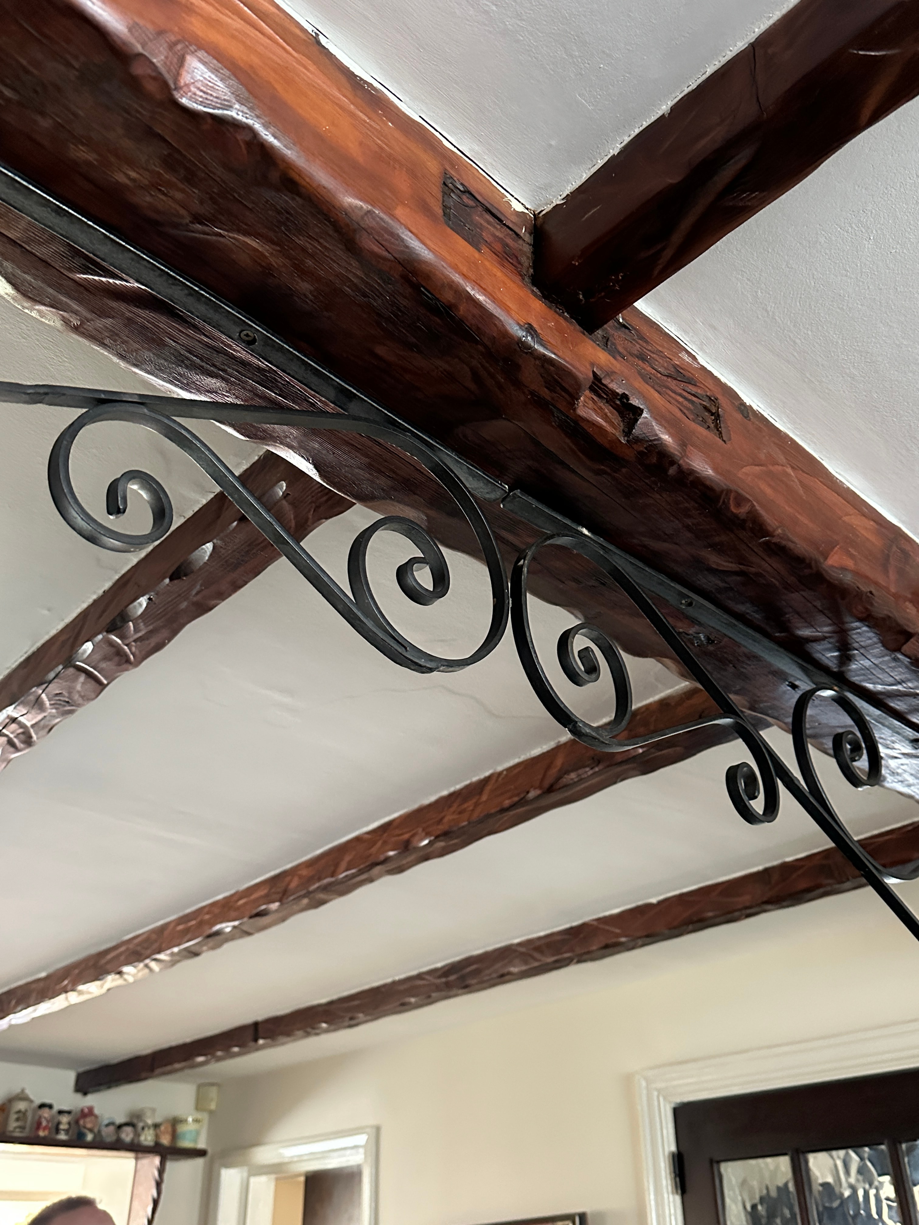 A decorative wrought iron room divider or screen, featuring an ornate, scrolled, and curvilinear design in a traditional, possibly Baroque or Rococo-inspired style. The ironwork is finished in a dark, likely patinated or painted, hue. It is currently installed spanning an interior opening, fixed to a substantial rustic wooden beam, suggesting its use in a classic or cottage-style interior. No specific manufacturer’s marks or inscriptions are visible on the ironwork.