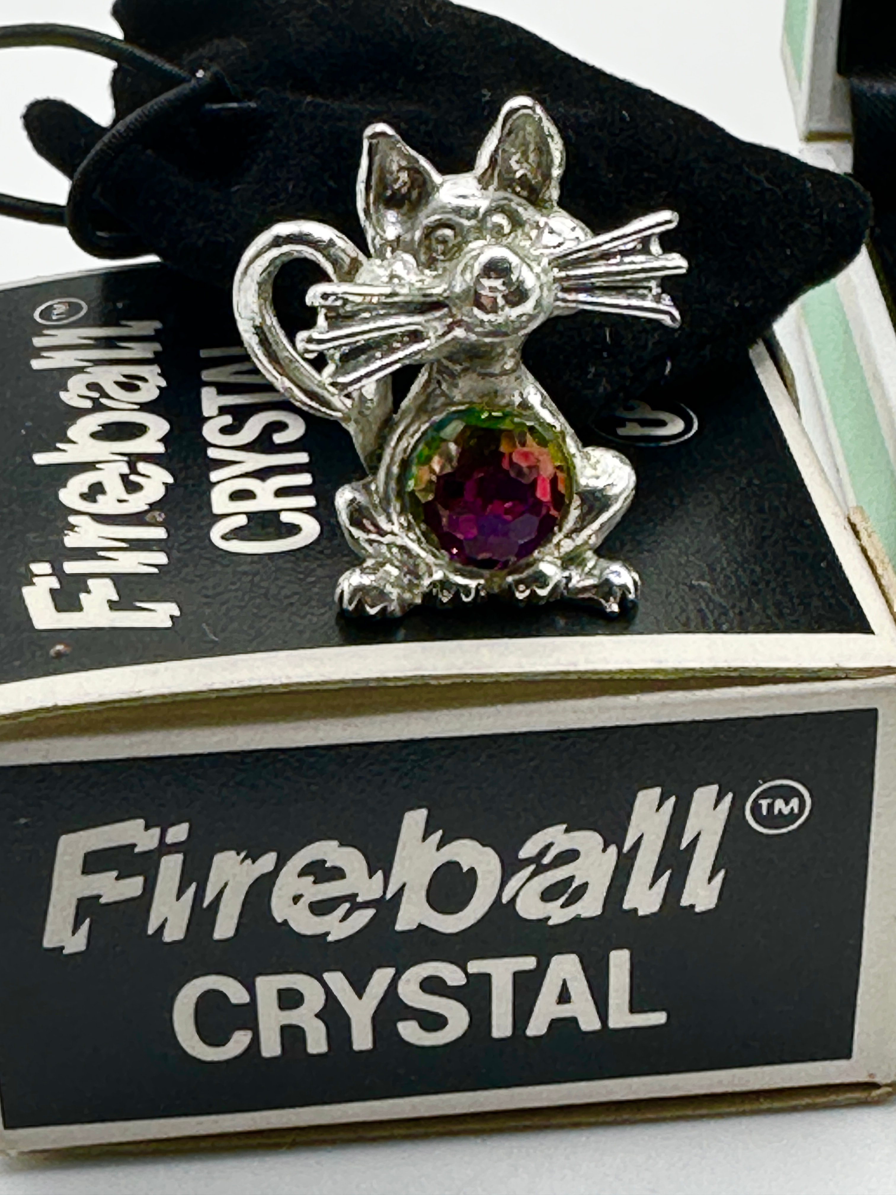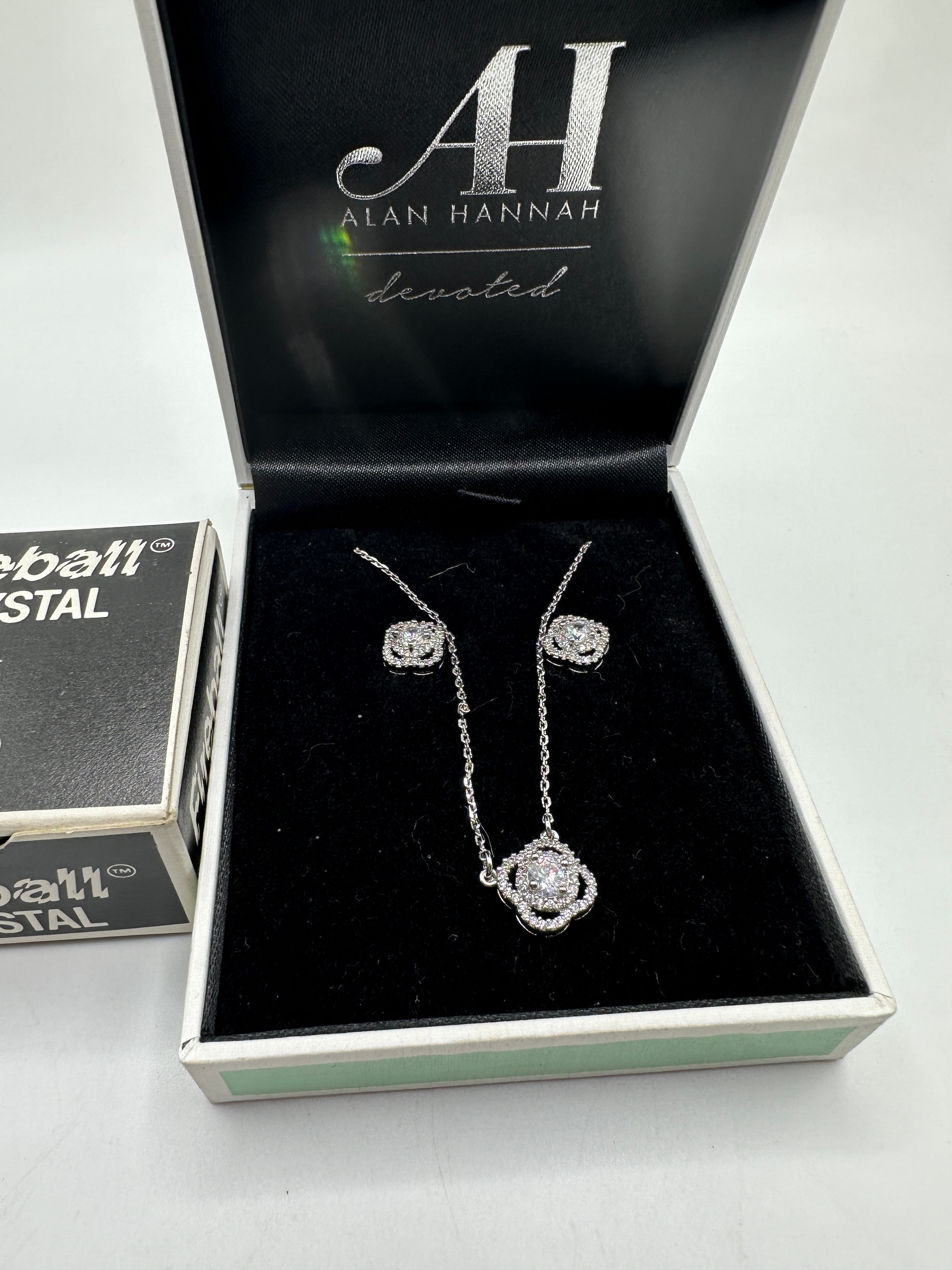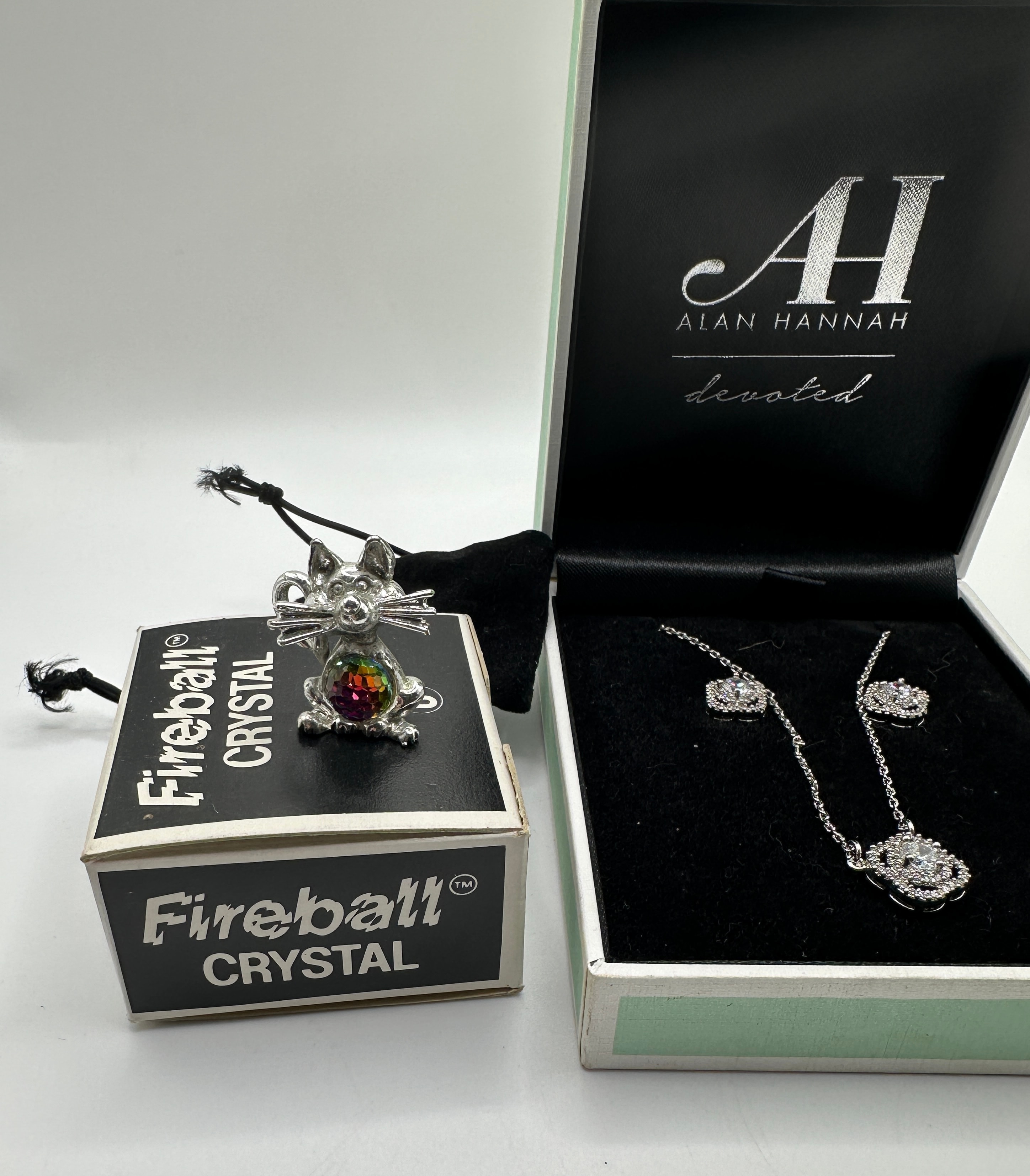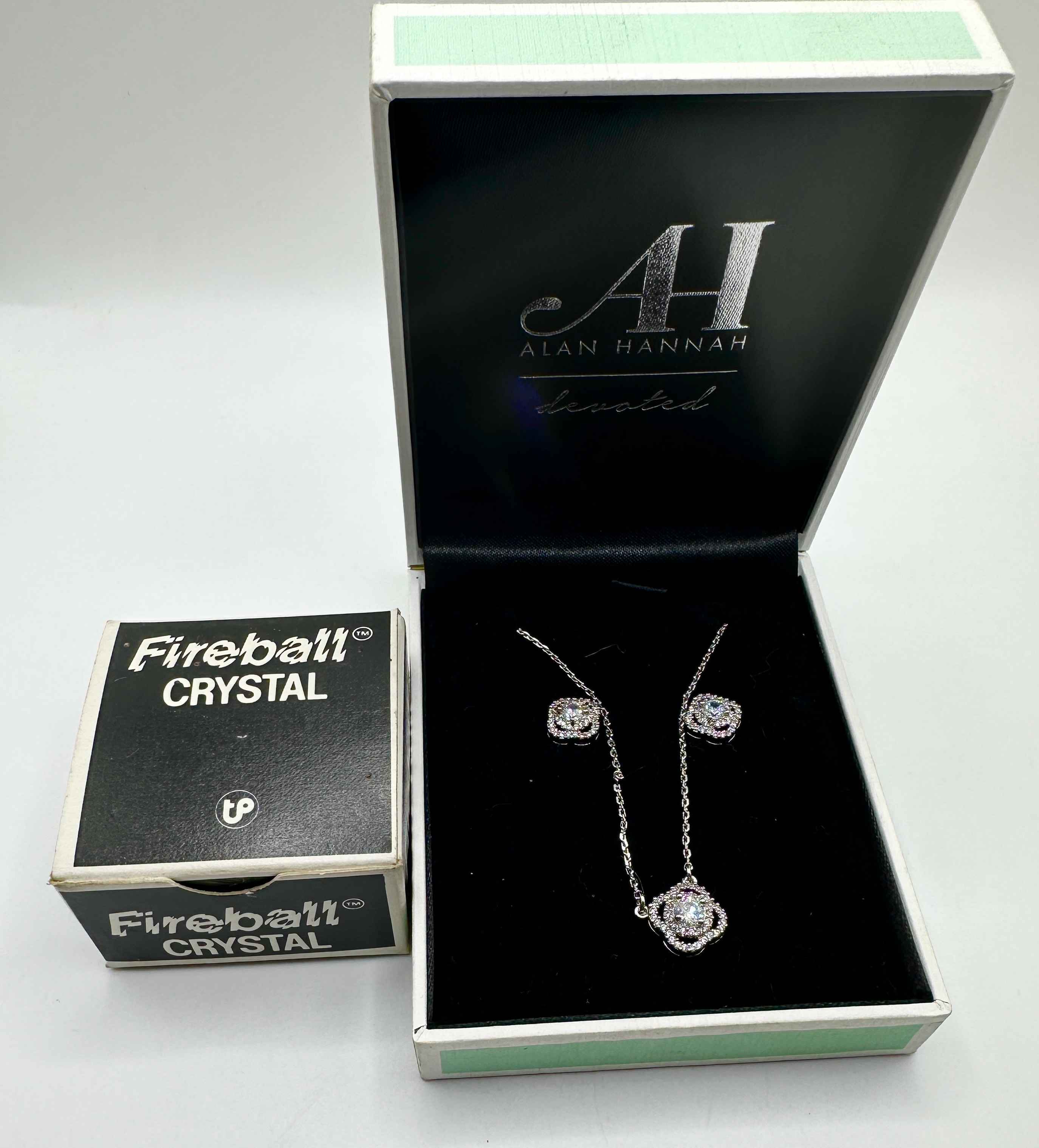 An Alan Hannah devoted silver-tone metal jewelry set, comprising a necklace with a crystal cluster pendant resembling a clover, and matching stud earrings. All pieces are set with clear faceted stones. The set is presented in its original white and mint green hinged presentation box. Accompanying this set is a small black and white retail box marked ‘Fireball™ CRYSTAL’ and displaying an ‘UP’ logo. Resting on this box is an additional silver-tone figural cat brooch or charm, featuring a prominent multi-faceted crystal exhibiting iridescent purple, green, and orange tones.