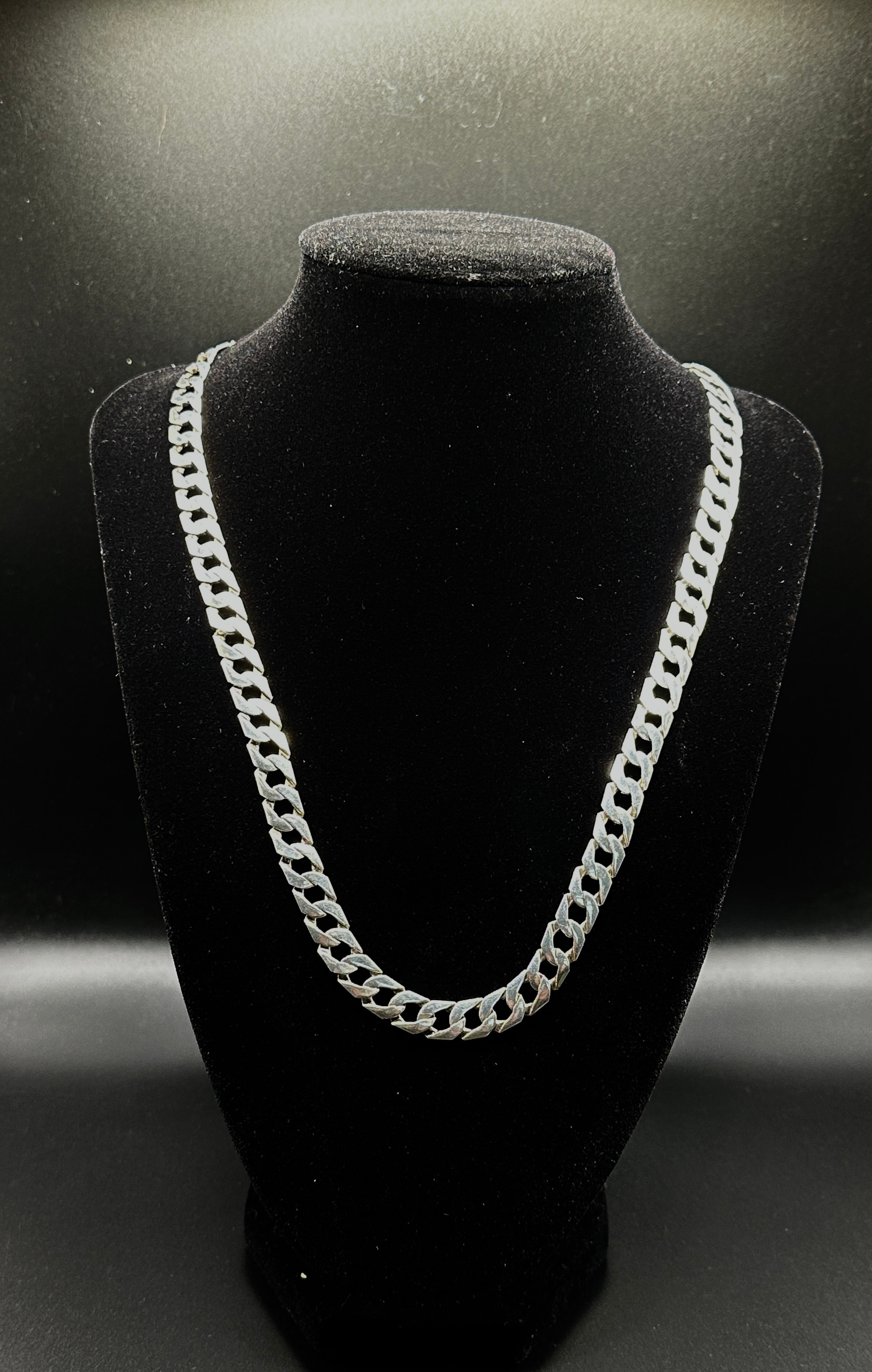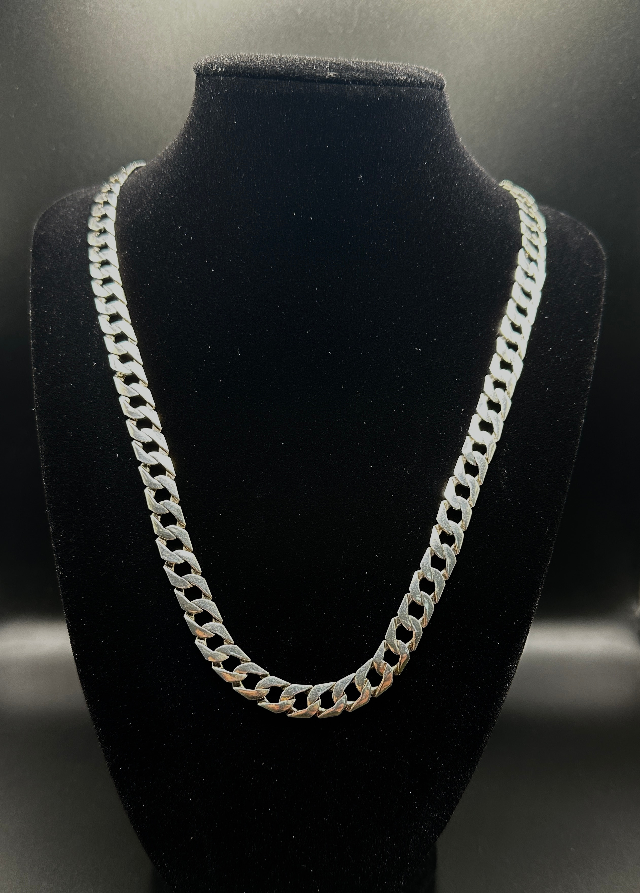 A Men’s Italian 10mm Solid Sterling Silver Cuban Curb Link Chain Necklace. The necklace features flattened, interlocking links, characteristic of the Cuban or Curb link style. The metal appears bright and polished.