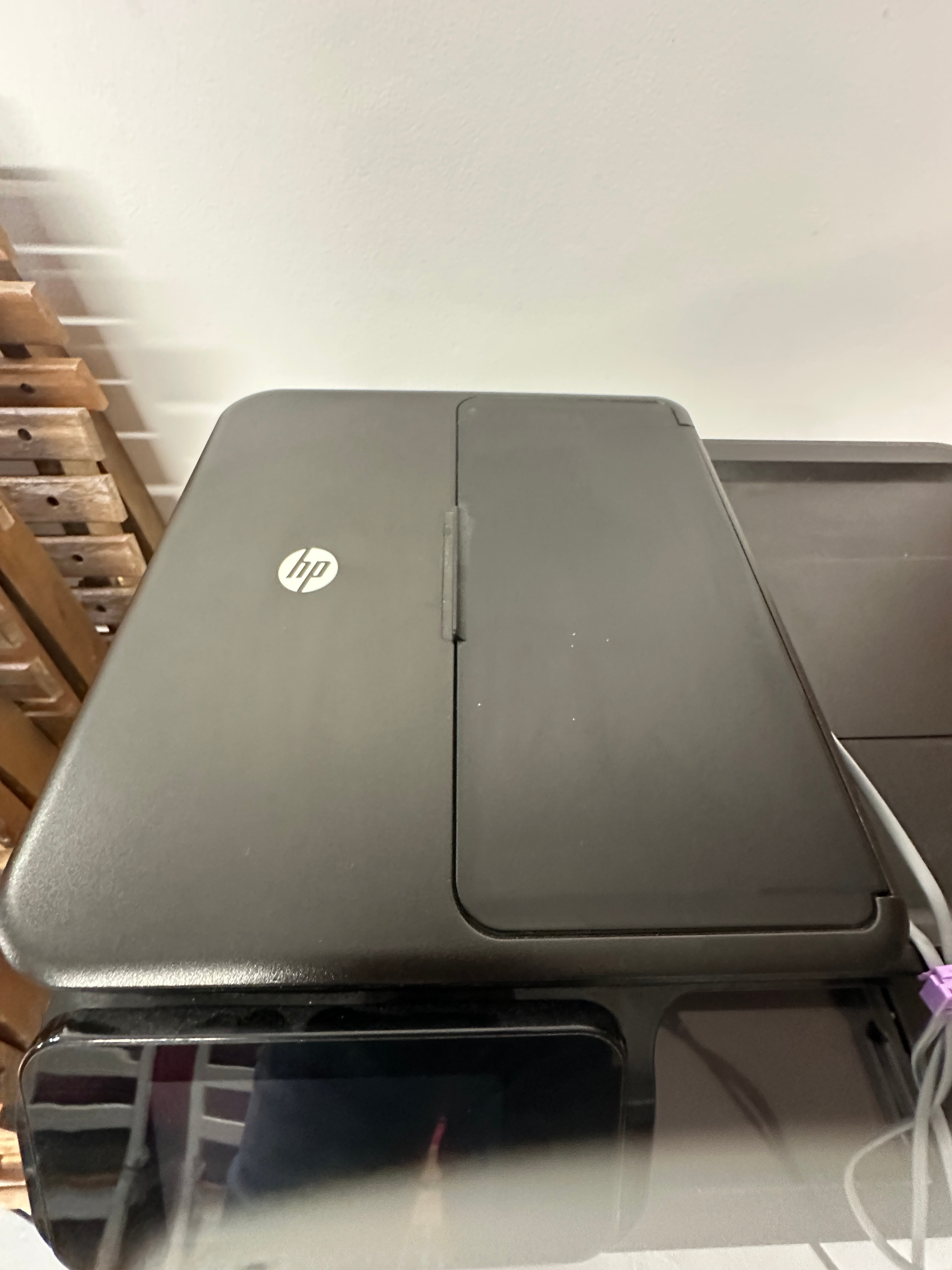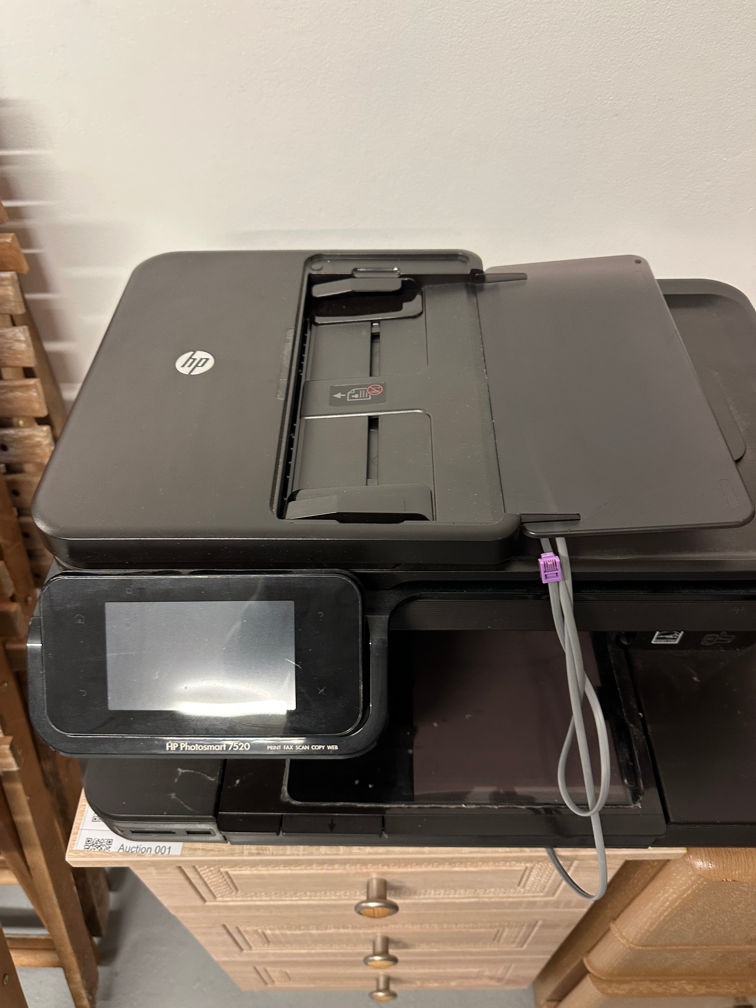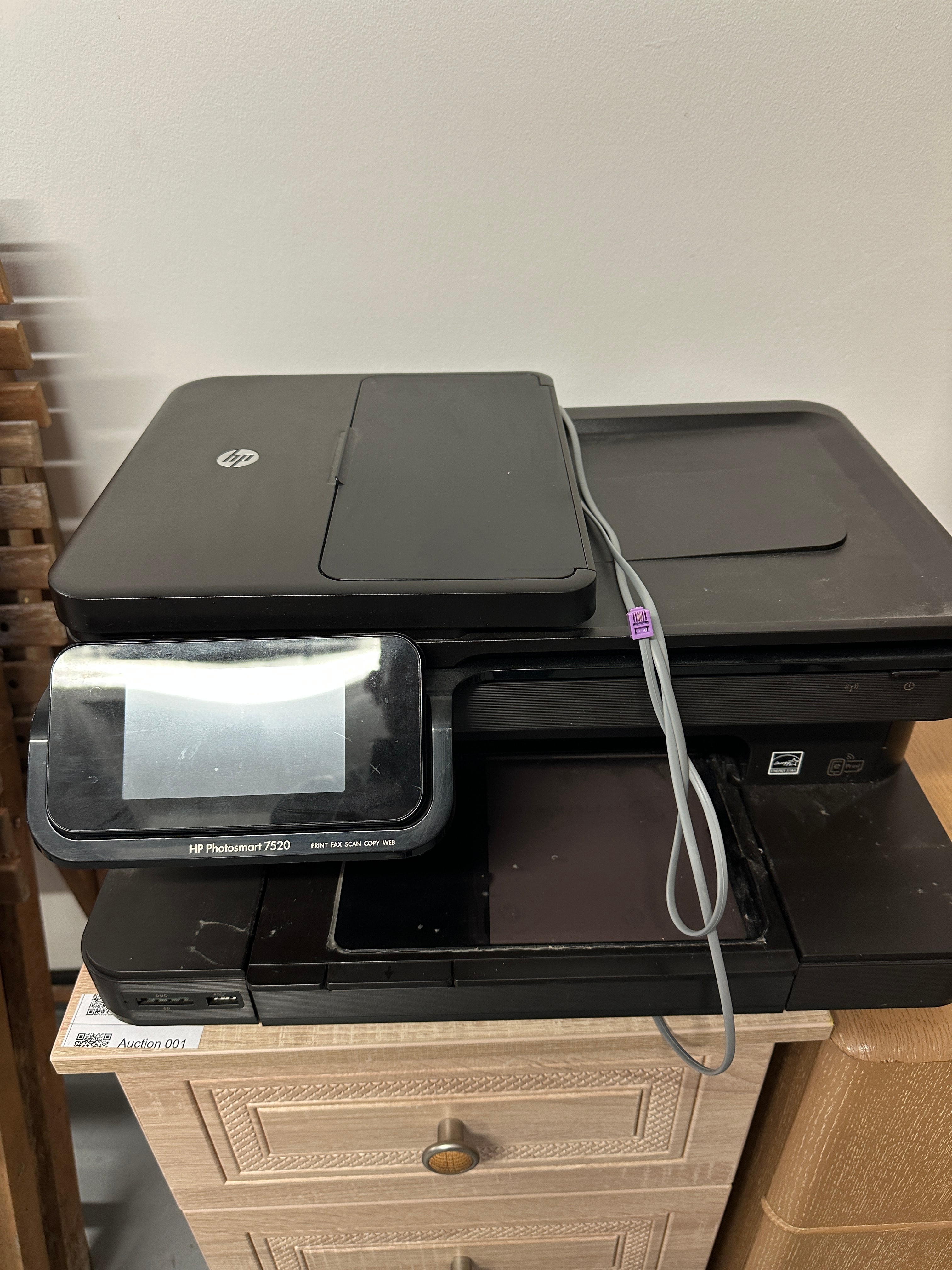 An HP Photosmart 7520 All-In-One multifunction printer. Constructed from black plastic with a prominent glass touchscreen control panel. Visible markings include the “HP” logo, “HP Photosmart 7520,” and “PRINT FAX SCAN COPY WEB” on the control panel, alongside an “energy STAR” emblem on the side. Accompanied by a grey cable secured by a purple cable tie.
