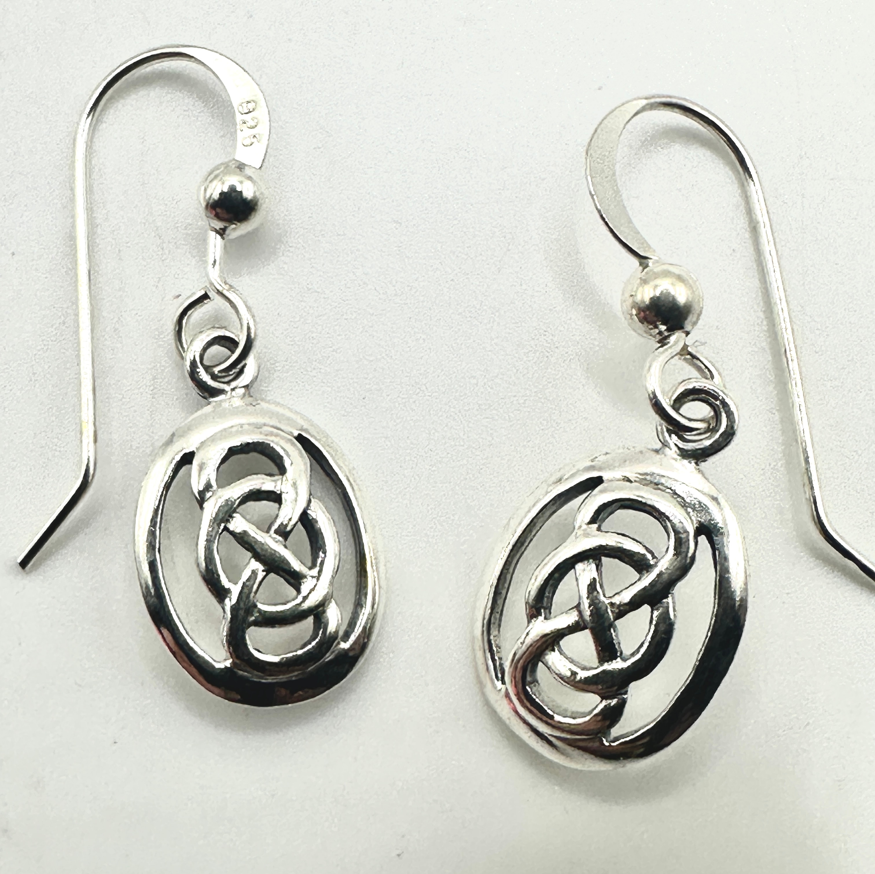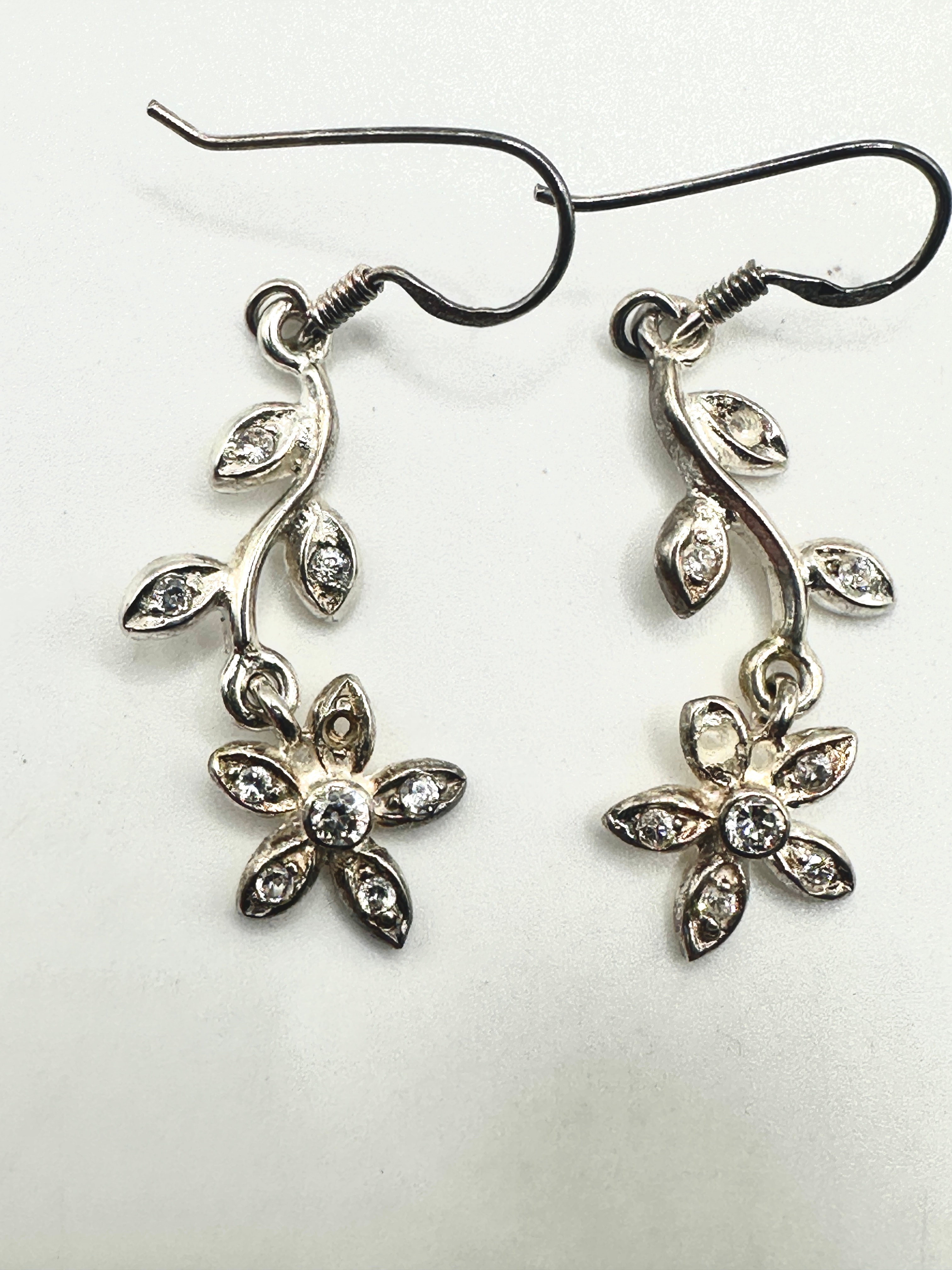 This lot comprises three distinct pairs of dangle earrings. One pair, identified as LAGOS Sterling Silver Double Marquis Swirl Drop Earrings, features elongated, twisted spiral elements. This pair bears a faint ‘925’ marking on the ear hooks, indicating sterling silver. A second pair consists of an oval openwork design with an interlocking Celtic knot motif, also marked ‘925’ on the ear hooks, indicating sterling silver. The third pair showcases a floral and foliate design, with each petal and leaf set with multiple small, clear, faceted stones, crafted from a silver-toned metal.