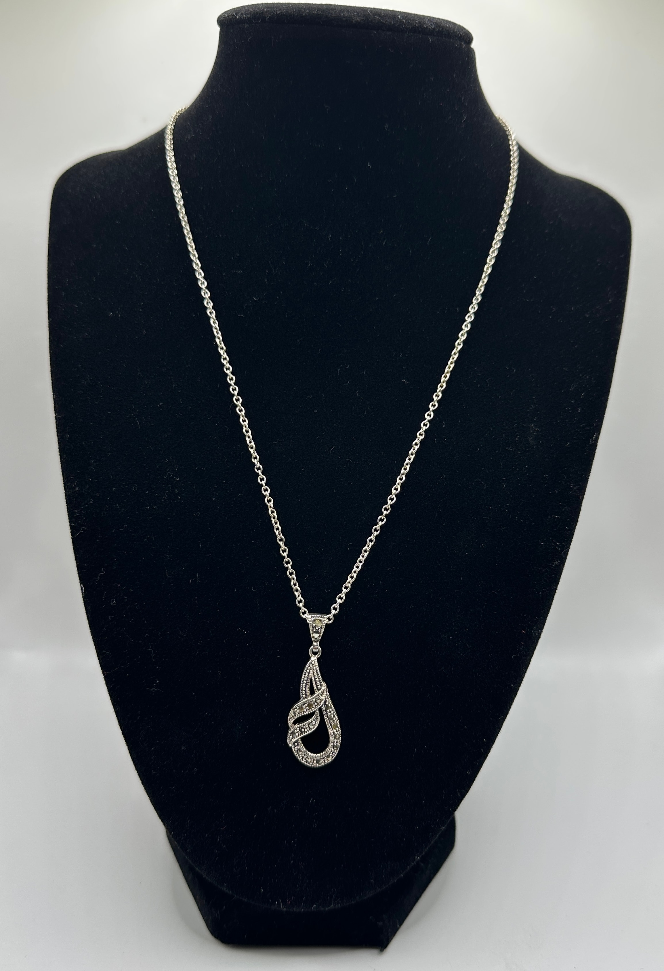A silver-toned metal necklace featuring a uniform oval-link chain. The pendant is crafted from a silver-toned metal, likely with an antiqued or oxidized finish, and is designed in a stylized teardrop or swirling form. It is extensively set with numerous small, dark, faceted stones consistent with marcasite. The overall aesthetic suggests a vintage or Art Deco revival style. No discernible text, hallmarks, or maker’s marks are visible on the chain or pendant.
