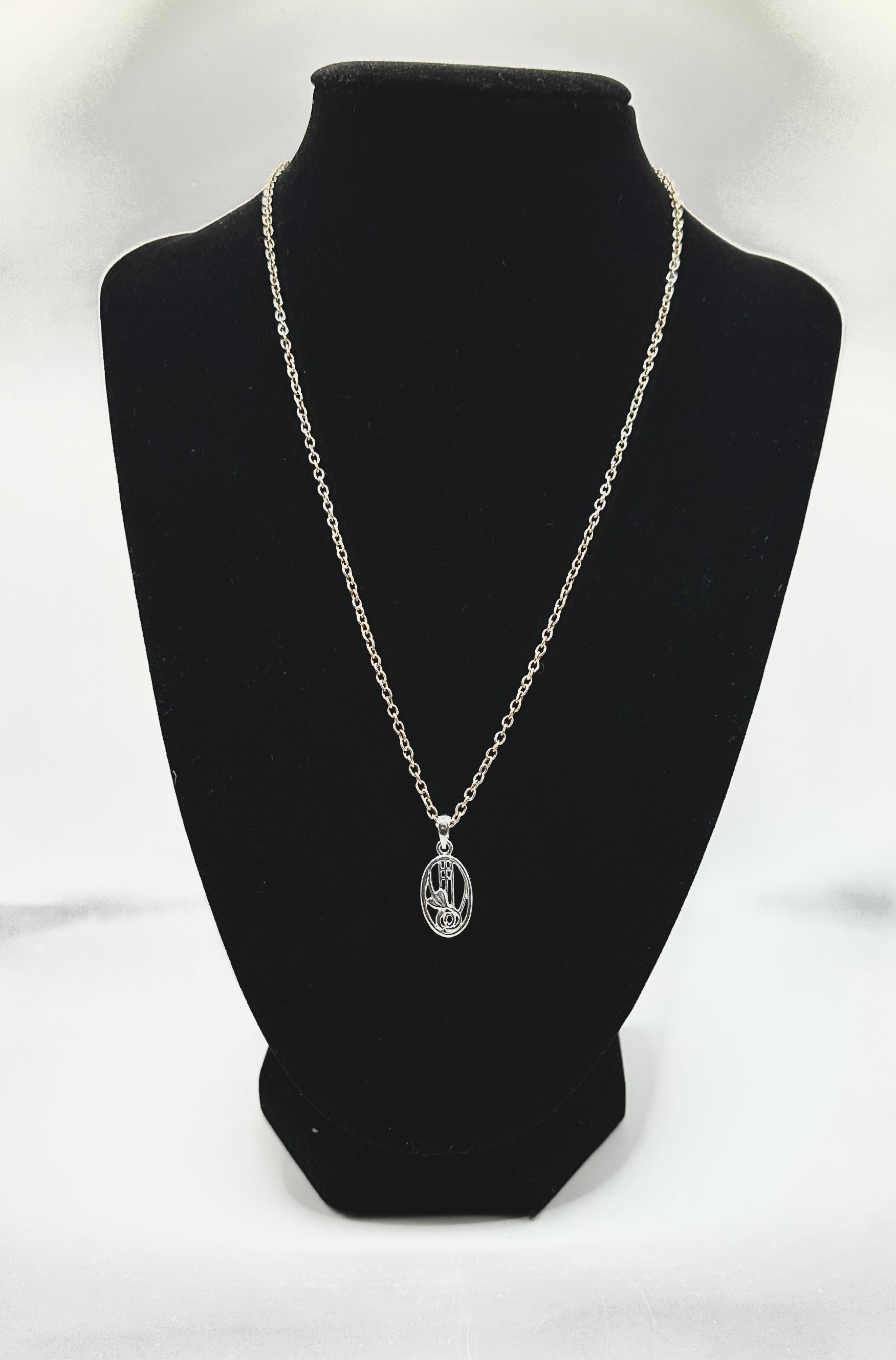 A contemporary necklace crafted from a silver-toned metal, featuring a fine oval link chain supporting a single, openwork oval pendant. The pendant displays a stylized emblem or monogram, characterized by geometric forms at the top transitioning into a flowing, organic design with a circular or spiral element at the base. No discernible text in a translatable language is visible within the design.