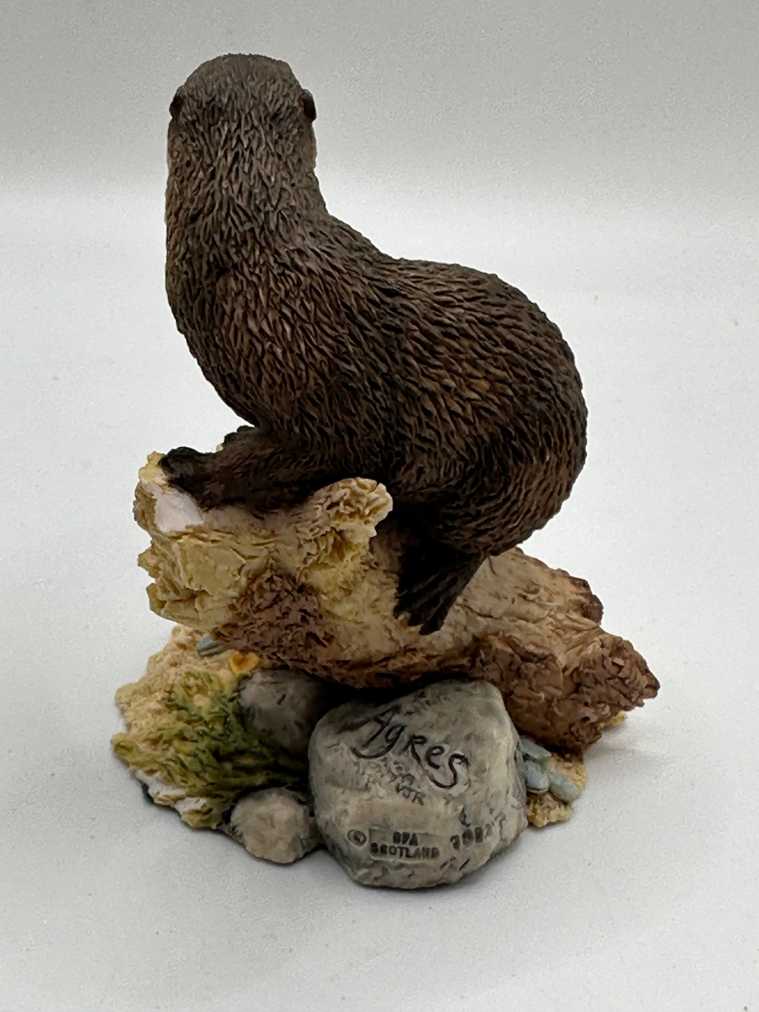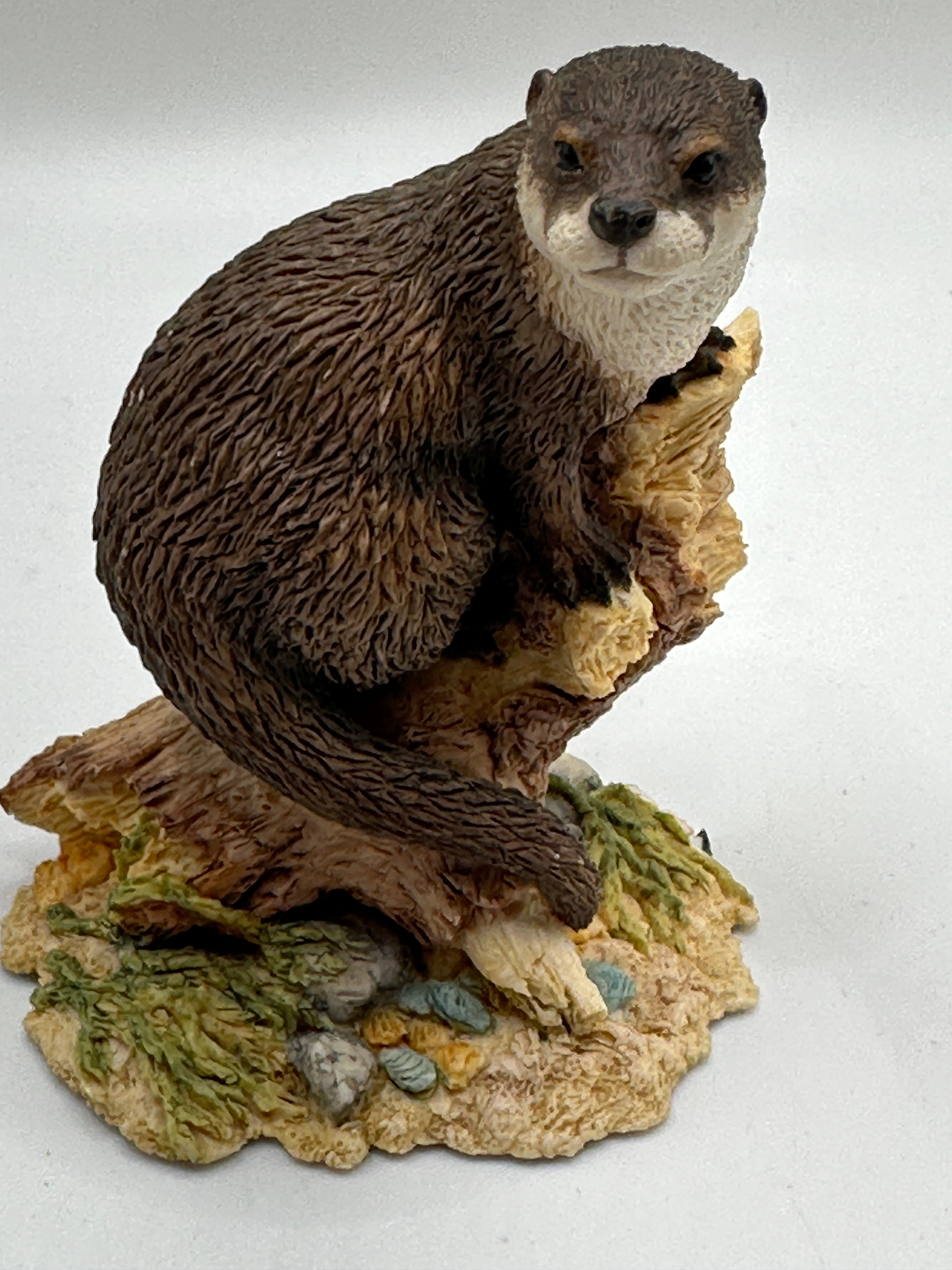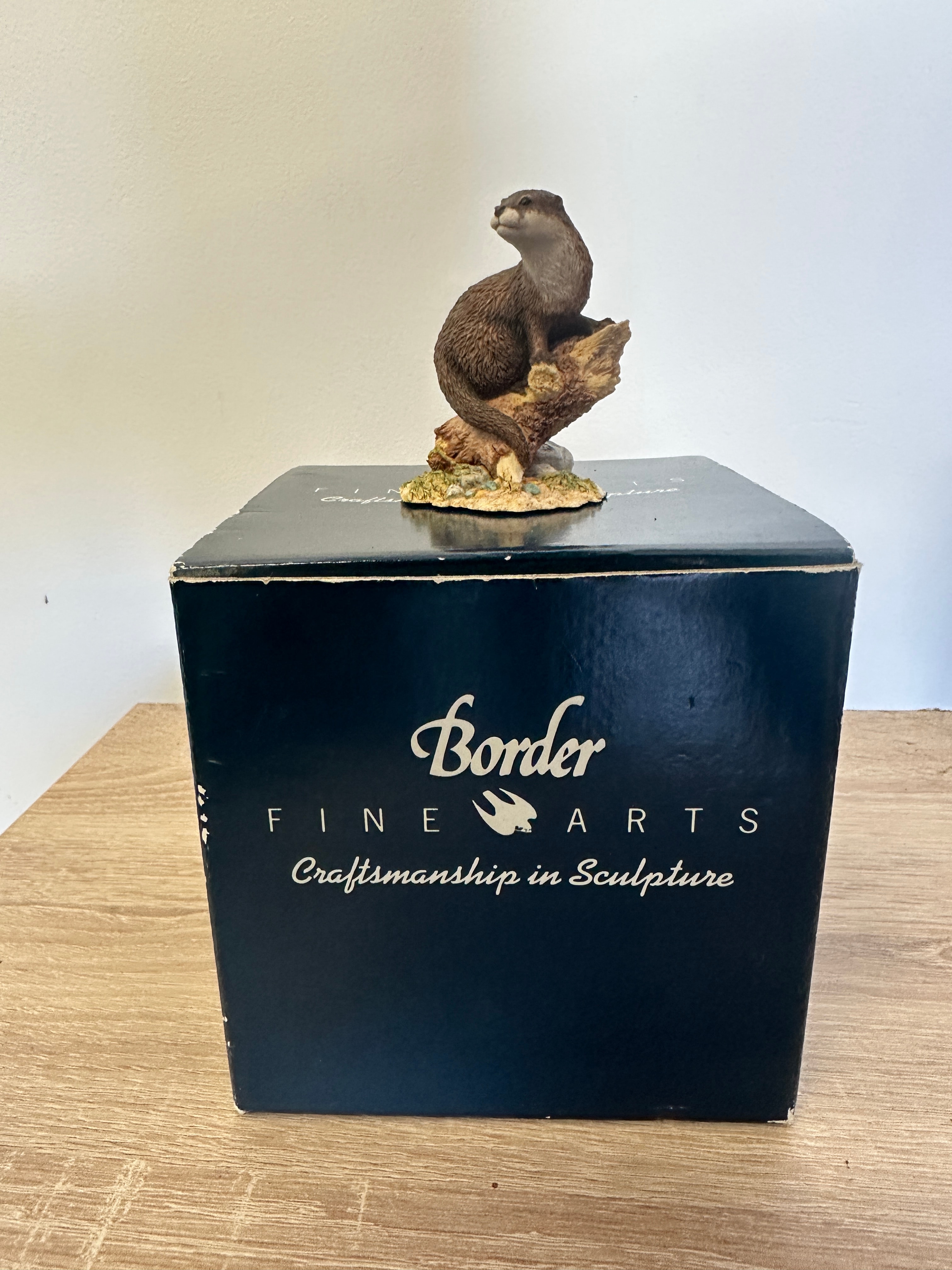 A Border Fine Arts figurine depicting a realistic brown otter, crafted from hand-painted resin or a composite material. The otter is perched on a textured tree stump, set on a naturalistic base with small rocks and foliage. The base of the sculpture is visibly inscribed “Dykes,” “VTR,” “BFA SCOTLAND,” and the date “2007.” The figurine is presented with its original dark blue cardboard box, which features the text “Border Fine Arts” alongside a bird logo, and the slogan “Craftsmanship in Sculpture.”