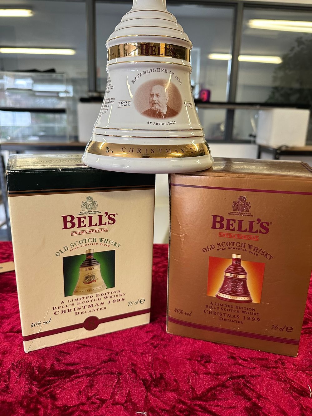 This lot comprises three Bell’s Extra Special Old Scotch Whisky limited edition Christmas decanters from the years 1998, 1999, and 2000. The ‘CHRISTMAS 2000’ edition is a ceramic bell-shaped decanter, finished in white with elaborate gold detailing. It features a portrait identified as ‘BY ARTHUR BELL’ and bears the dates ‘1825’ and ‘ESTABLISHED IN 1898’. This decanter is presented without its original external packaging visible. The lot also includes two Bell’s Scotch Whisky decanters, each within its original cardboard presentation box: one cream and green box for the ‘CHRISTMAS 1998’ edition, and one brown and gold box for the ‘CHRISTMAS 1999’ edition. Both boxes bear a royal crest and indicate a strength of ‘40% vol’ and a volume of ’70 cl/e’.