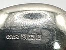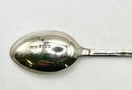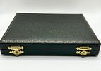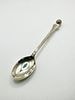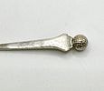 A cased set of six identical 925 silver coffee spoons, originating from Oslo, Norway. Each spoon features a decorative, textured spherical finial at the handle’s end, above a polished bowl. Hallmarks ‘925’ and ‘OSLO’ are clearly visible on the spoon bowls. The set is presented in a rectangular, dark-colored hinged box with brass-toned clasps and hinges. The box is lined internally with white ruched satin-like fabric in the lid and black velvet in the fitted base.