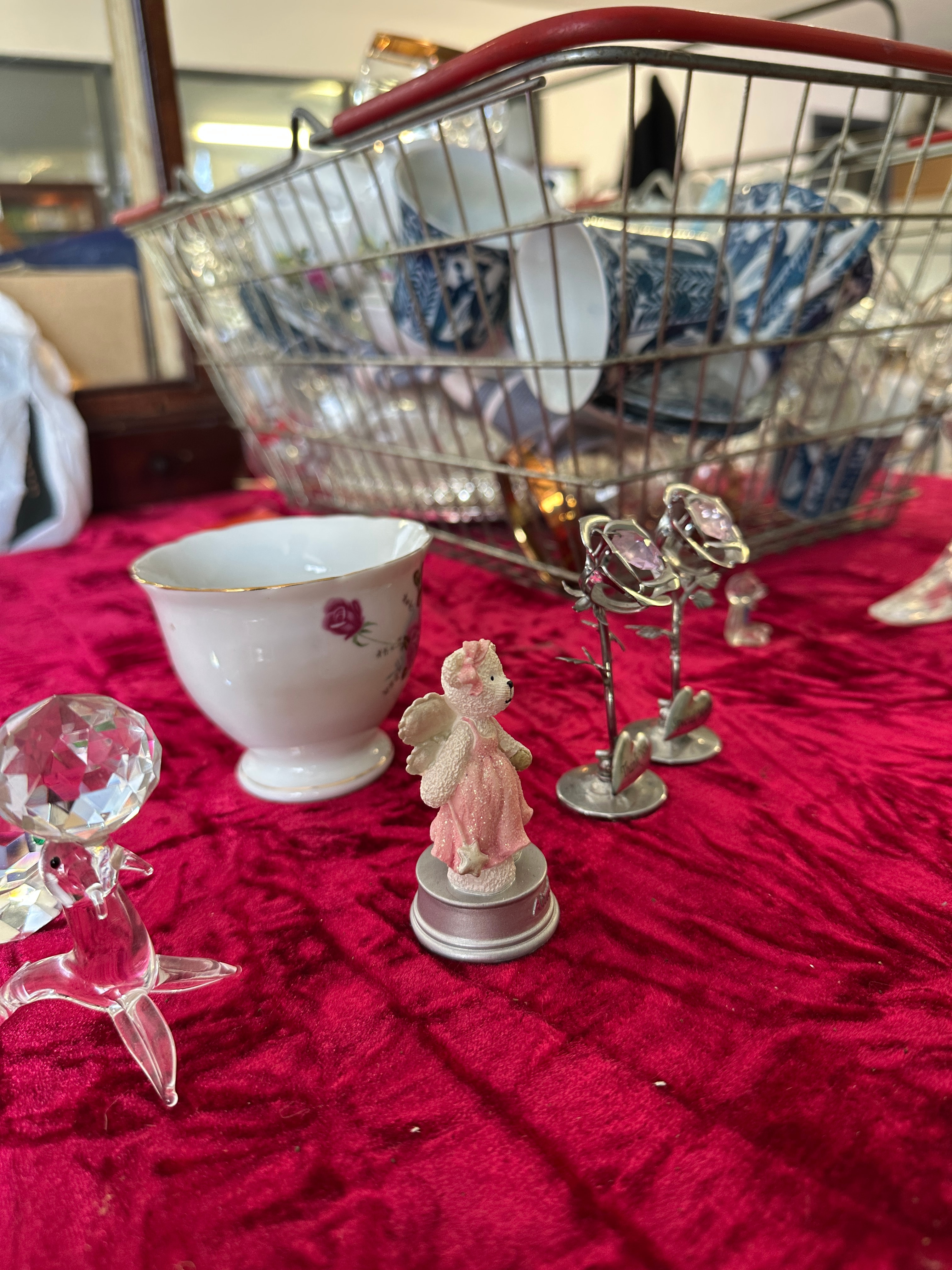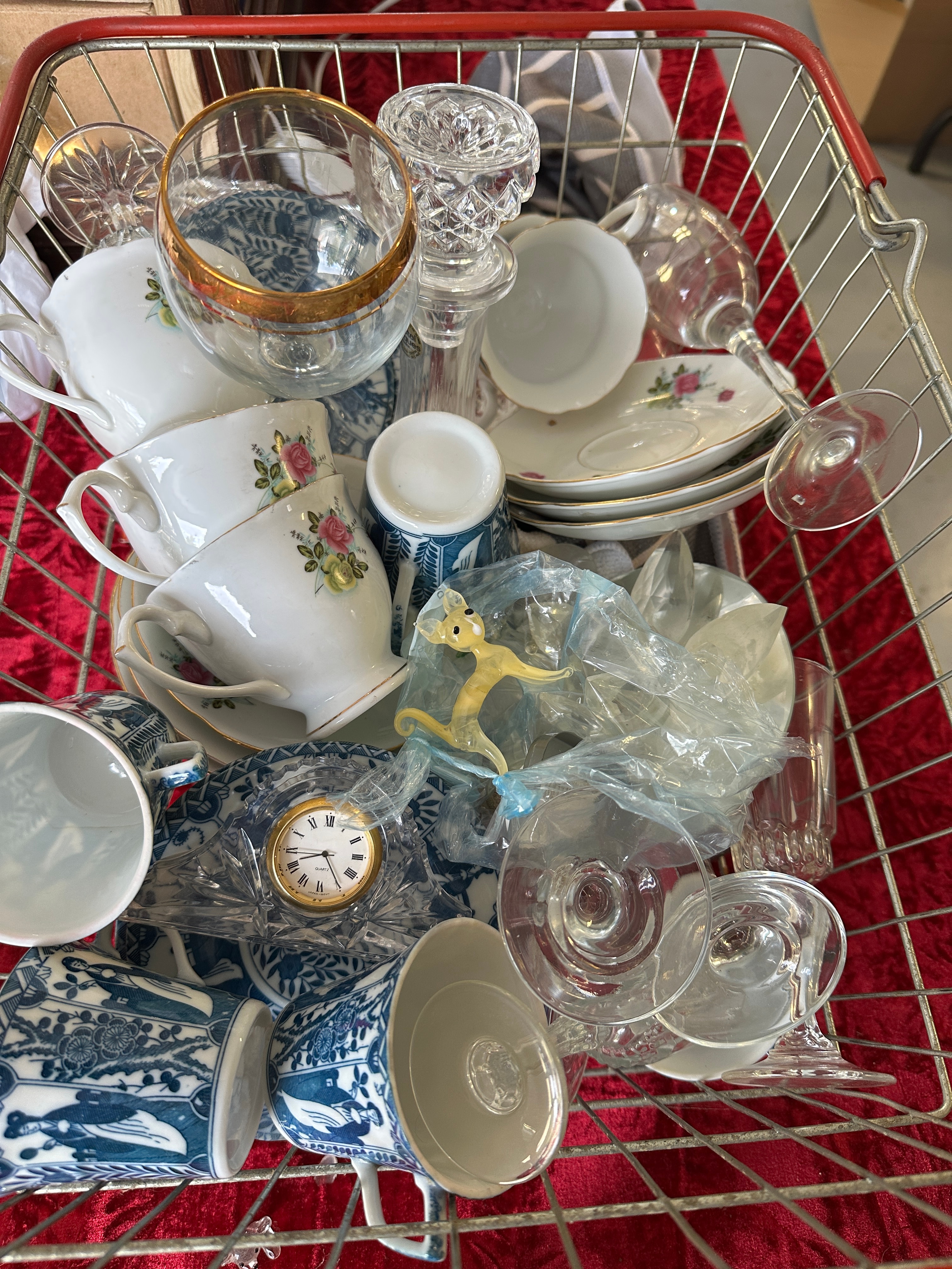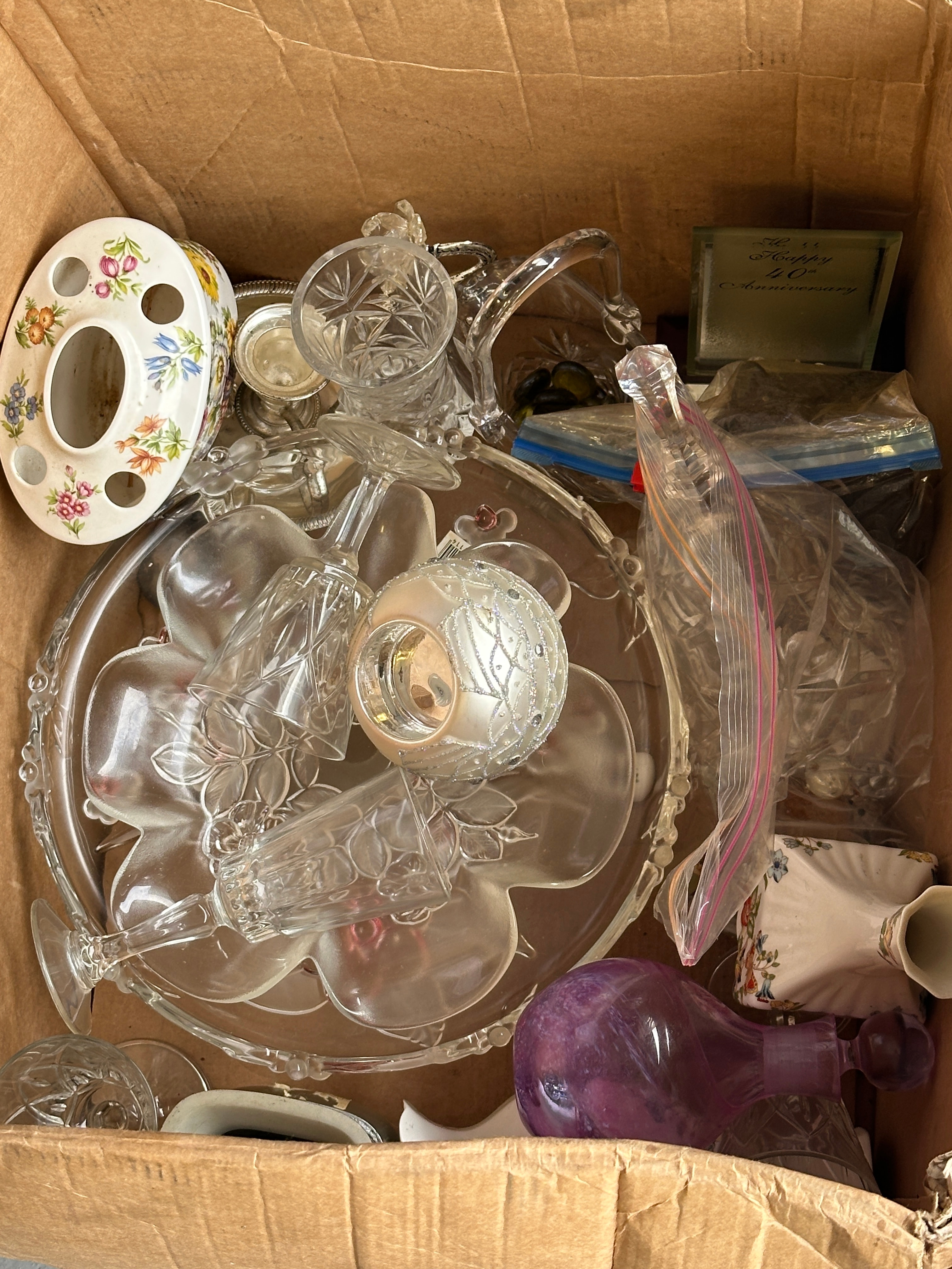 This lot comprises a diverse collection of household and decorative items. The porcelain and ceramic pieces include a group of teacups, saucers, and plates, featuring both multi-colored floral patterns, such as roses, and traditional blue and white chinoiserie-style designs. Also present is a ceramic toothbrush holder with a vibrant floral motif. The glassware assortment features a group of clear cut and molded items, including drinking glasses, wine glasses, vases, candlesticks, and serving platters, alongside one purple glass bottle. Additional items include one small gold-toned clock with Roman numerals, one miniature resin/plastic angel figurine, one clear faceted glass decorative object, two metal rose-shaped accents, and one framed item bearing the English inscription “Happy 40th Anniversary.”