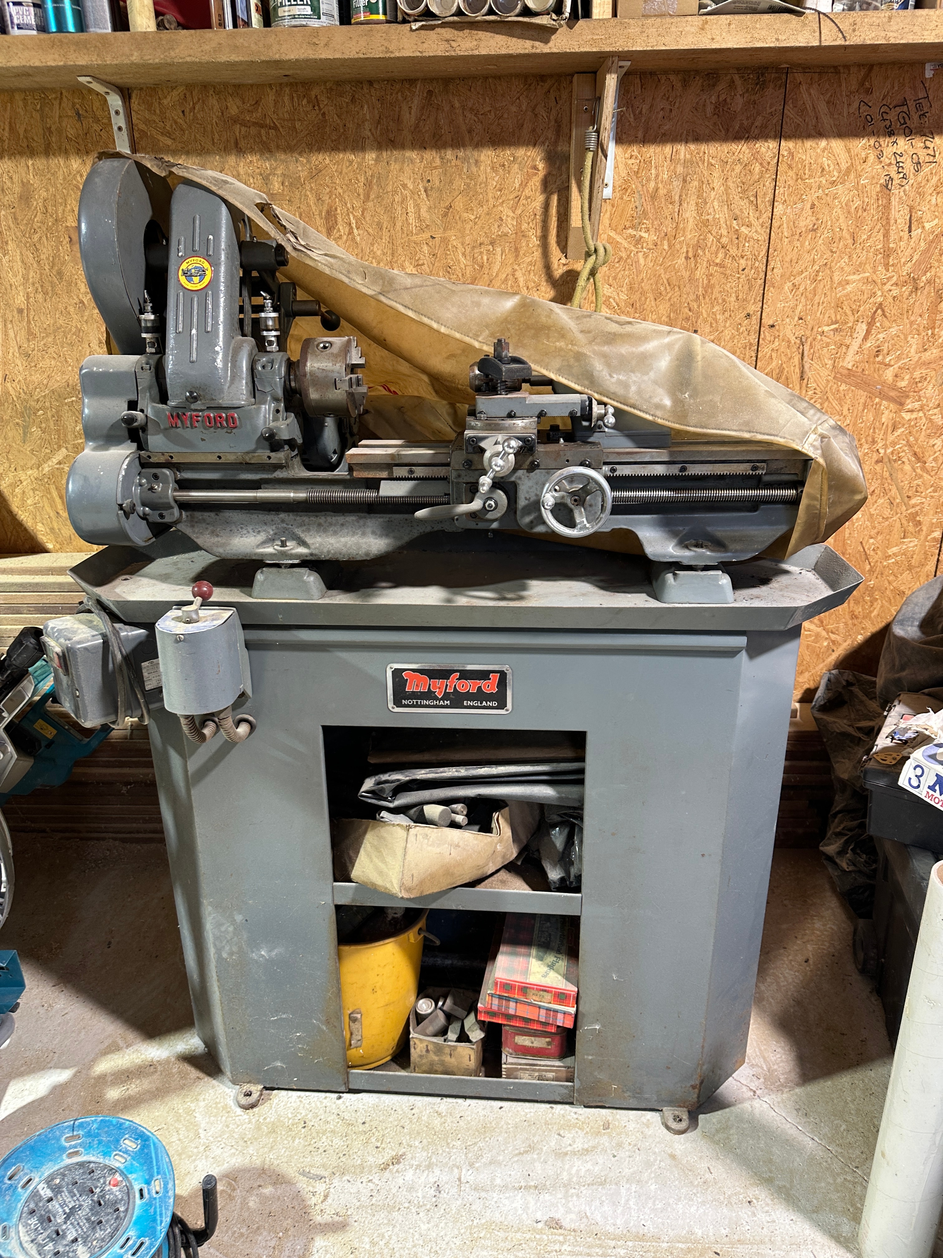 A Myford ML7 Straight Bed Lathe, a vintage grey industrial metalworking machine, prominently branded “MYFORD” on the headstock. It is mounted on its original matching metal cabinet stand, which bears a red badge specifying “NOTTINGHAM ENGLAND.” The lathe is constructed primarily of cast iron and steel.