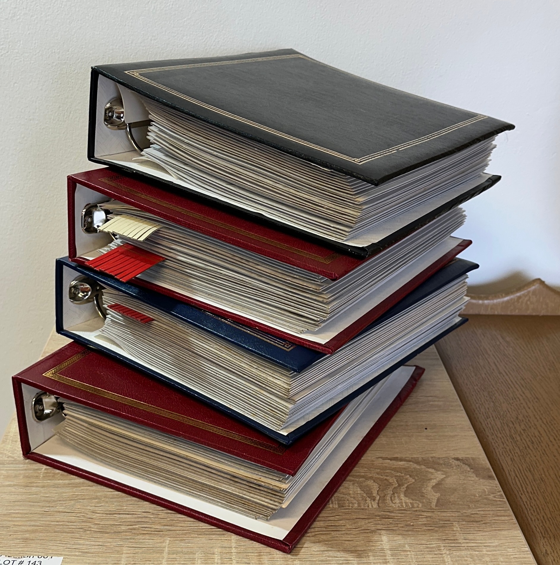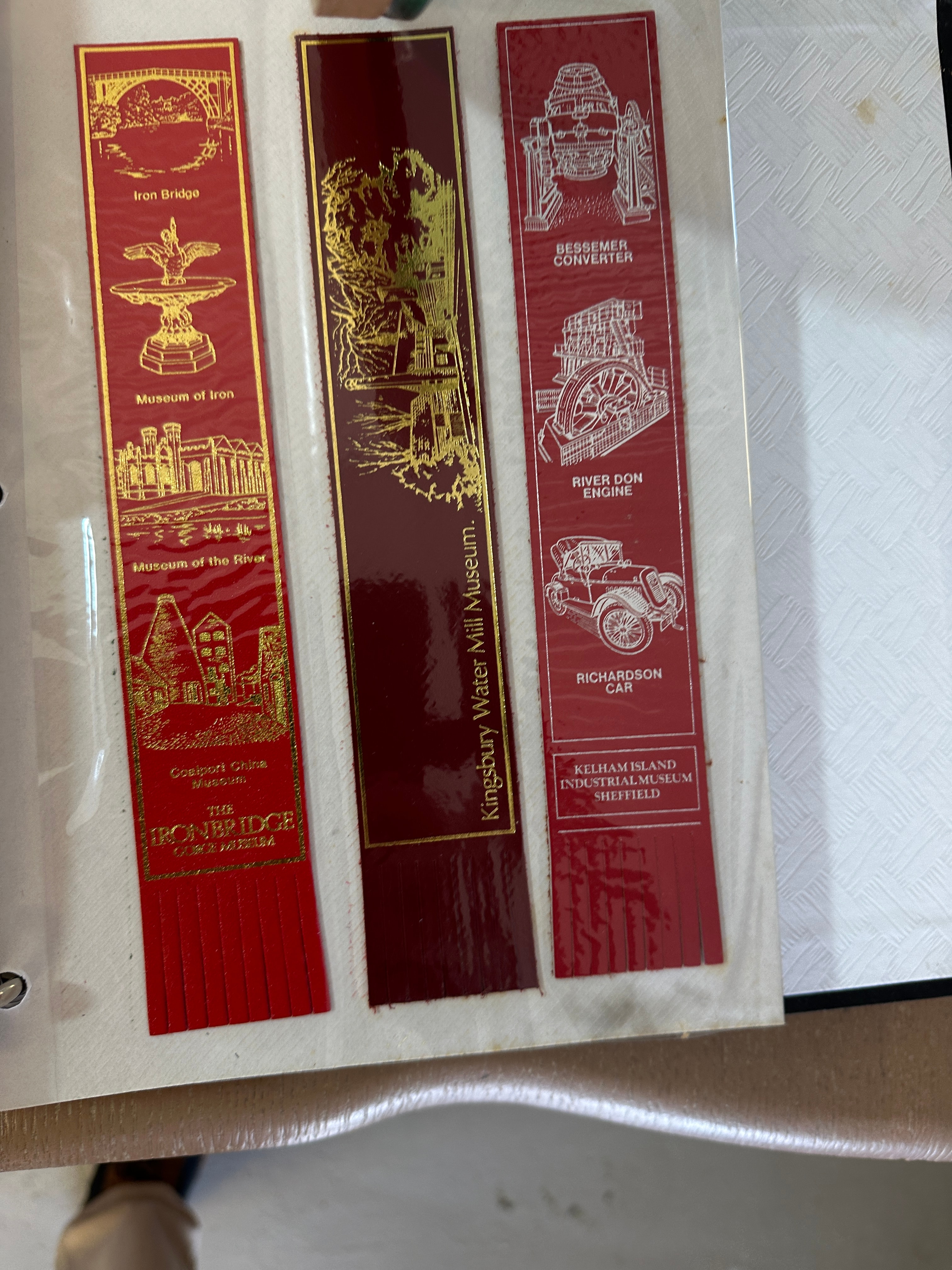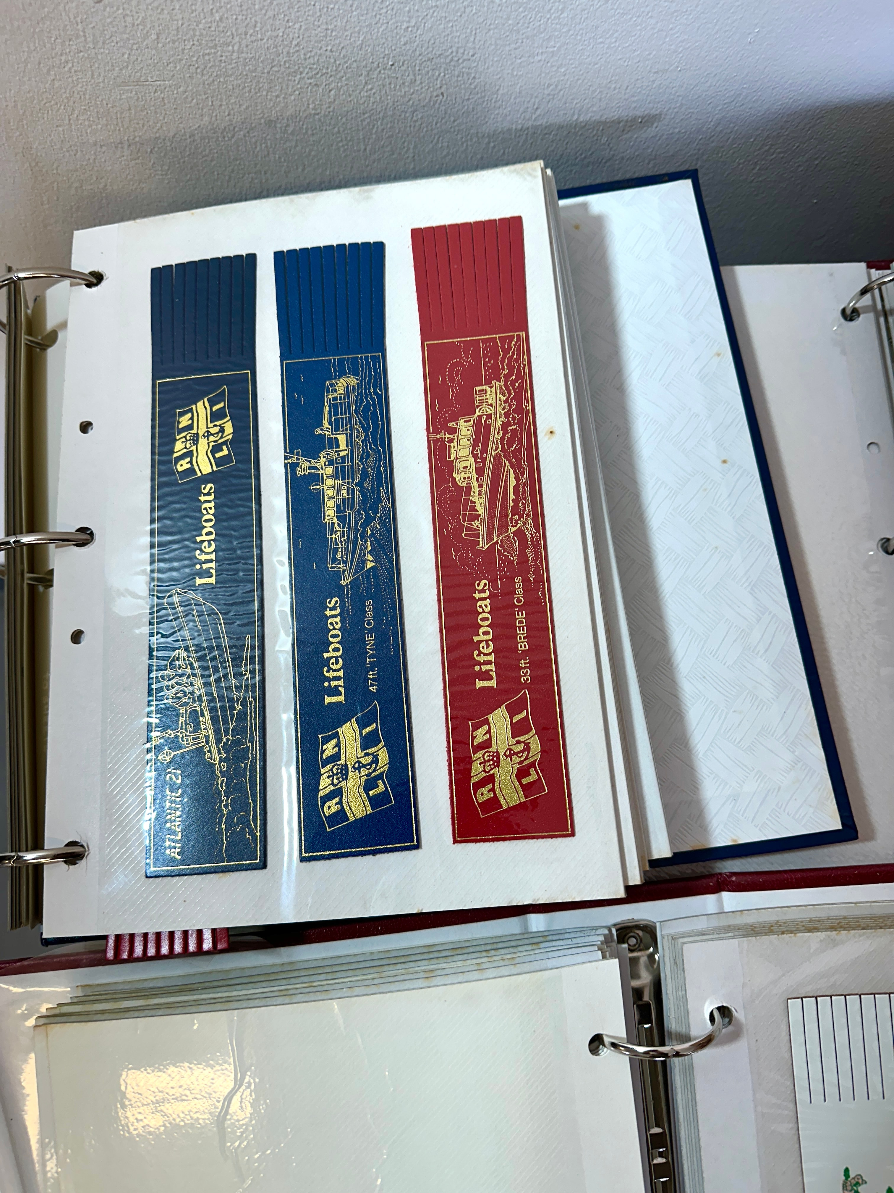This lot comprises a collection of five hardbound multi-ring binders, predominantly red and blue with gold accents, topped by a black binder with similar trim. Each binder is filled with numerous plastic sleeves containing an extensive collection of various souvenir and commemorative bookmarks. The bookmarks are largely made of cardstock, with some featuring a laminated or glossy finish, and many are embellished with gold foil printing. One bookmark explicitly indicates “REAL LEATHER.” Visible themes and markings include “RNLI Lifeboats” with various boat classes, British locations such as “Chesterfield Parish Church,” “Iron Bridge,” and “Kelham Island Industrial Museum Sheffield,” along with popular culture references like “The Darling Buds of May,” “It’s a Vet’s Life,” and “Emmerdale Farm.”