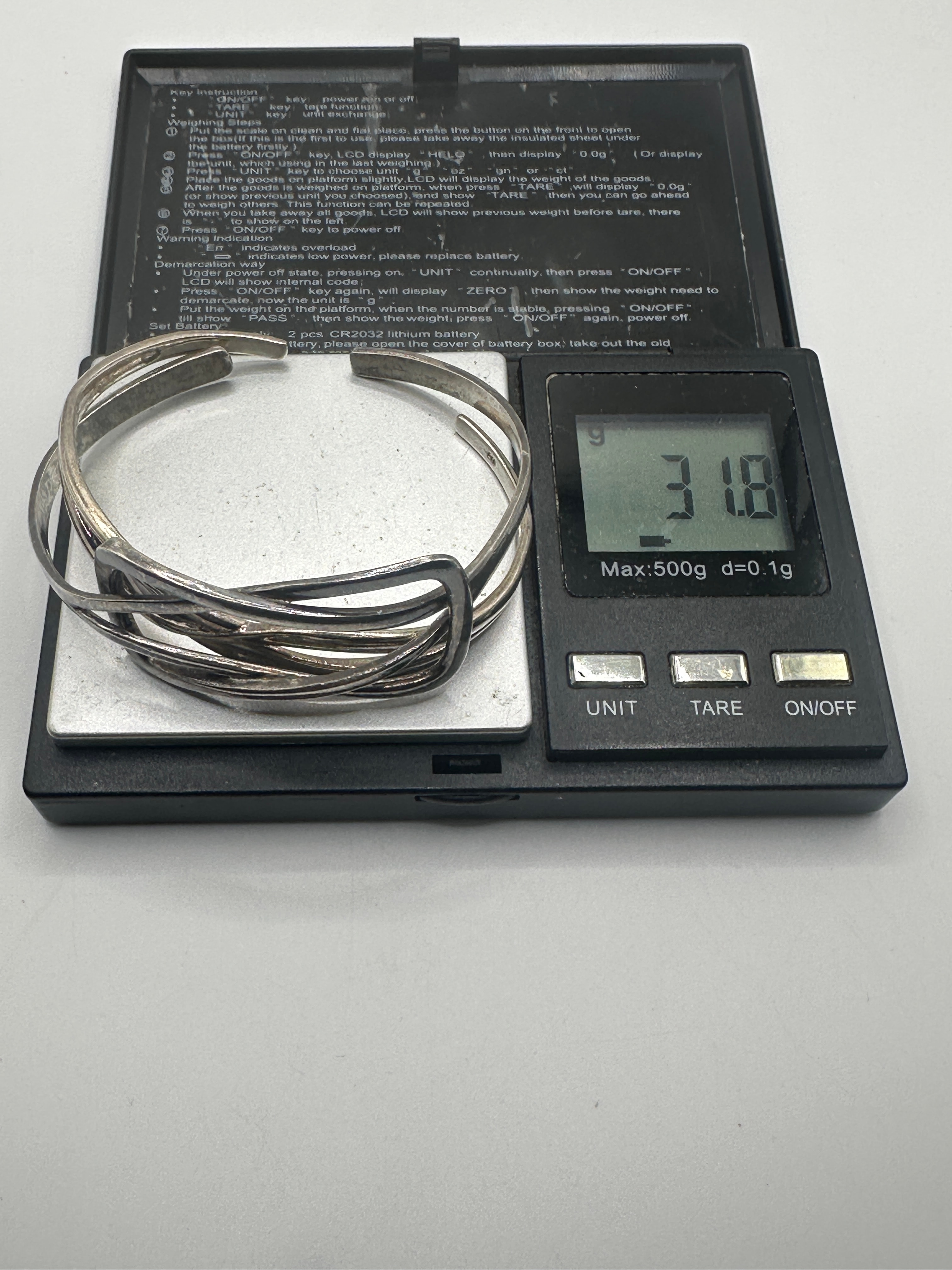 A pair of open-ended cuff bracelets. The first bracelet features a geometric design with broad, intersecting bands forming a rectangular open knot. The second bracelet has an organic, twisted multiple-band design and is marked “925” on its interior surface, indicating sterling silver.