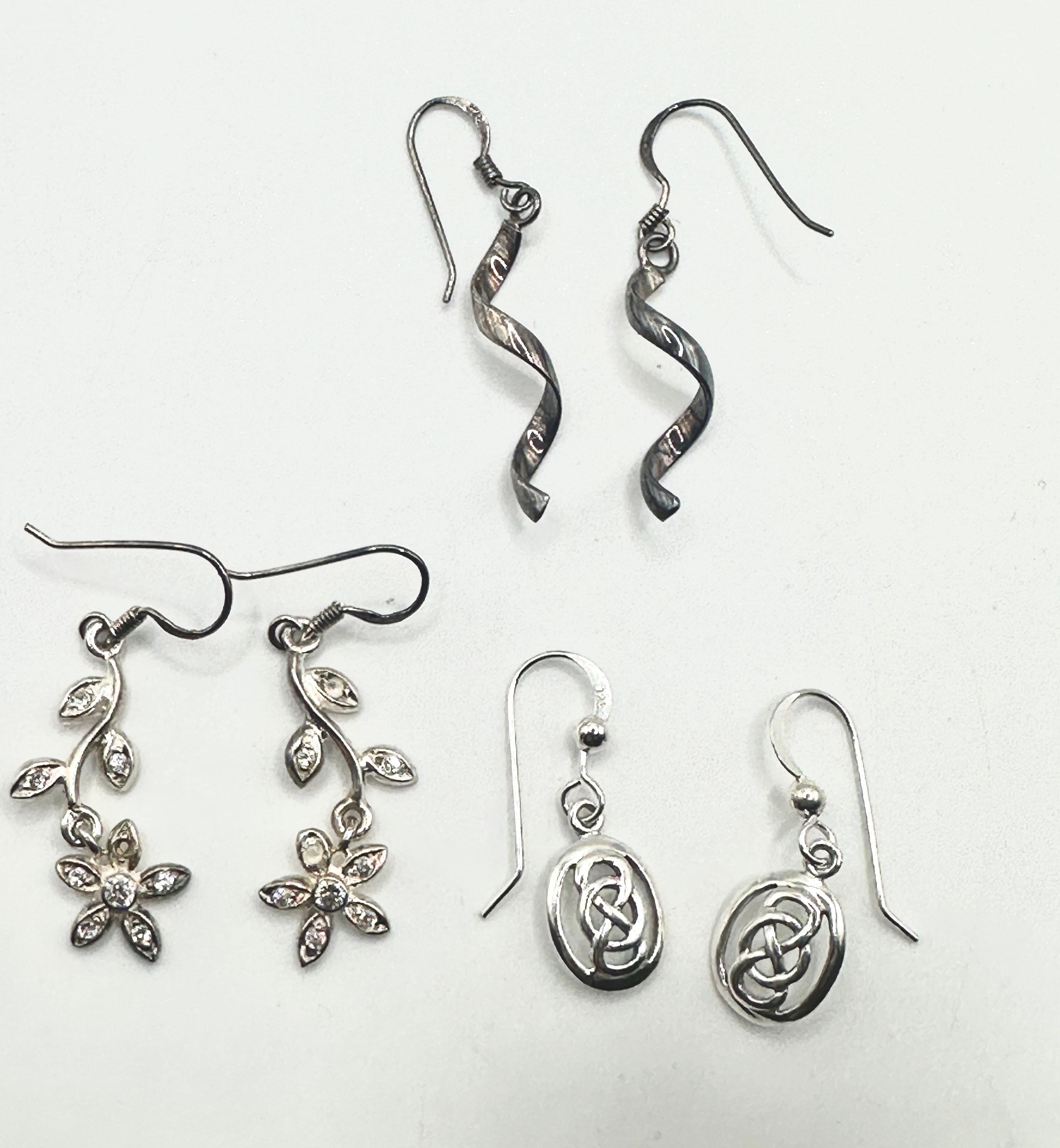 This lot comprises three pairs of sterling silver earrings. The first pair, identified as Lagos, features elongated, twisted spiral drops. A second pair displays a delicate floral and vine motif adorned with small, clear faceted stones. The third pair consists of oval-shaped drops with an openwork Celtic knot design. Two of the pairs are clearly marked “925” on their shepherd’s hook ear wires, indicating sterling silver, with the third appearing to be of similar material.