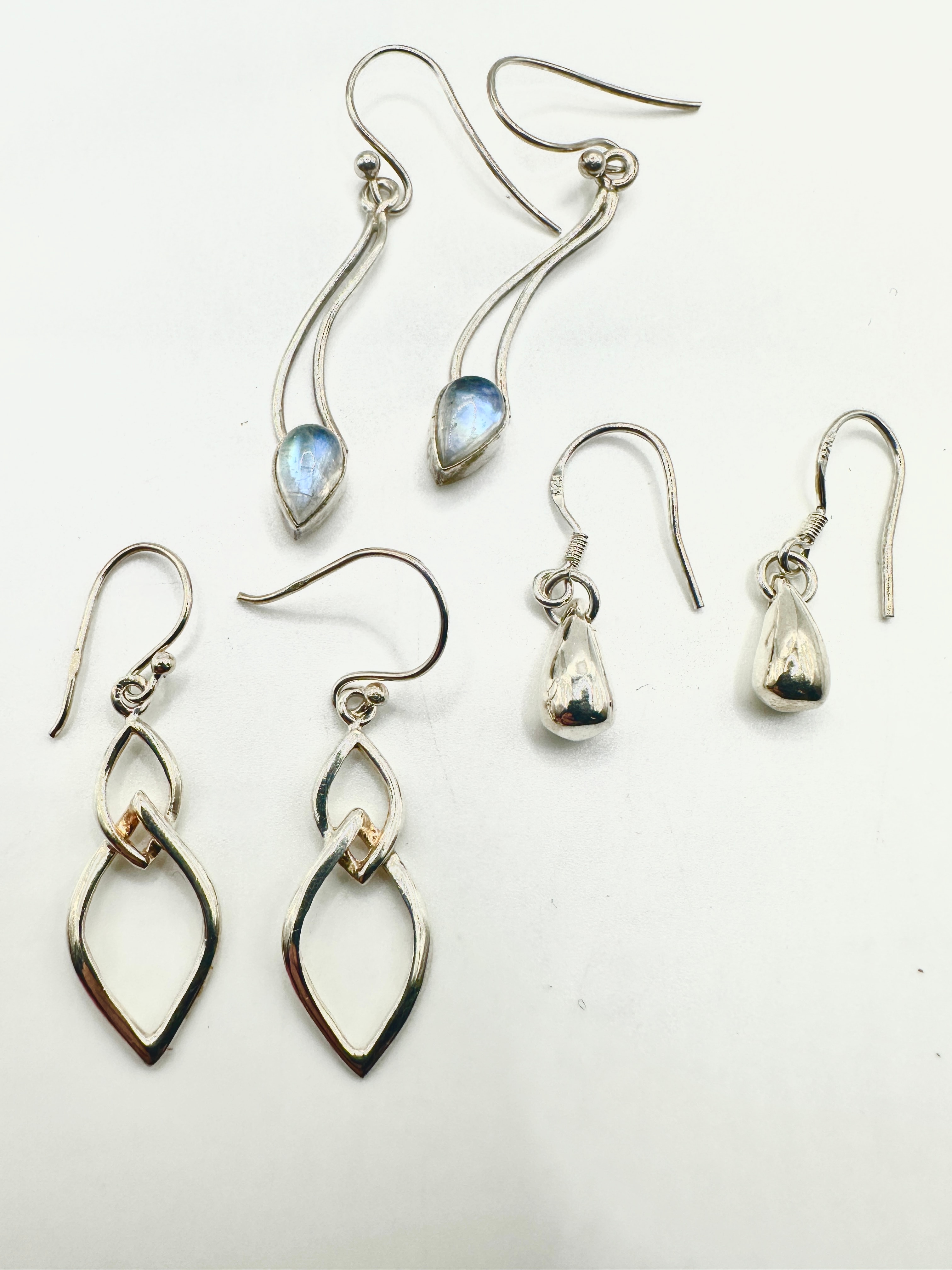 This lot comprises three distinct pairs of modern or contemporary sterling silver dangle earrings. The top pair features elongated, curved S-shaped elements, each suspending a bezel-set, tear-drop shaped cabochon stone exhibiting adularescence, consistent with moonstone. The bottom left pair showcases an interlocking design of two elongated oval or marquise-shaped links, with a smaller central loop appearing to be a contrasting gold-toned metal. The bottom right pair consists of simple, polished, solid tear-drop shaped metal dangles. All earrings are fitted with fish hook ear wires, and a “925” mark, indicating sterling silver, is visible on one ear wire of the bottom right pair.