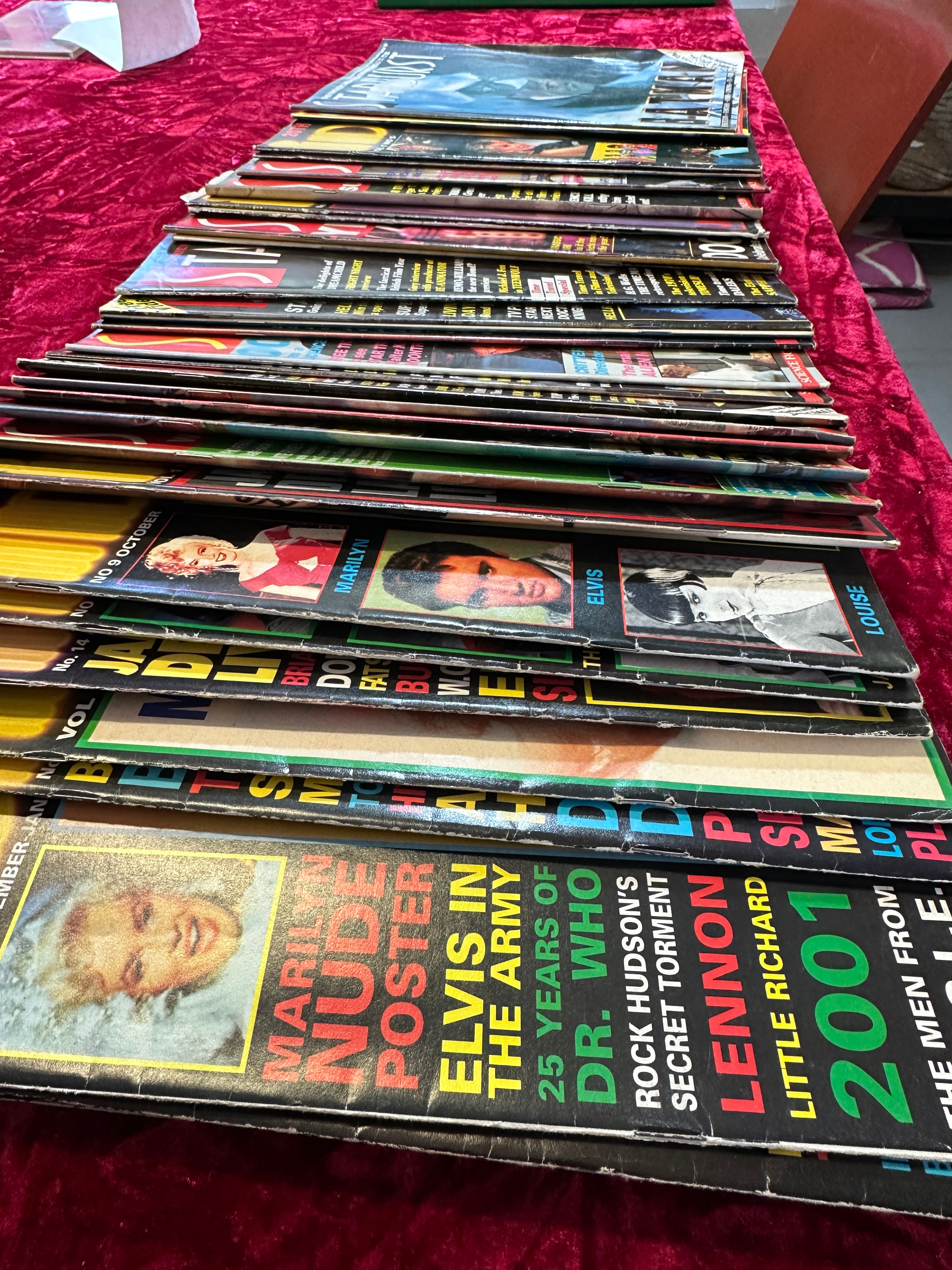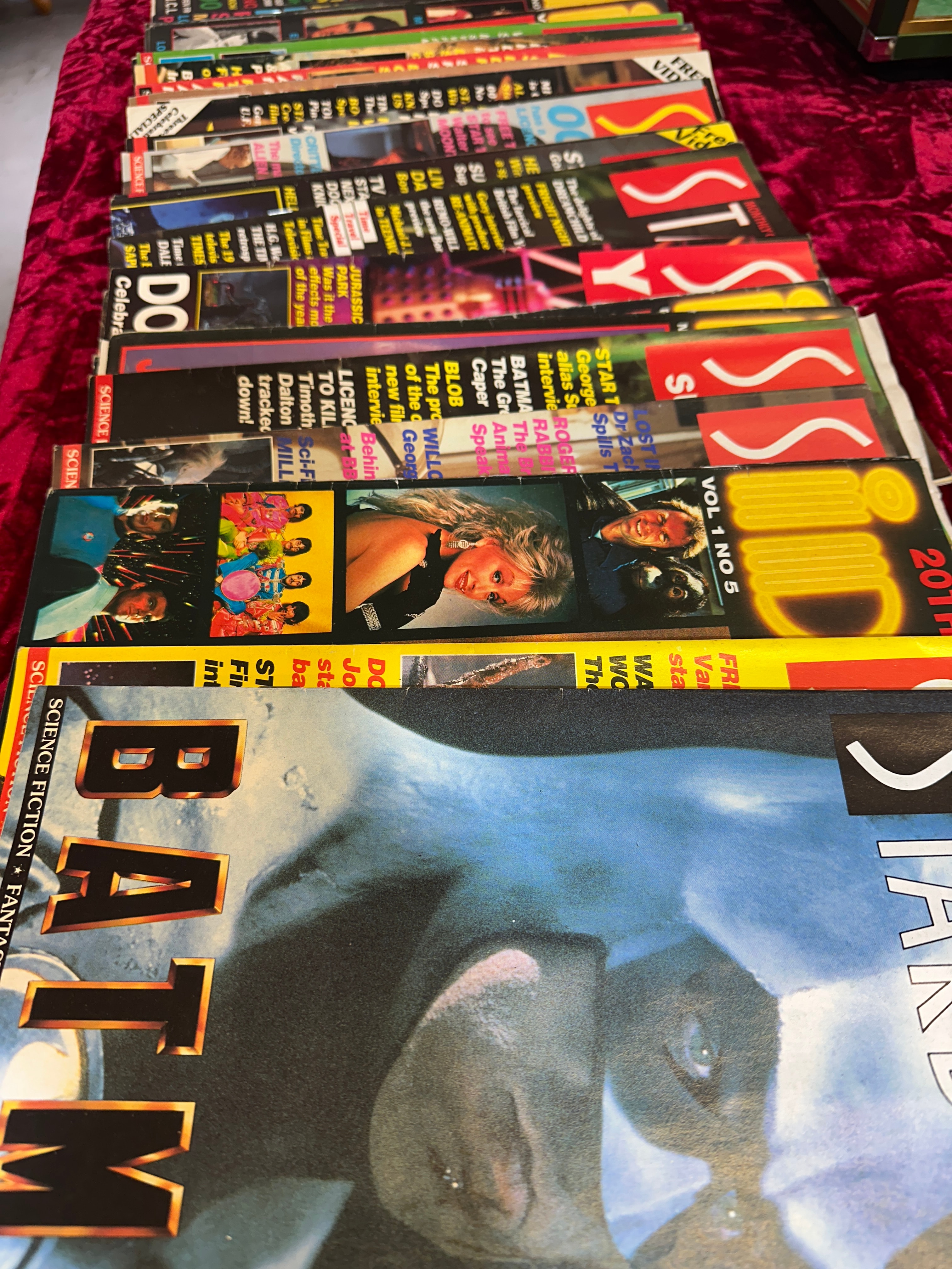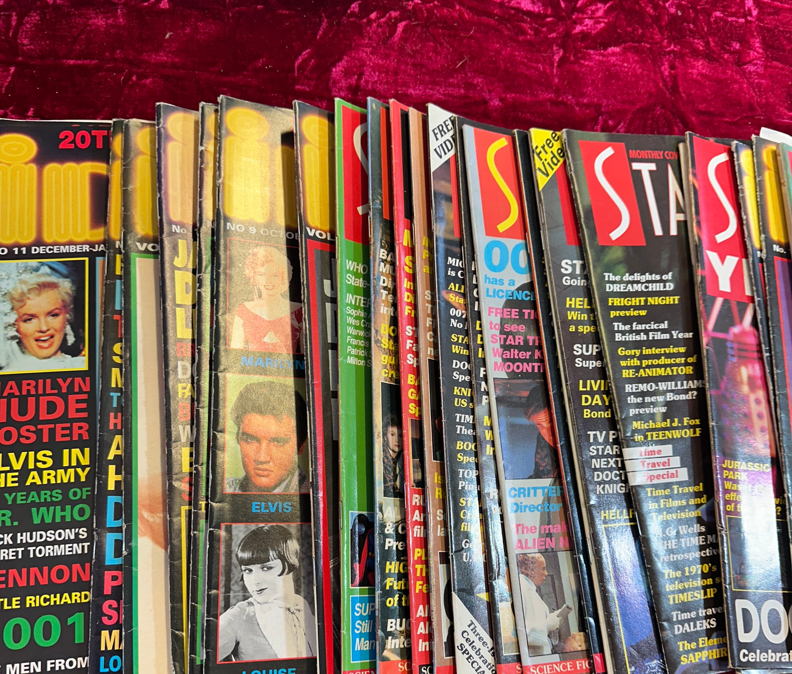 A collection of 32 issues of *Starlog Movie Magazine* and other related pop culture and entertainment periodicals. The magazines primarily date from the late 20th century, spanning the 1980s and 1990s, with visible dating such as “VOL 1 NO 5” and “NO 9 OCTOBER.” Key titles present include “STARLOG,” “STARBURST,” and “20TH,” often featuring the genre descriptor “SCIENCE FICTION FANTASY HORROR.” The printed paper covers prominently display photographic images of celebrities such as Marilyn Monroe, Elvis Presley, and Michael J. Fox, alongside references to popular film and television franchises including “Batman,” “Star Trek,” “Dr. Who,” “Jurassic Park,” and “James Bond.”