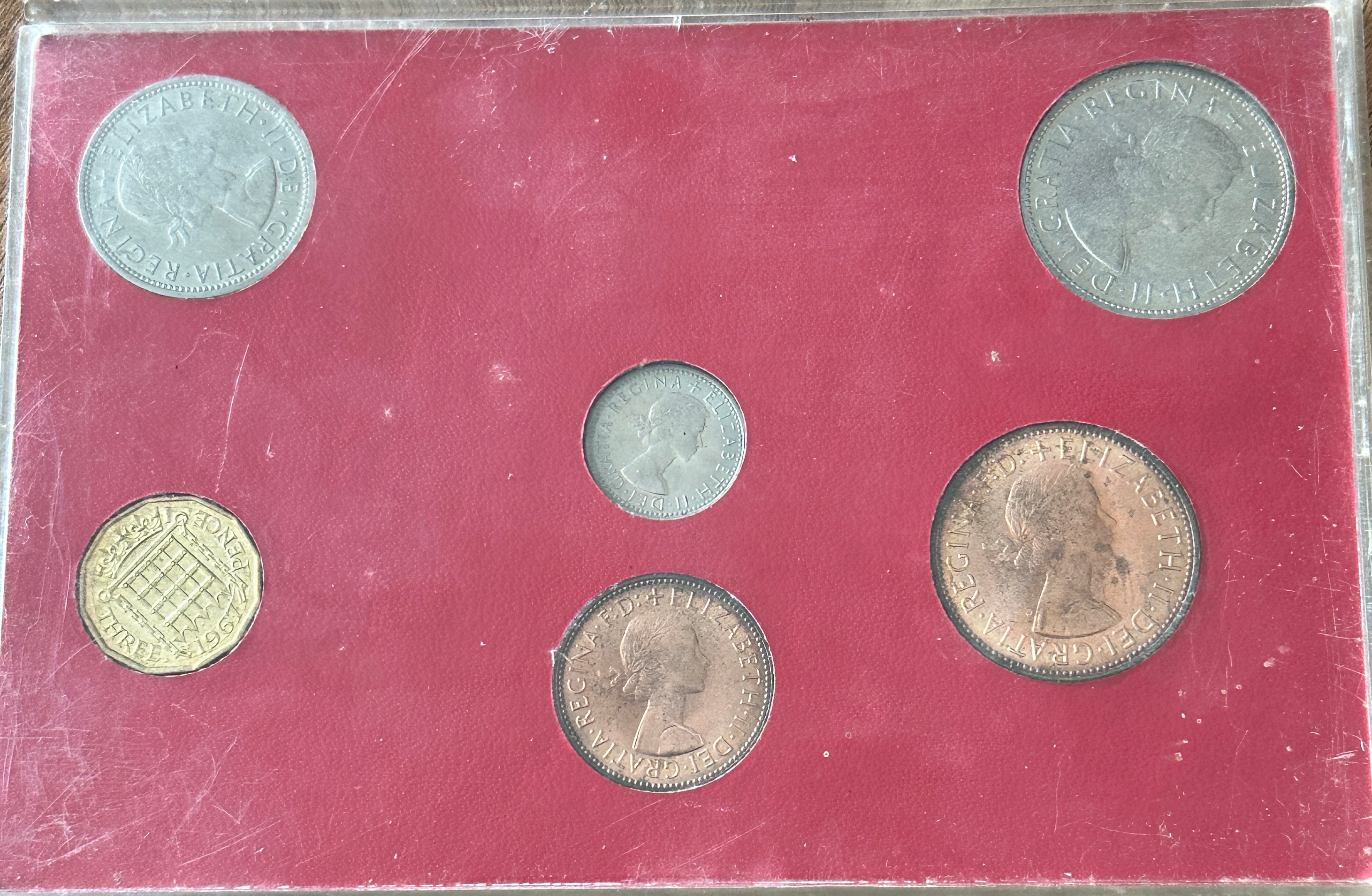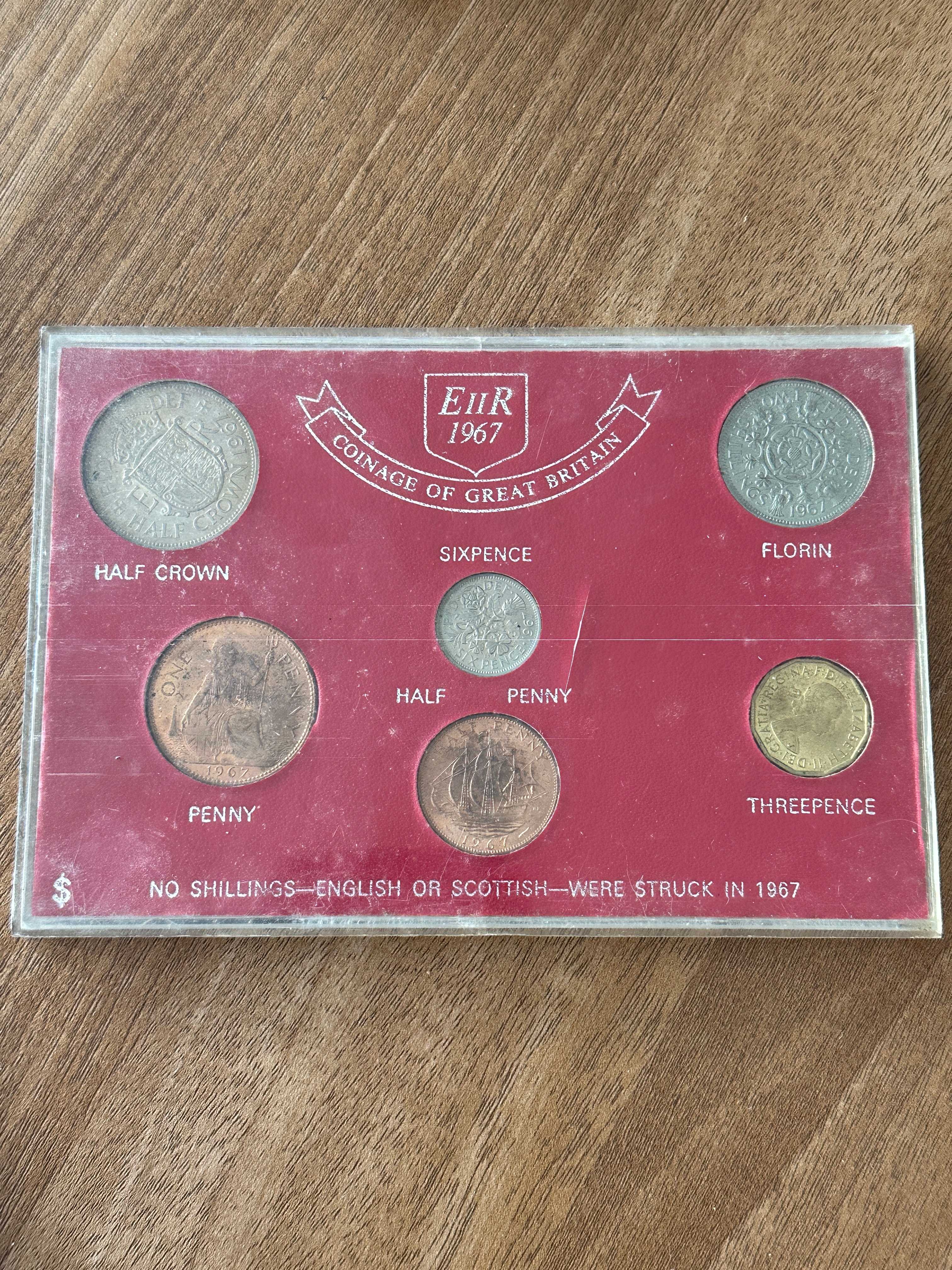 A 1967 British coin set presented in its original red cardboard and foil presentation pack, featuring a clear plastic front. The packaging is titled “E II R 1967 COINAGE OF GREAT BRITAIN” and contains six distinct pre-decimal coins: a Half Crown, Florin, Sixpence, Half Penny, Penny, and Threepence. All coins feature the effigy of Queen Elizabeth II and are dated 1967, exhibiting various metallic compositions from silver-toned to bronze-toned. Additional text on the packaging reads: “NO SHILLINGS ENGLISH OR SCOTISH WERE STRUCK IN 1967.”