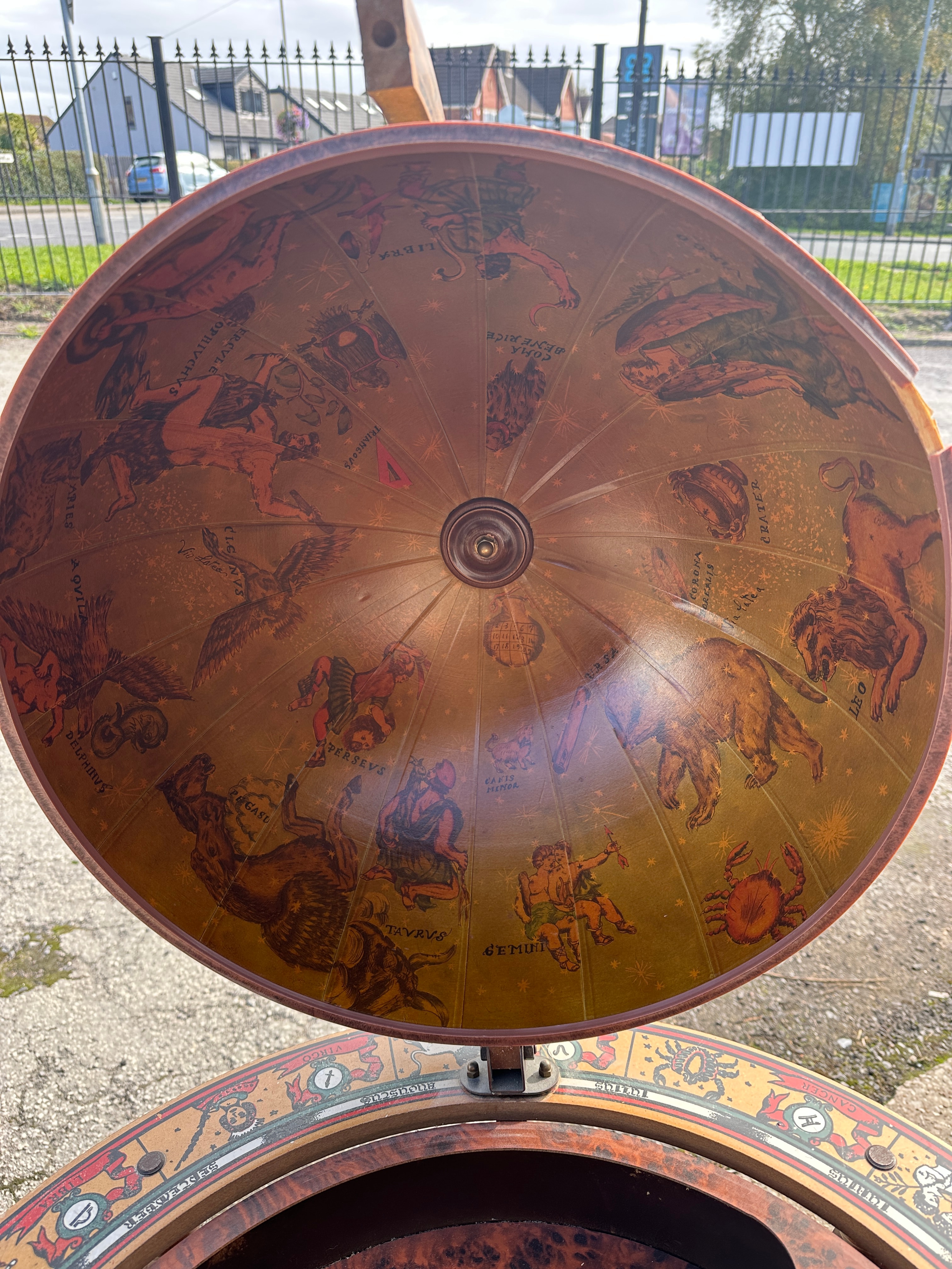 A vintage-style wooden globe bar or drinks cabinet, attributed to Zoffoli’s Dedalo model. The piece is constructed with turned wooden legs and base, supporting a paper or parchment-covered globe. The globe’s exterior features a historical world map with Latin annotations such as “OCEANUS ATLANTICUS” and decorative illustrations including ships and sea monsters. The globe opens on a brass hinge to reveal an internal compartment with a burlwood-effect veneer, designed to hold bottles and glassware. The interior of the globe dome displays constellations and zodiac signs with Latin names such as “TAURUS” and “GEMINI.” The upper rim of the base features astrological zodiac symbols alongside Italian calendar months, including “GENNAIO” (January) and “DICEMBRE” (December). A lower circular shelf is adorned with an inlaid compass rose design, and the entire unit rests on brass castors.