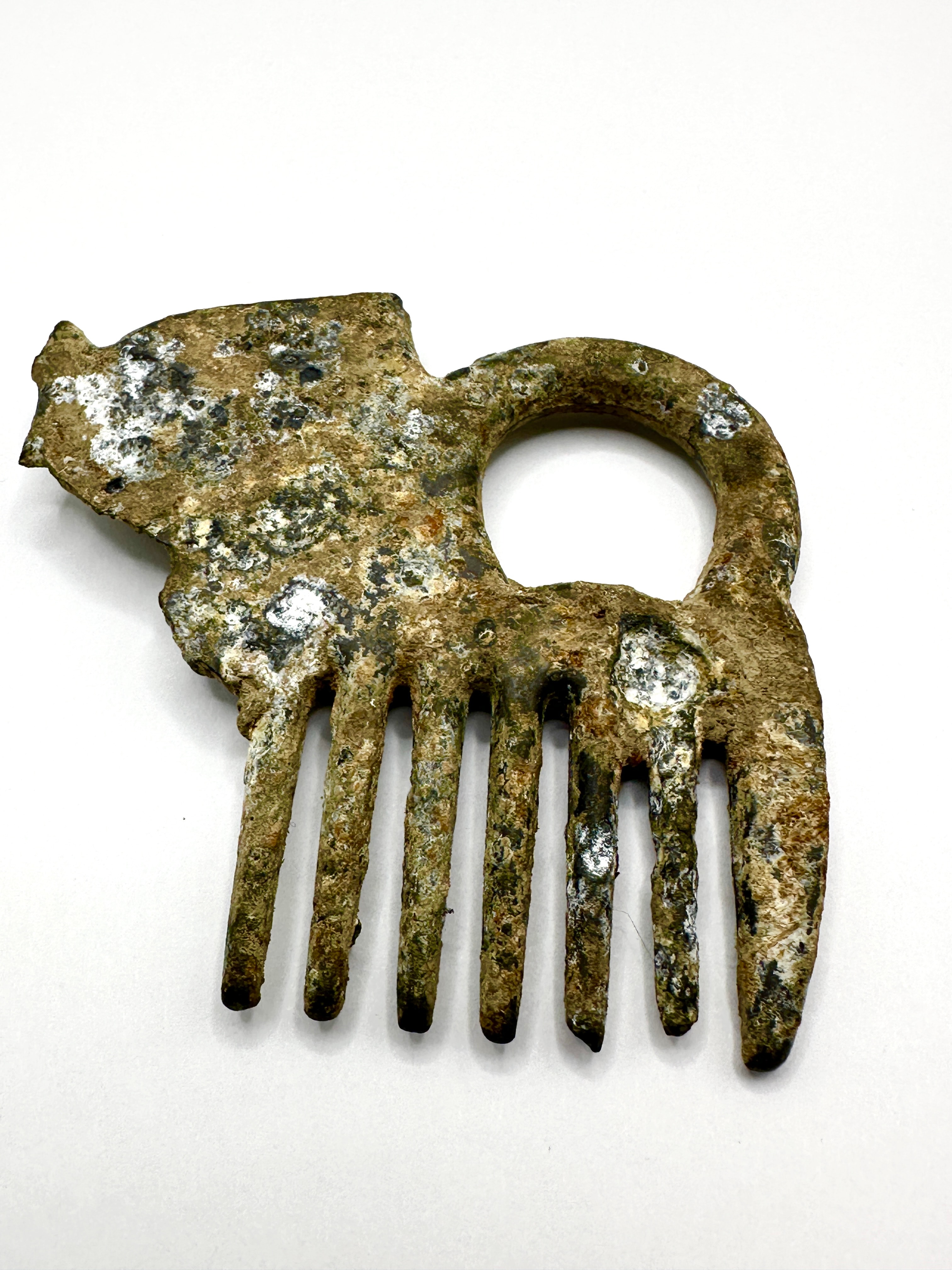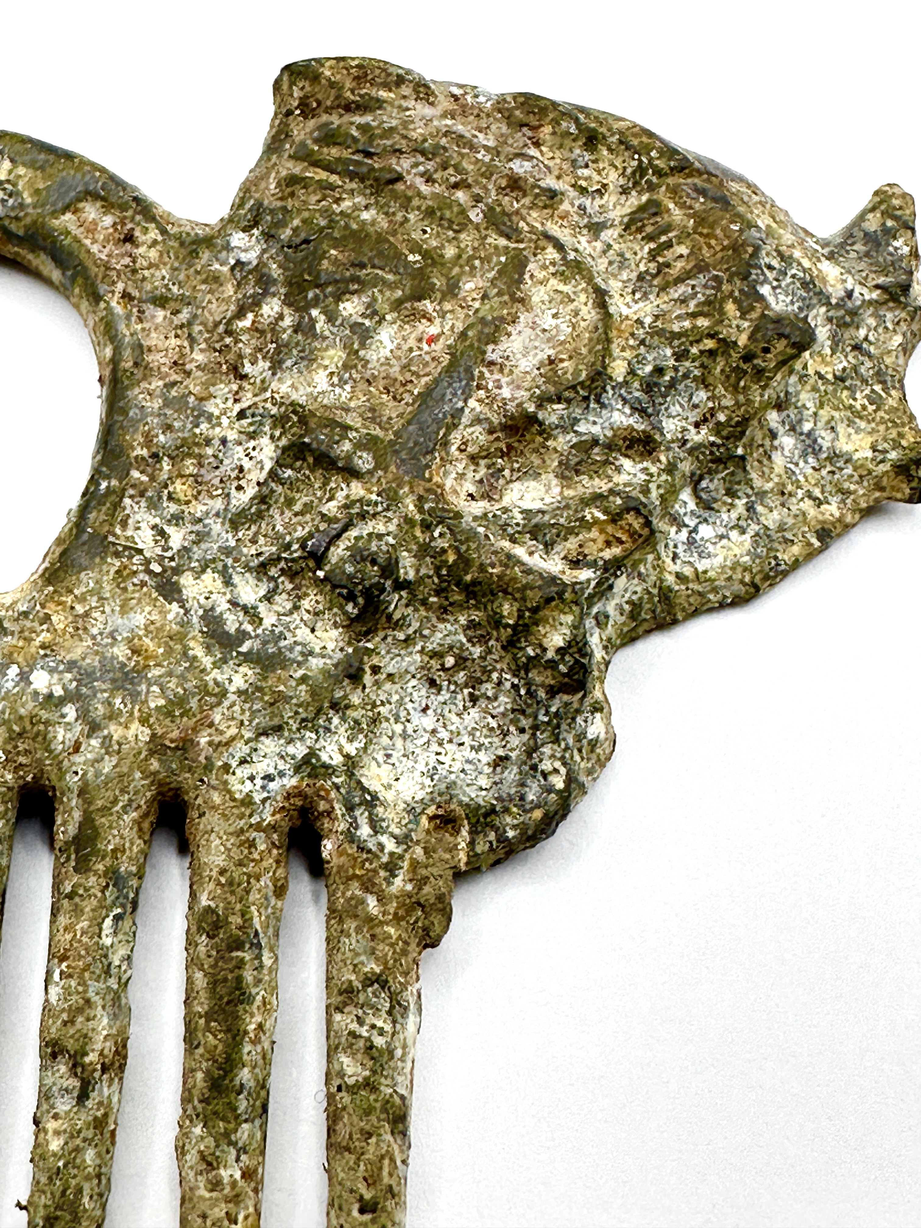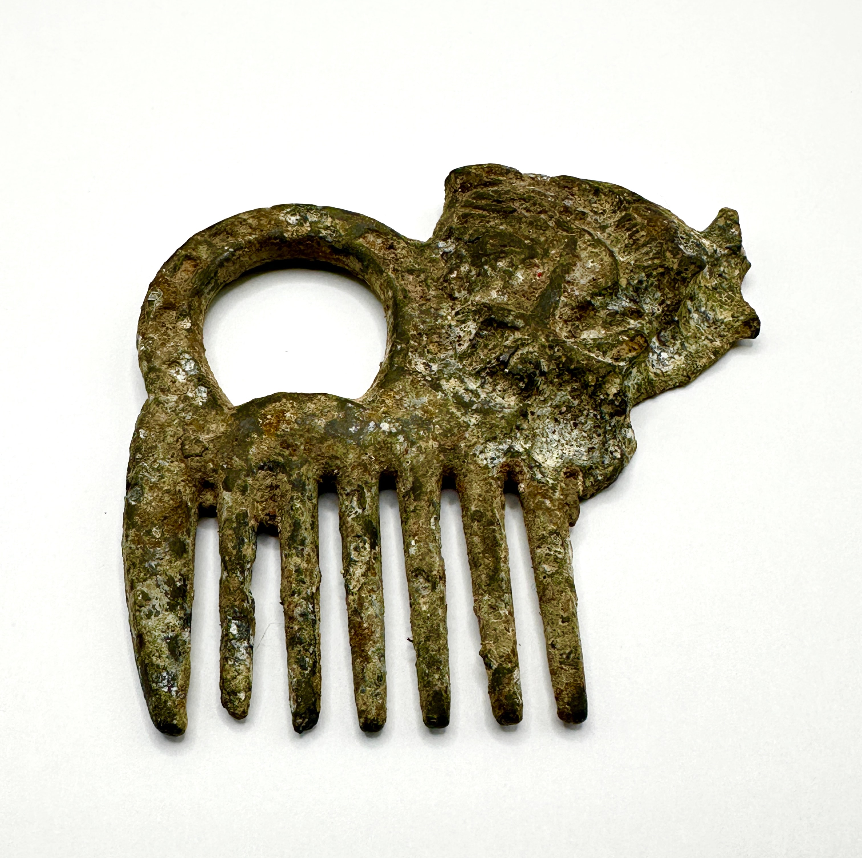 A Roman-style verdigris bronze hair comb, crafted from a copper alloy. The design features a series of six robust, widely spaced teeth below a curved handle that incorporates a circular opening. The upper right portion of the object is decorated with what appears to be a zoomorphic head, possibly a lion or boar, rendered in relief.