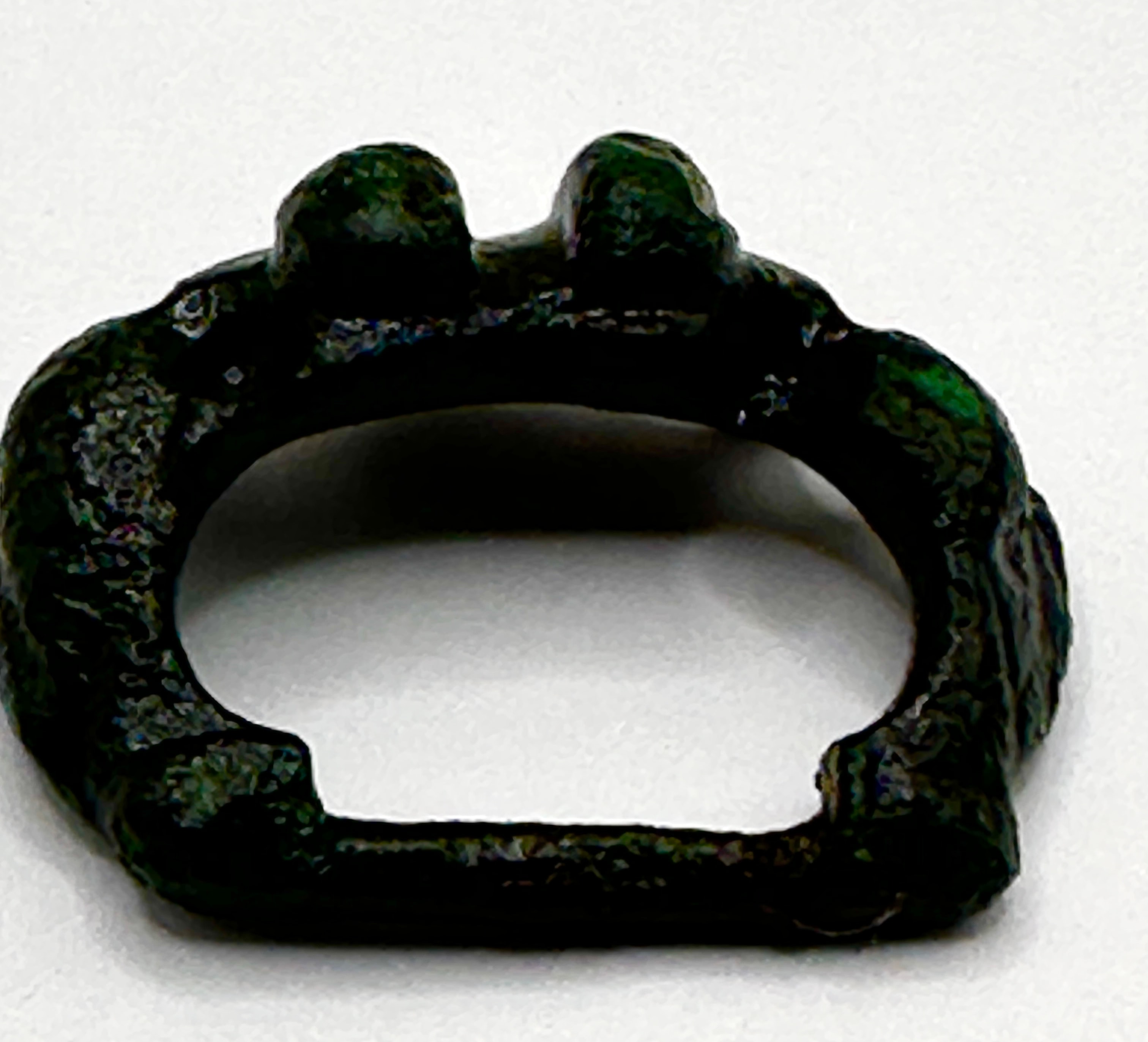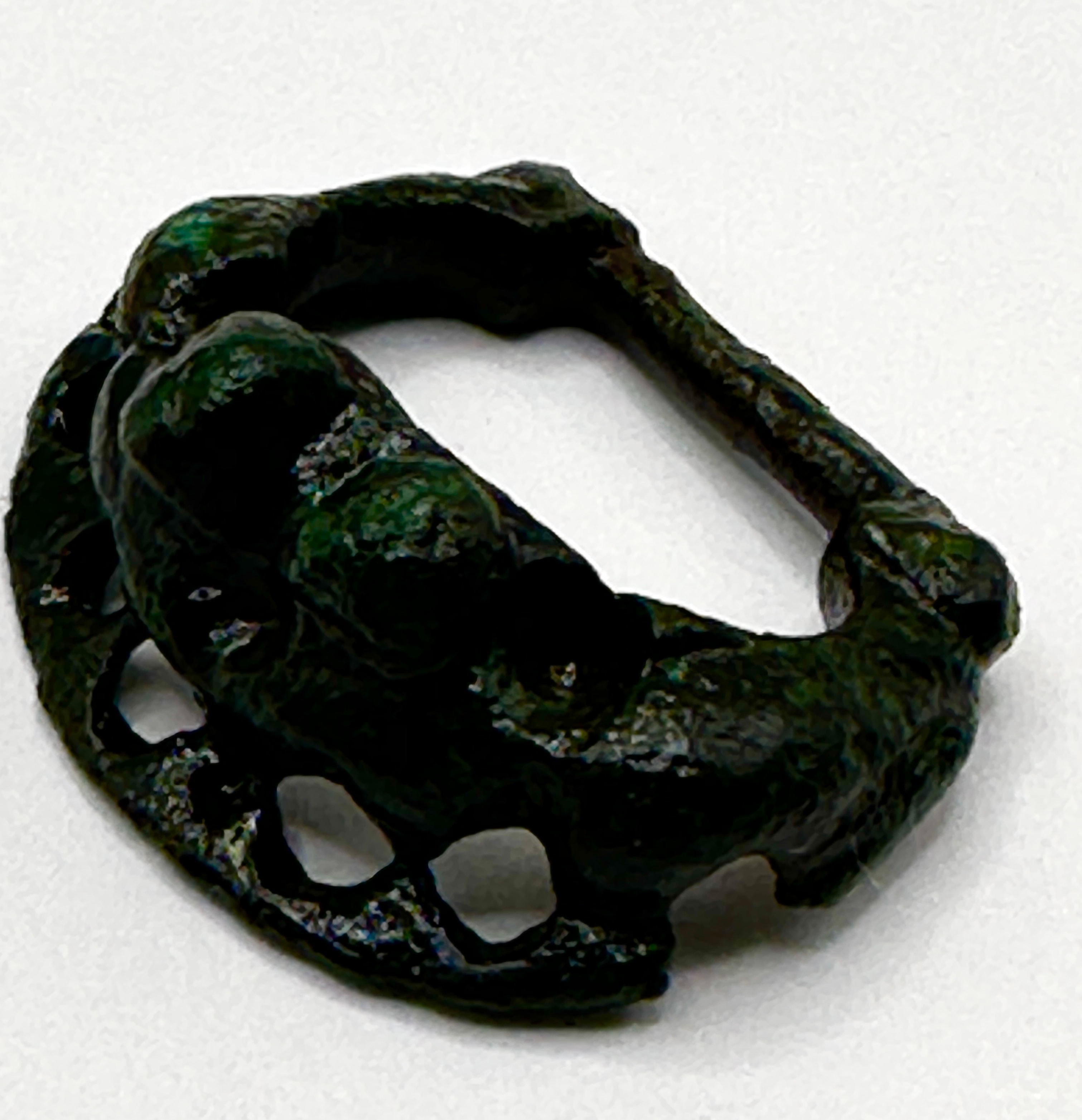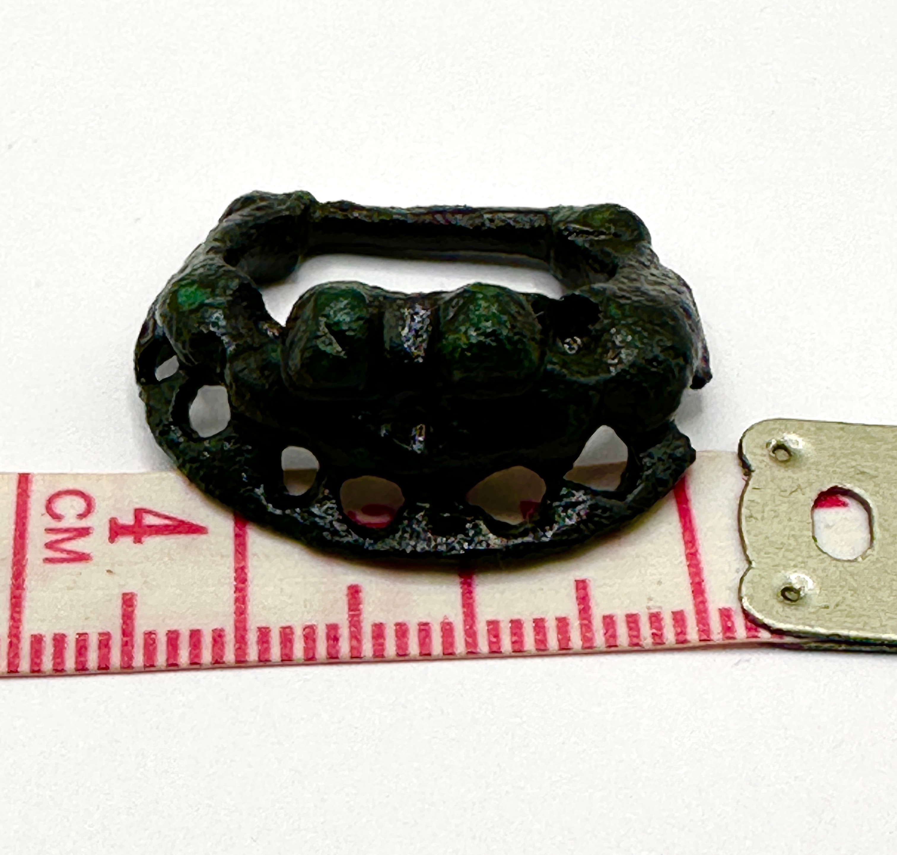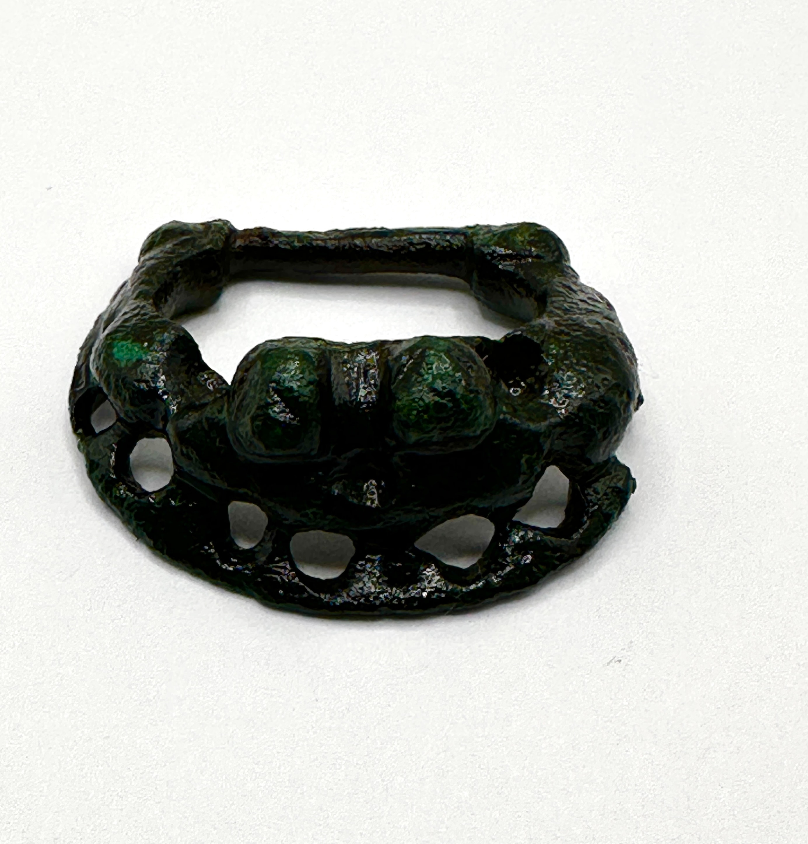 A Medieval copper-alloy buckle frame, dating to the 12th-13th century AD. This cast object, likely a buckle frame or decorative mount, features an irregular, somewhat organic or abstract shape. The openwork bottom section is composed of several irregular apertures, complemented by two prominent, rounded projections atop its opposing side.