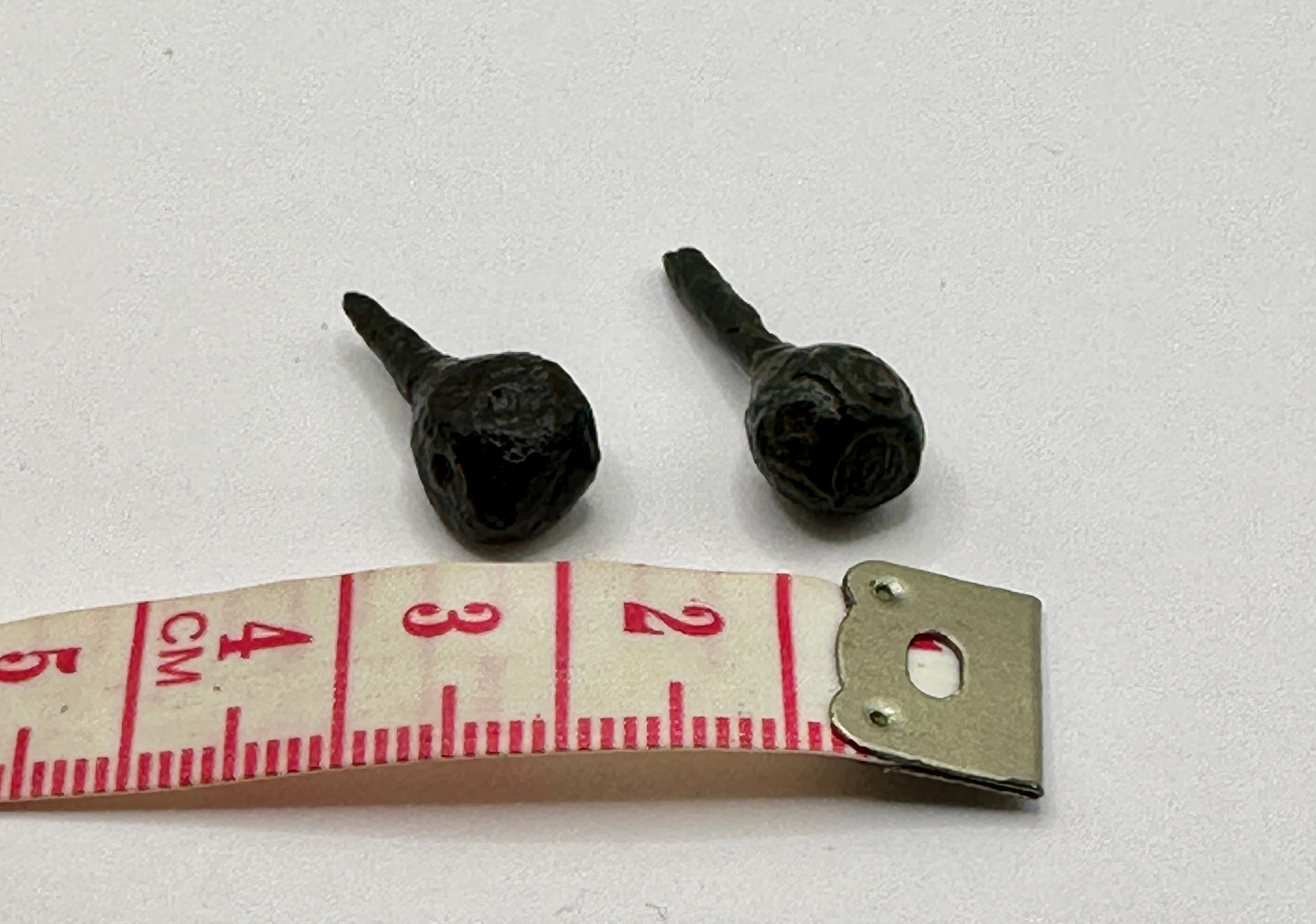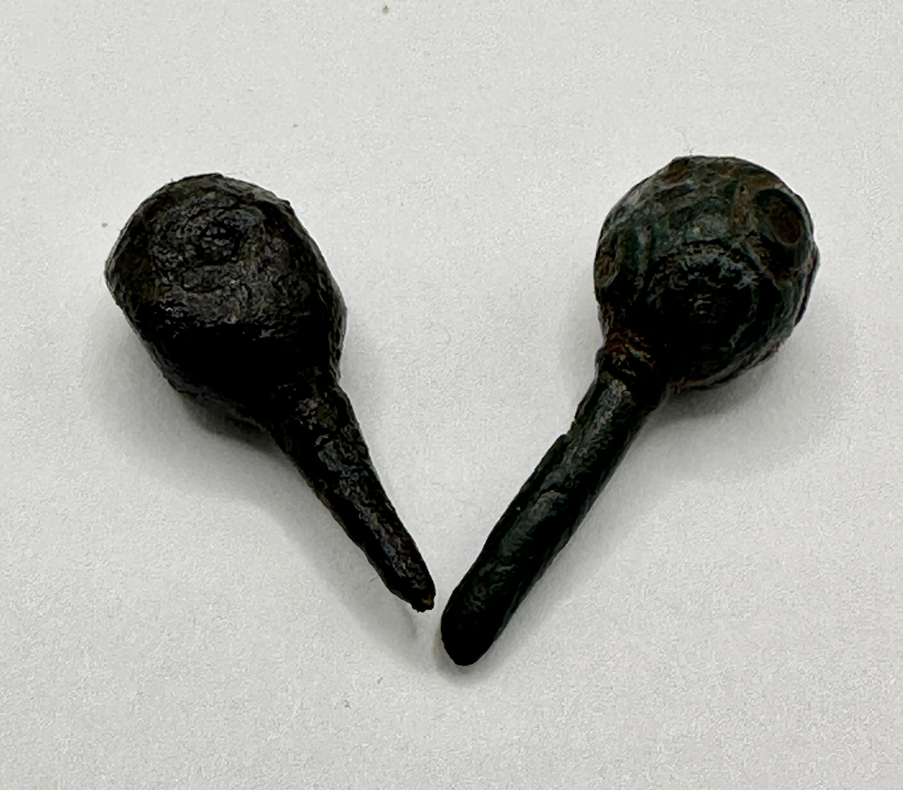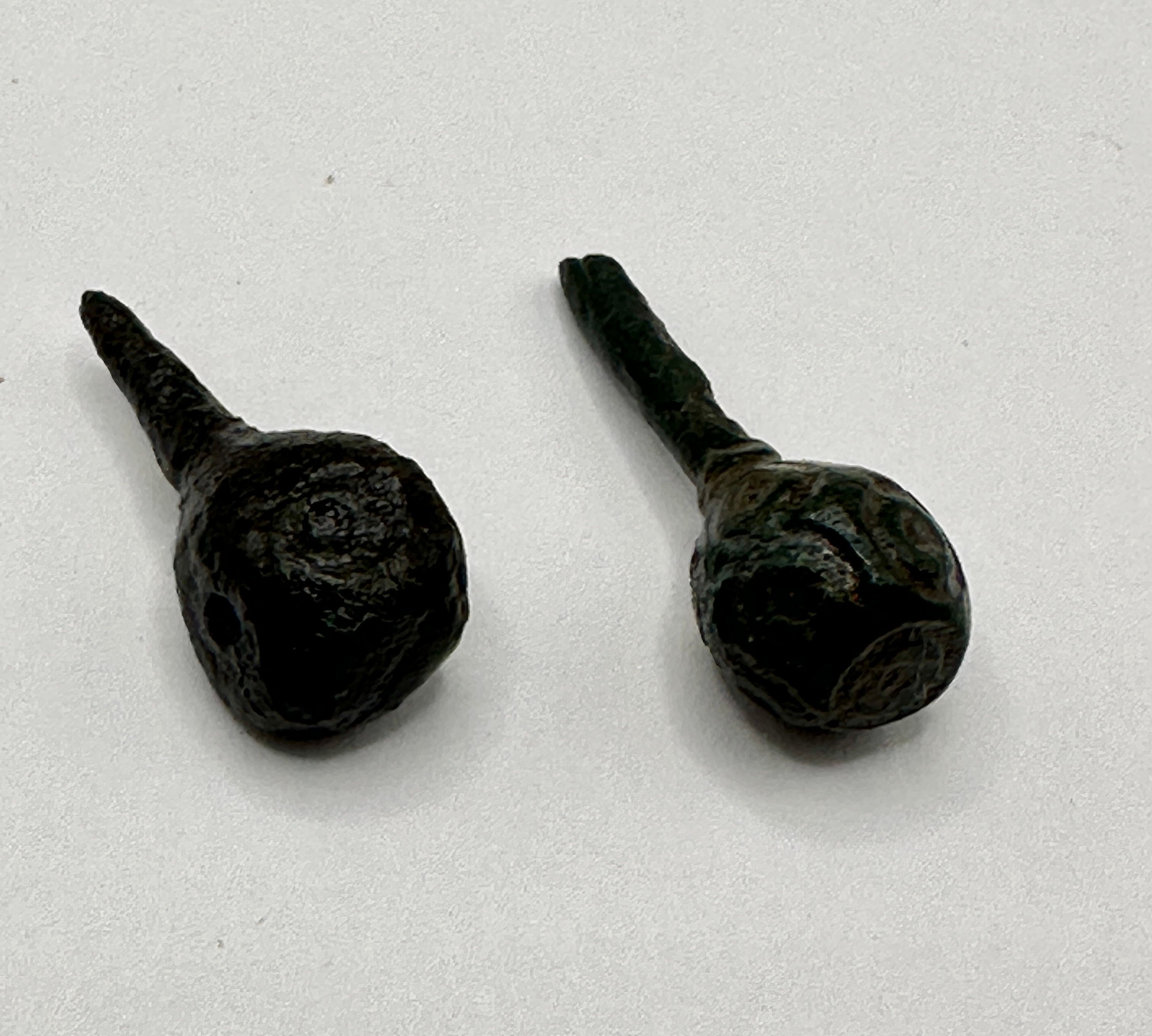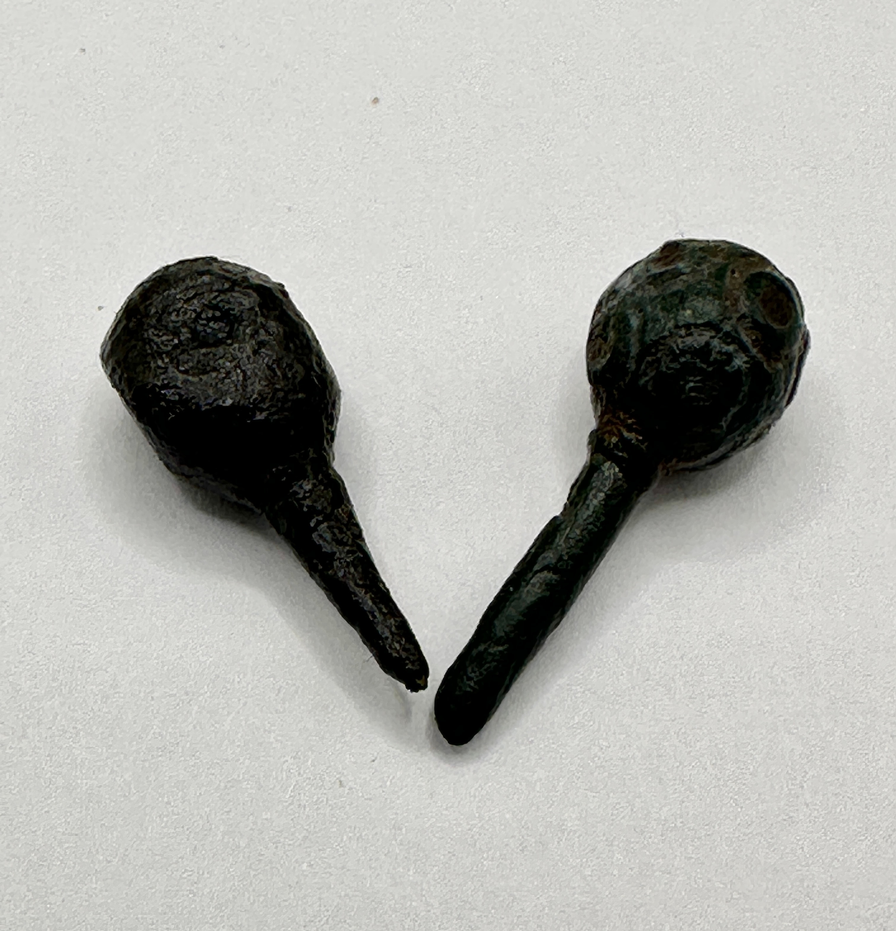 A pair of ancient metallic pins. Each object is characterized by a somewhat spherical or bulbous head tapering into a more slender, conical stem. The material appears to be a bronze or iron alloy, exhibiting significant surface degradation, deep pitting, and a thick, dark patina that ranges from black on the left object to a mottled dark green-black on the right, indicative of prolonged environmental exposure. No discernible text, markings, or specific stylistic details are visible due to the severe corrosion.