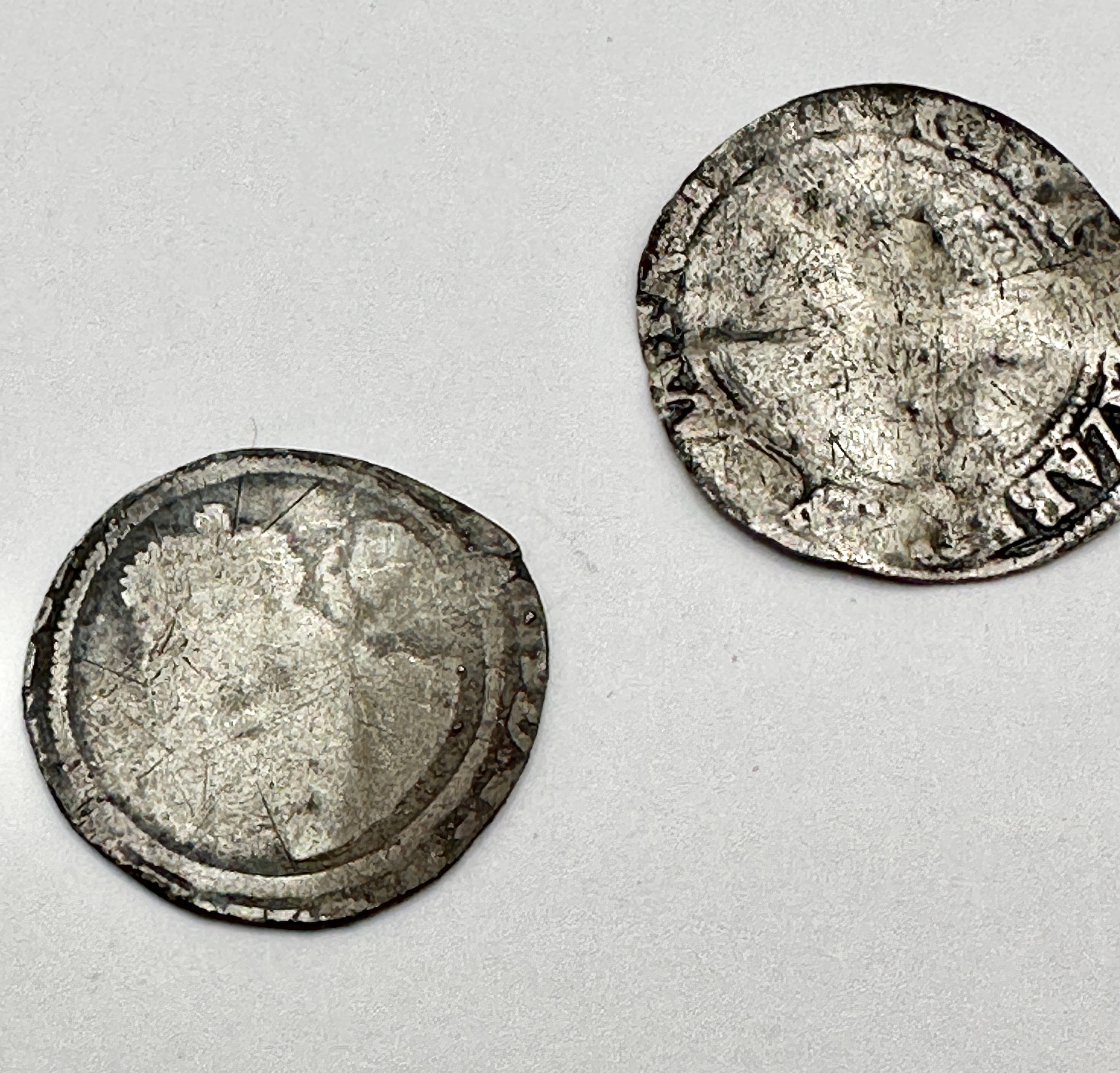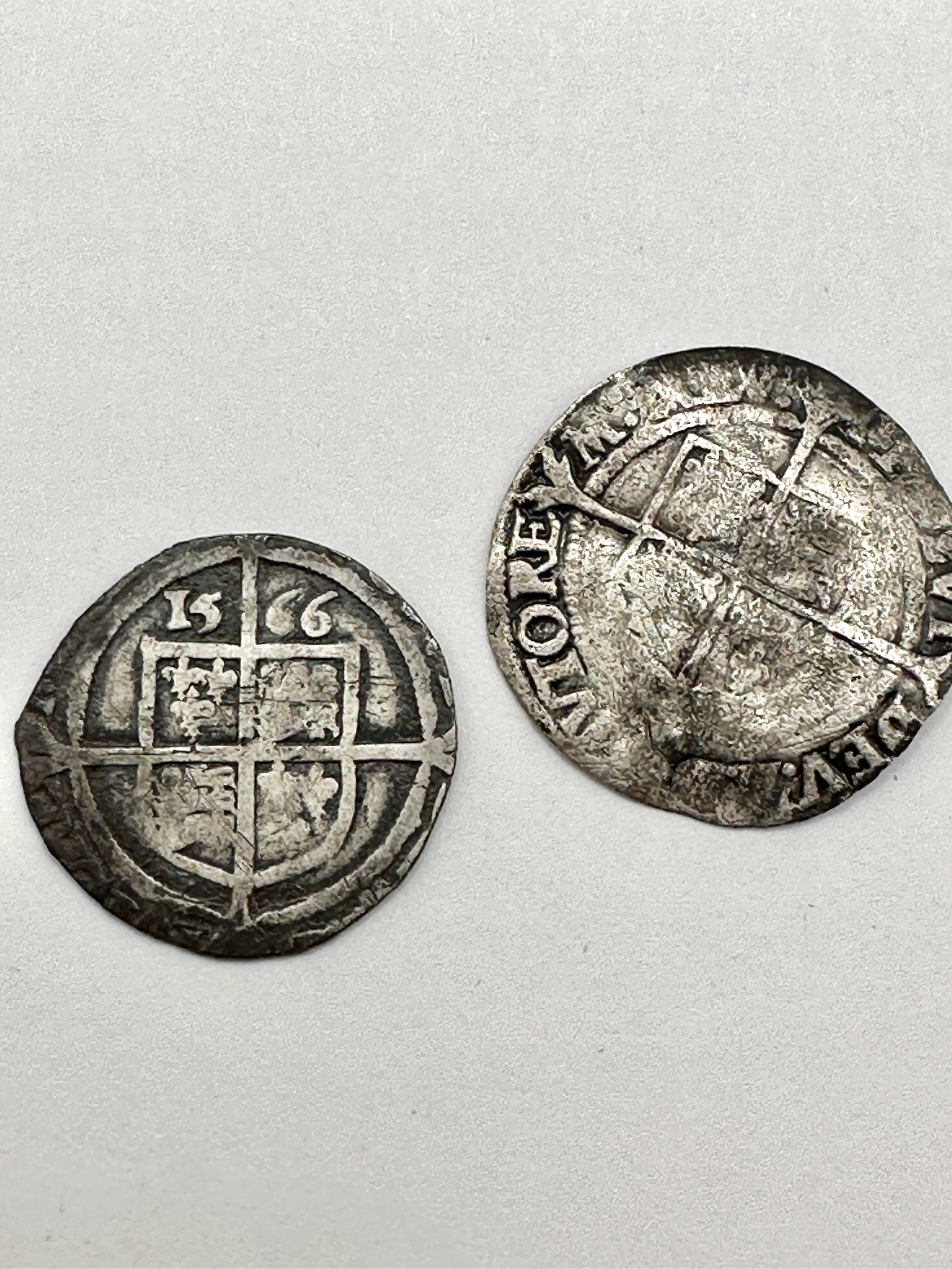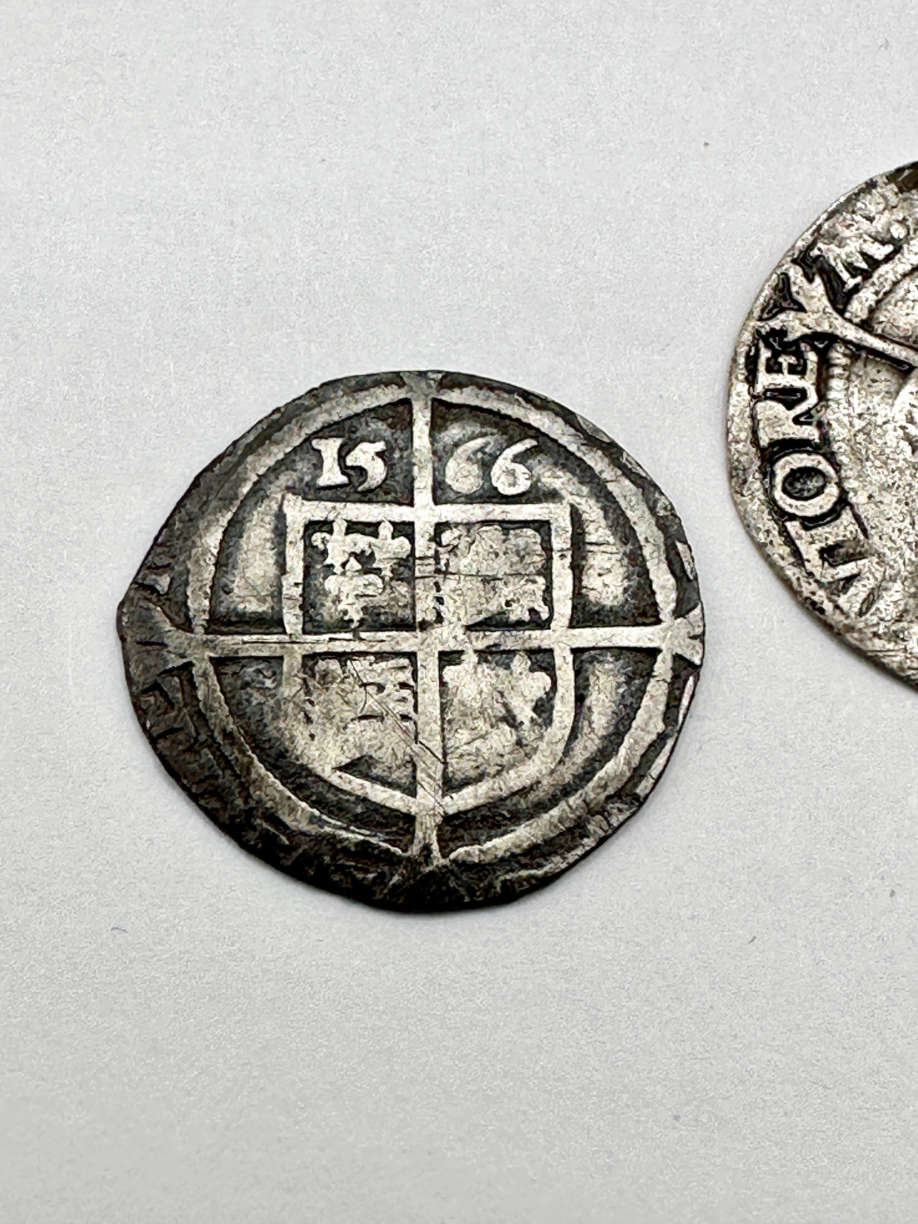 A pair of 16th Century European Vierer coins. These two irregularly shaped, silver-toned hammered coins include one dated ’15 66′, featuring a central shield divided into four quarters, likely armorial, surrounded by a faint circular legend. The second coin displays a crowned bust facing left, intersected by a prominent cross, with partial Latin legends “VTORE” and “DEI GR…” visible around the periphery.