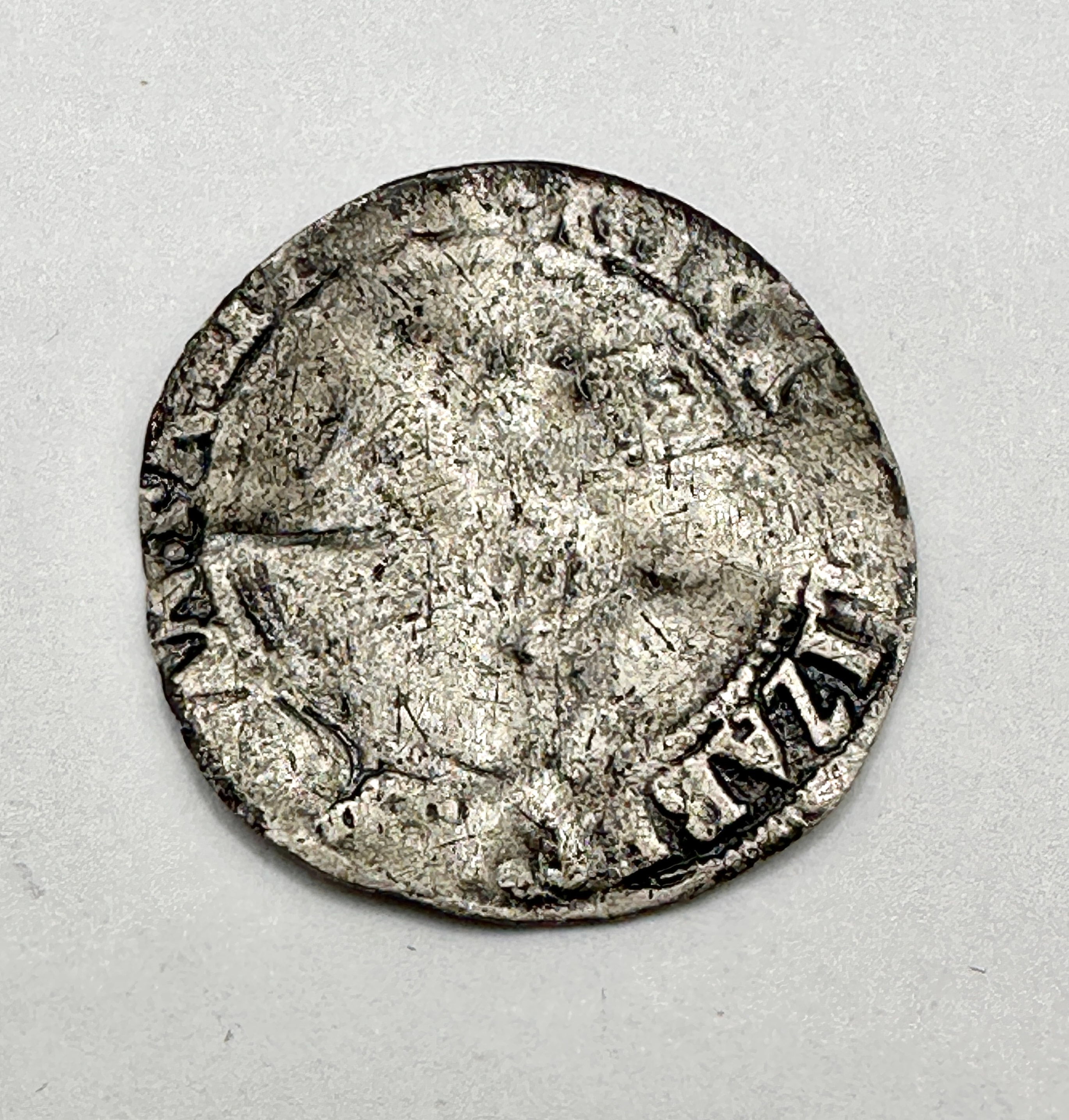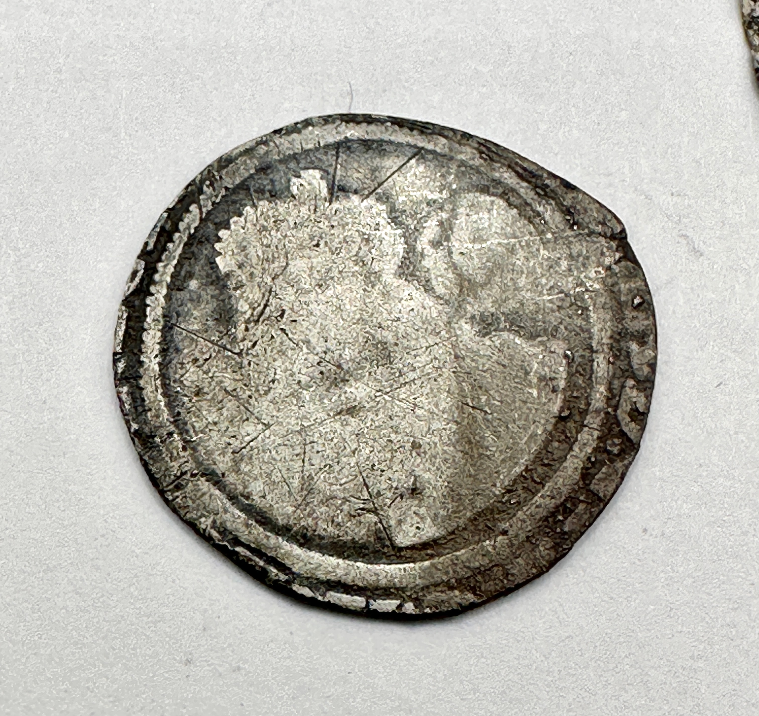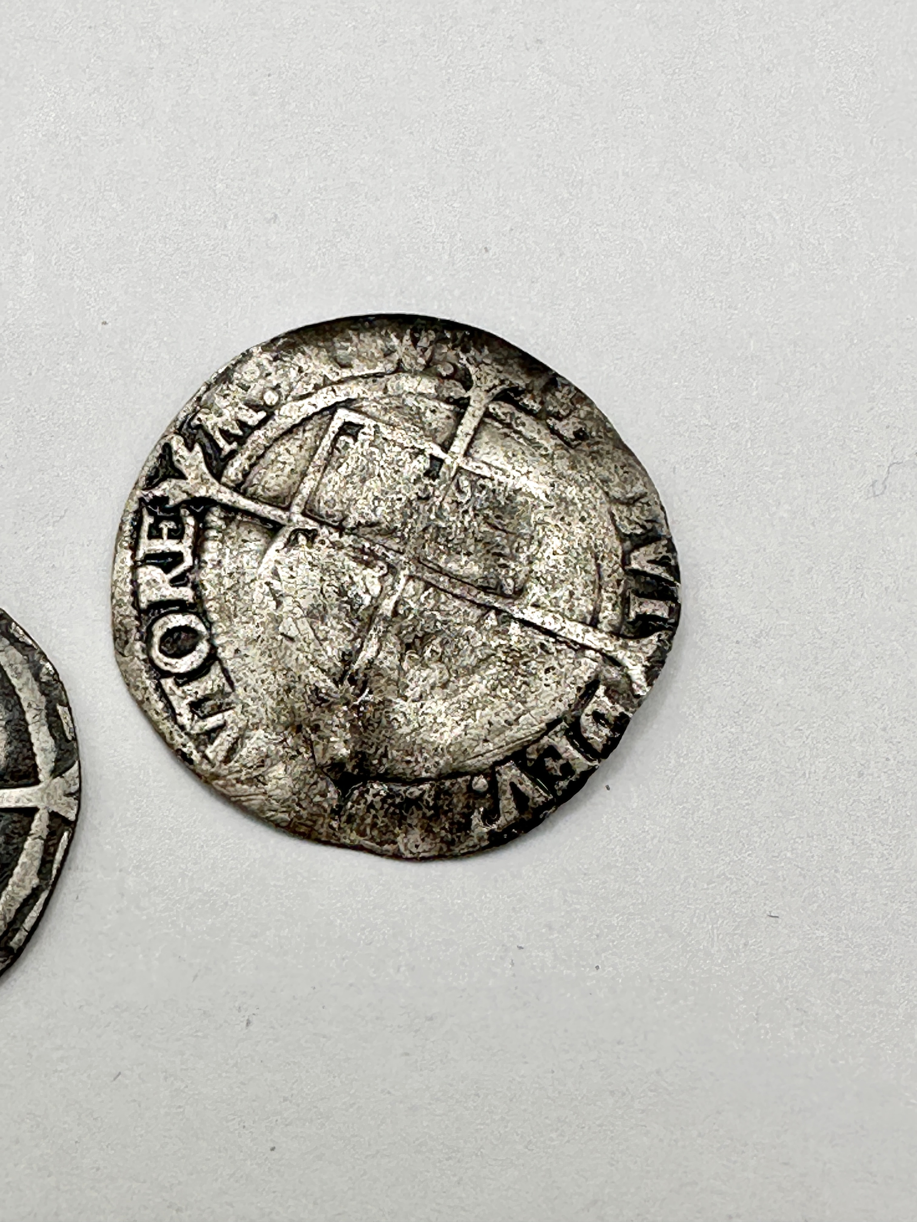 A pair of 16th Century European Vierer coins. These two irregularly shaped, silver-toned hammered coins include one dated ’15 66′, featuring a central shield divided into four quarters, likely armorial, surrounded by a faint circular legend. The second coin displays a crowned bust facing left, intersected by a prominent cross, with partial Latin legends “VTORE” and “DEI GR…” visible around the periphery.