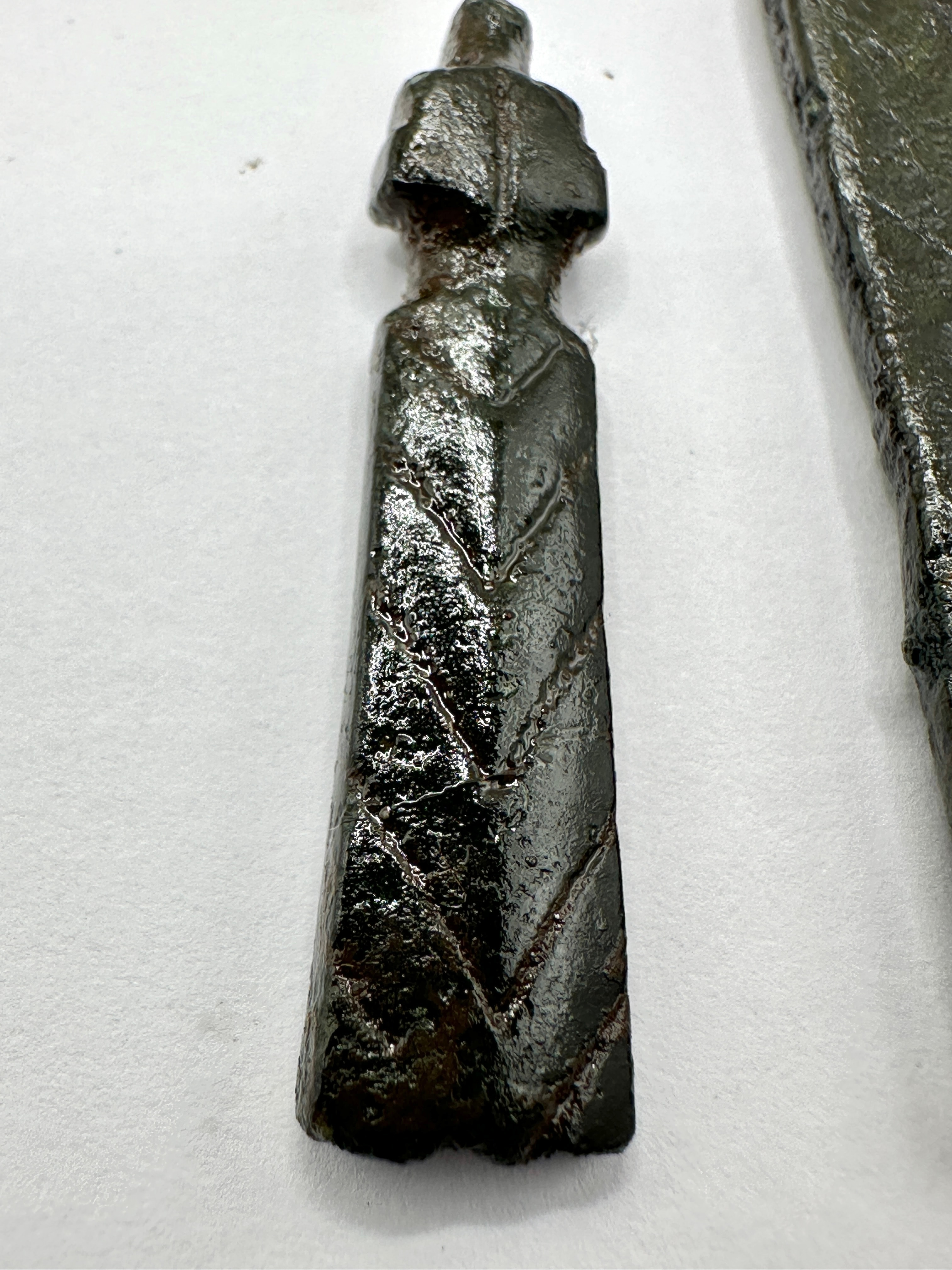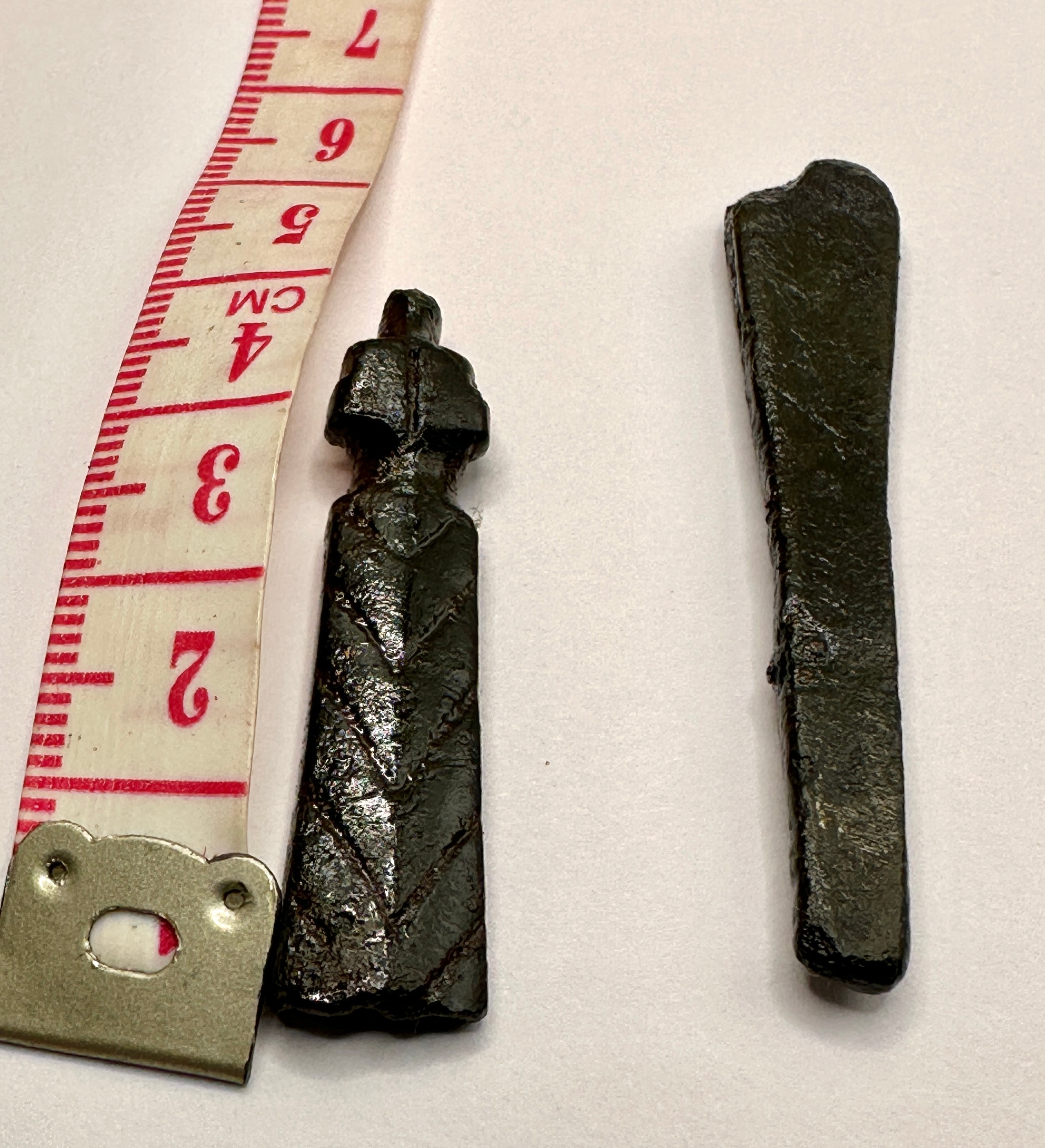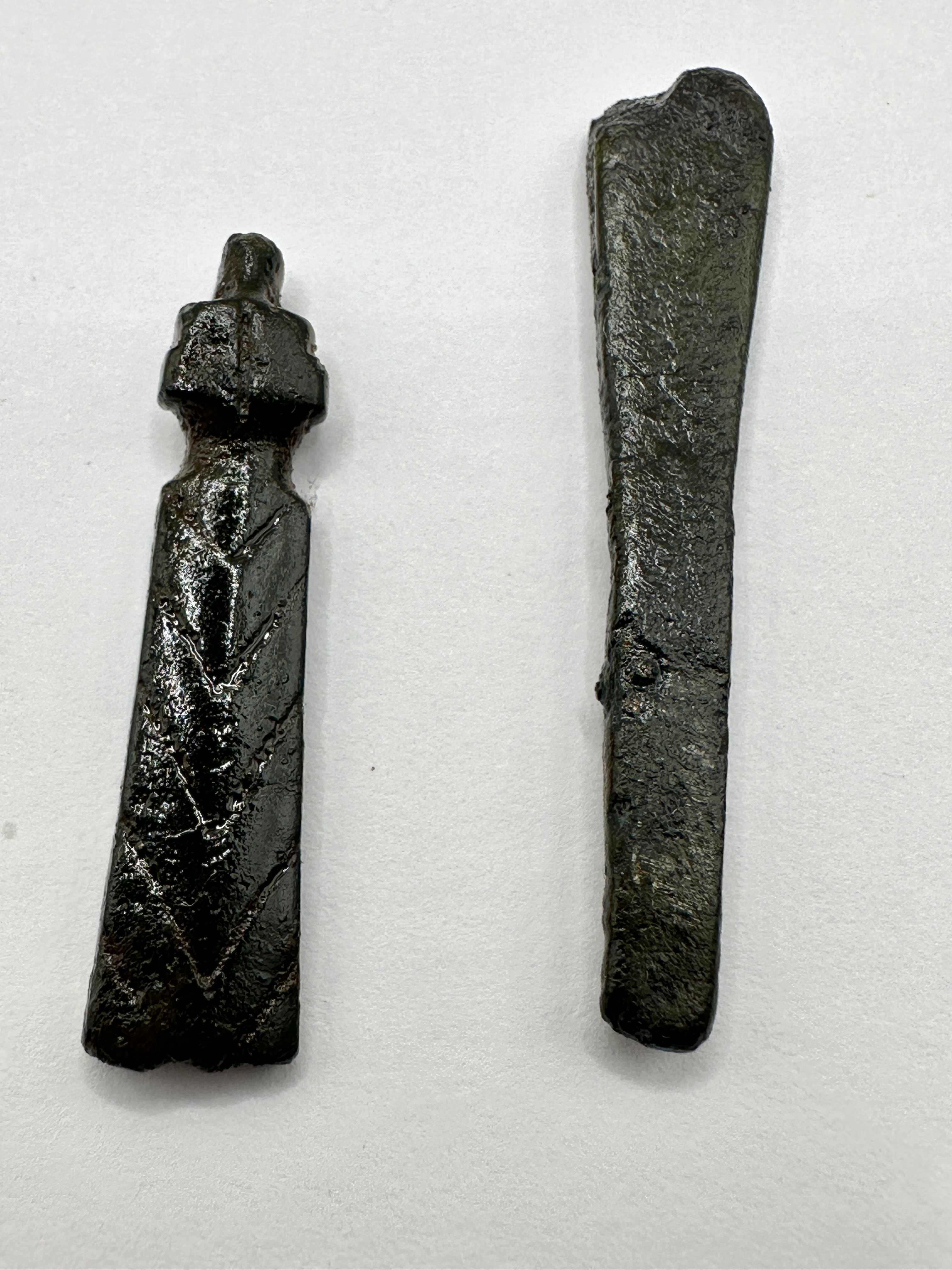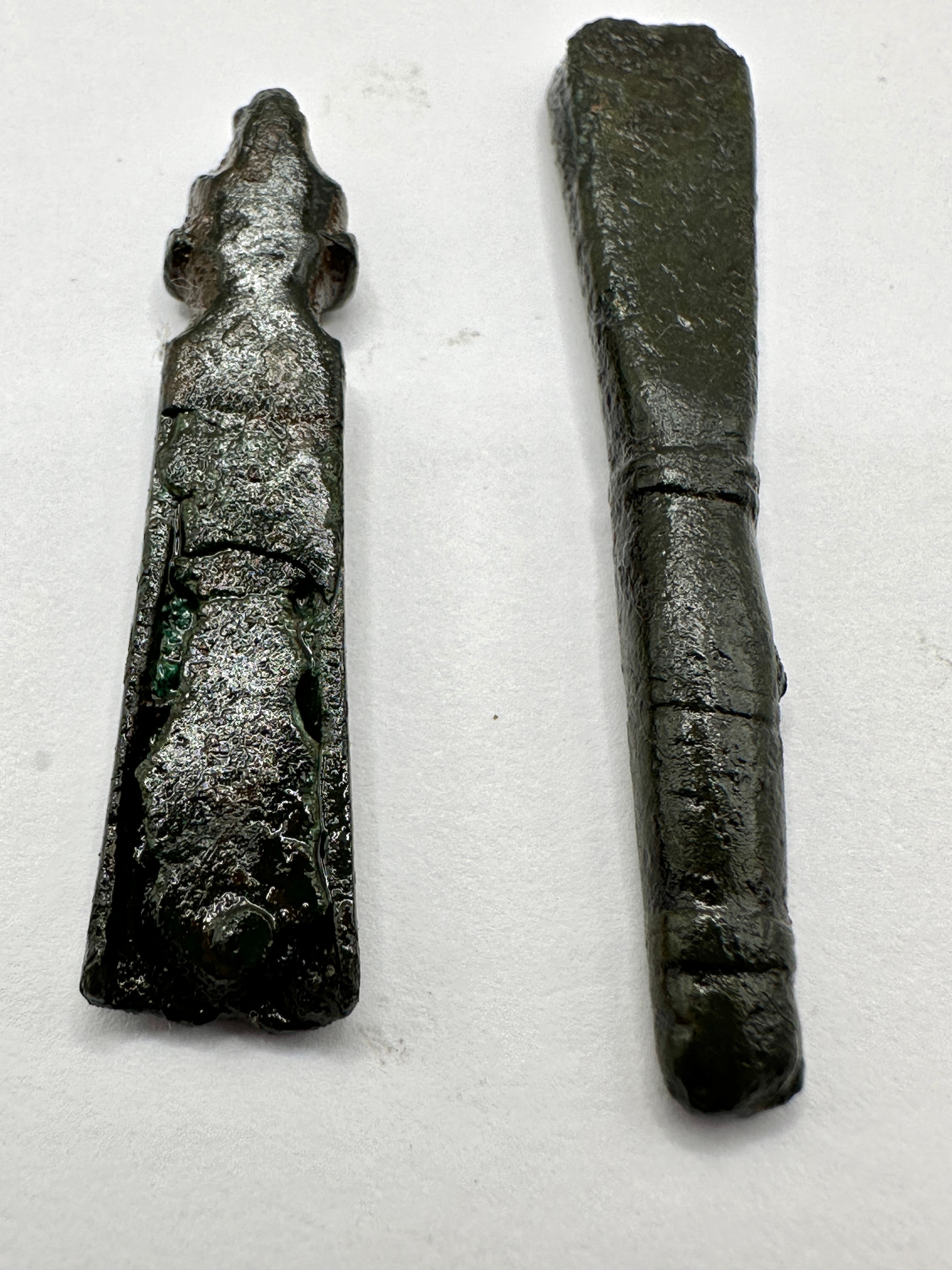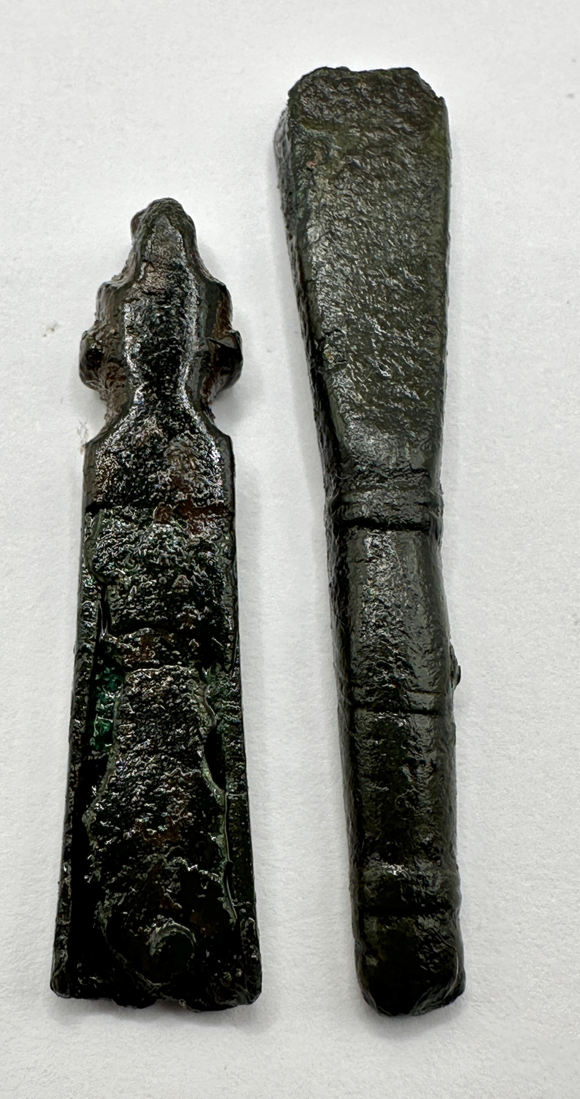 A pair of dark, heavily patinated metallic objects, likely bronze or a copper alloy, exhibiting a rough cast appearance. The object on the left features a stylized, possibly anthropomorphic or abstract terminal atop a tapering shaft decorated with pronounced chevron patterns on at least one visible face. The object on the right is an elongated, spatulate or wedge-shaped form, possibly a tool or implement fragment, showing subtle horizontal banding on its surface.