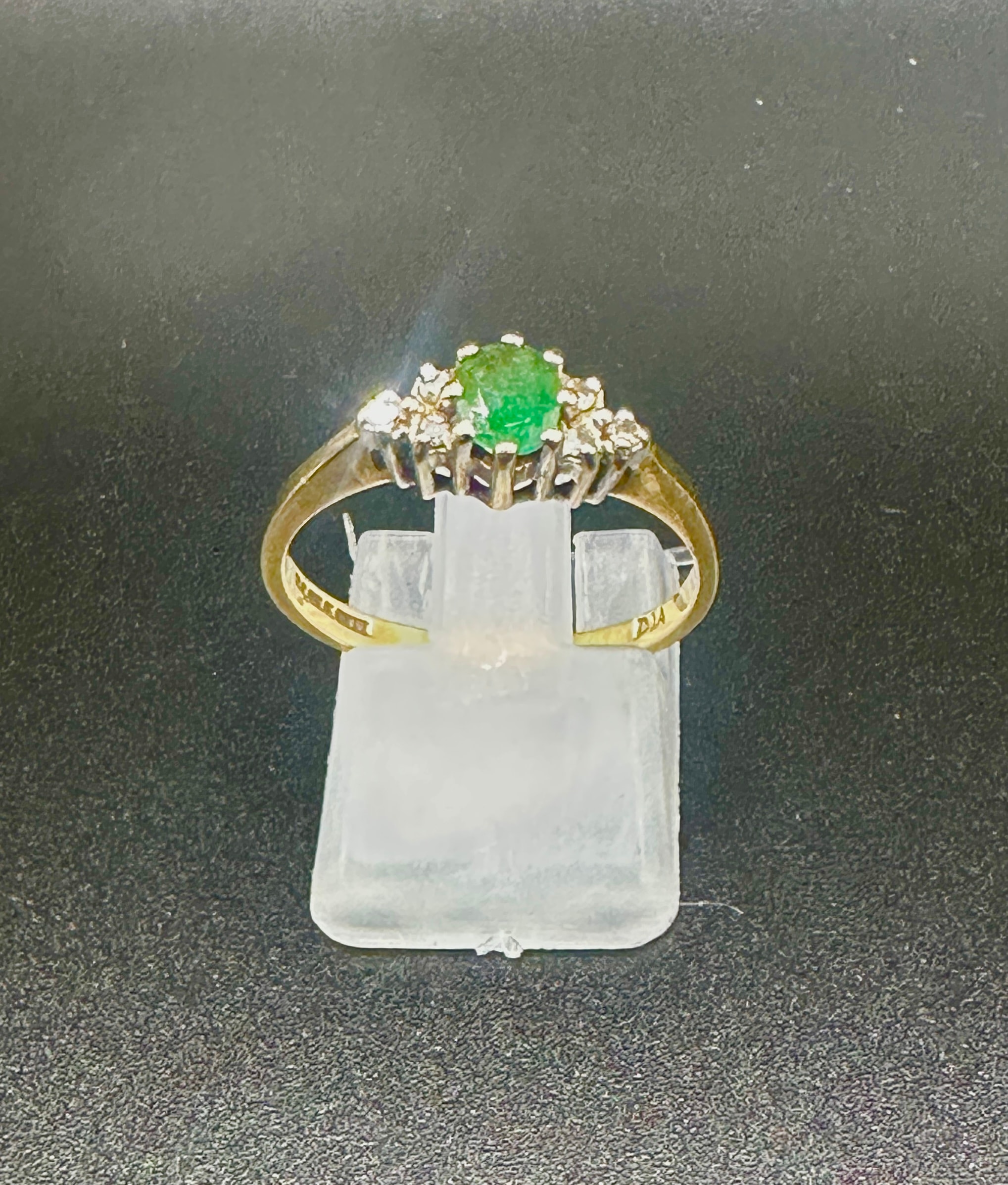 A 9k yellow gold ring set with a central oval-cut emerald, flanked by clusters of brilliant-cut diamonds forming a halo design. The ring bears interior markings including ‘DIA’.