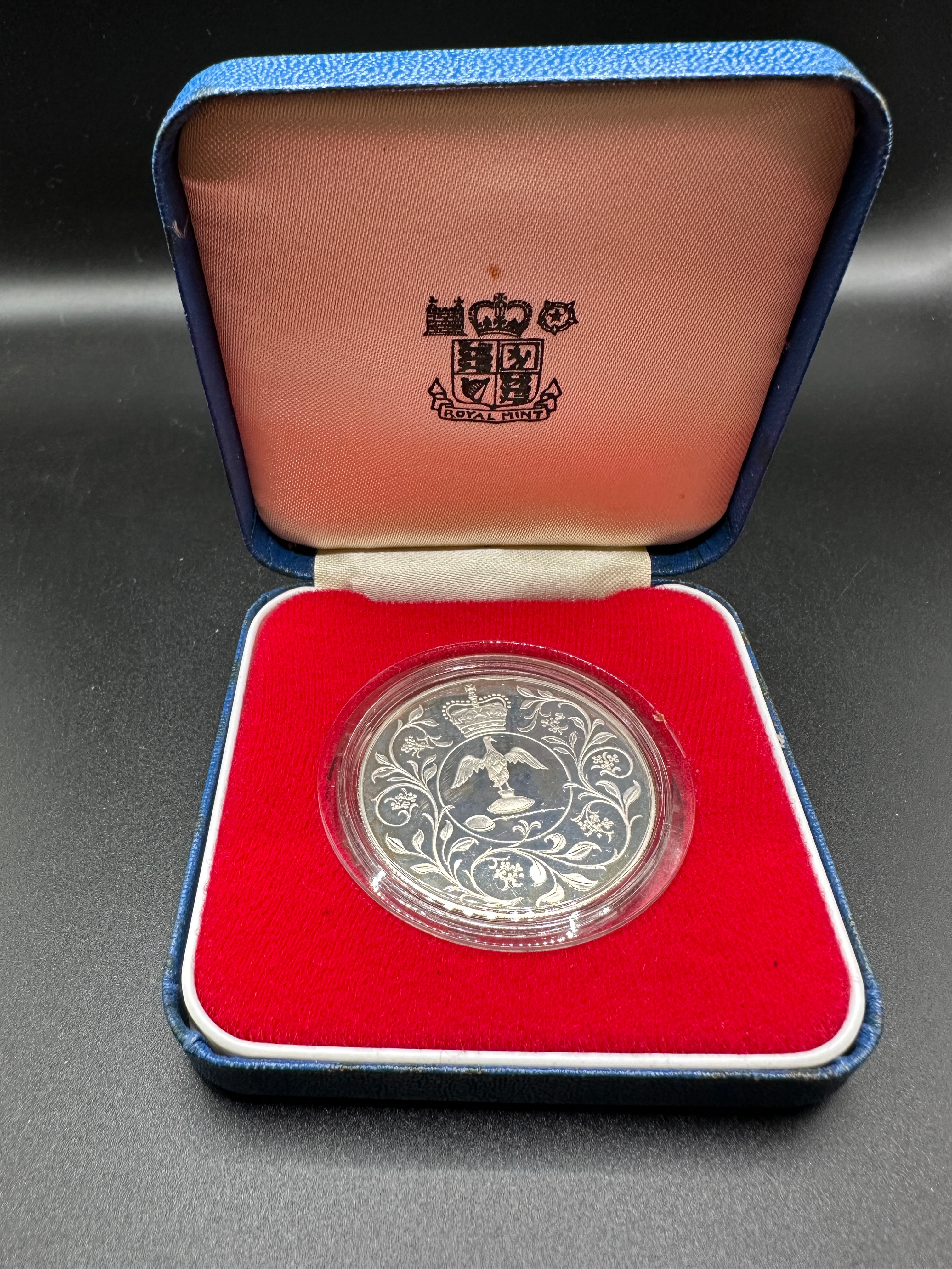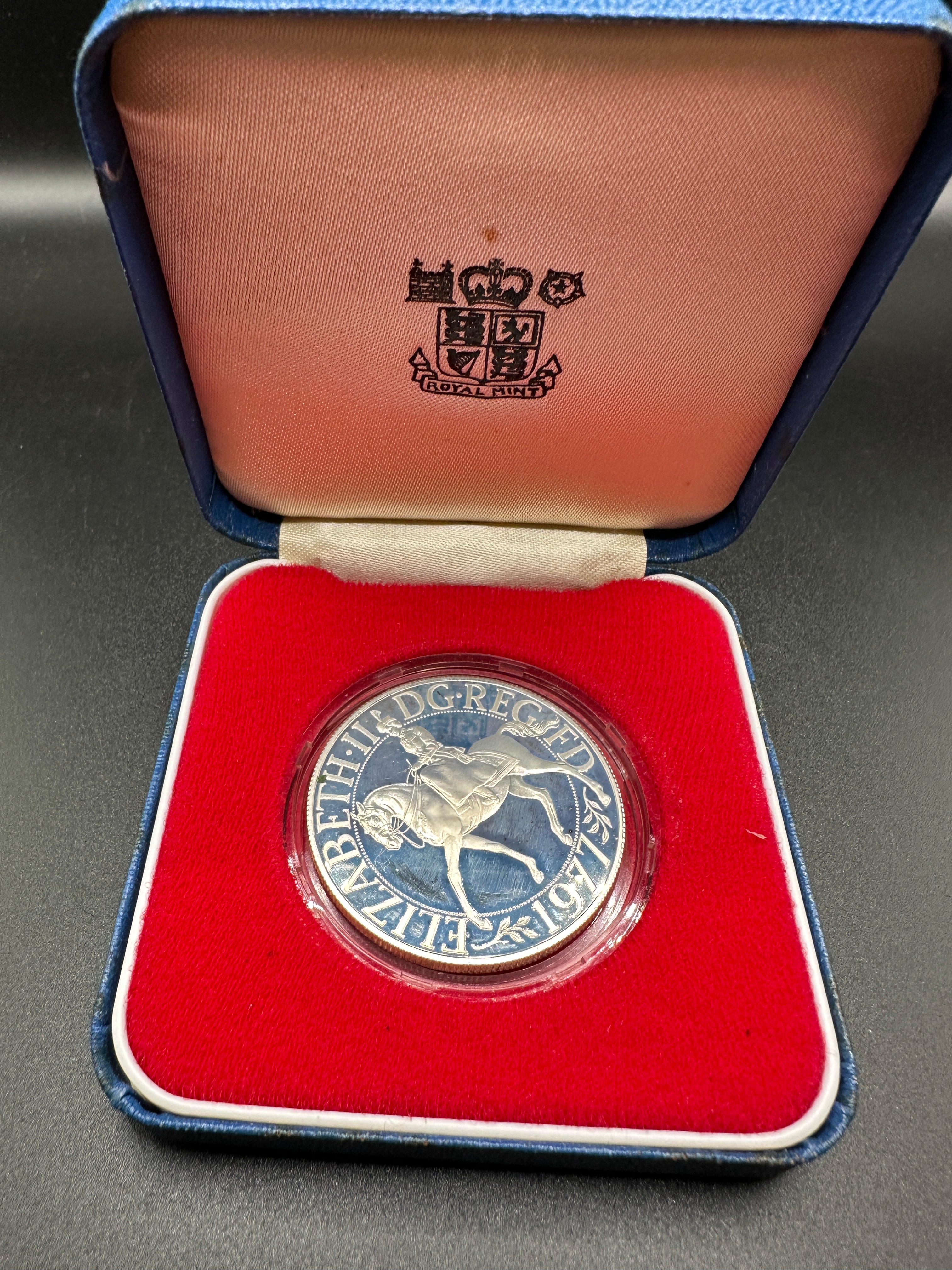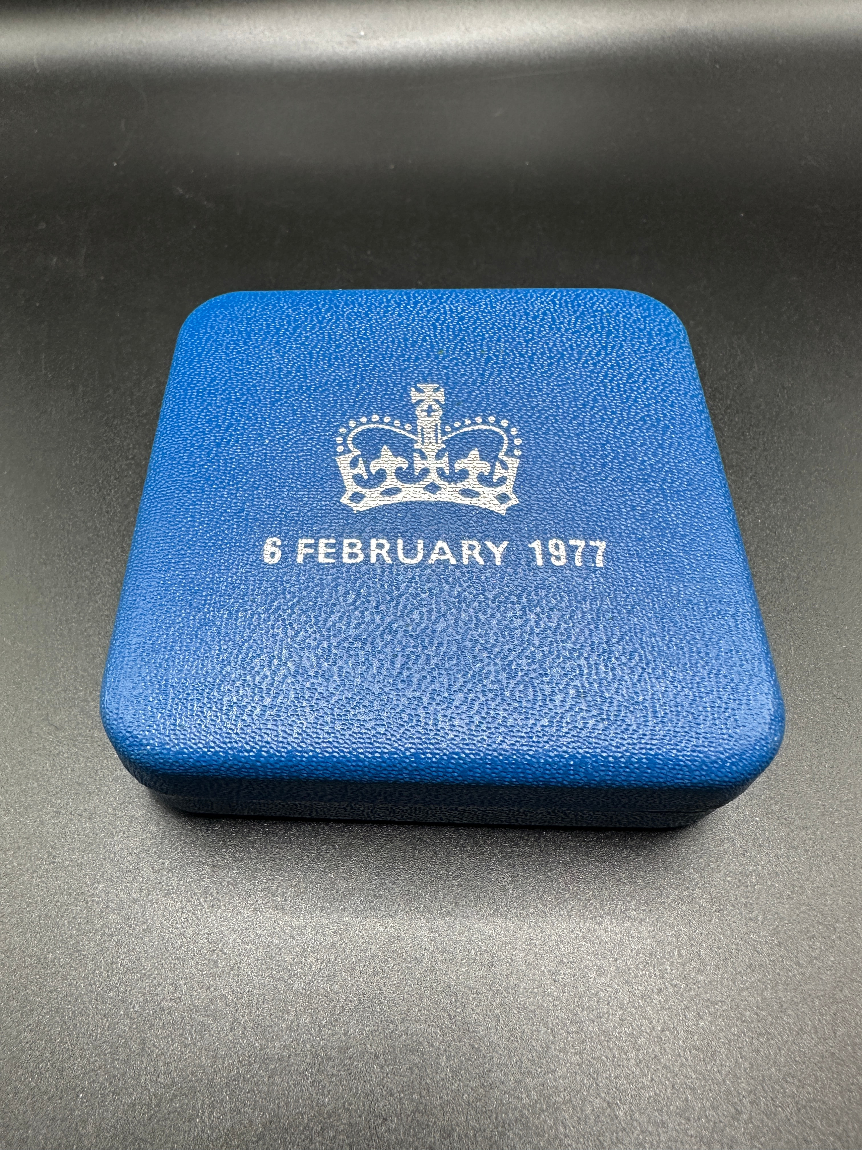 A 1977 Royal Mint Queen Elizabeth II Silver Jubilee Proof Crown, presented in its original blue, textured presentation case. The interior of the case is lined with red velvet for the coin’s recess and pink satin on the lid, which bears a printed crest with the text “ROYAL MINT”. The commemorative coin is protected within a clear plastic capsule. The obverse depicts a mounted figure and the inscription ‘ELIZABETH II DG REG FD 1977’. The reverse displays a crowned eagle-like bird surrounded by elaborate floral and scrollwork designs. The exterior of the case lid is embossed with a crown symbol and the specific date ‘6 FEBRUARY 1977’.