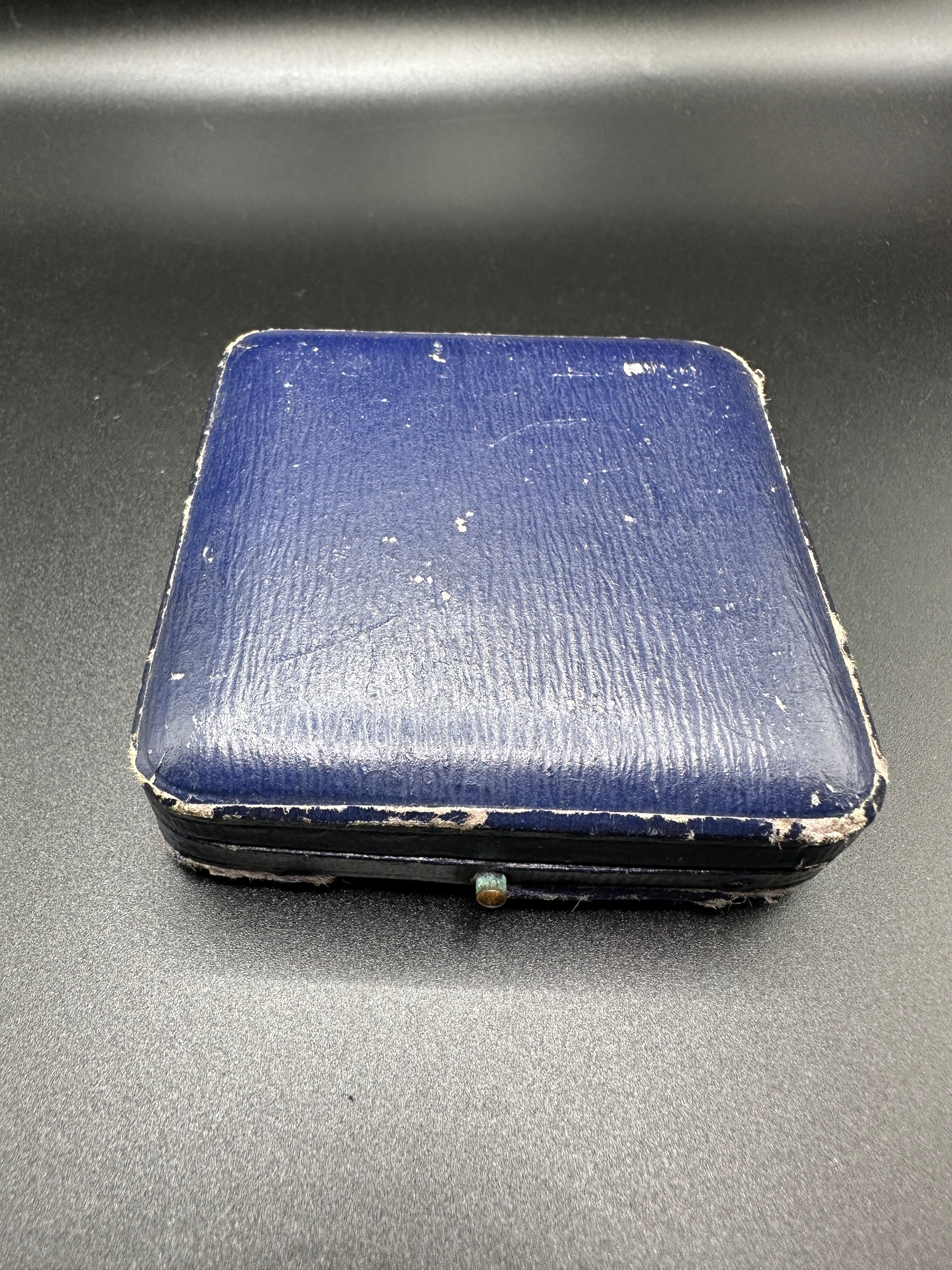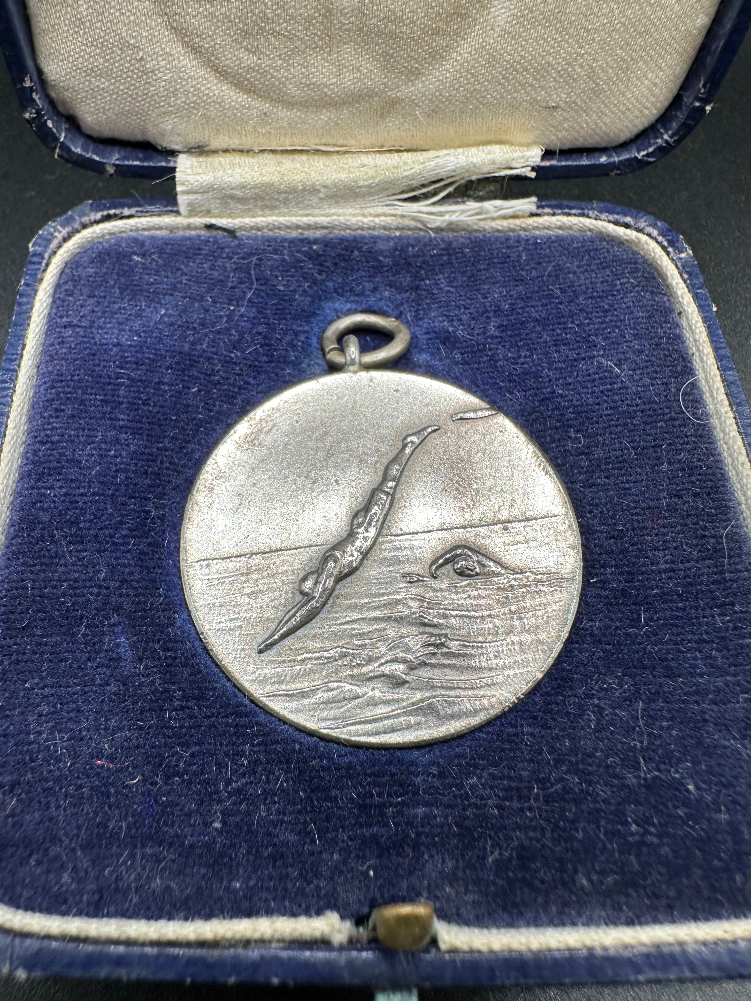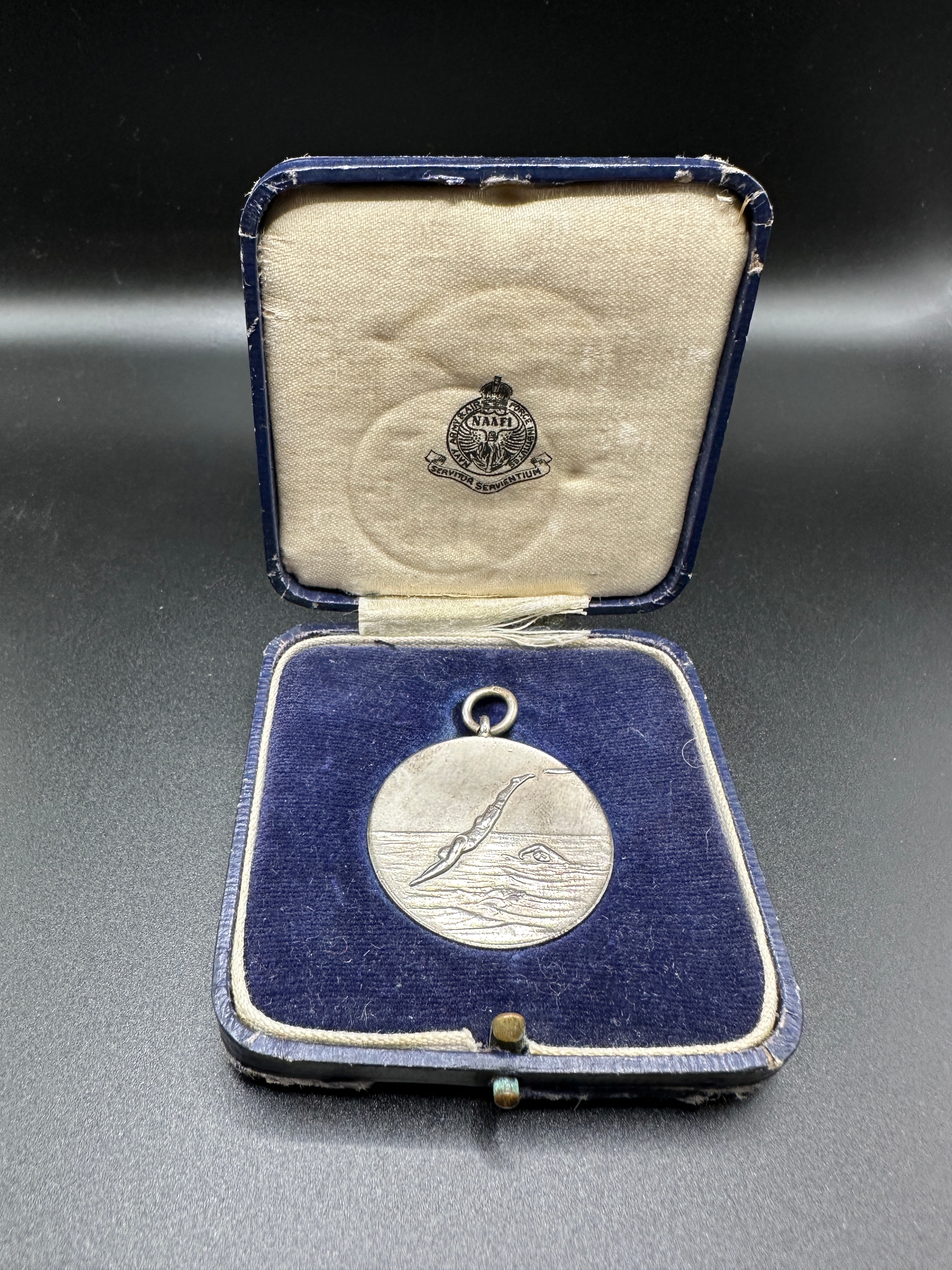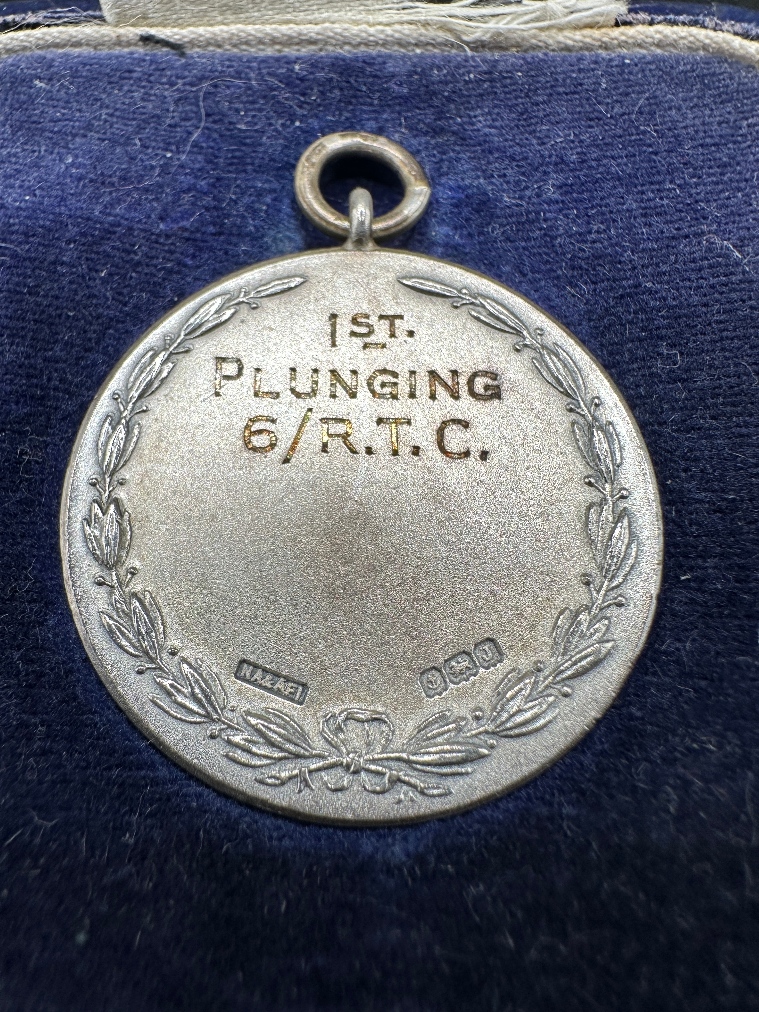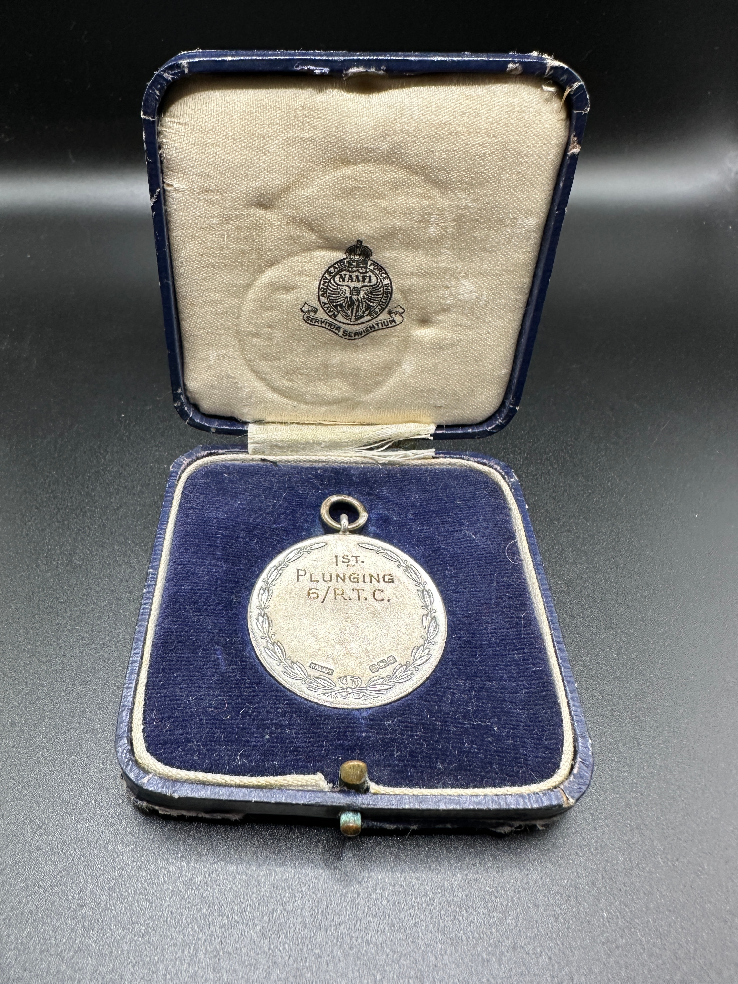 A vintage sterling silver medal presented within its original rectangular, blue-covered hinged box lined with dark blue velvet. The medal’s obverse features a raised design depicting a swimmer in a diving posture entering water with ripples. The reverse is engraved “1ST. PLUNGING 6/R.T.C.” encircled by a laurel wreath. Below the wreath, clear hallmarks are visible, including “NAAFI,” a lion passant confirming sterling silver, an anchor indicating the Birmingham assay office, and a date letter ‘g’, corresponding to the year 1931-32. The inside lid of the presentation box prominently displays the “NAAFI” logo with a crown and the inscription “SERVING THE SERVICES SINCE 1921.”