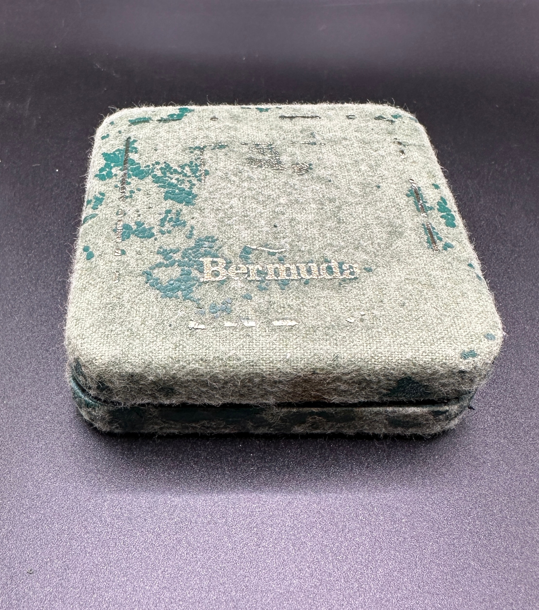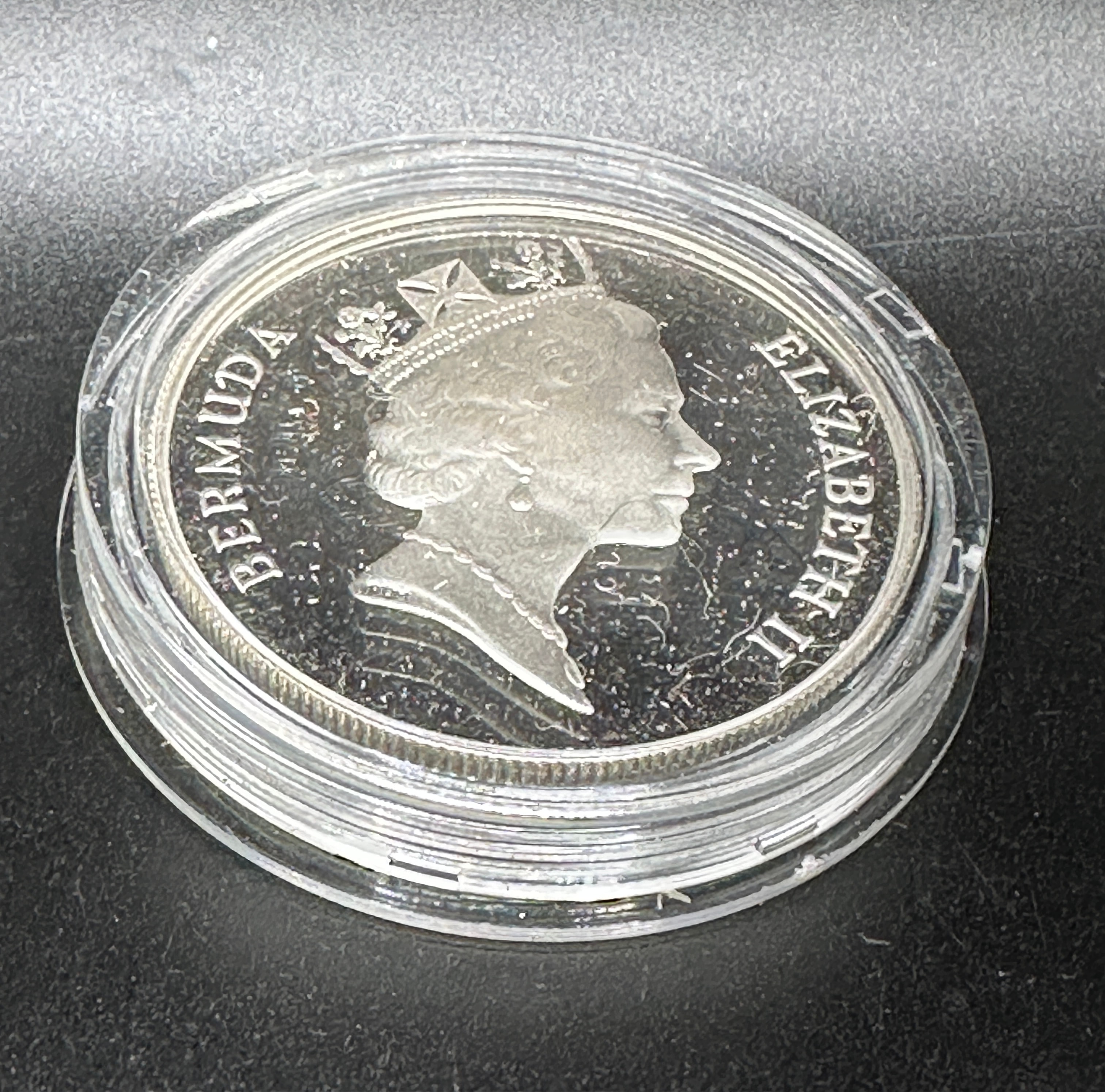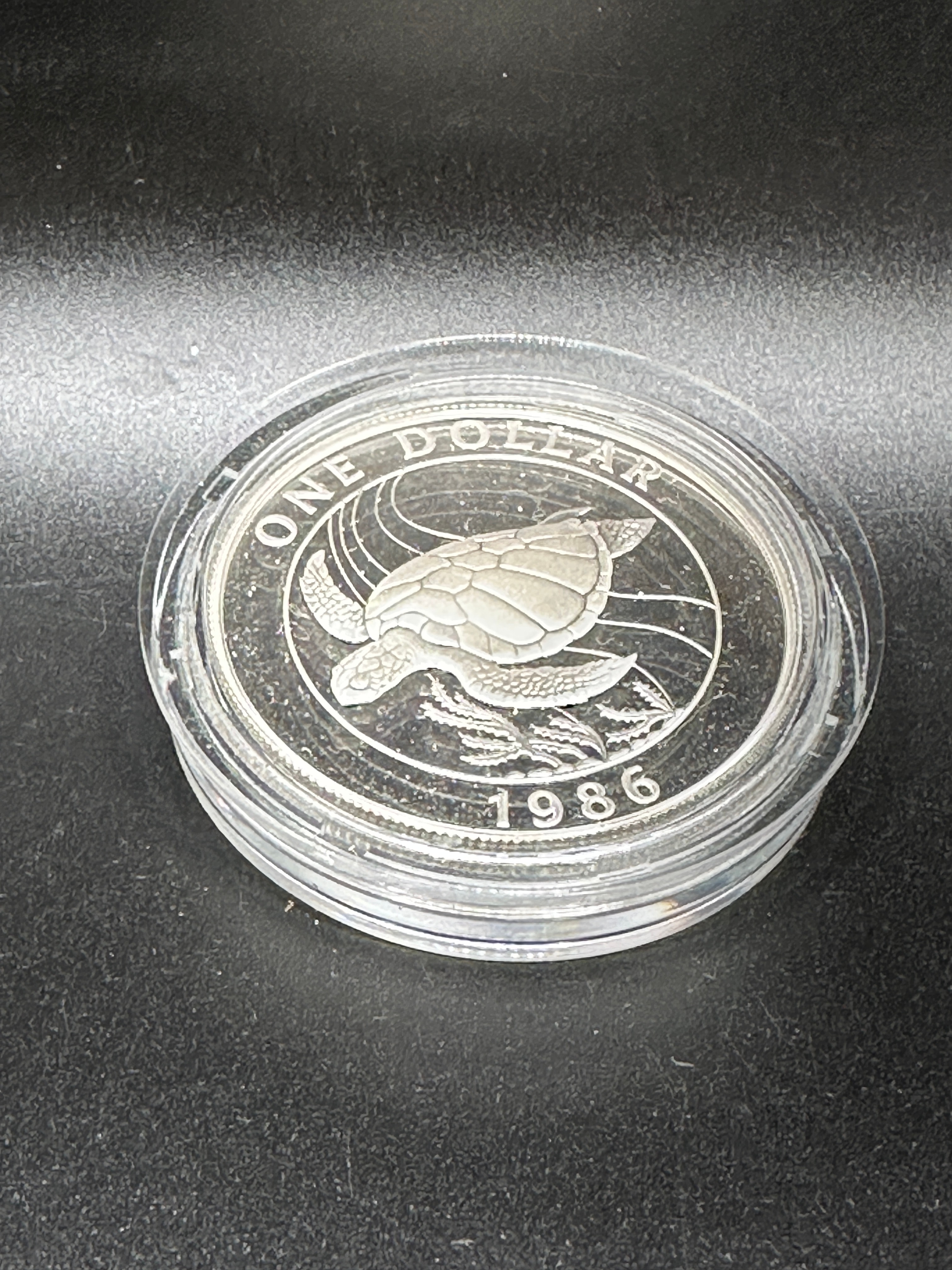 A 1986 Bermuda WWF Sterling Silver One Dollar Proof Coin, featuring a sea turtle design on the obverse and a crowned profile bust of Elizabeth II on the reverse. The coin is encapsulated in a clear plastic holder and is accompanied by its original fabric-covered presentation box. The obverse is inscribed ‘ONE DOLLAR’ and ‘1986’, while the reverse displays ‘ELIZABETH II’ and ‘BERMUDA’ along the rim. The coin commemorates the 25th Anniversary of the World Wildlife Fund.