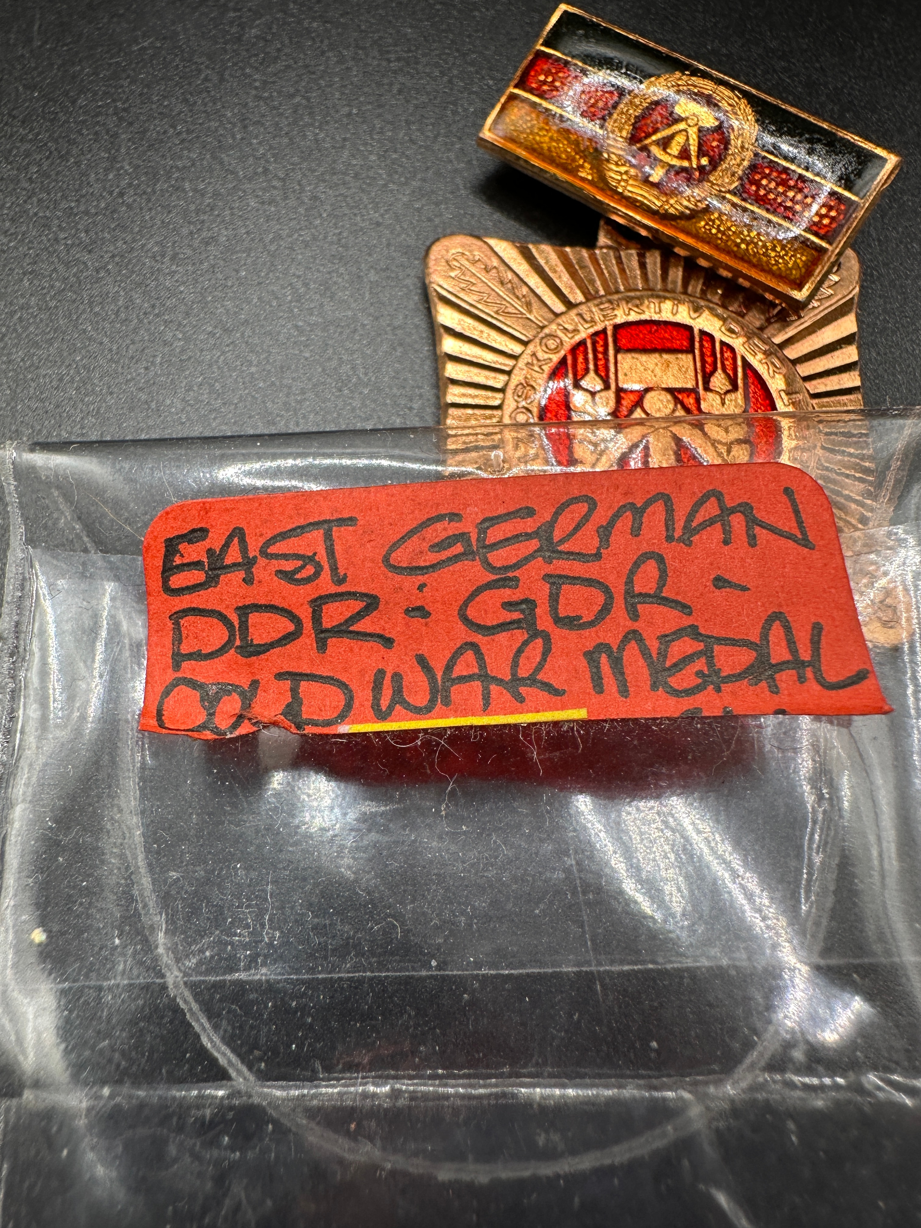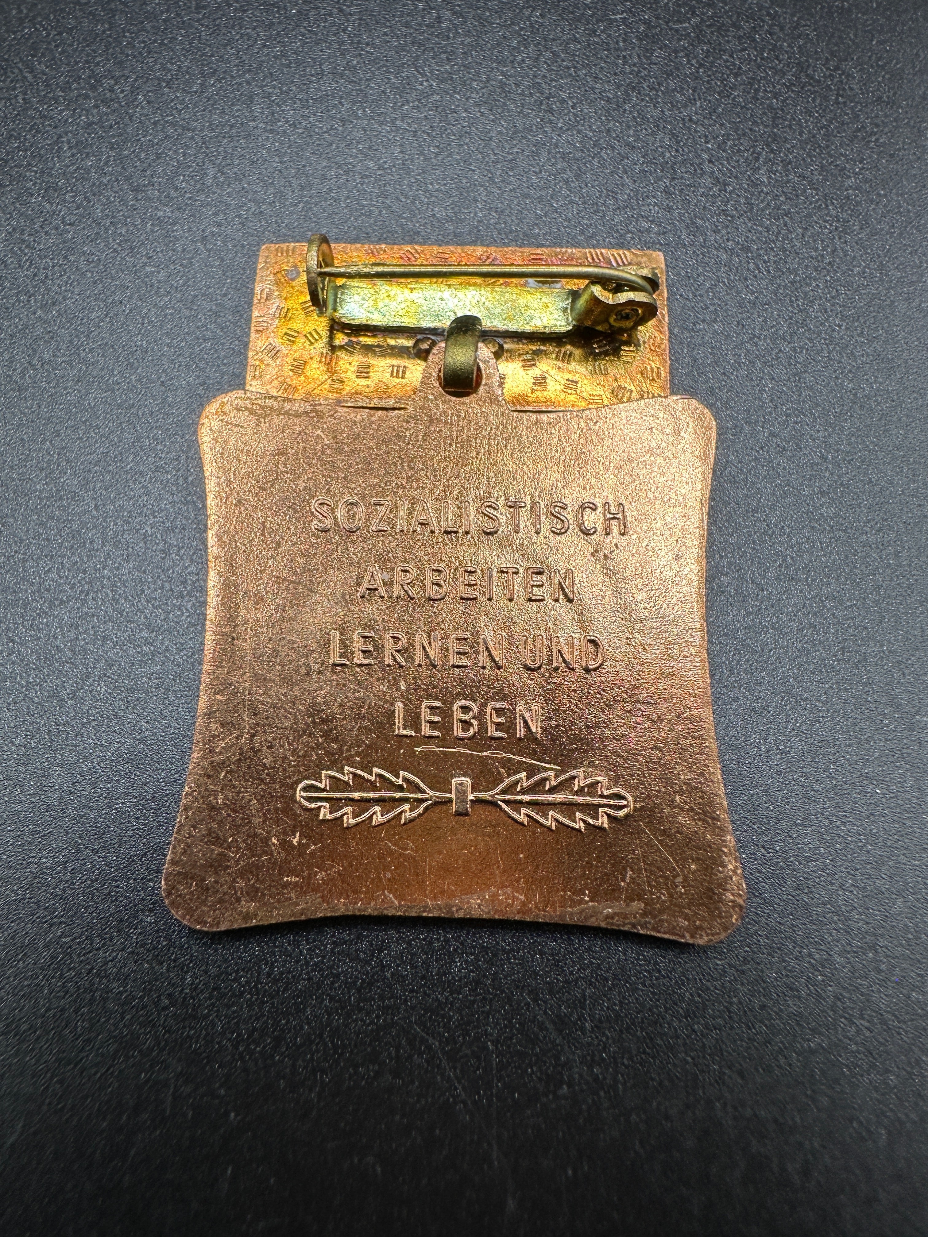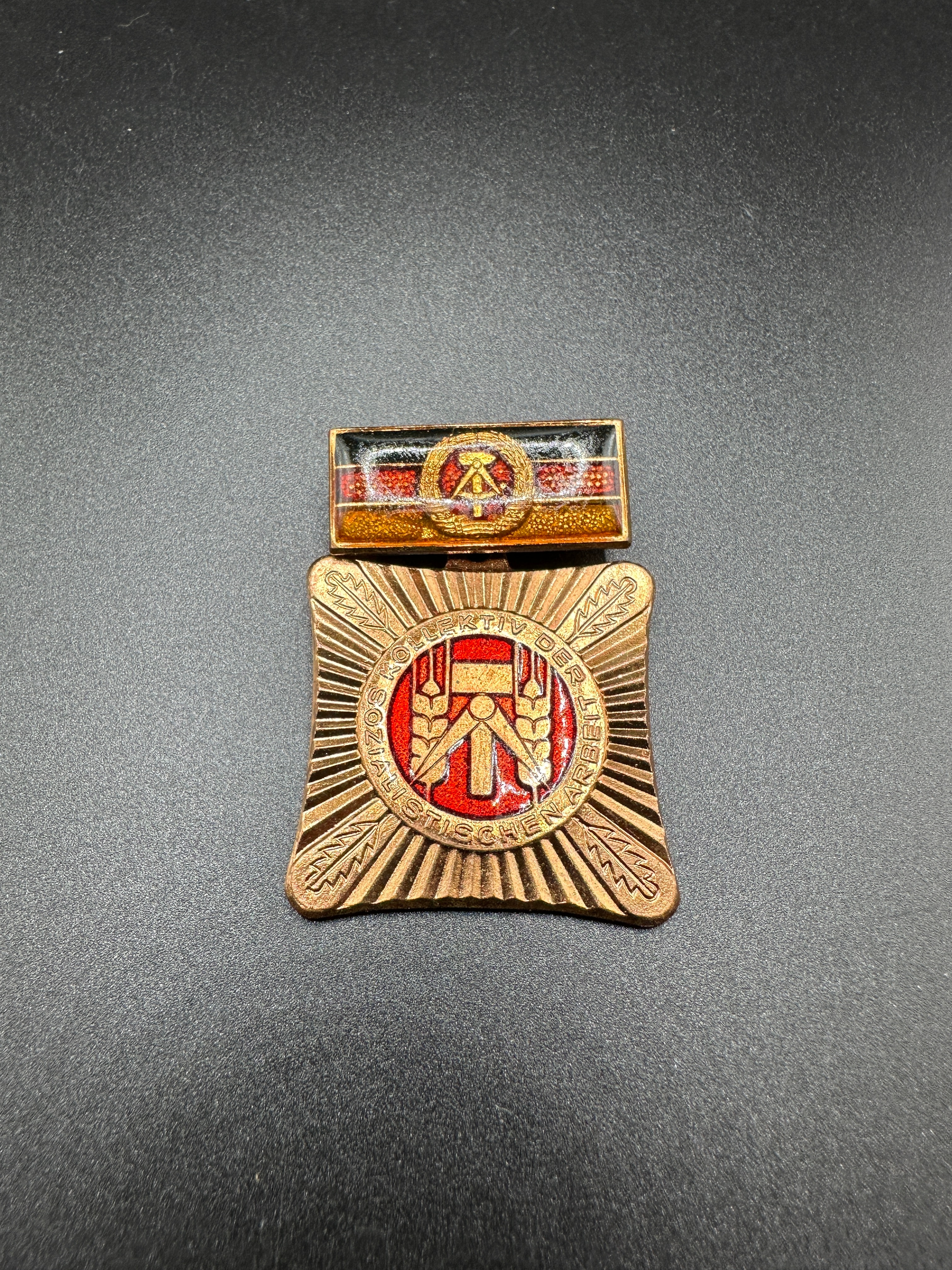 A pair of East German (DDR) ‘Kollektiv der Sozialistischen Arbeit’ awards, dating from the Cold War period. The primary item is a square-shaped award crafted from a base metal, likely bronze or copper-plated, with enamel detailing. It features a central red enamel disc displaying the German Democratic Republic’s emblem (hammer, compass, and rye wreath), encircled by the German text “KOLLEKTIV DER SOZIALISTISCHEN ARBEIT” (Collective of Socialist Labor) and radiating lines. The reverse is embossed with the motto “SOZIALISTISCH ARBEITEN LERNEN UND LEBEN” (Socialist Work, Learn, and Live) and is fitted with a standard pin-back attachment. The secondary item is a rectangular ribbon bar or miniature award, which depicts the East German emblem set against a black, red, and gold striped background, encased in clear enamel or resin, also with a pin-back.