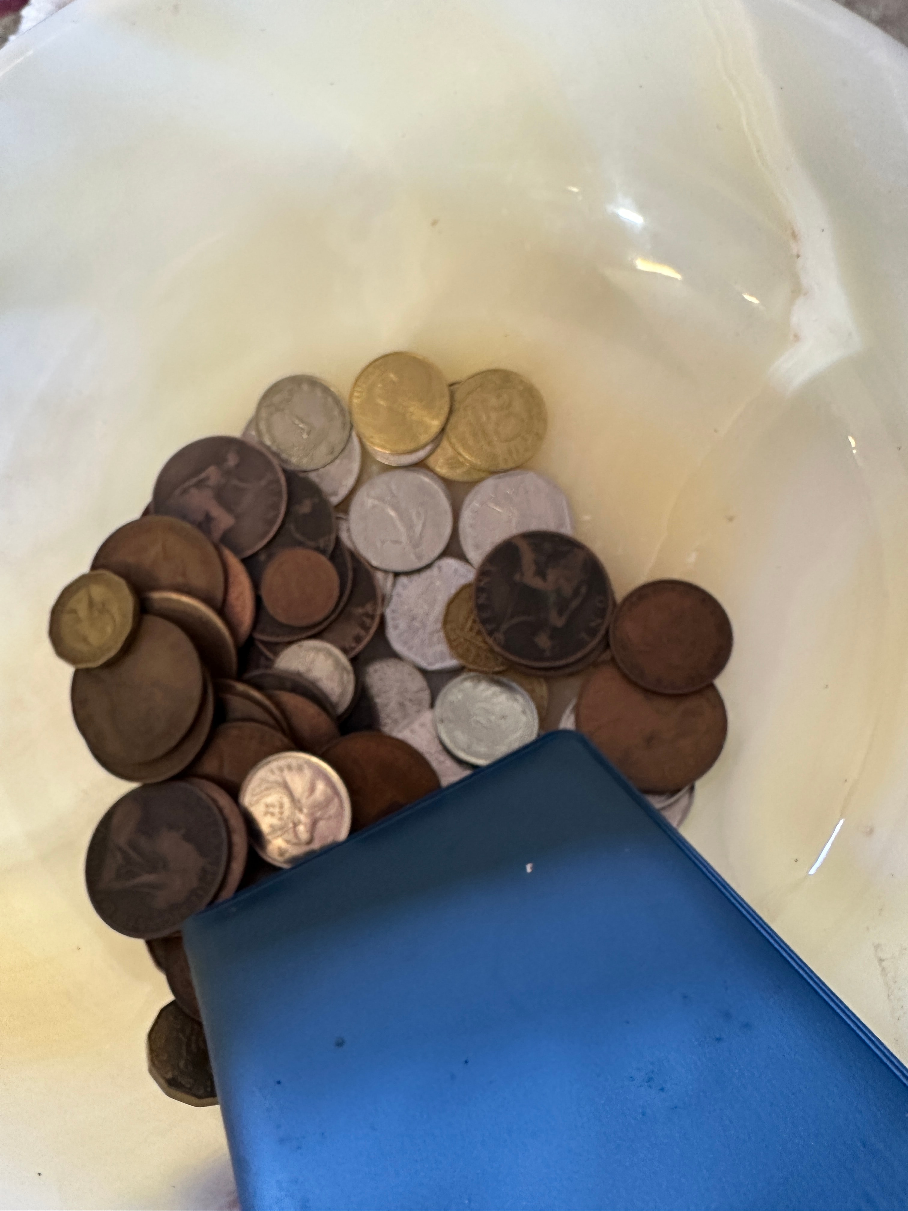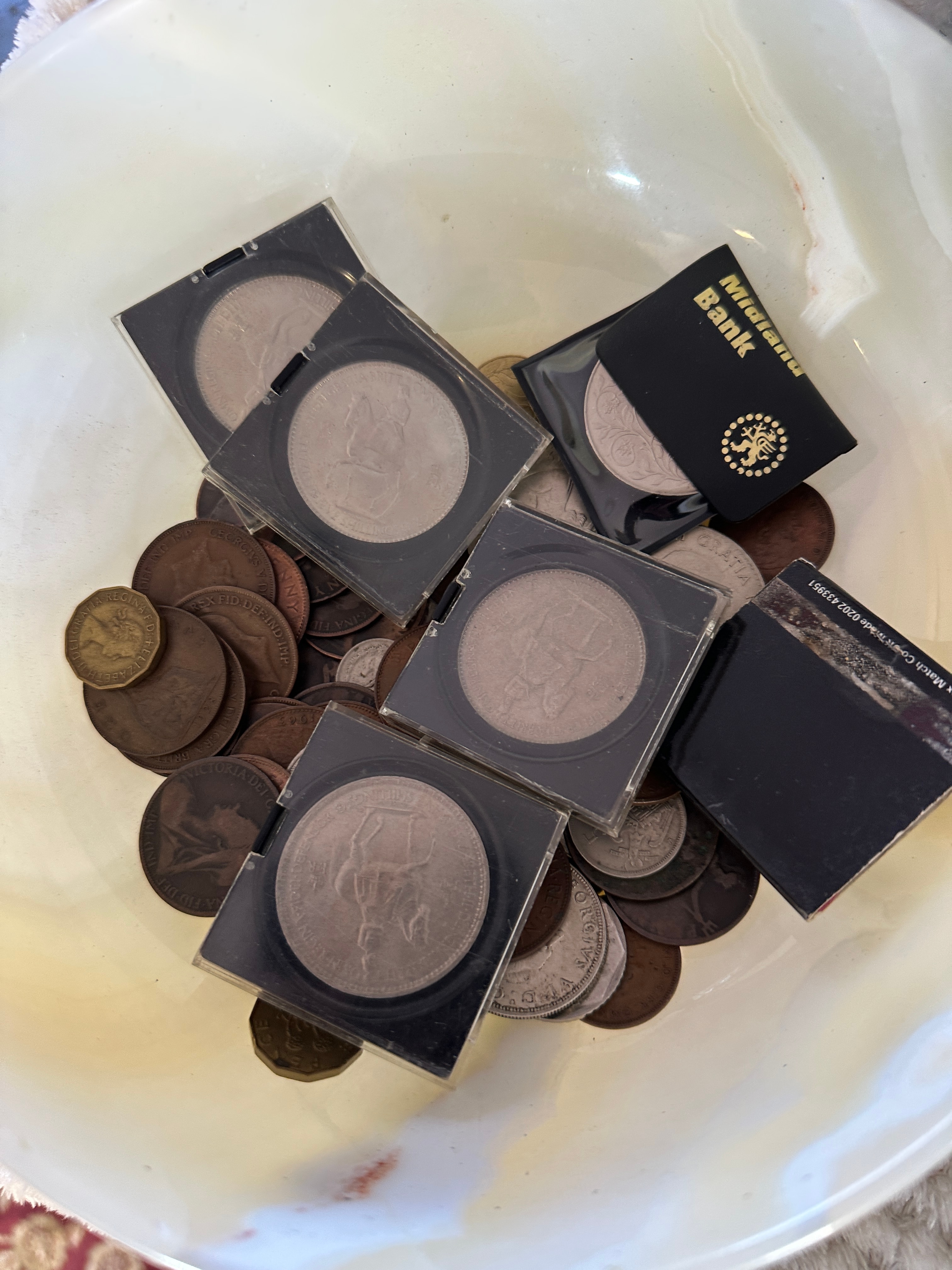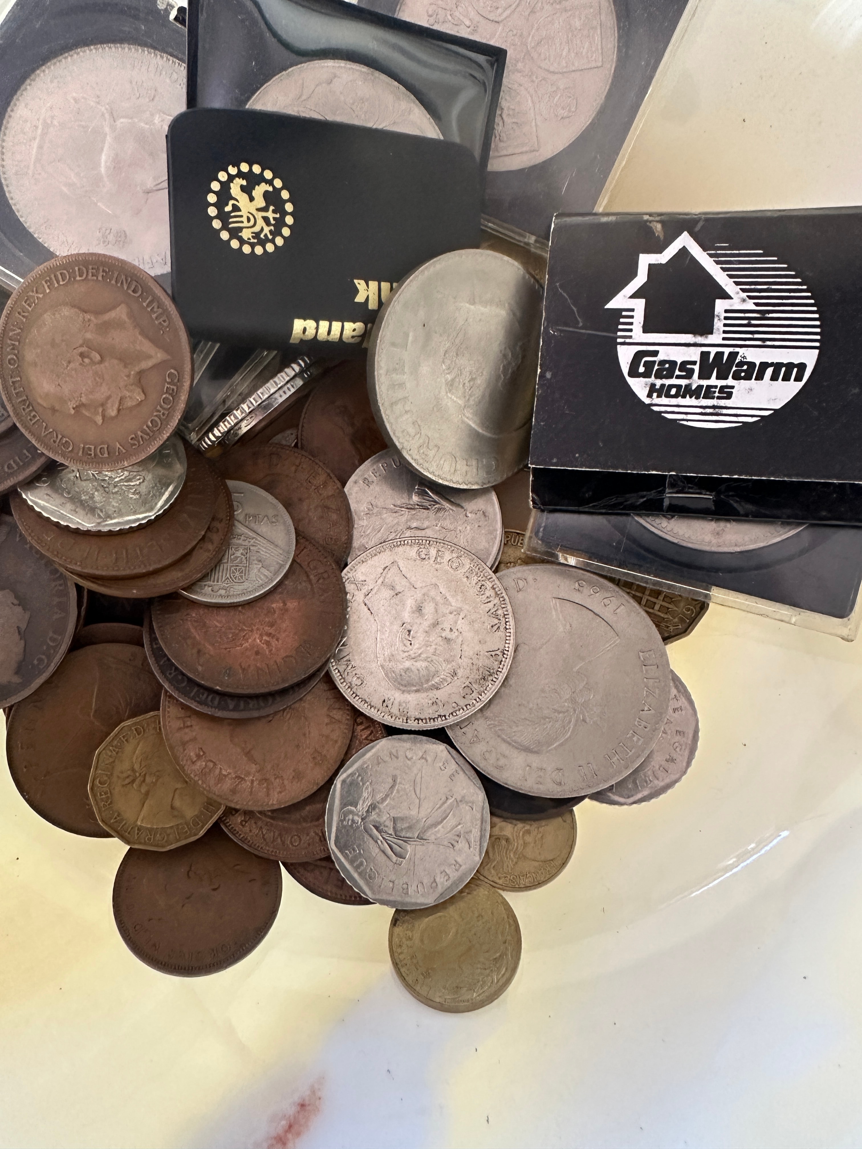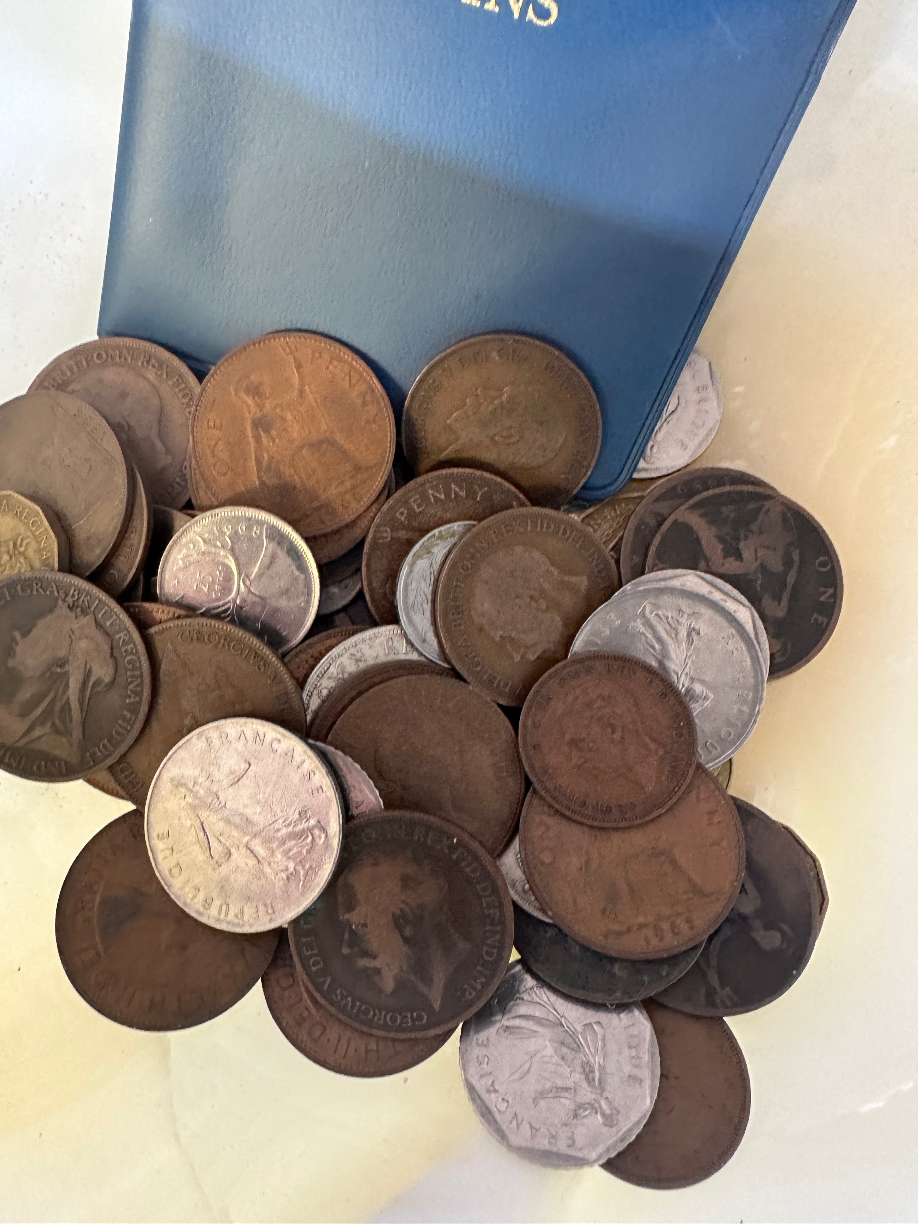 A mixed collection of primarily British and French coinage, composed of various copper-alloy and base metal denominations. The British coins feature portraits of monarchs including George V, George VI, and Elizabeth II, bearing Latin inscriptions such as “DEI GRA REX ET IND IMP” and “ELIZABETH II D G REG F D”. Visible denominations include ‘ONE PENNY’, with one coin dated 1945. The French coins display “REPUBLIQUE FRANCAISE” with denominations in ‘FRANCS’ and ‘CENTIMES’. Some coins are housed in clear plastic capsules, while others are loose. Accompanying the coins is a blue album or binder and several black cardboard holders, one branded “Midland Bank” and another “Gas Warm Homes”.