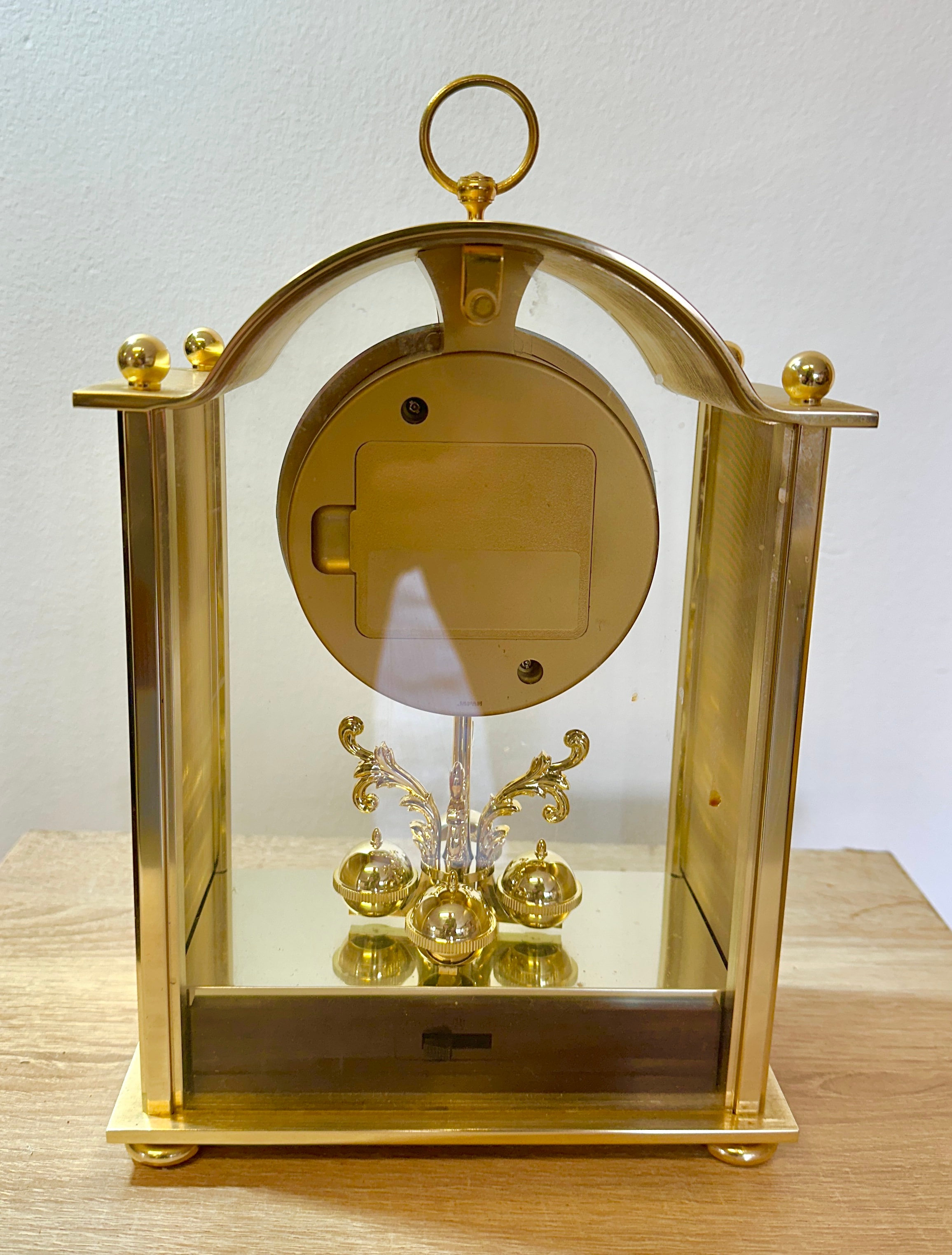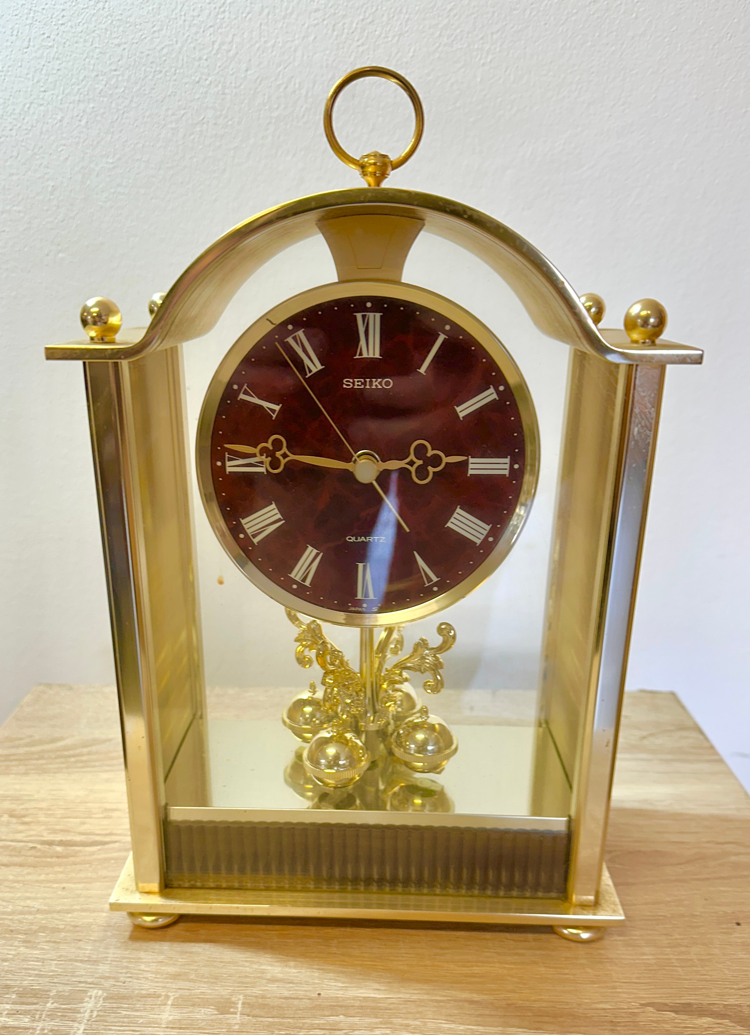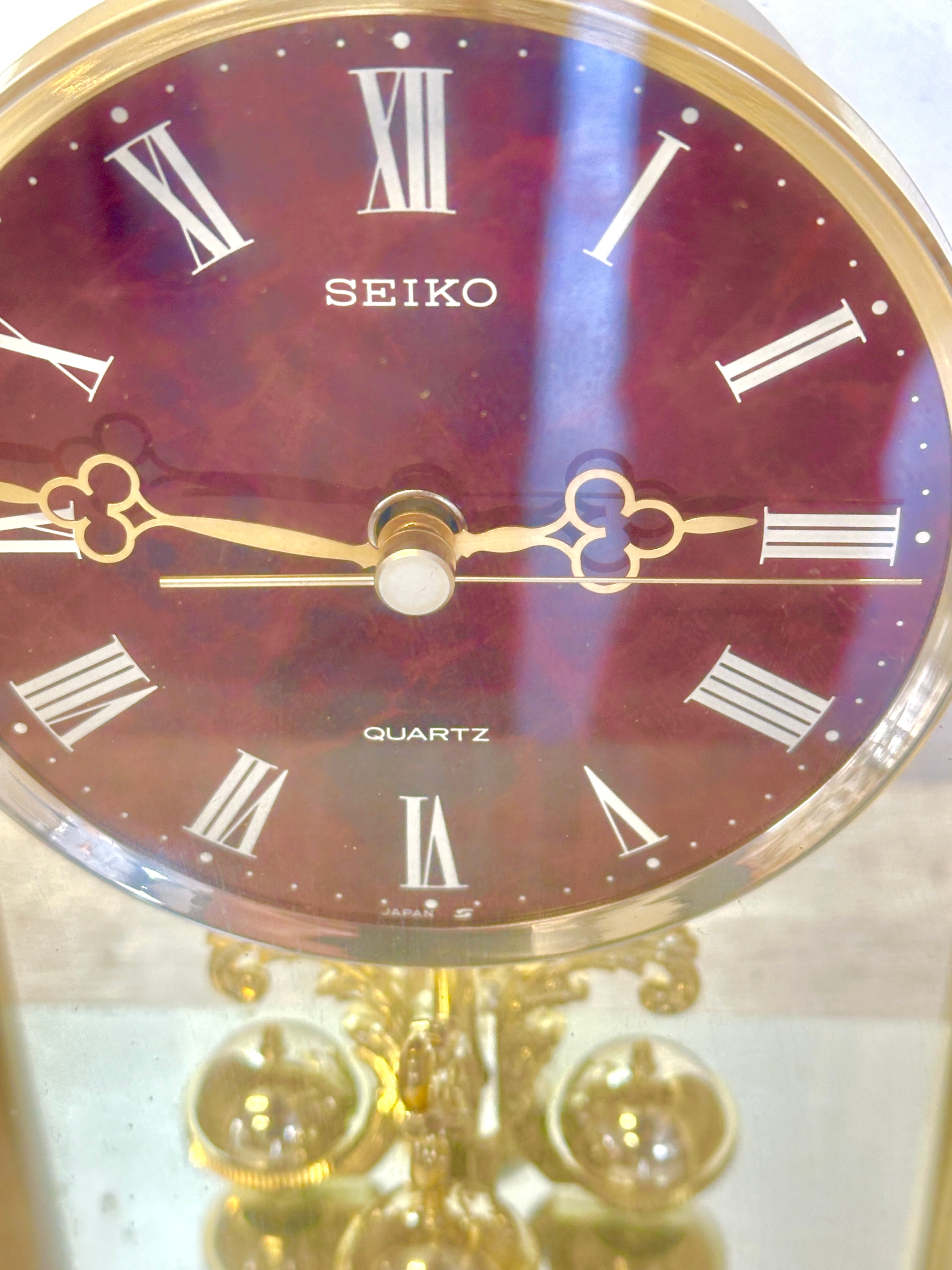 A Seiko Quartz Mantel/Carriage Clock, featuring a gold-tone metal frame with an arched top and clear glass side panels. The circular dial is a deep burgundy color with white Roman numerals and gold-tone hour and minute hands. The dial is marked “SEIKO” at the top, “QUARTZ” below the center, and “JAPAN” subtly printed at the bottom. A prominent gold-tone ornate rotating pendulum mechanism with four spheres is visible within the lower section. The top is adorned with a gold-tone ring finial, and the reverse shows a solid gold-tone cover for the quartz movement, including an access panel.