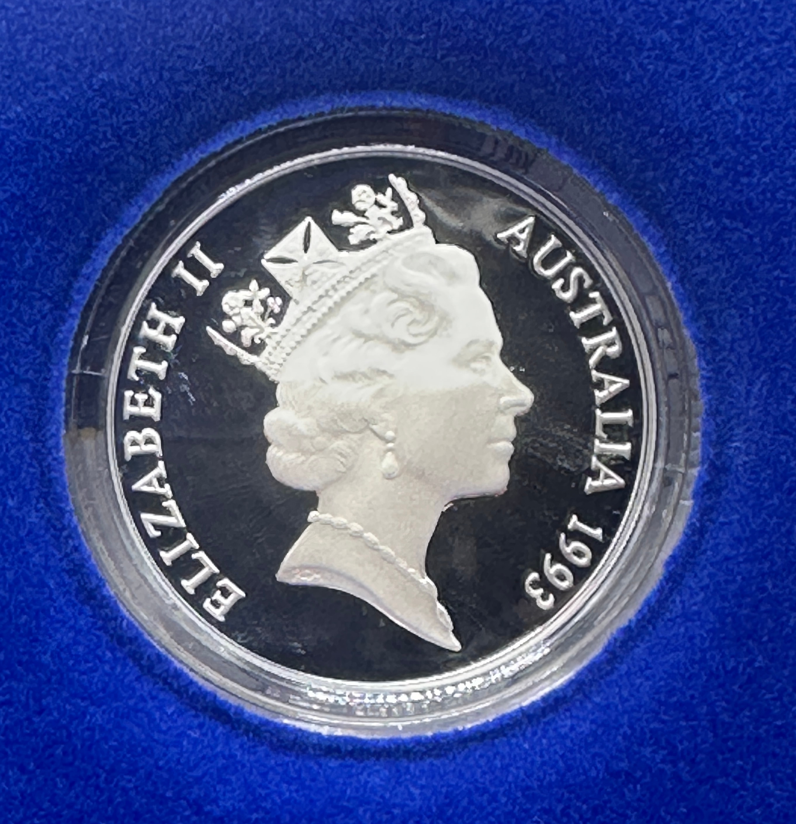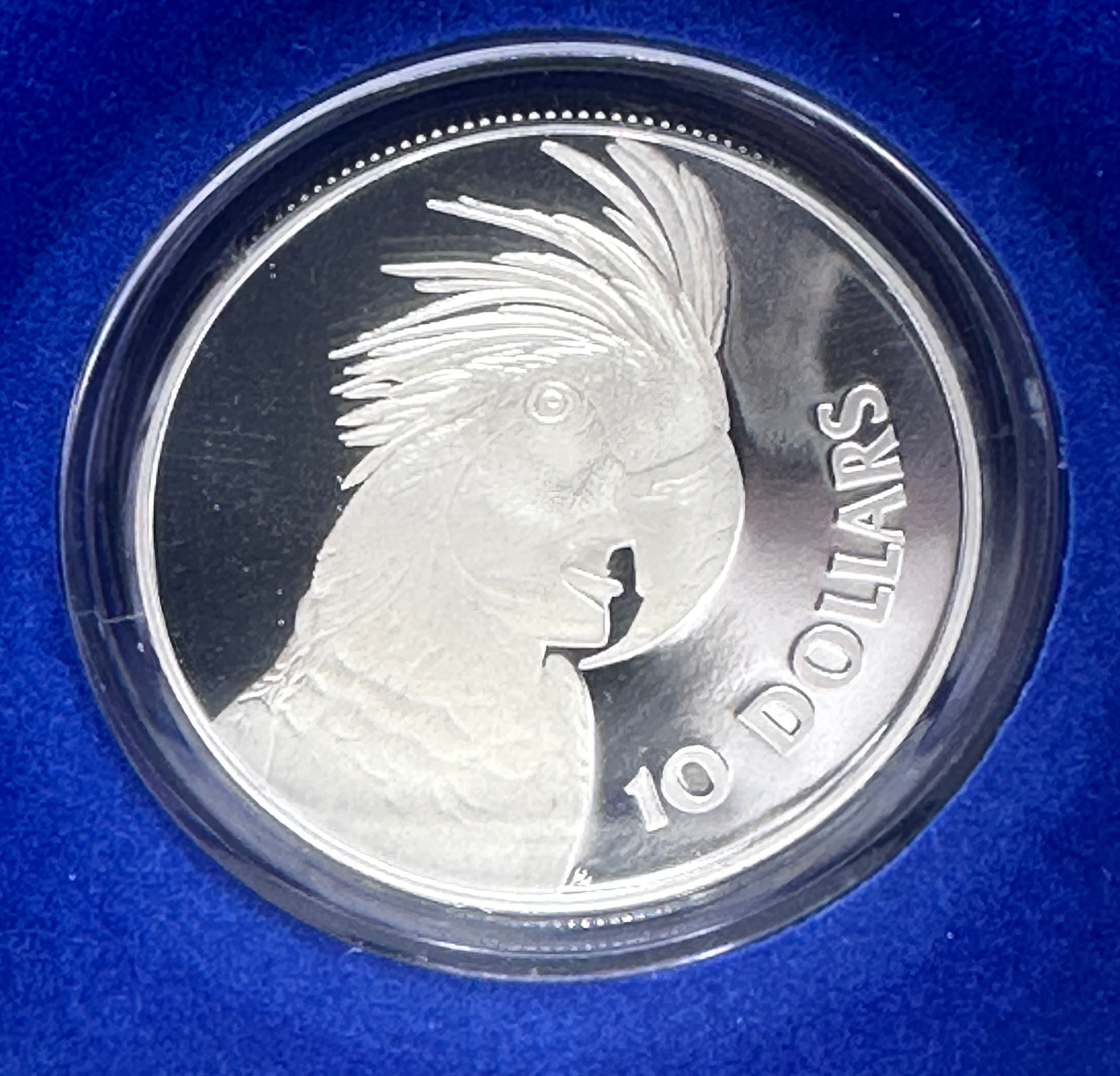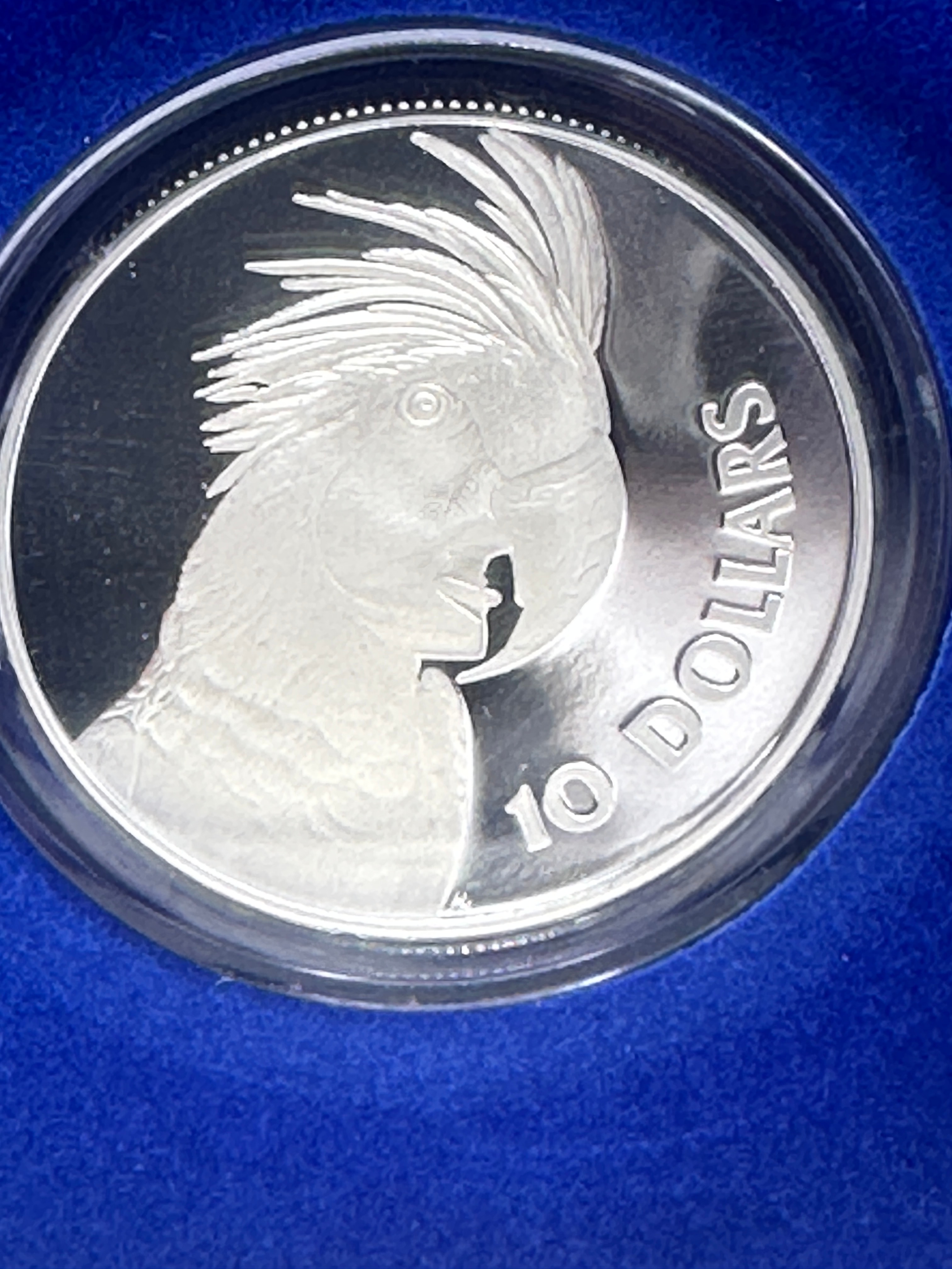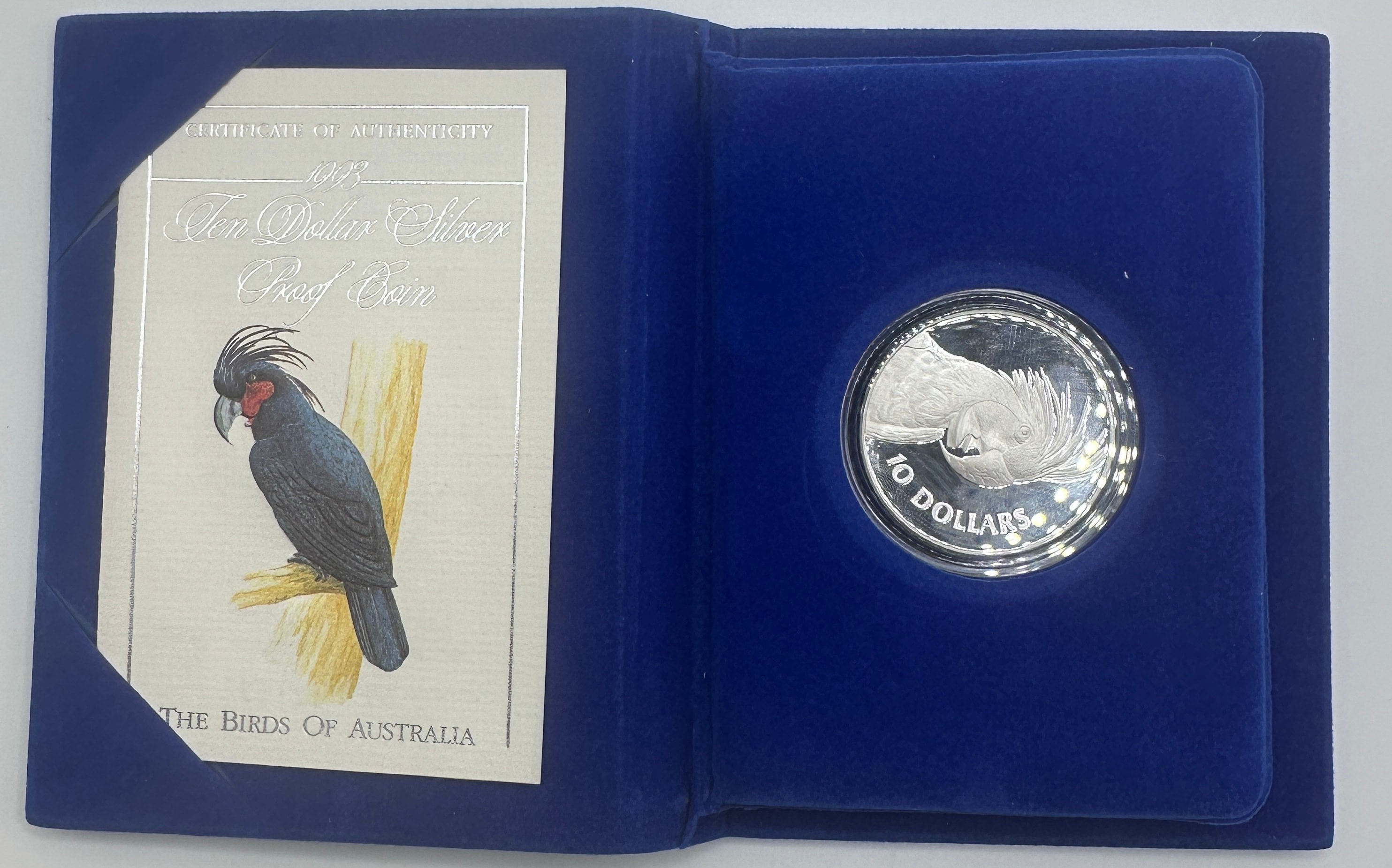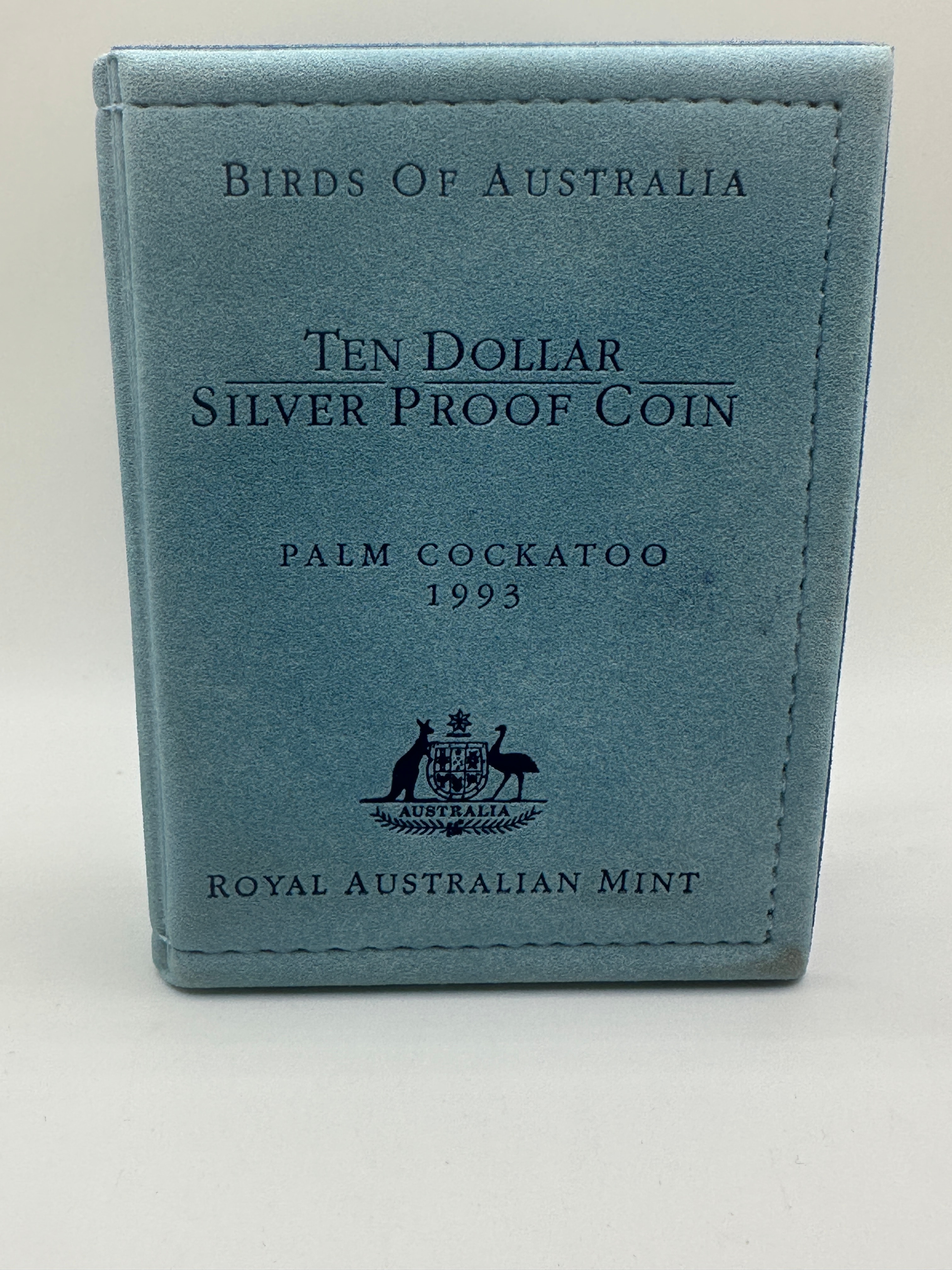 This item is a 1993 Royal Australian Mint $10 Silver Proof Coin from the “Birds of Australia” series, featuring the Palm Cockatoo. The coin is housed within a clear protective capsule, which is set into a royal blue velvet-lined hinged presentation case. The presentation case also contains a Certificate of Authenticity. The coin’s obverse displays a stylized image of a cockatoo alongside the denomination “10 DOLLARS.” The reverse features a portrait of Queen Elizabeth II with the inscriptions “ELIZABETH II AUSTRALIA 1993.” The entire set is encased in a light blue hard-shell outer case, which is inscribed with “BIRDS OF AUSTRALIA,” “TEN DOLLAR SILVER PROOF COIN,” “PALM COCKATOO,” “1993,” and identifies the “ROYAL AUSTRALIAN MINT” along with the Australian coat of arms.