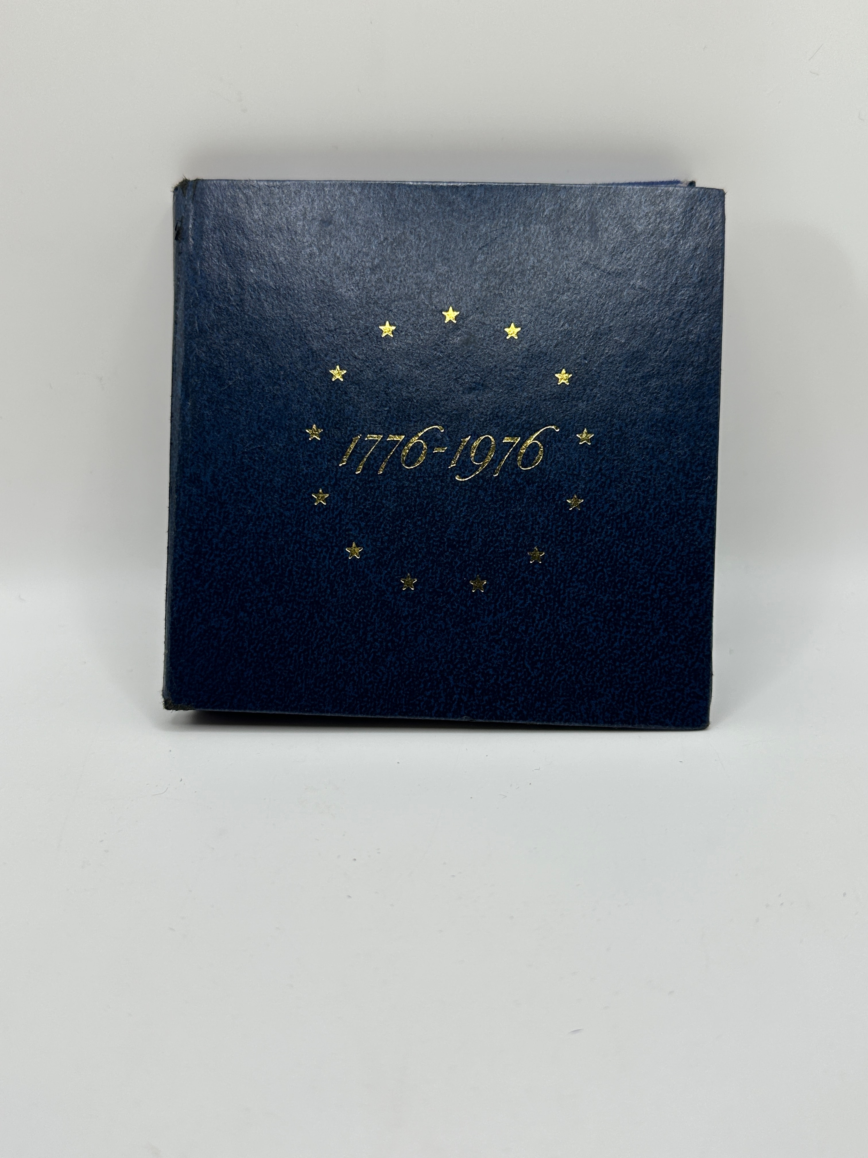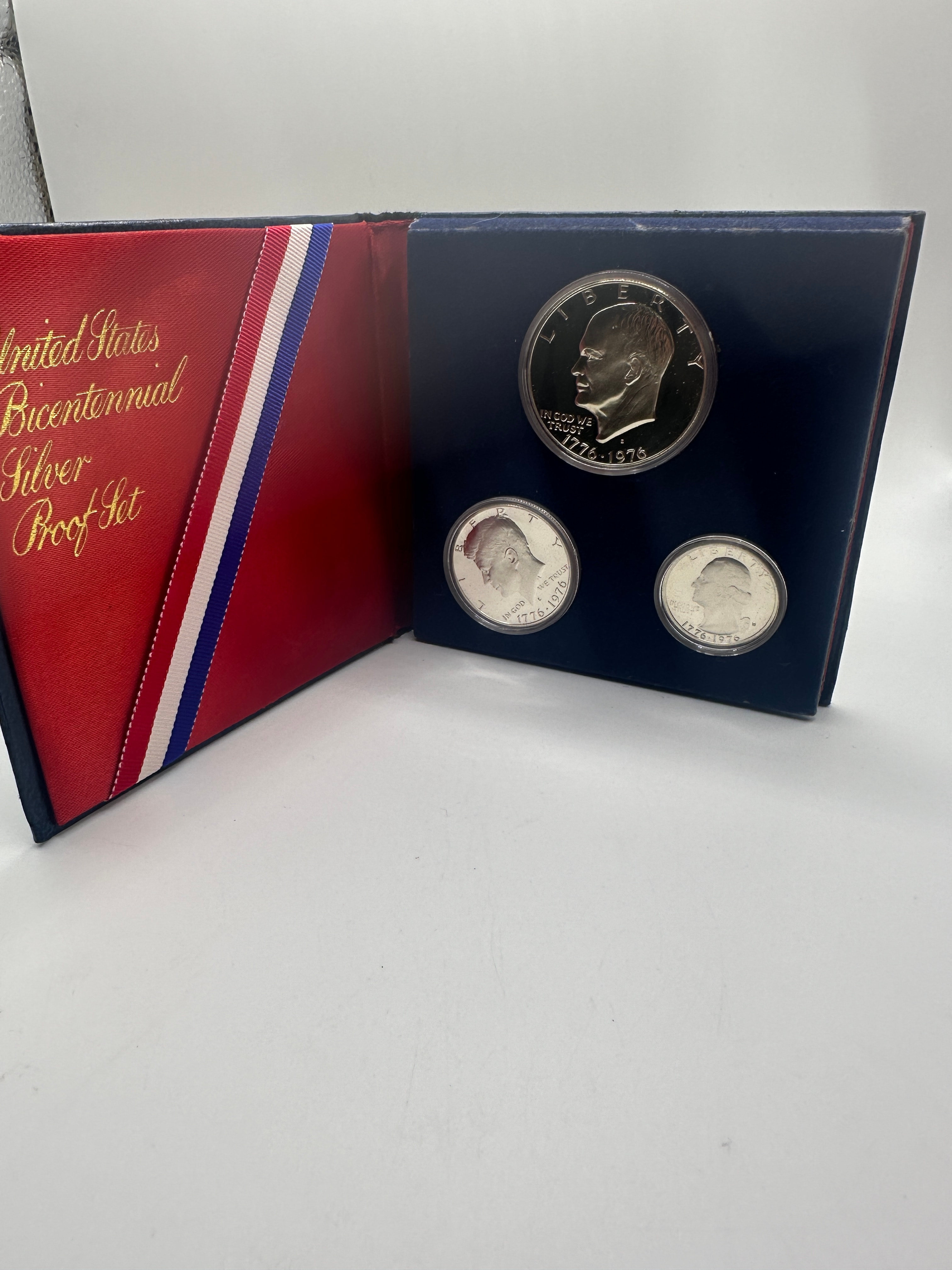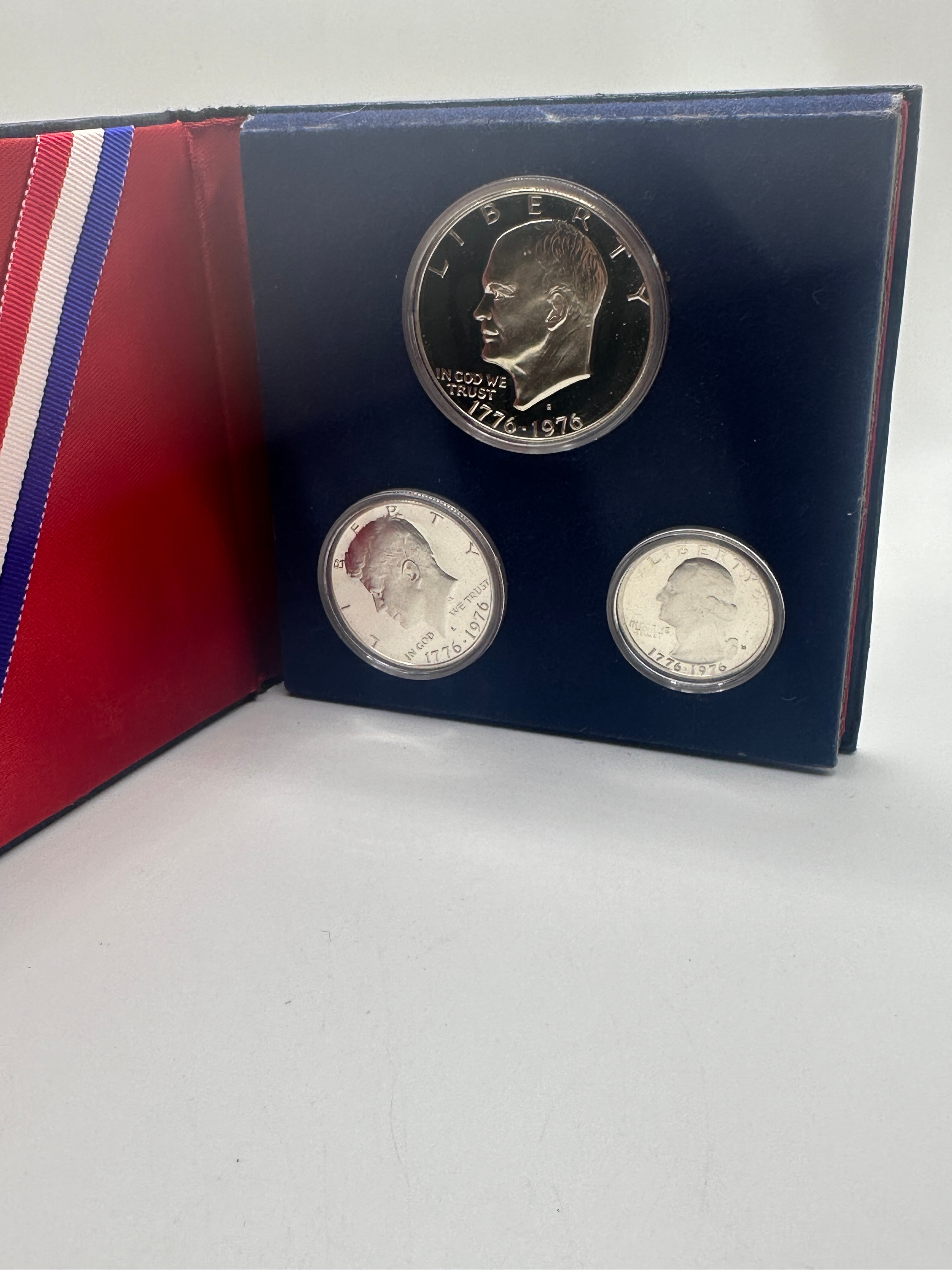 A 1976-S United States Bicentennial Silver Three-Coin Proof Set, presented in its Original Government Packaging (OGP). The set comprises one dollar, one half-dollar, and one quarter-dollar coin, each dated “1776-1976.” The coins exhibit a highly reflective, mirror-like proof finish. The set is housed within a dark blue, book-style presentation case. The exterior of the case is embellished with “1776-1976” and stars in gold. The interior left flap is red, featuring a red, white, and blue ribbon design and the inscription “United States Bicentennial Silver Proof Set.” The obverses of the coins feature presidential portraits, “LIBERTY,” and “IN GOD WE TRUST.” The reverses display “UNITED STATES OF AMERICA,” their respective denominations (“ONE DOLLAR,” “HALF DOLLAR,” “QUARTER DOLLAR”), and distinct bicentennial imagery depicting the Liberty Bell over the Moon, Independence Hall, and a colonial drummer.