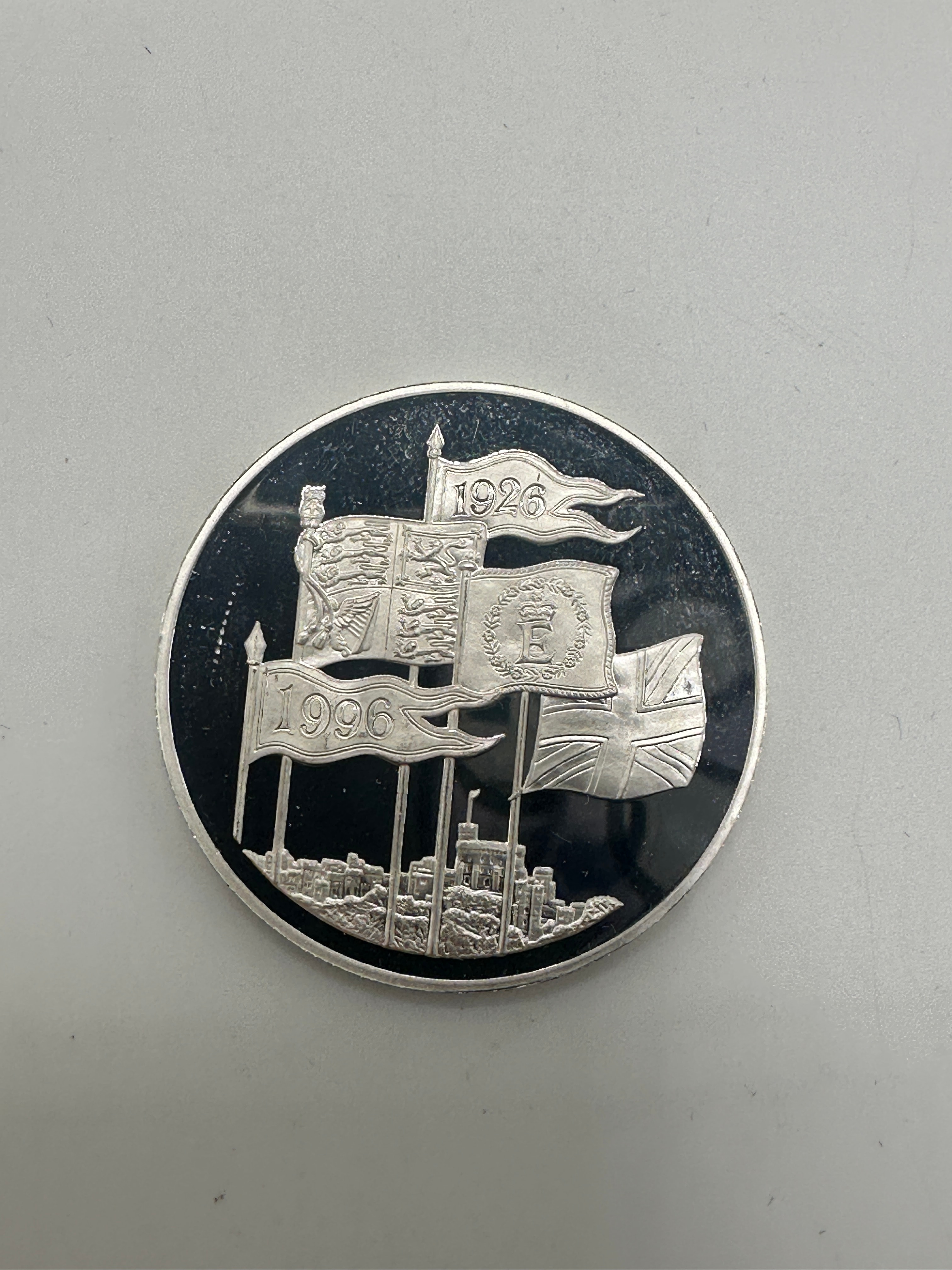 A 1996 Queen Elizabeth II 70th Birthday Silver Proof Five Pound Coin. This circular, silver-toned commemorative coin features on its obverse a right-facing crowned bust of Queen Elizabeth II, encircled by the inscription “ELIZABETH II DEI GRATIA REGINA F.D.” and the denomination “FIVE POUNDS”. The reverse depicts a cluster of flags, including one with a crowned ‘E’ and another resembling the Union Flag, flying above a stylized castle or building, with the dates “1926” and “1996” prominently displayed. The coin exhibits a high-contrast proof-like finish with frosted relief against a polished field.