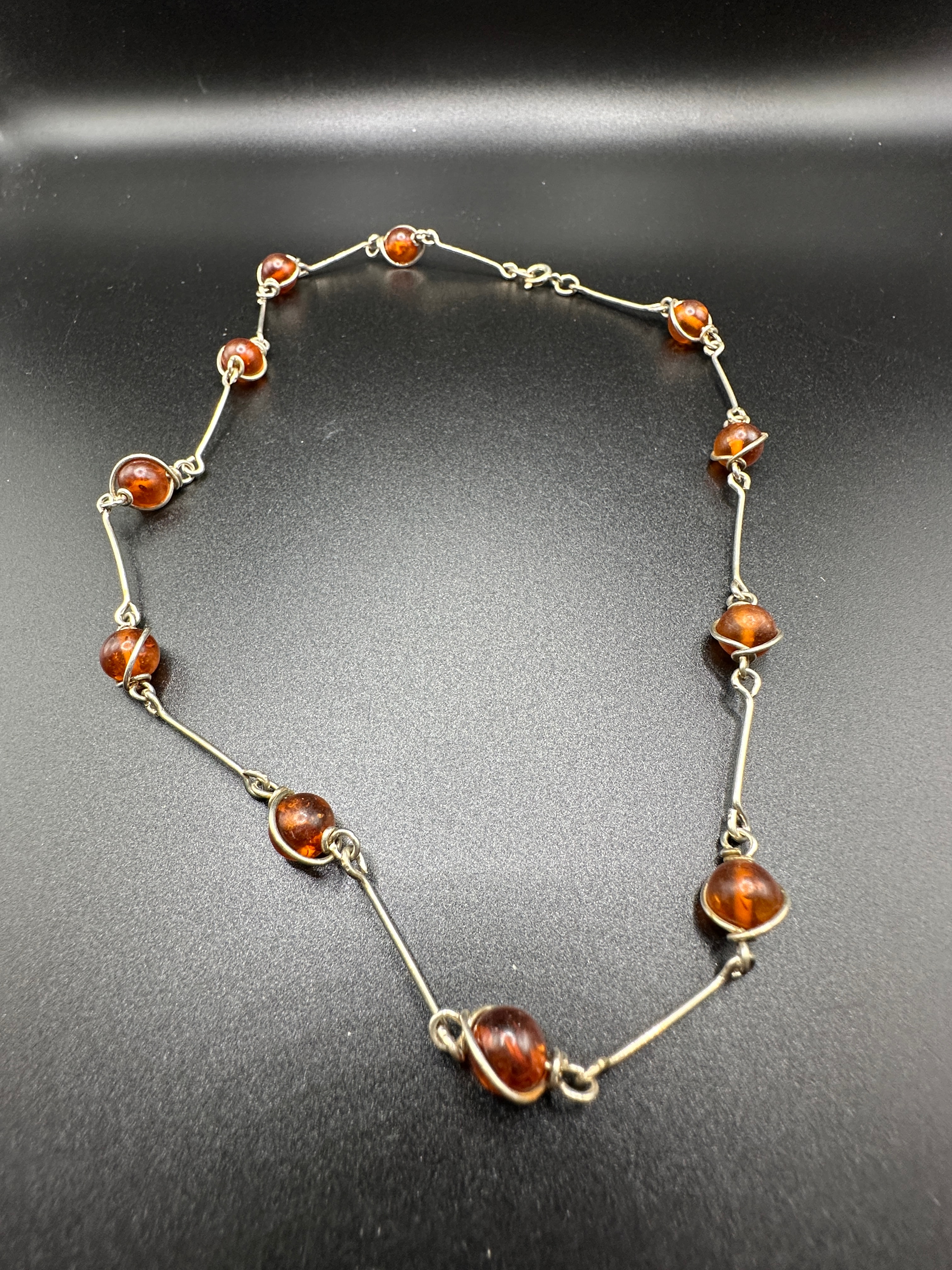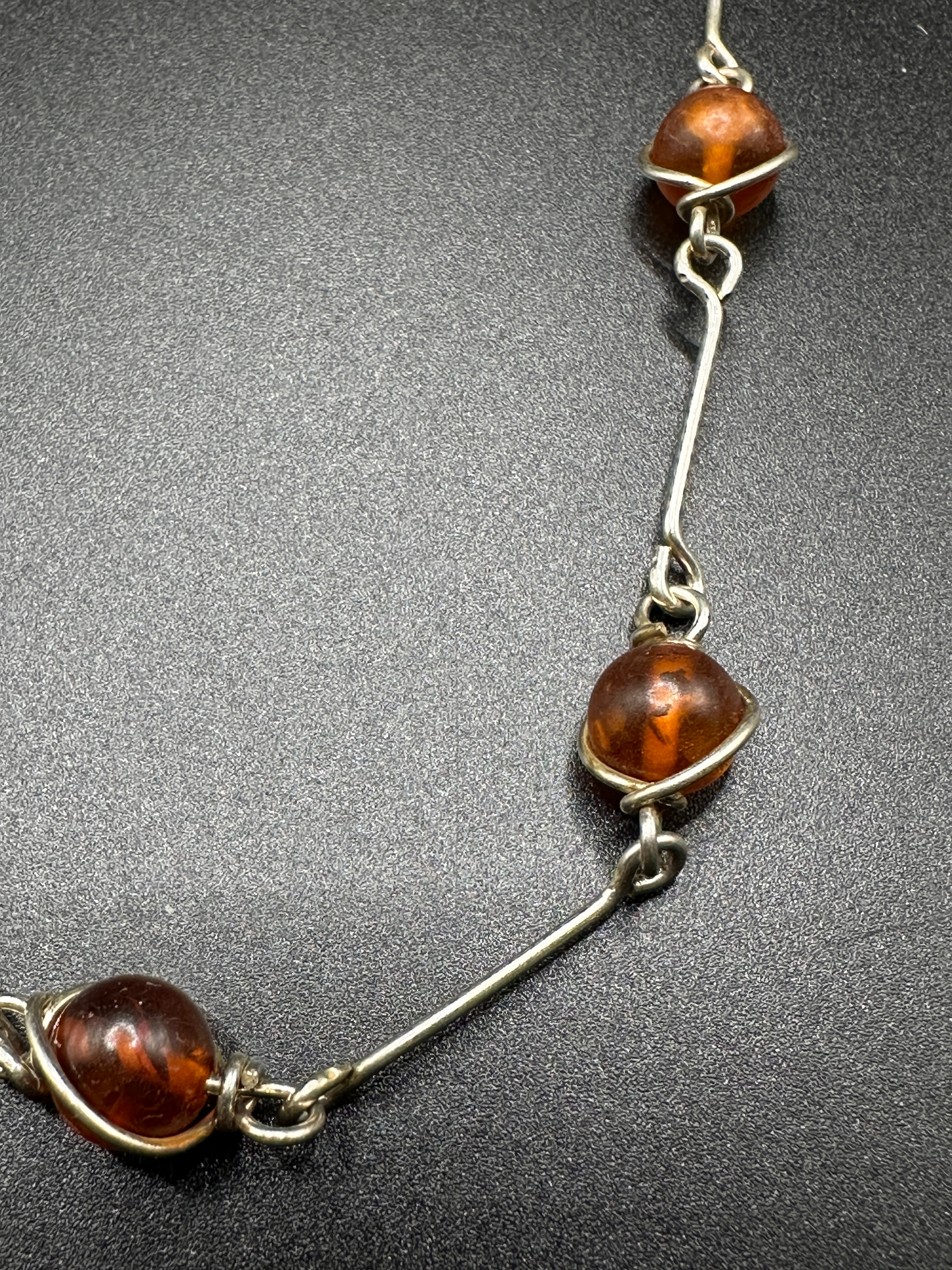 A vintage sterling silver and carnelian station necklace. This necklace features a station-style design comprising twelve round, translucent, domed cabochon-type carnelian elements, each individually wire-wrapped in sterling silver. These elements are interspersed and connected by short, polished sterling silver bar links and small oval rings, forming a continuous chain. No visible text, hallmarks, or manufacturer’s markings are apparent on the piece.