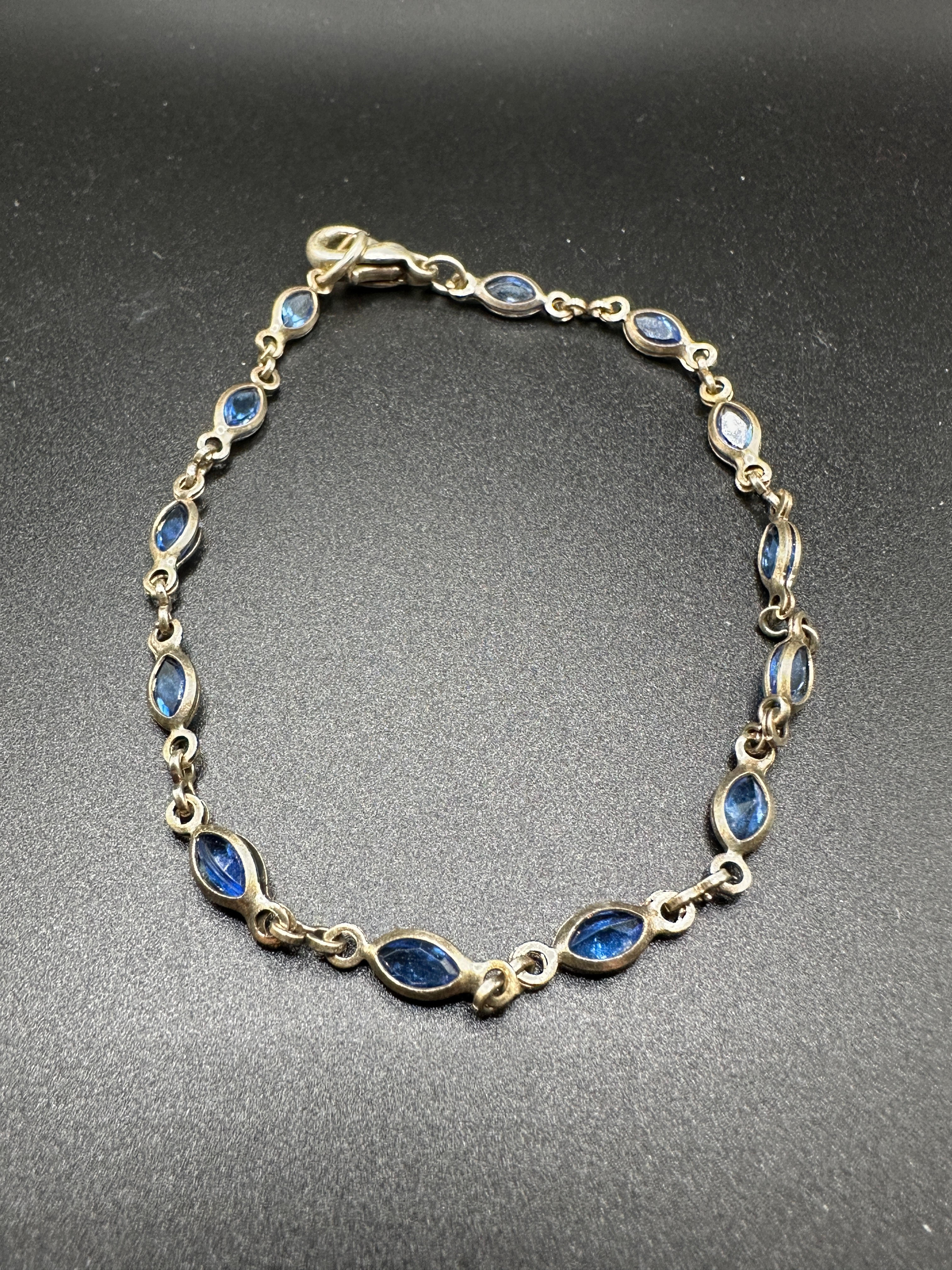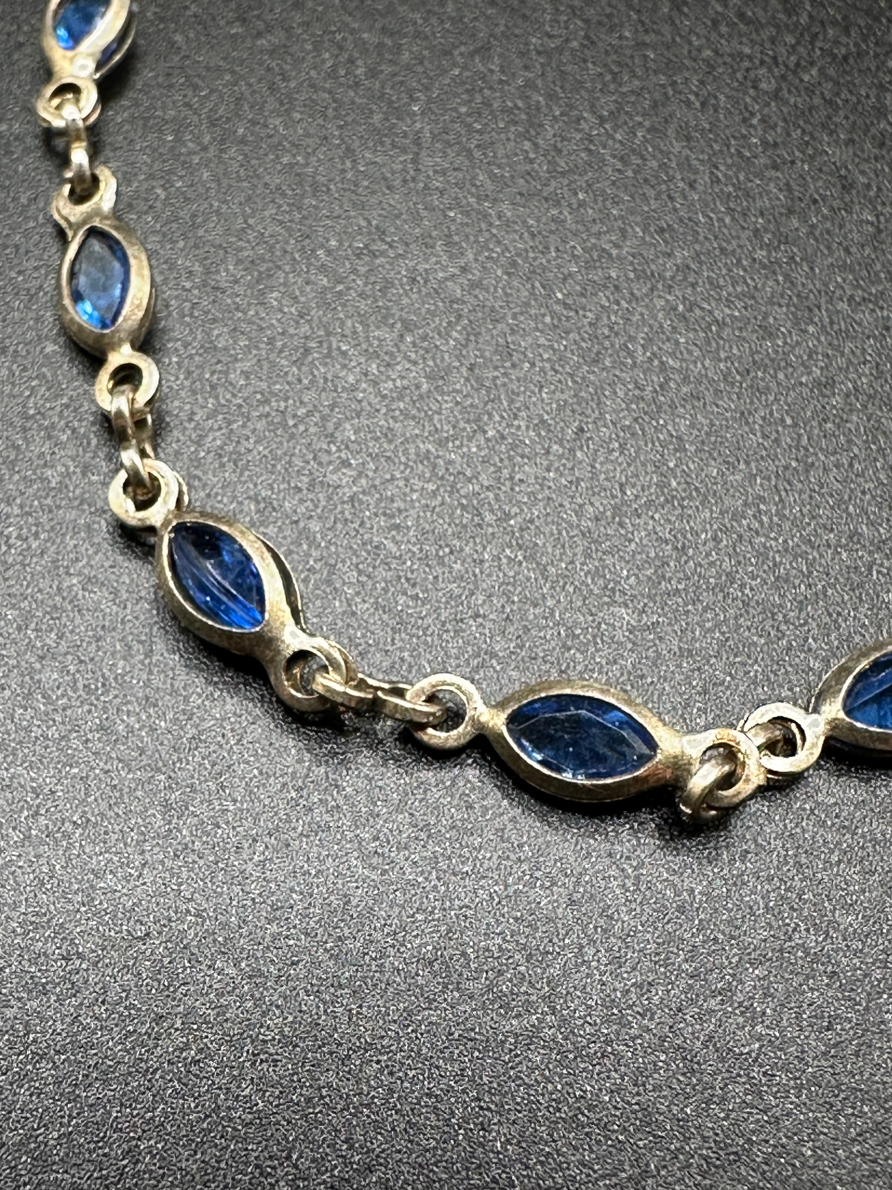 A silver-toned metal link bracelet, styled as a tennis bracelet, featuring a continuous series of bezel-set, marquise-shaped blue crystals. Each crystal is set within its own link, connected by small jump rings, leading to a lobster claw clasp. The metal exhibits a polished finish. No discernible hallmarks, inscriptions, or text are visible on the clasp or links.