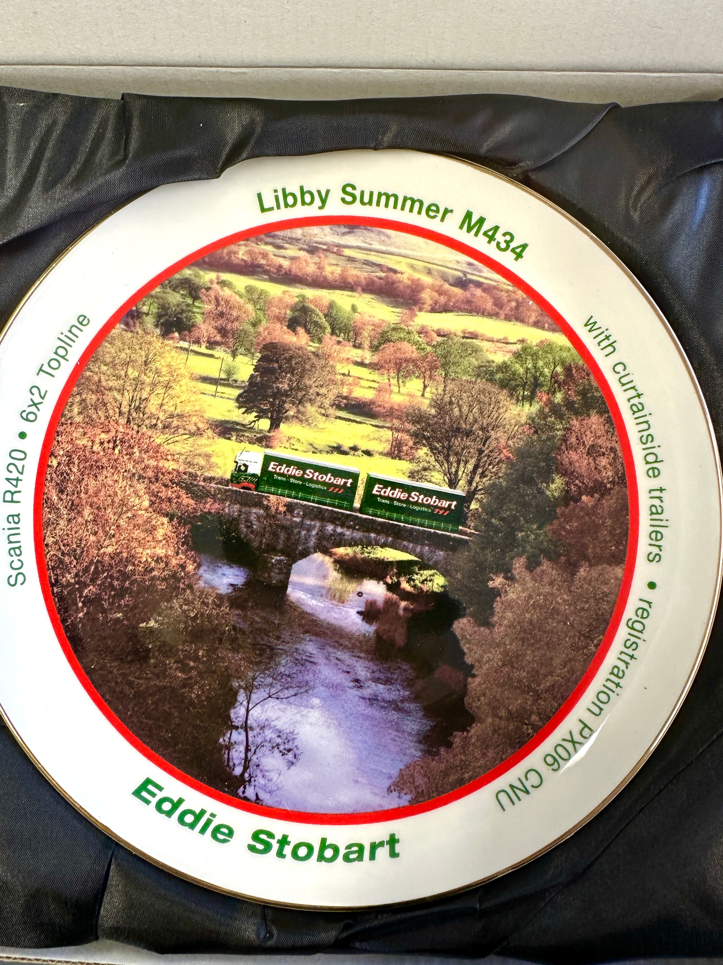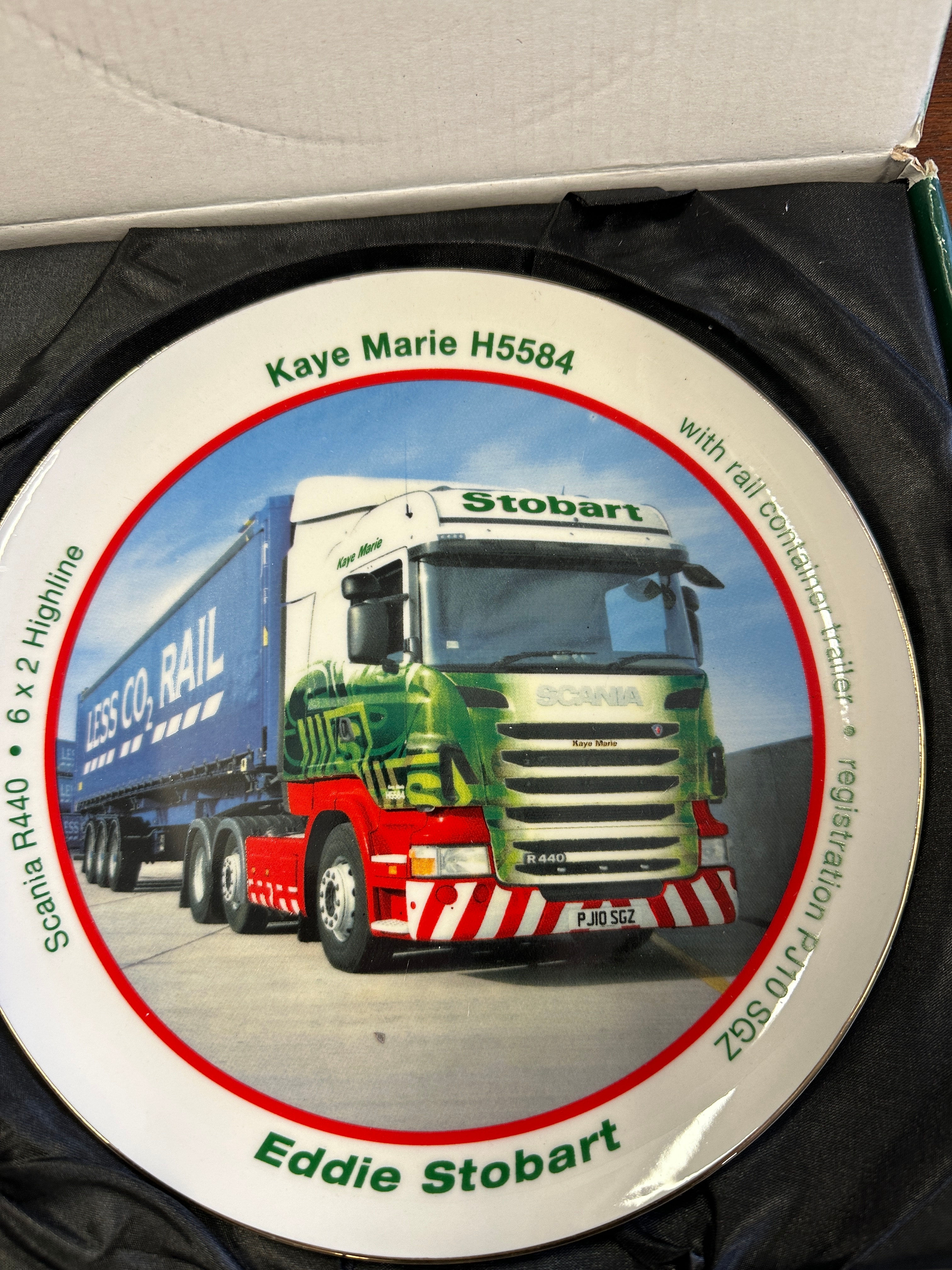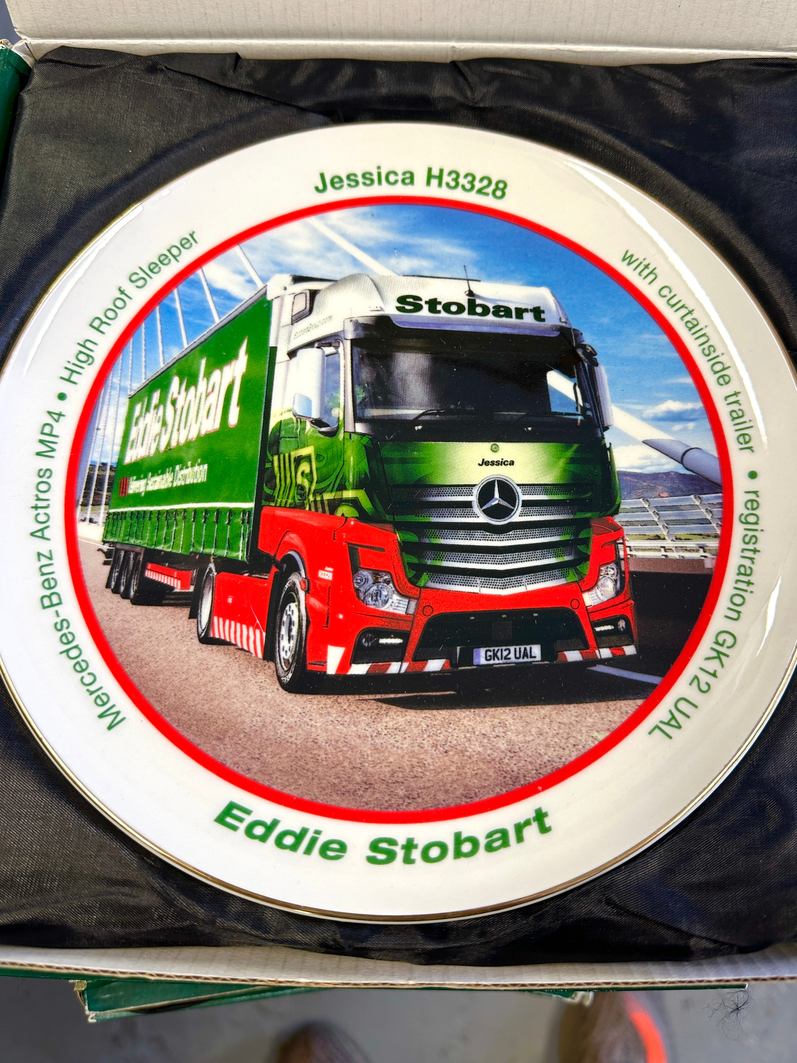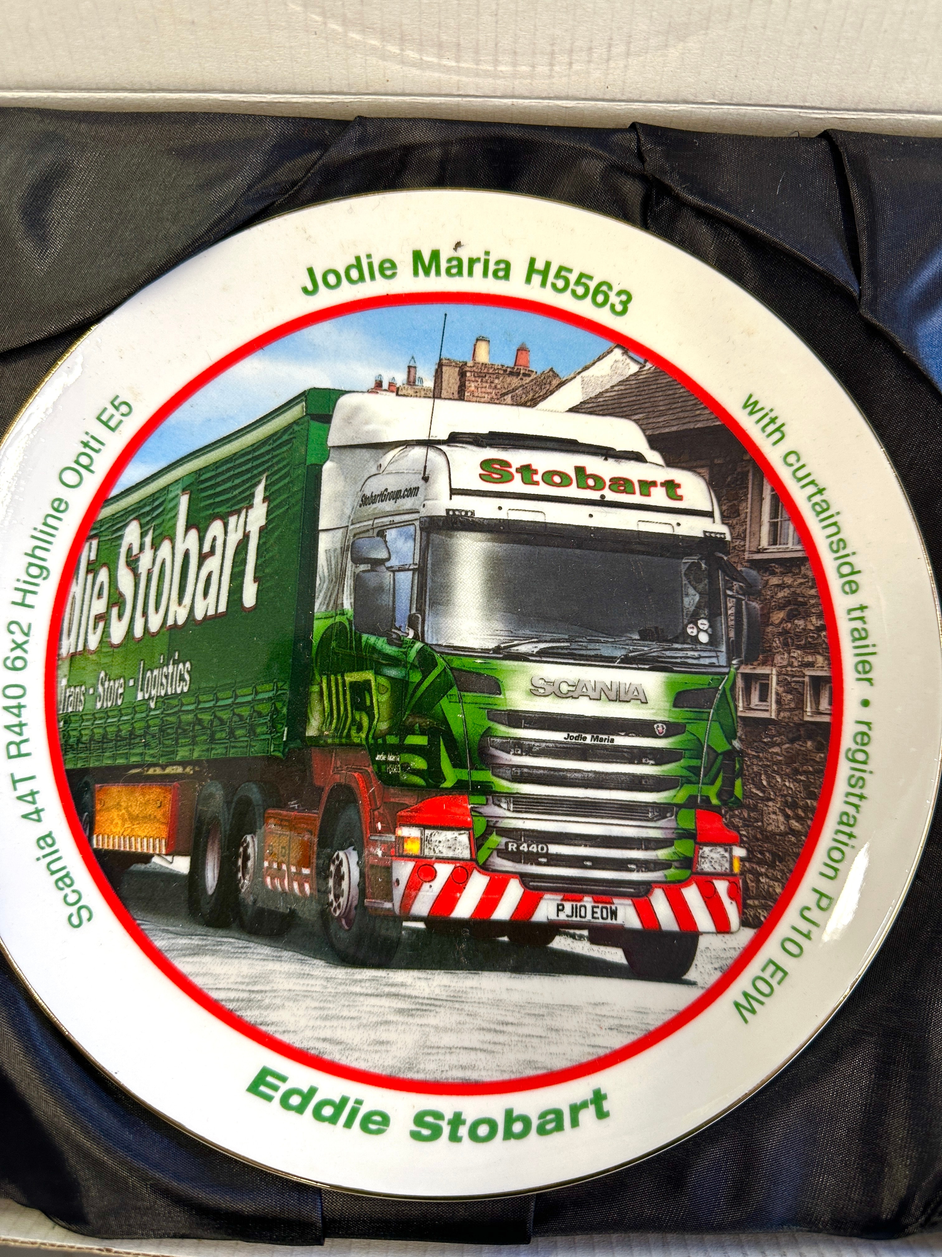 A collection of Atlas Editions Eddie Stobart porcelain decorative plates, likely gilded in 22k. Each plate features a distinct Eddie Stobart lorry with various trailer configurations, such as curtainside, timber wagon, or rail container. A central photographic image is framed by a red circle, surrounded by identifying text detailing the specific lorry’s name (e.g., Jessica H3328, Holly Alice M194), model (e.g., Mercedes-Benz Actros MP4, DAF 95XF, Scania R440), and registration number (e.g., GK12 UAL, R100 ESL). The “Eddie Stobart” branding is prominently displayed at the bottom of each plate and on the trucks themselves. The plates are presented in their original green cardboard boxes, labeled “Eddie Stobart The Collection Porcelain Decorative Plate.”