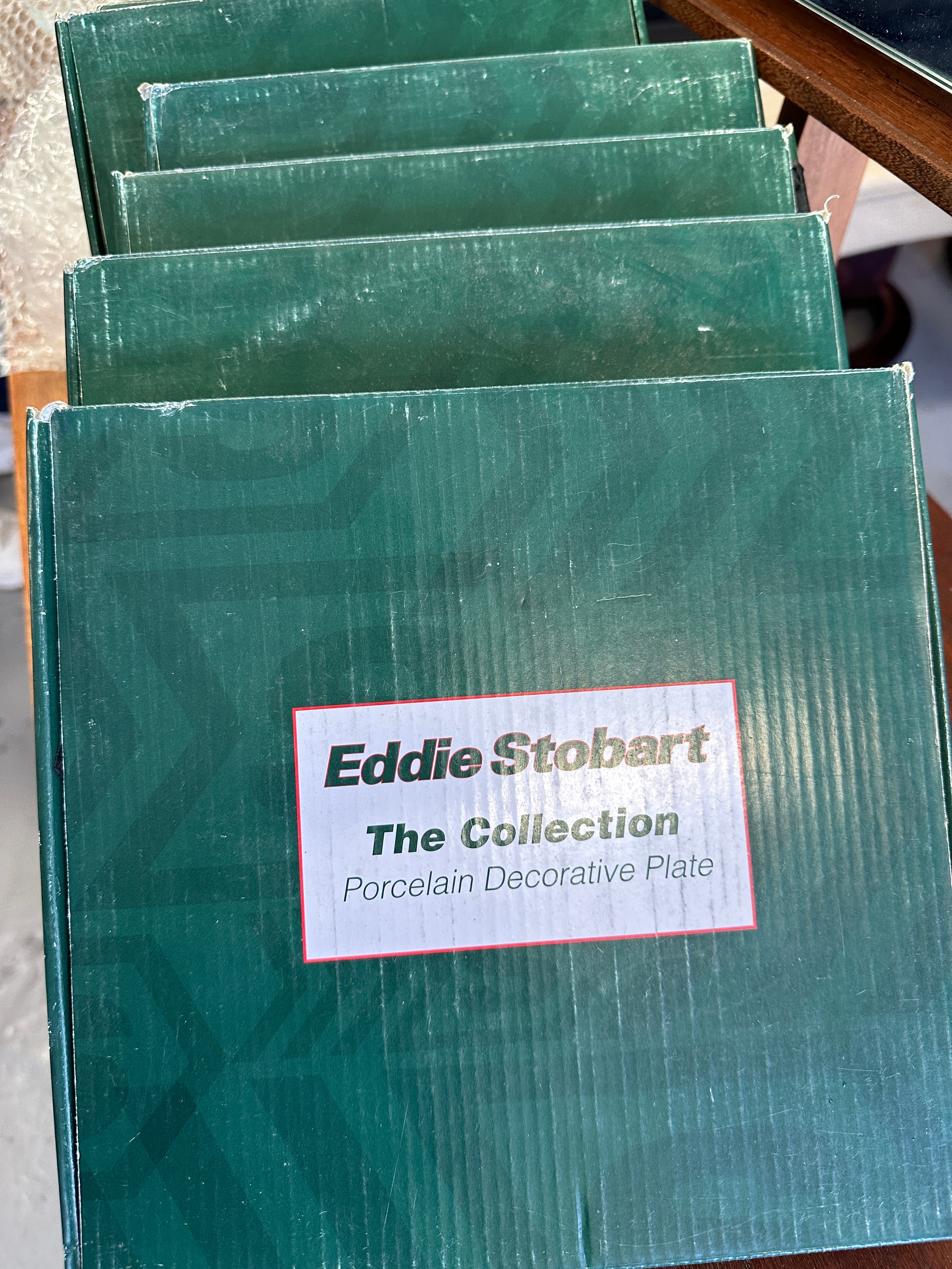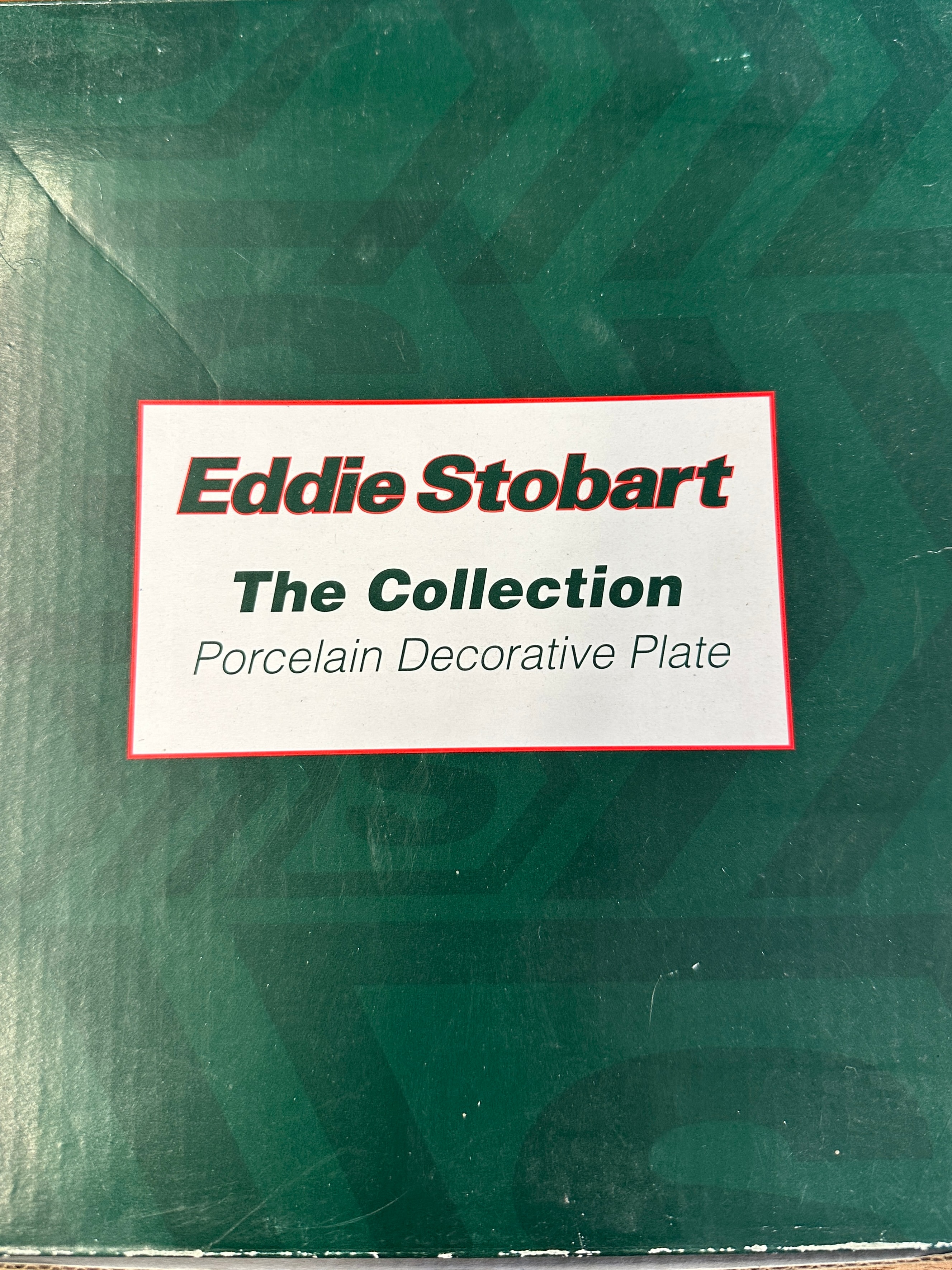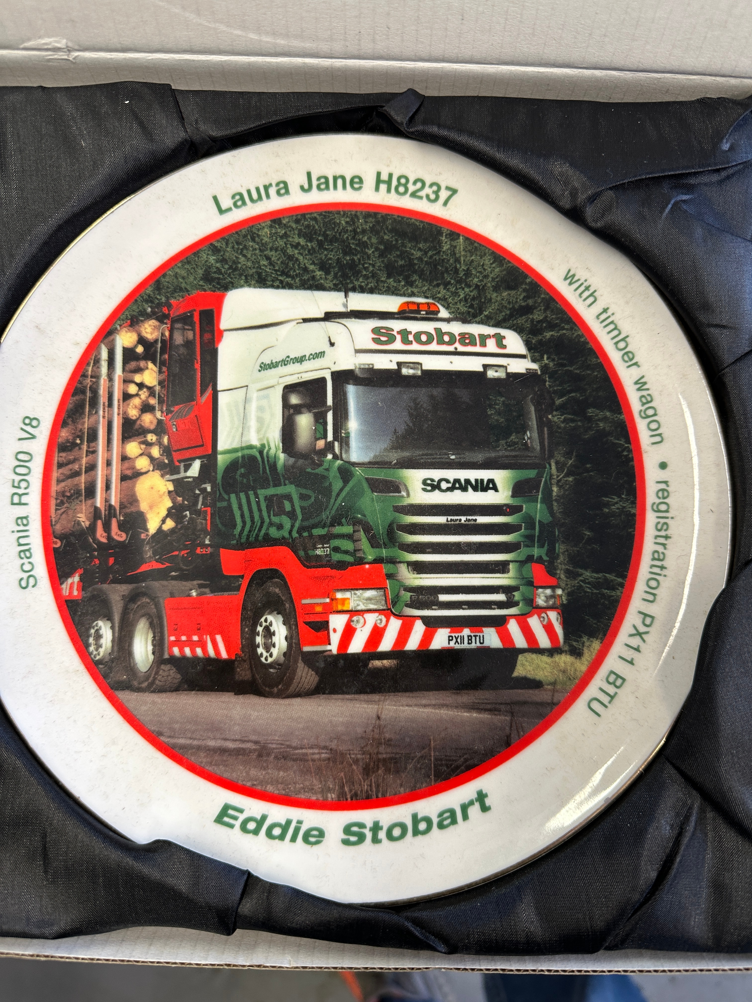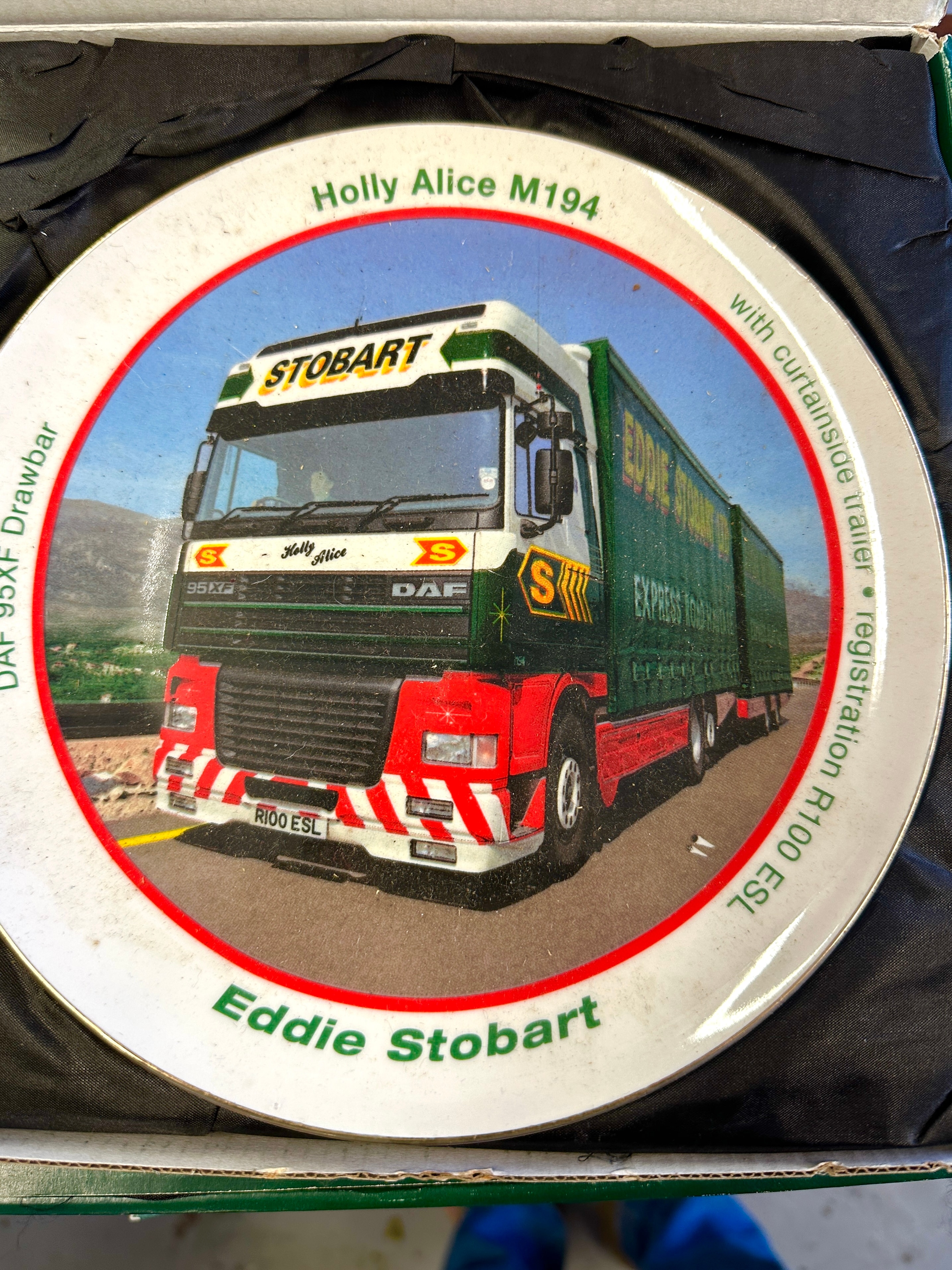A collection of Atlas Editions Eddie Stobart porcelain decorative plates, likely gilded in 22k. Each plate features a distinct Eddie Stobart lorry with various trailer configurations, such as curtainside, timber wagon, or rail container. A central photographic image is framed by a red circle, surrounded by identifying text detailing the specific lorry’s name (e.g., Jessica H3328, Holly Alice M194), model (e.g., Mercedes-Benz Actros MP4, DAF 95XF, Scania R440), and registration number (e.g., GK12 UAL, R100 ESL). The “Eddie Stobart” branding is prominently displayed at the bottom of each plate and on the trucks themselves. The plates are presented in their original green cardboard boxes, labeled “Eddie Stobart The Collection Porcelain Decorative Plate.”