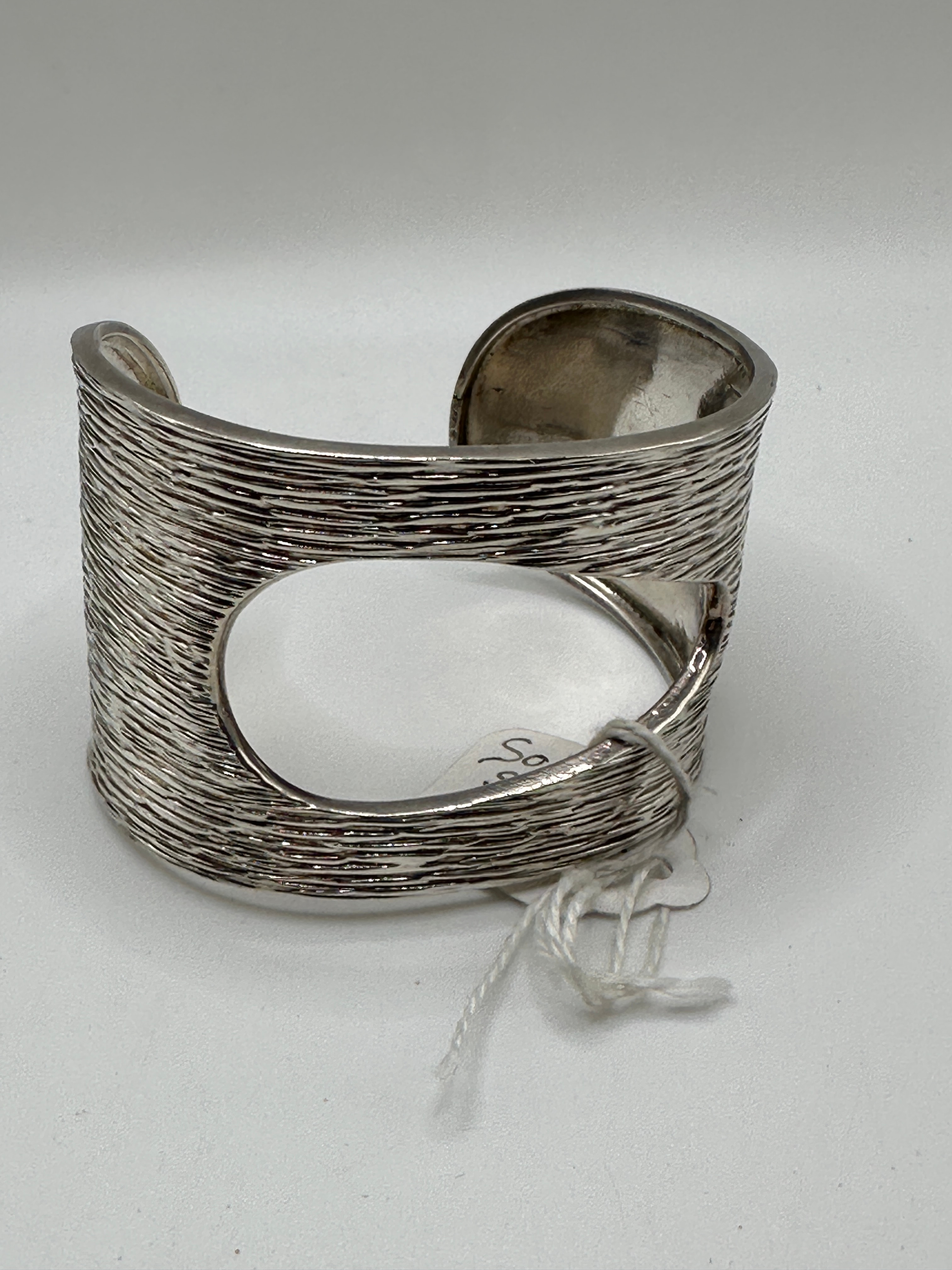A NOVICA ‘Dark Rain’ oxidized etched 925 sterling silver cuff bracelet from Bali. This wide, open-cuff bracelet features a distinctive horizontally ridged or striated exterior texture. The interior is smooth and polished, encompassing a stylized, elongated oval cutout. The piece exhibits a modern or contemporary aesthetic.