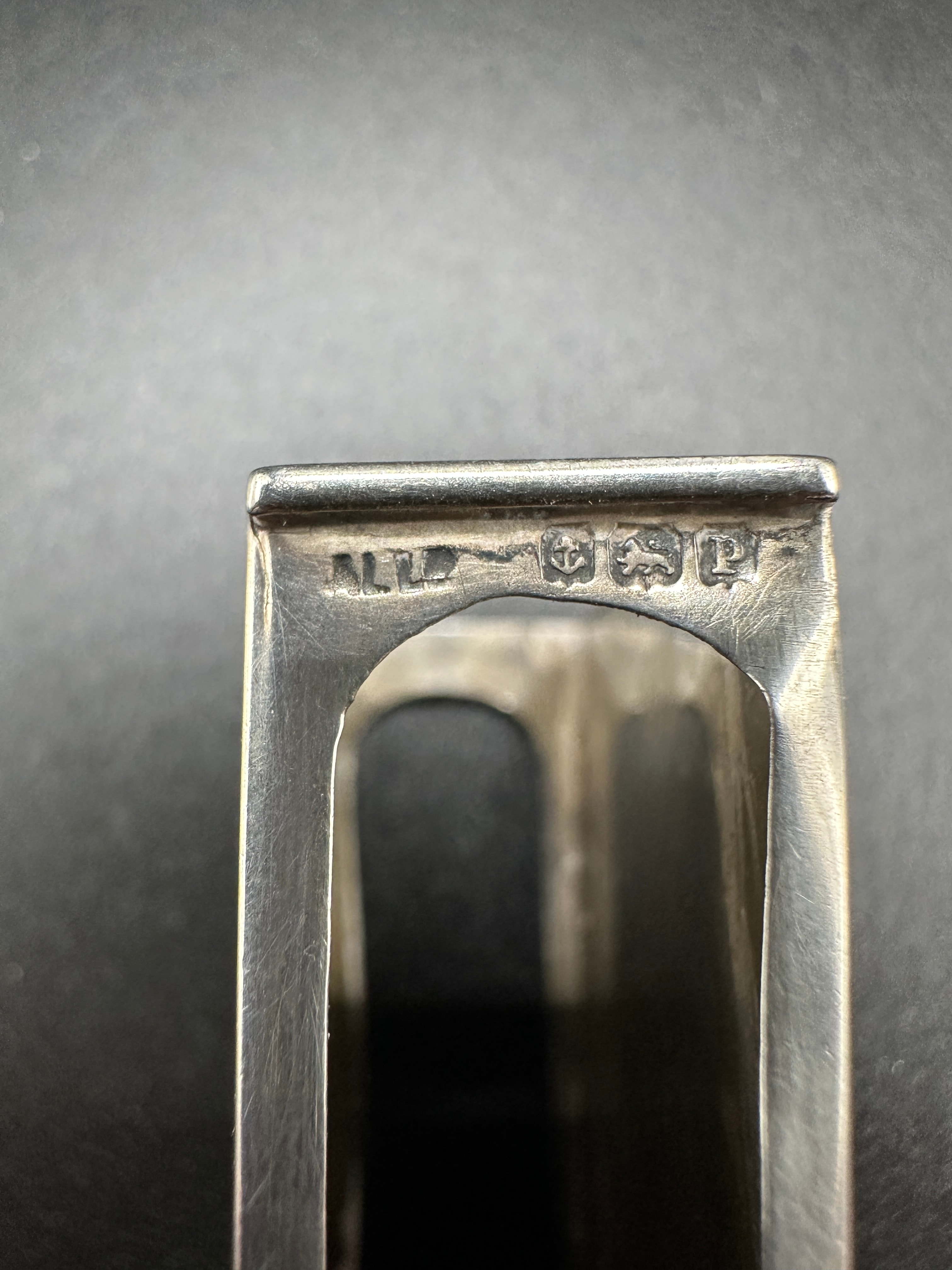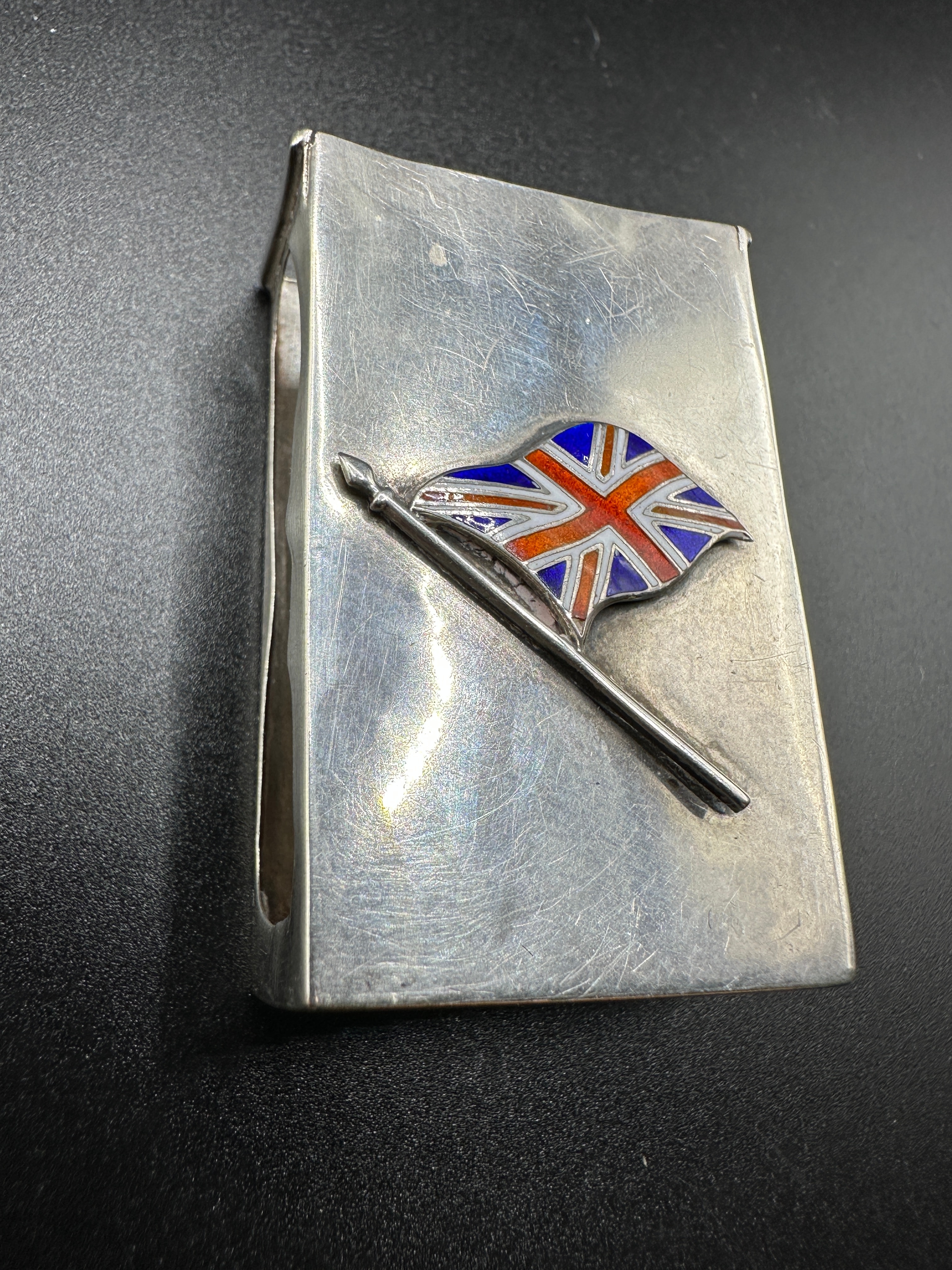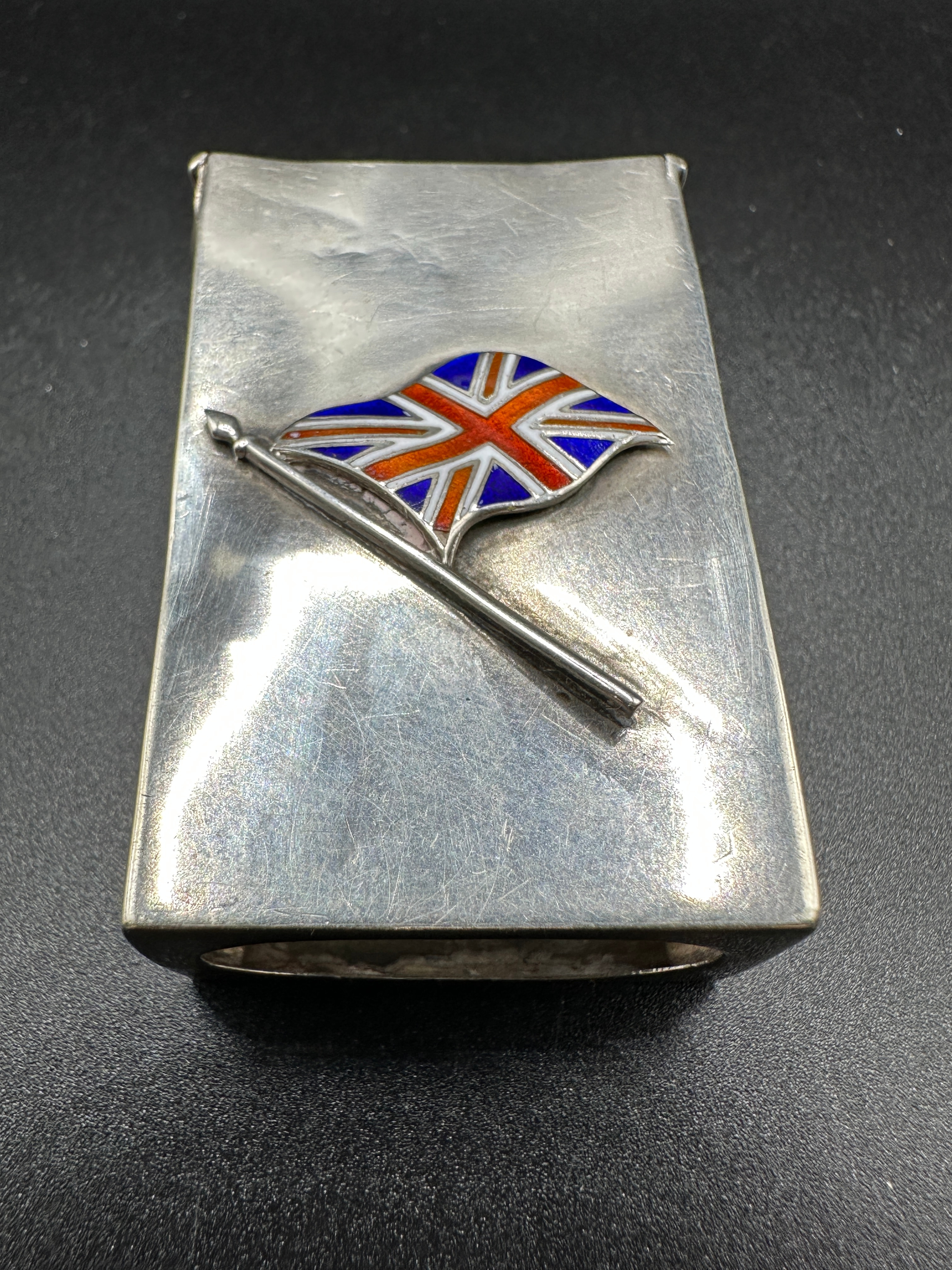 A George V sterling silver vesta case, dated Birmingham 1914, featuring an applied enamel Union Jack flag on its front surface in red, white, and blue. Visible hallmarks on the top edge include the ‘AL’ maker’s mark, the Birmingham assay office anchor, the lion passant indicating sterling silver, and the date letter ‘P’ for 1914.
