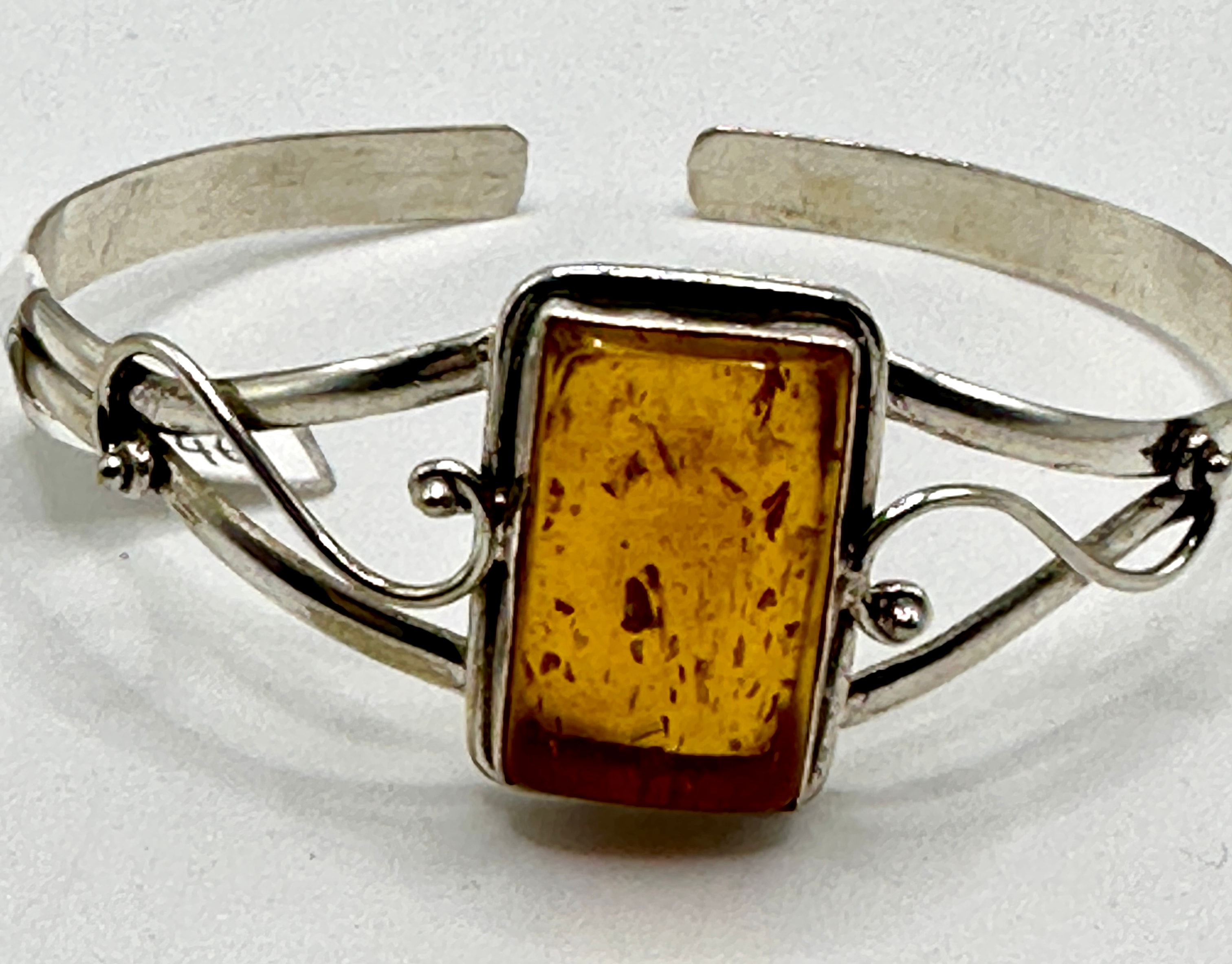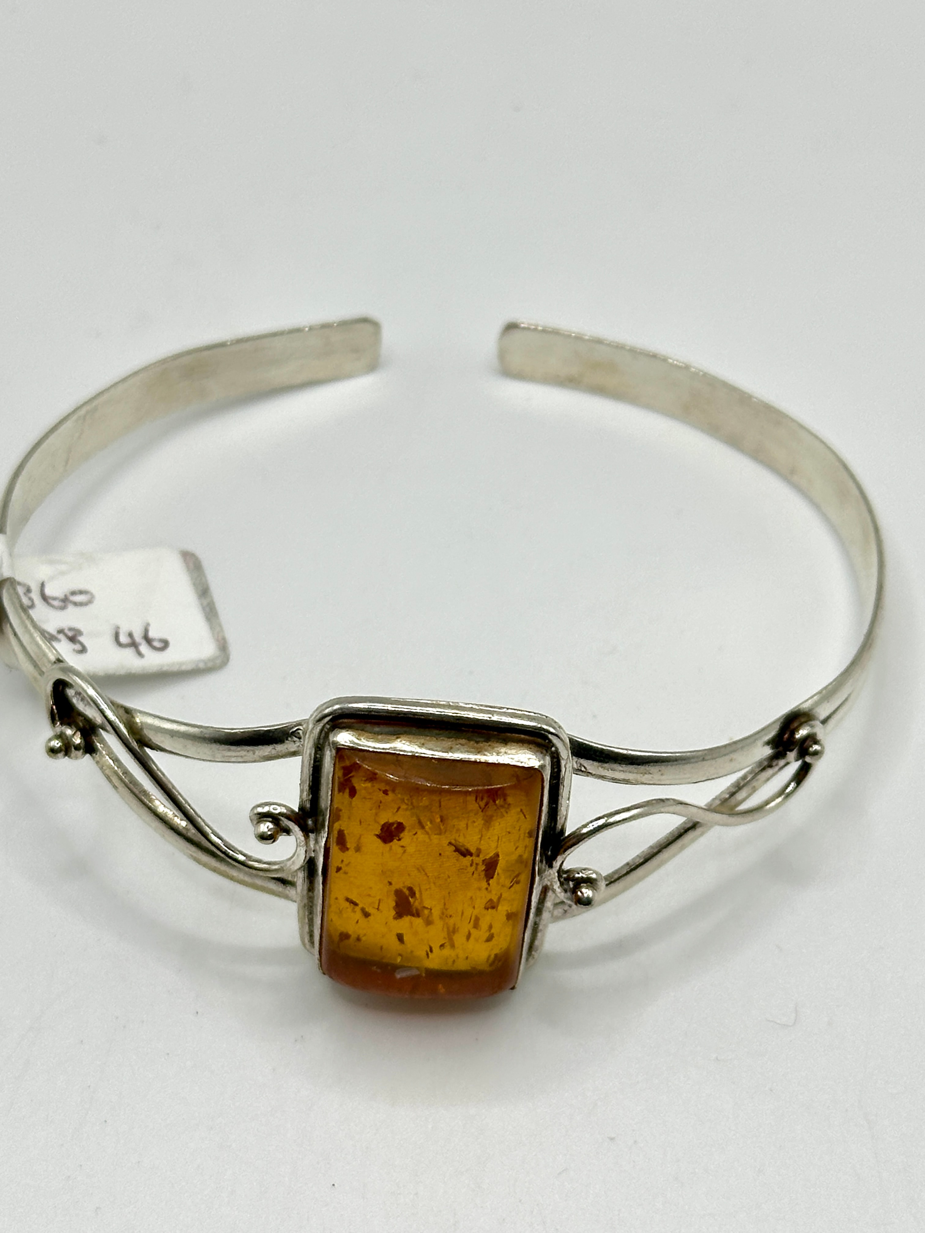 An open-ended cuff bracelet crafted from 925 silver, featuring a prominent rectangular, cabochon-cut amber stone. The amber displays a warm yellowish-orange hue with visible inclusions and is set in a bezel. The central stone is flanked by decorative, undulating wirework elements that integrate into the bracelet’s band. A small white tag attached to the bracelet displays handwritten numbers “360” and “98 46”.