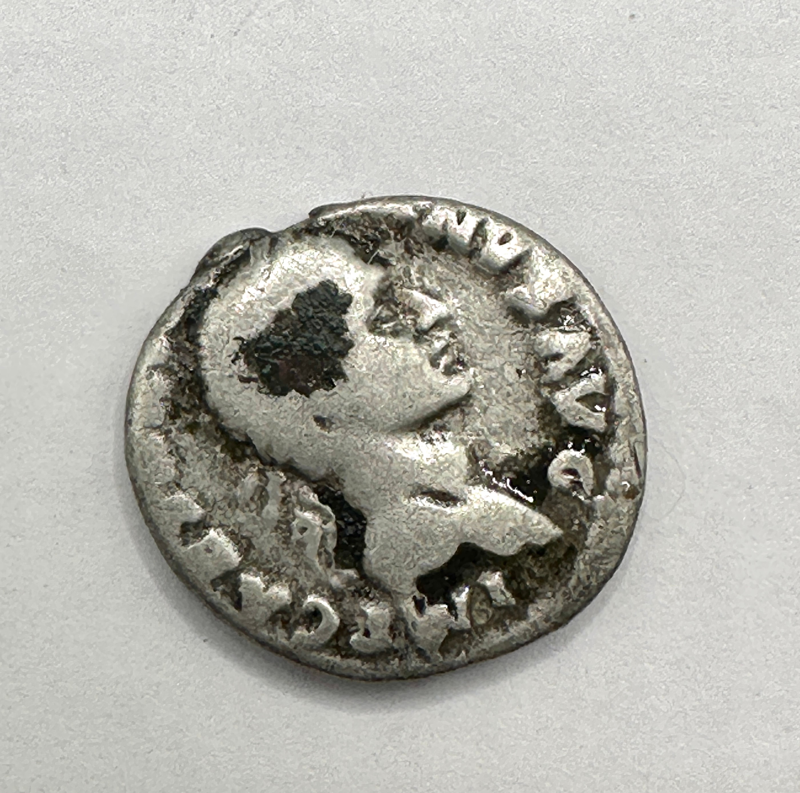 An Ancient Roman Empire silver denarius, attributed to Emperor Vespasian (69-79 AD), of the ‘IVDAEA Capta’ type. The obverse features a laureated male bust facing right, with partial Latin inscription reading “CAESAR” and “AVG”. The reverse depicts a seated figure in a posture of mourning to the right of a standing element, with the partial Latin inscription “…IVDAEA” visible at the bottom.