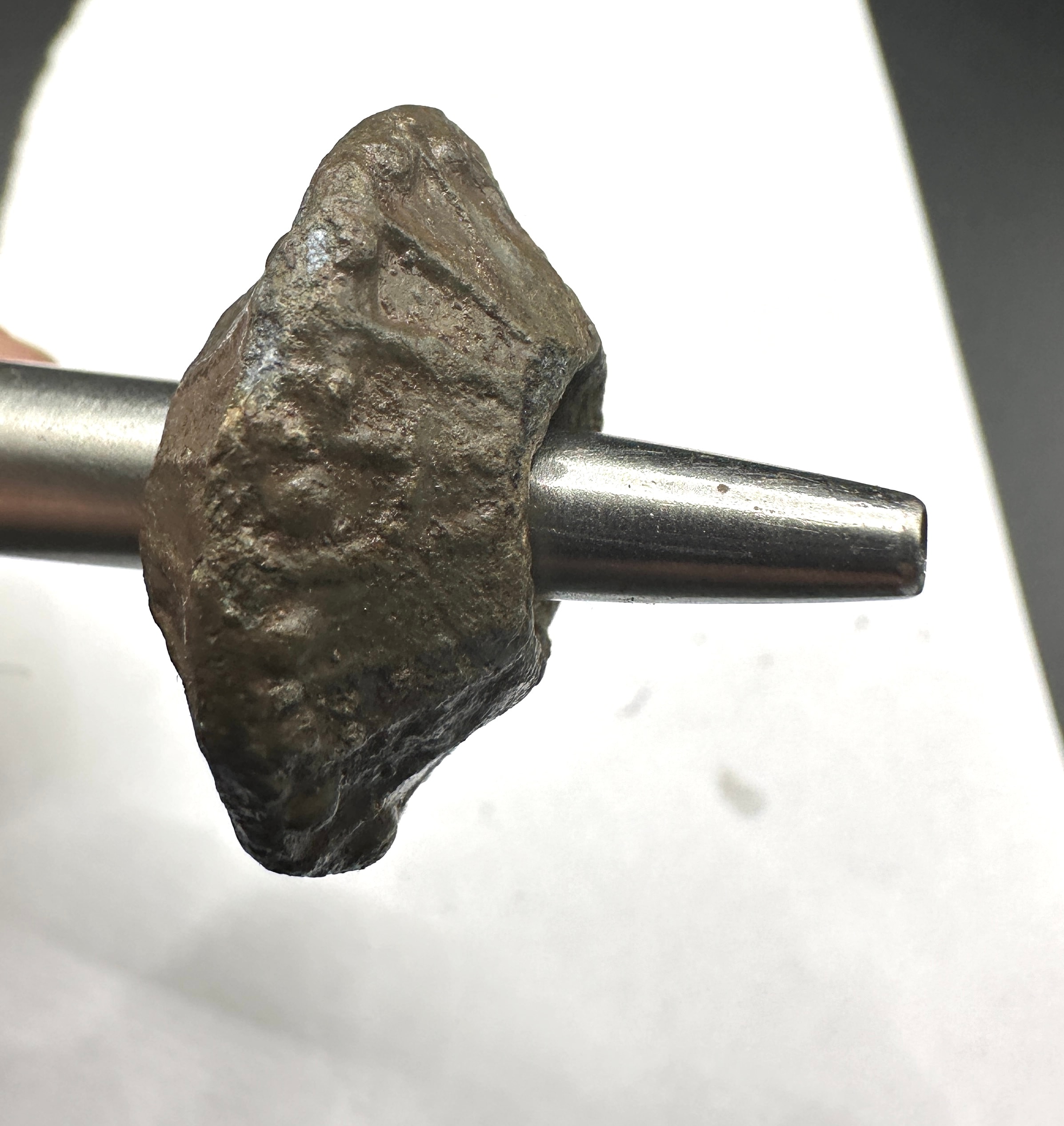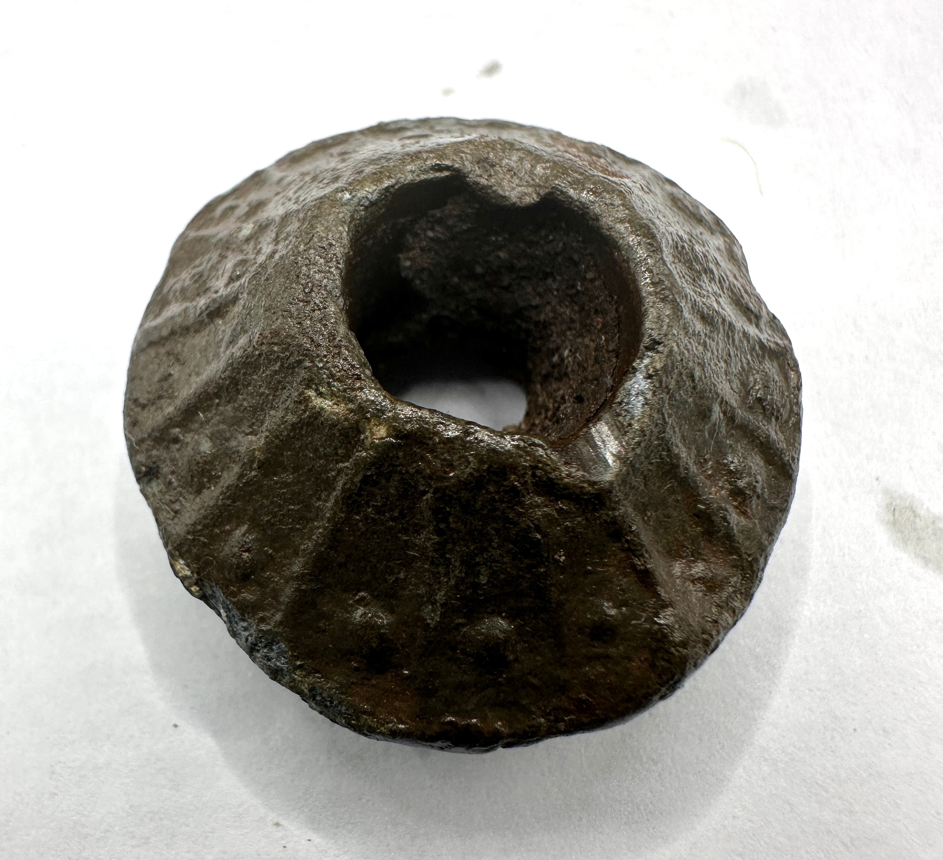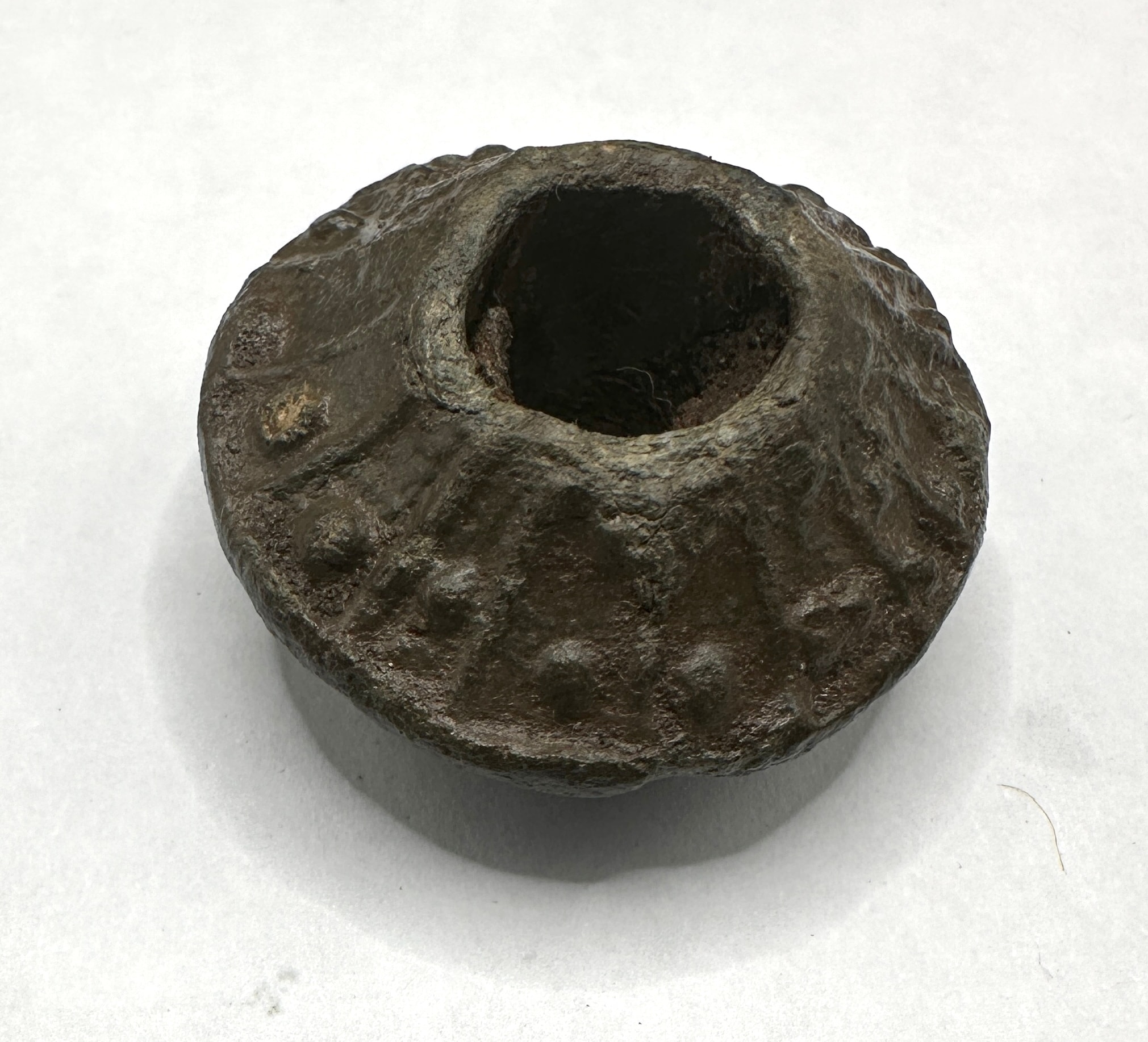 A Roman bronze spindle whorl. This roughly circular, disc-like object features a raised, conical profile and a central aperture, crafted from a heavily corroded and patinated dark brown-grey metallic material. The central hole accommodates a rod or spindle. The surface exhibits a rustic, undulating texture with irregular raised patterns, particularly prominent on the conical face and outer rim. No discernible texts or clear identifying markings are present.