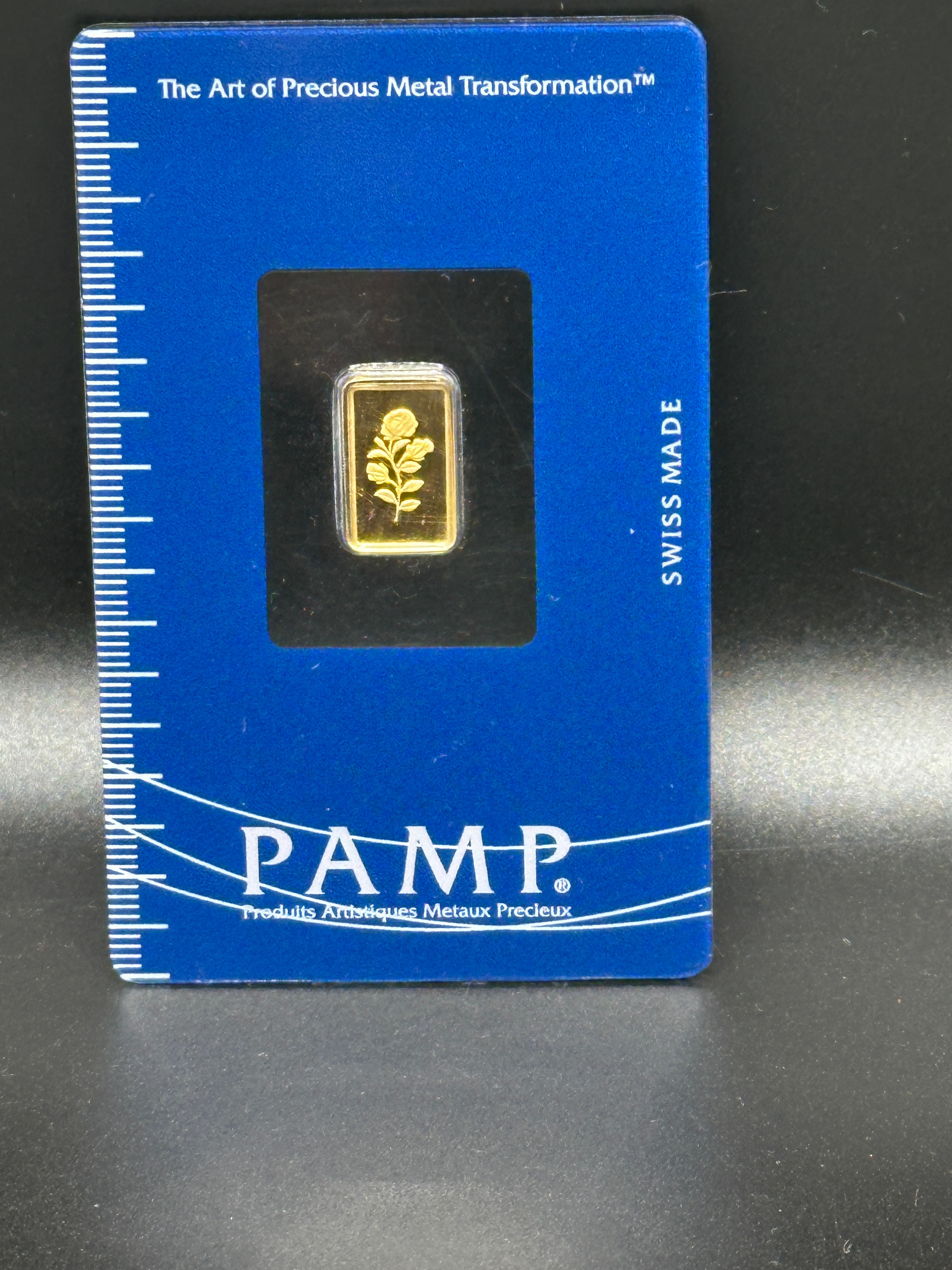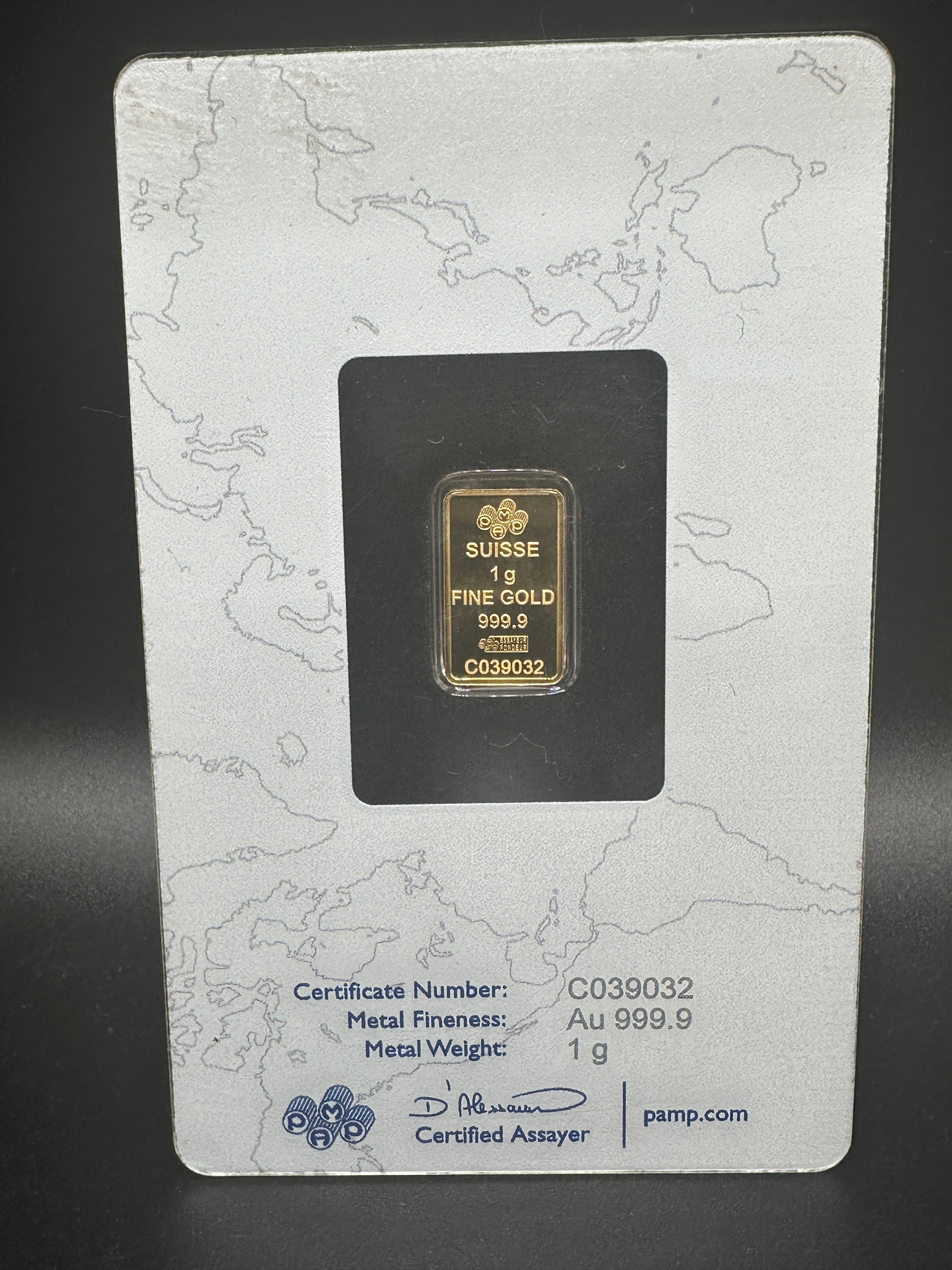 A PAMP Suisse Rosa 1 Gram .9999 Fine Gold Bullion Bar. The bar features a stylized rose design on its obverse and is inscribed ‘Suisse’, ‘1 g’, ‘FINE GOLD’, ‘999.9’, with an assay mark and serial number C039032 on its reverse. It is securely sealed within its original PAMP assay card. The blue obverse of the card displays a ruler design and text ‘The Art of Precious Metal Transformation™’ and ‘SWISS MADE’. The white reverse of the card features a world map outline and lists ‘Certificat Number: C039032’, ‘Metal Fineness: Au 999.9’, and ‘Metal Weight: 1 g’, alongside ‘D’Alessio Certified Assayer’ and ‘pamp.com’.