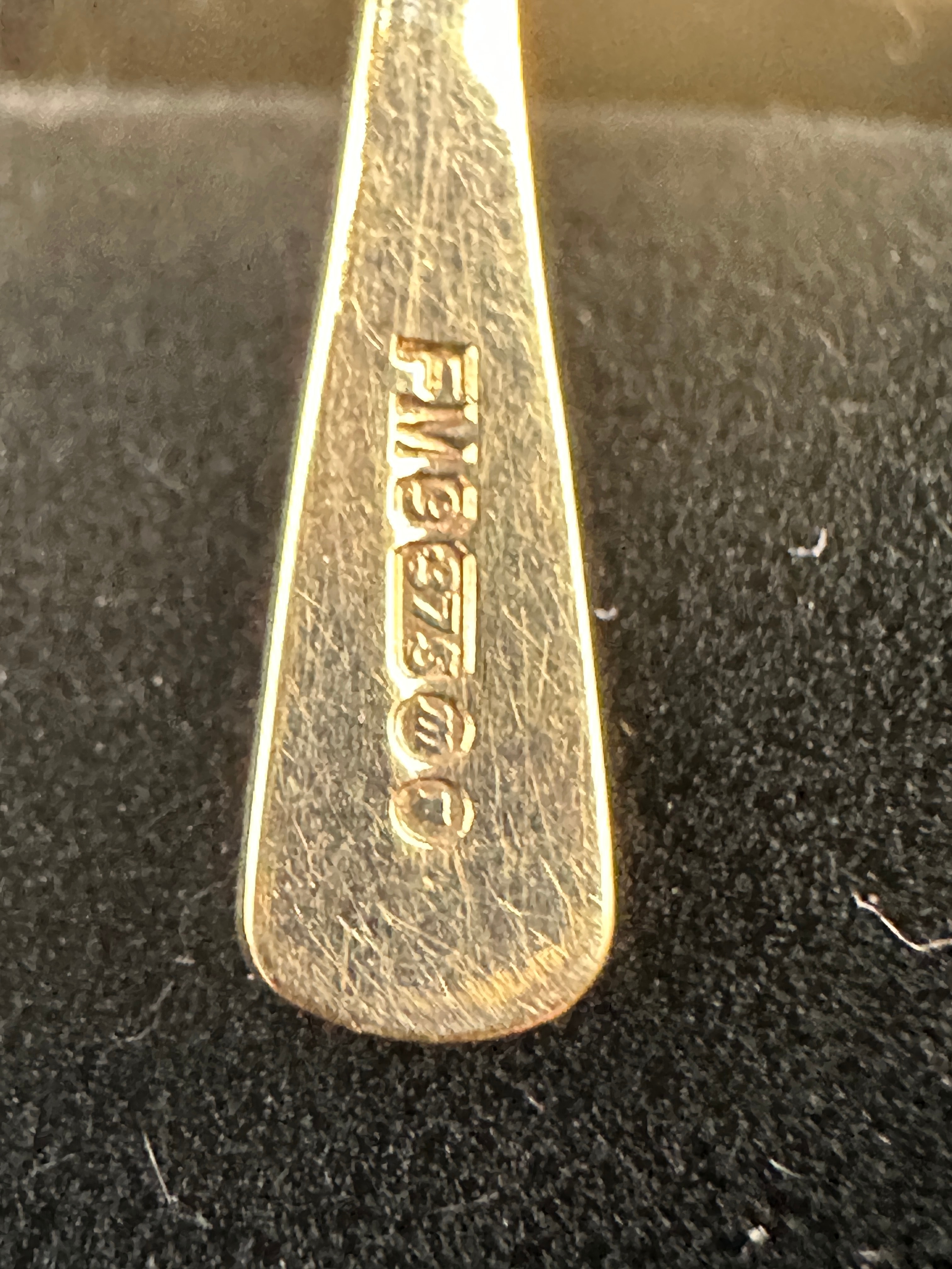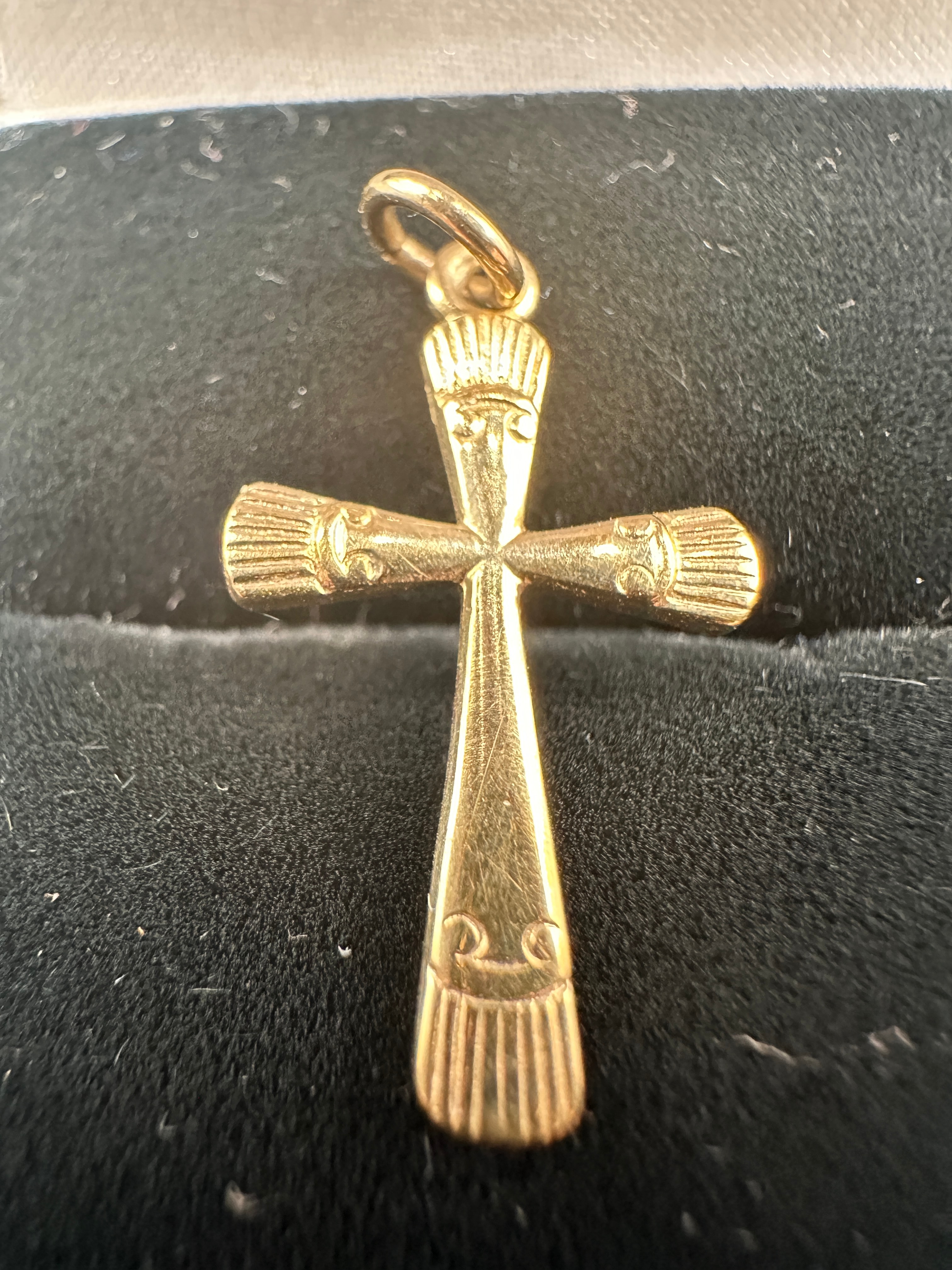 A single gold cross pendant, crafted from 9-carat gold as indicated by the “375” hallmark, and bearing the maker’s mark “F.V.B.” The pendant features a stylized design with fluted ends on all four arms and a distinct geometric face motif on the top arm. It is suspended from a simple circular jump ring. The item is likely dating from the mid-20th century to contemporary.