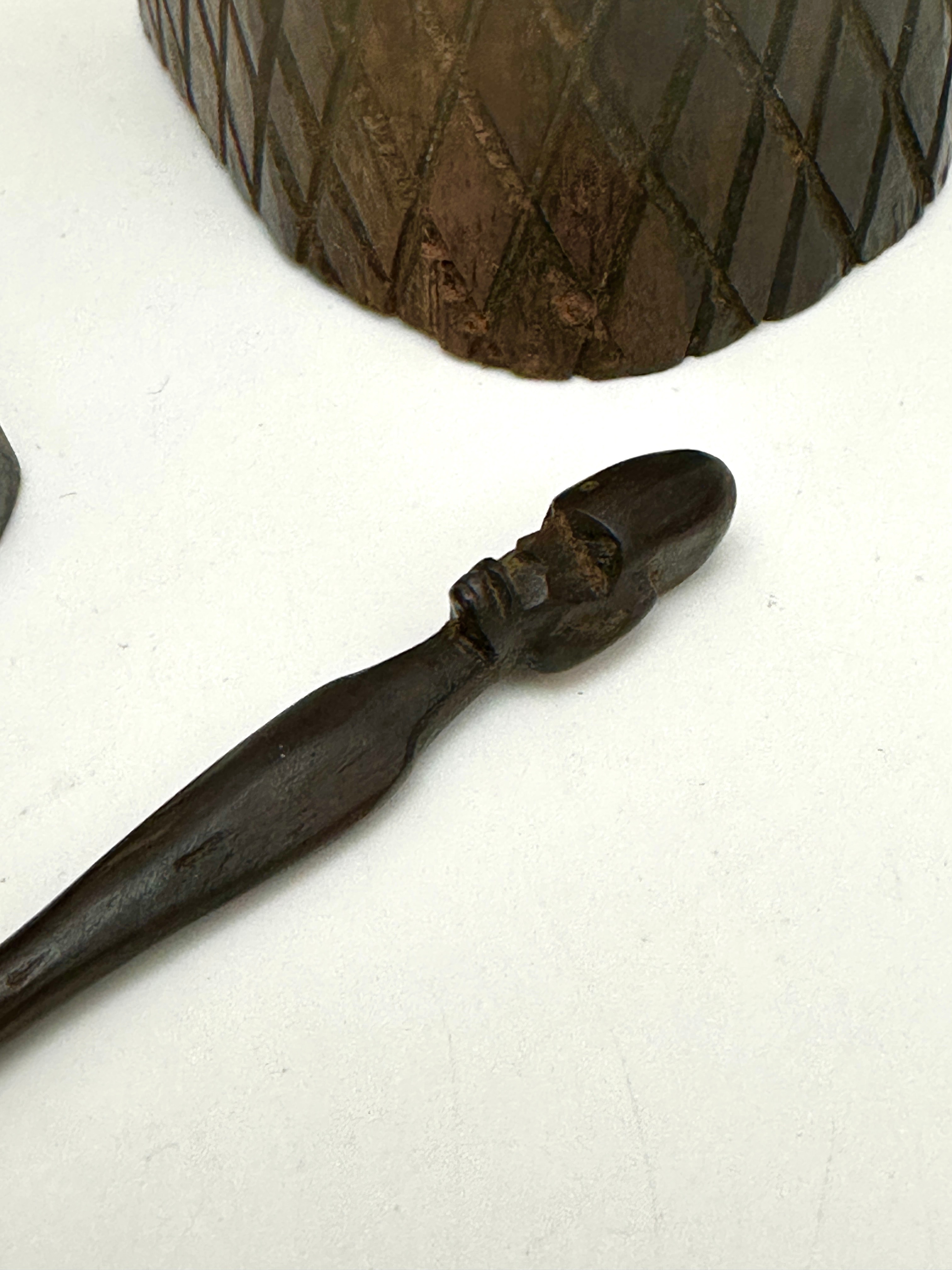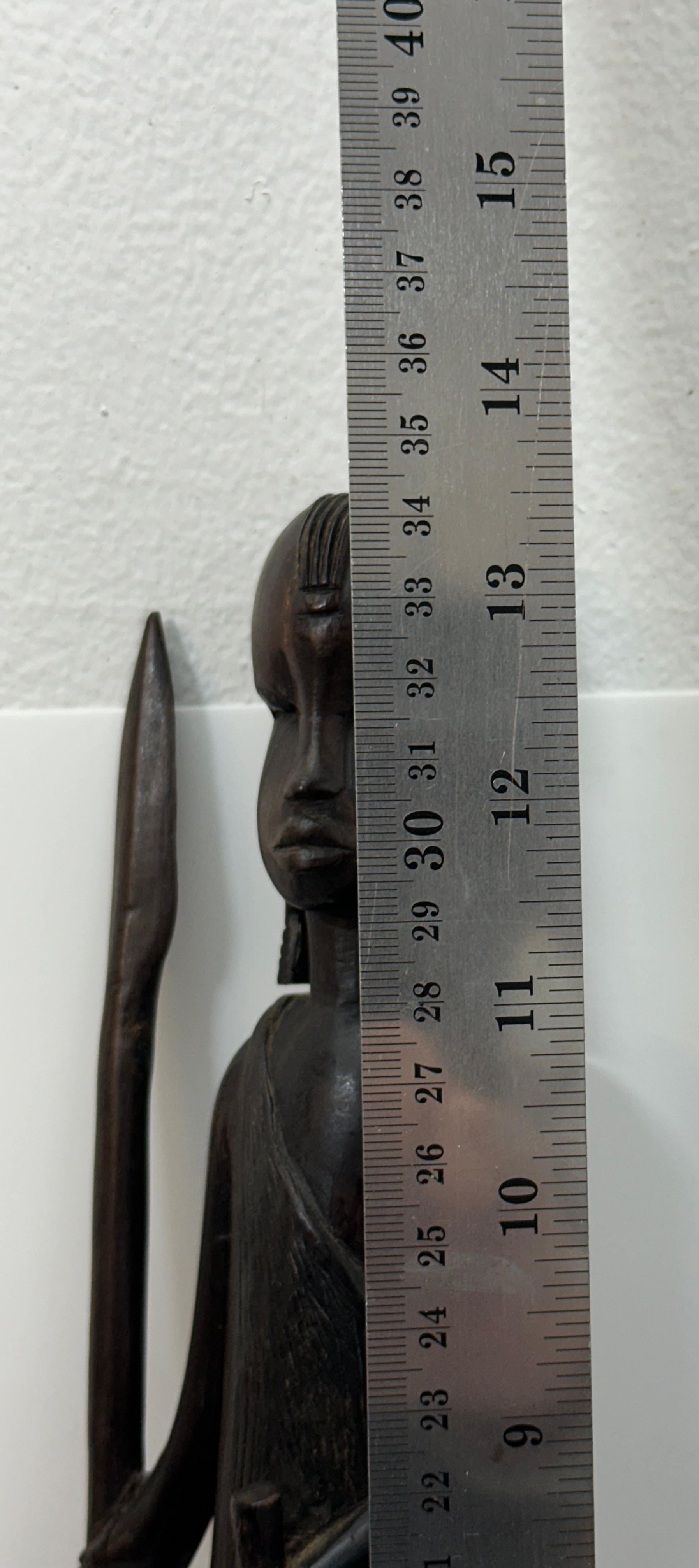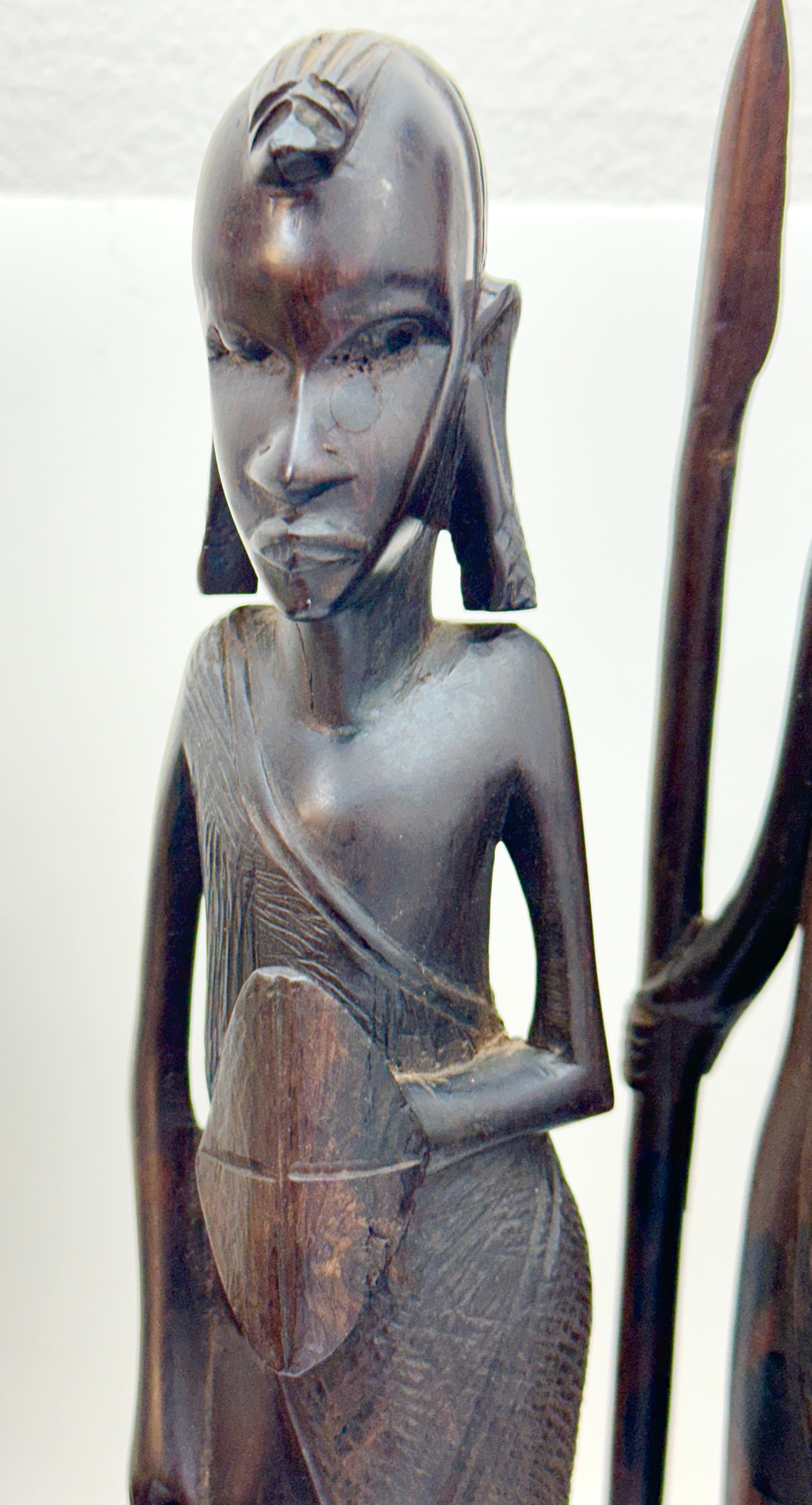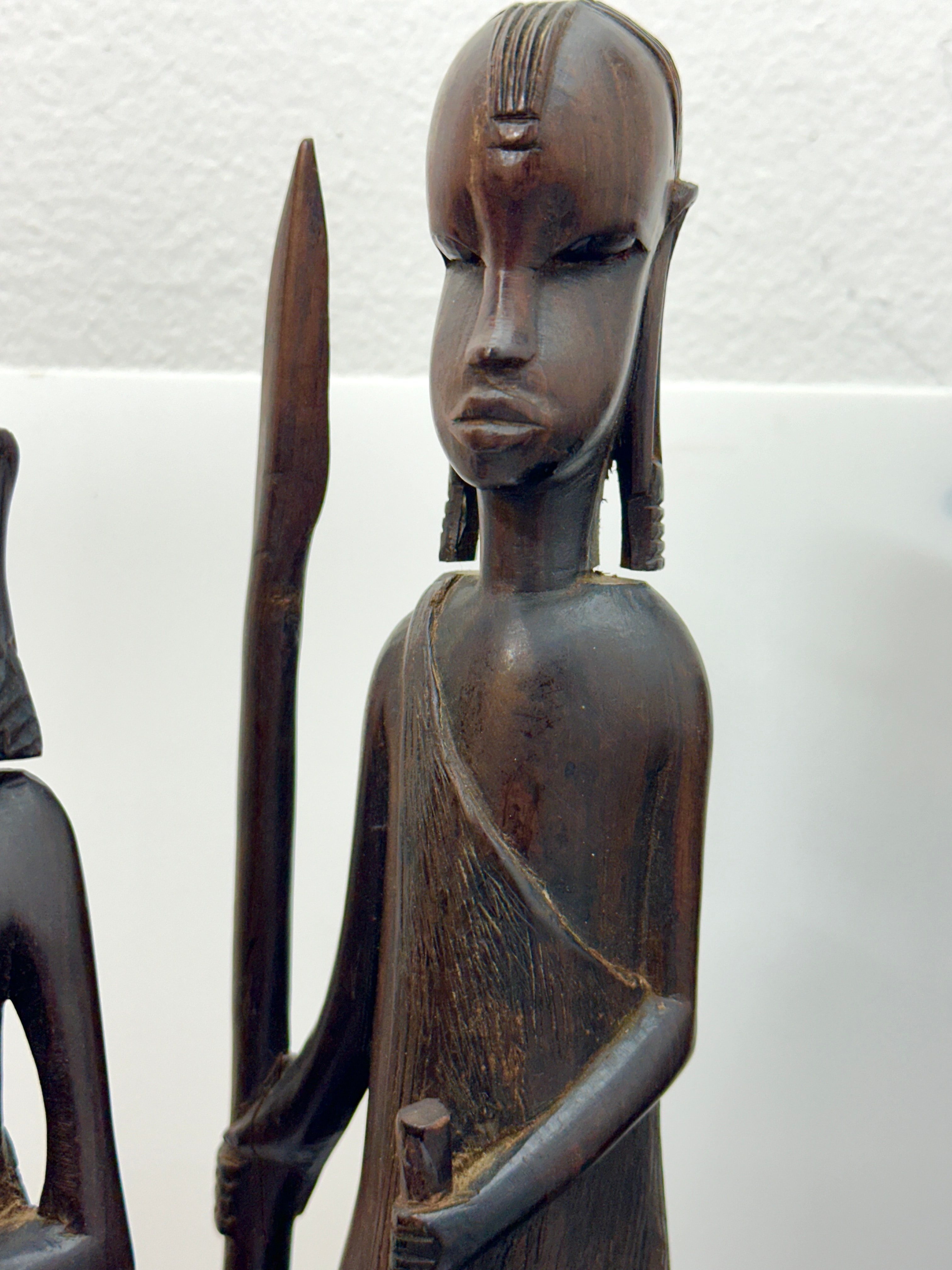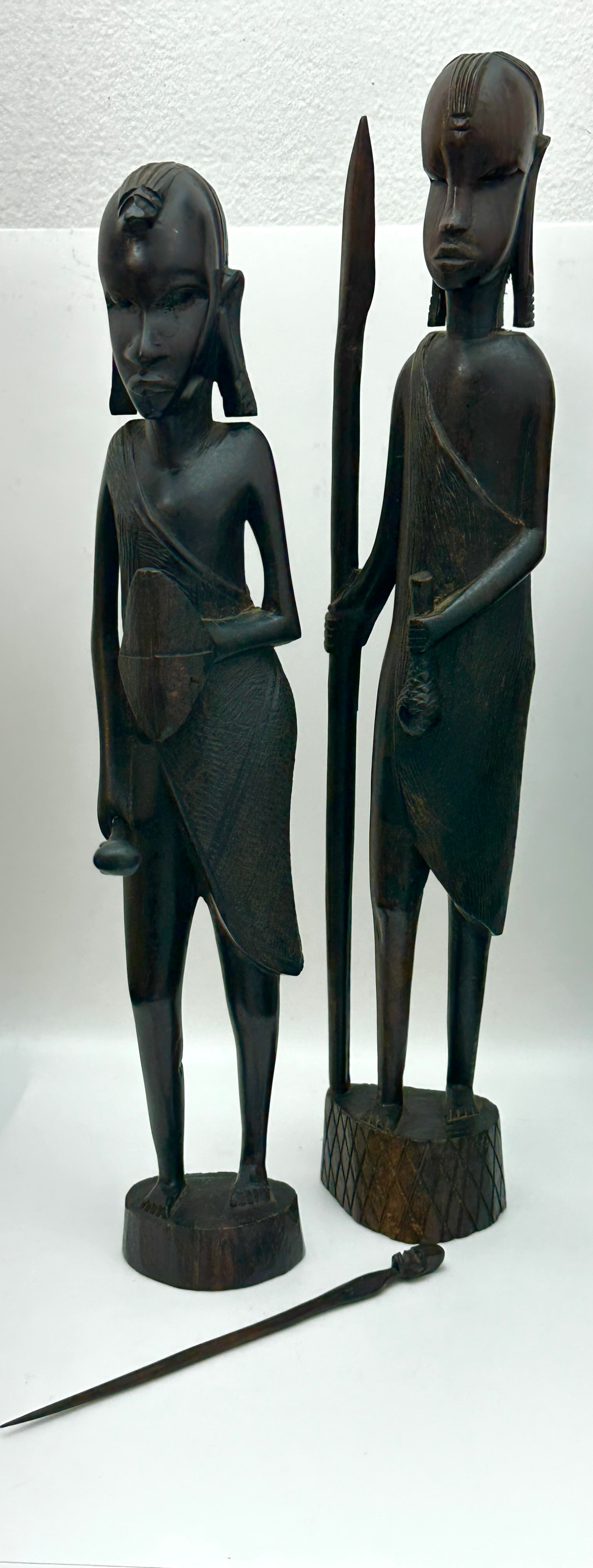 A pair of vintage African carved wood figures, likely ebony, depicting standing human forms in an ethnographic or tribal style. Each figure features stylized facial features, intricate hair or head adornments, and elongated earlobes. One figure stands on a textured base and holds a spear and a small object. The other figure stands on a plain oval base and holds a round shield-like object and a small elongated implement. The material is a dense dark wood with a visible grain and carved texture, suggesting clothing. No visible text or maker’s marks are present.
