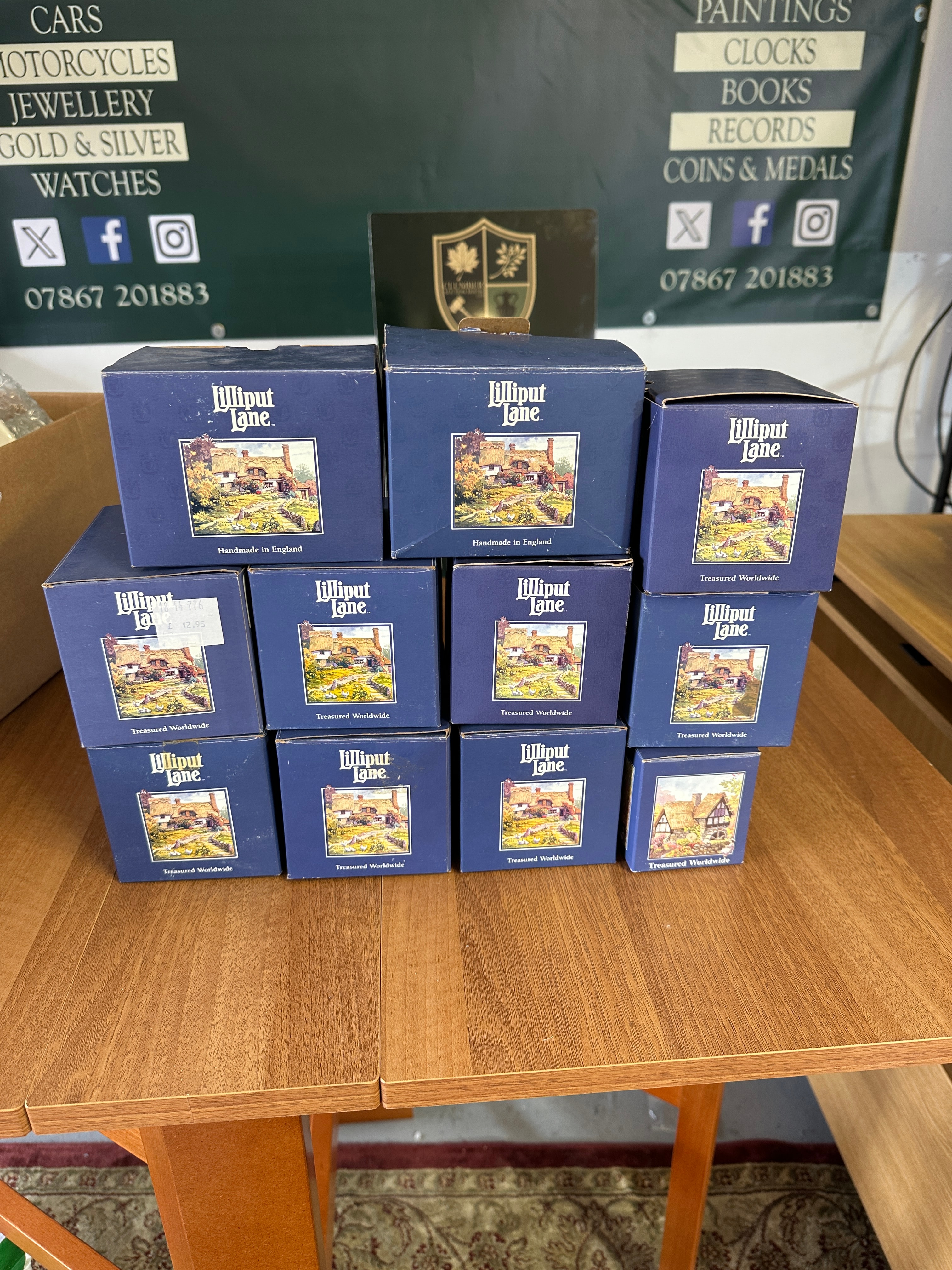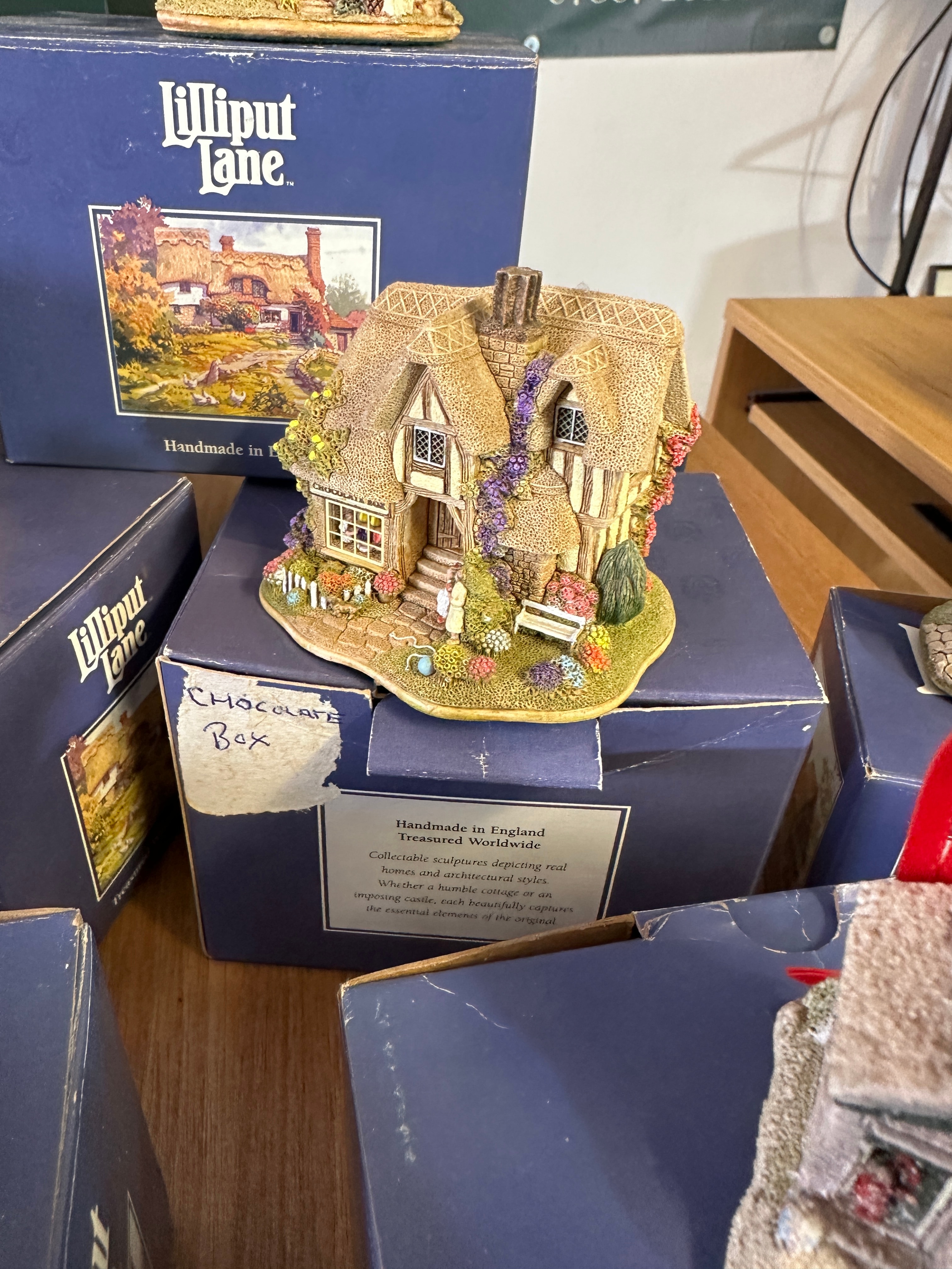 A collection of 11 Lilliput Lane miniature collectible house figurines, crafted from a hand-painted resin or ceramic-like material, depicting various detailed rustic cottages and buildings. Most figurines are presented on or in their original dark blue cardboard boxes, prominently displaying the “Lilliput Lane™” brand, “Handmade in England,” and “Treasured Worldwide” text. One box is marked with the handwritten label “Chocolate Box.”
