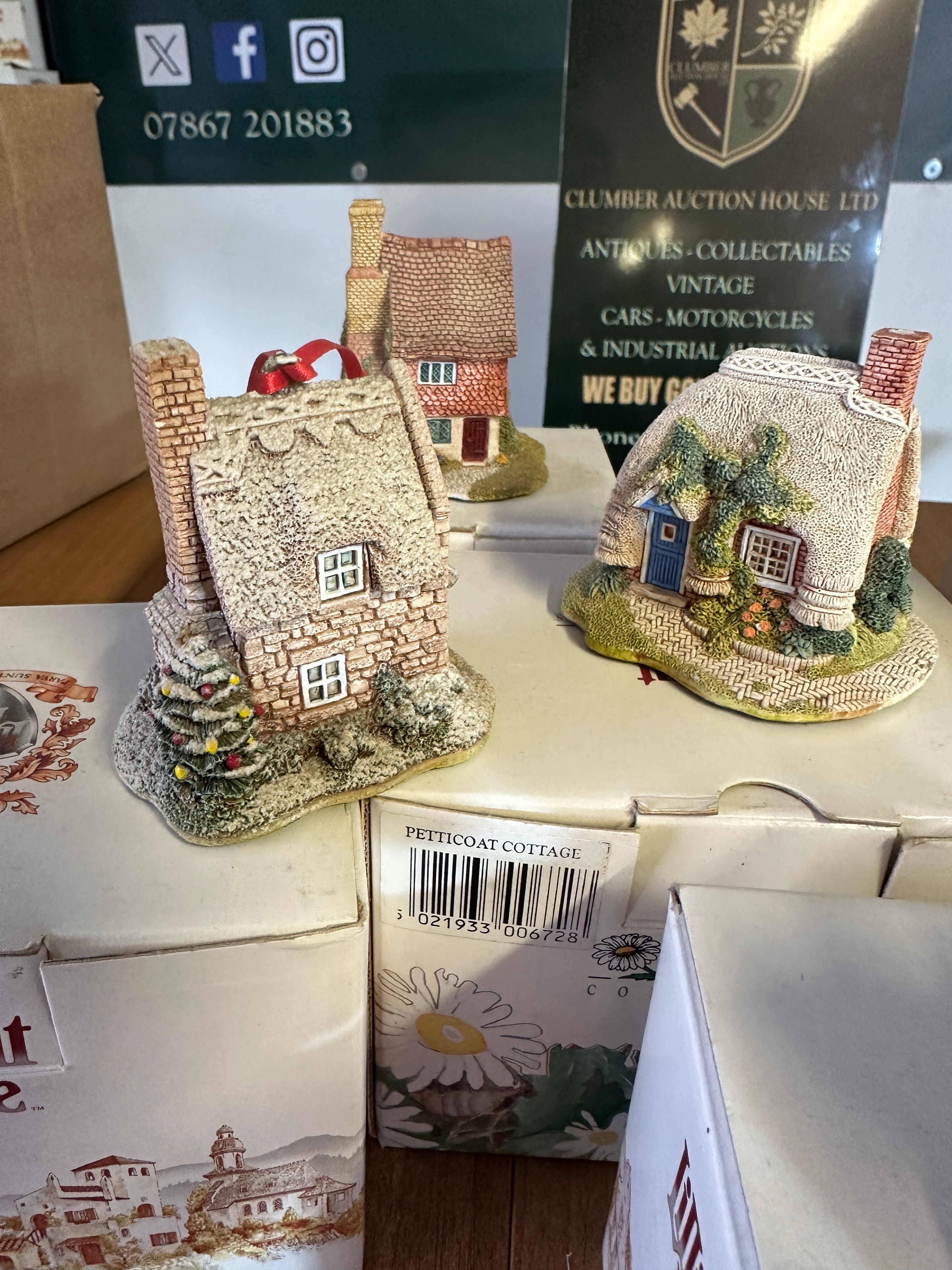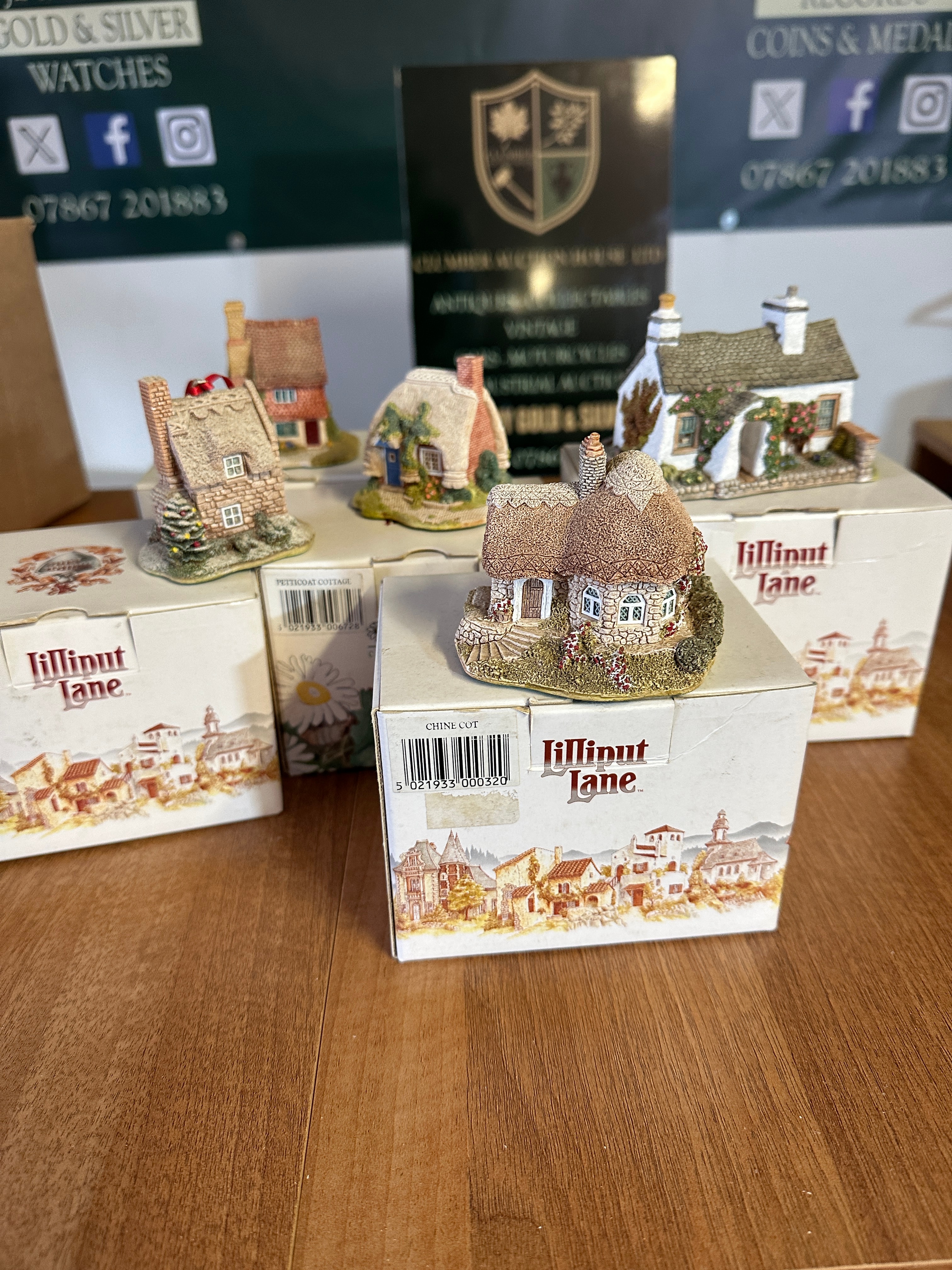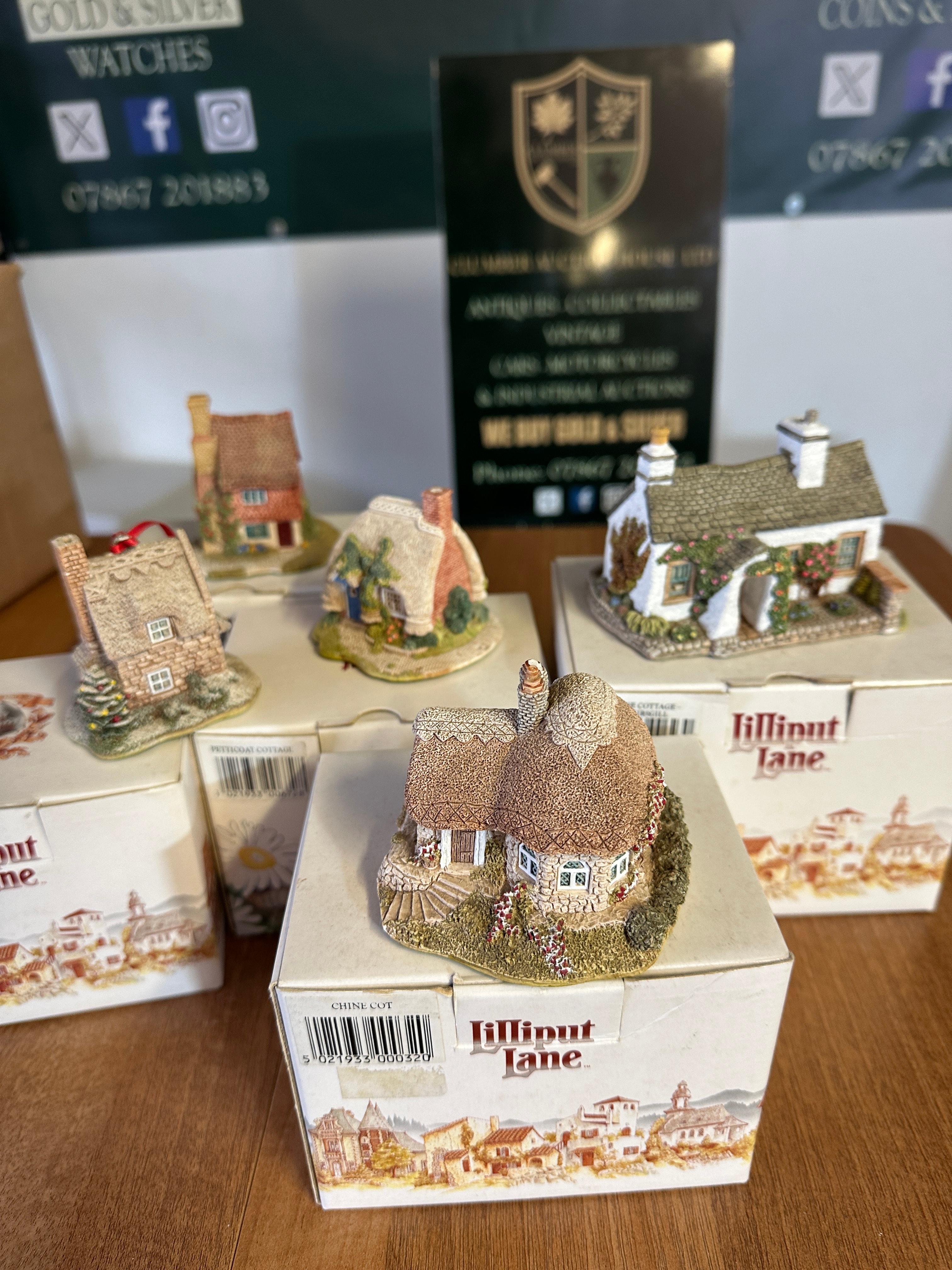 A group of five Lilliput Lane miniature collectible cottage figurines. Each is crafted from hand-painted resin or a similar composite material, depicting rustic, traditional English cottage styles with detailed architecture including thatched or tiled roofs, stone or brick effect walls, and decorative foliage. The collection includes specific named cottages such as ‘PETTICOAT COTTAGE,’ ‘ROSE COTTAGE – SKIRSGILL,’ and ‘CHINE COT’. All five figurines are presented with their original ‘Lilliput Lane’ branded boxes.