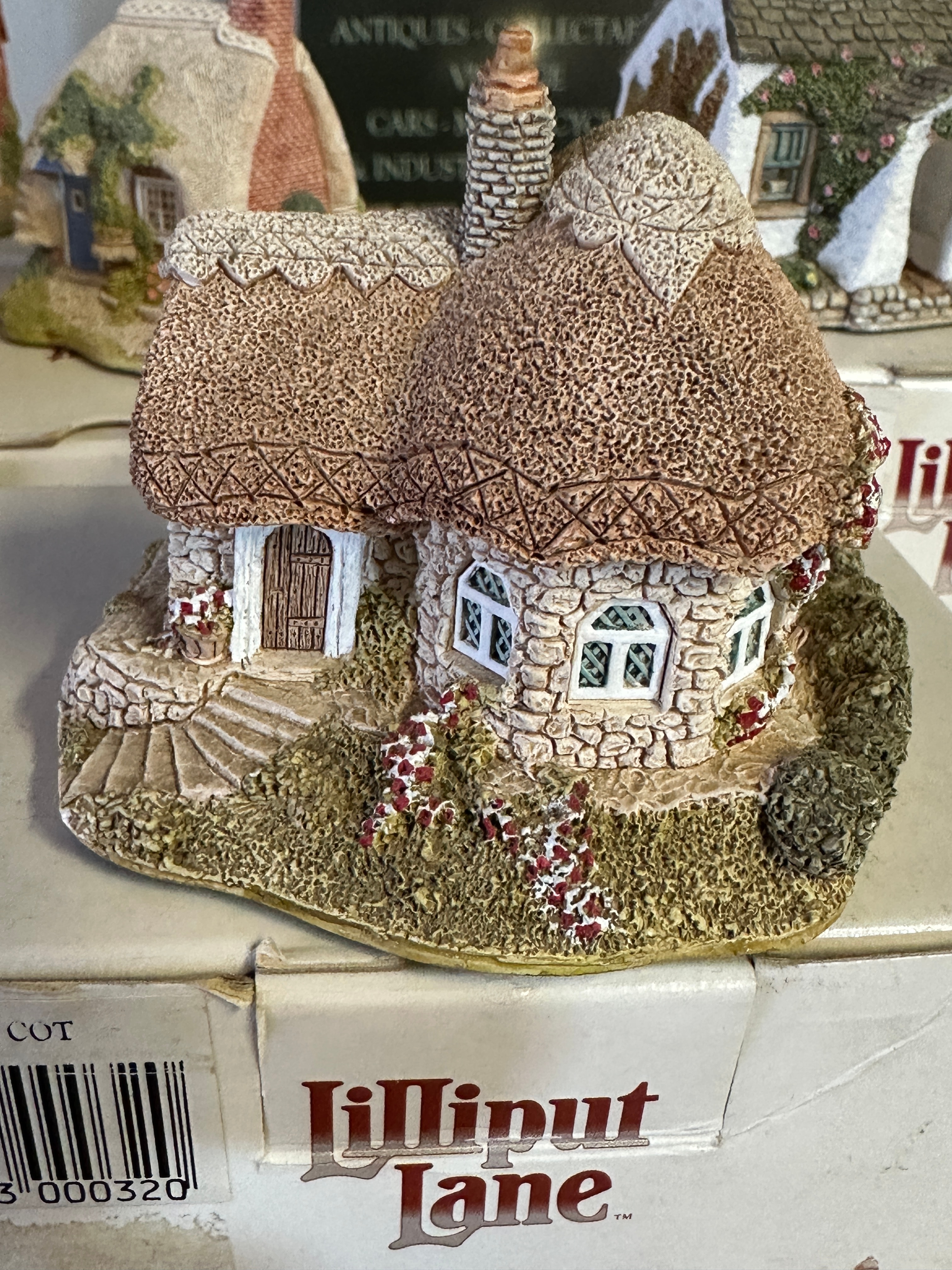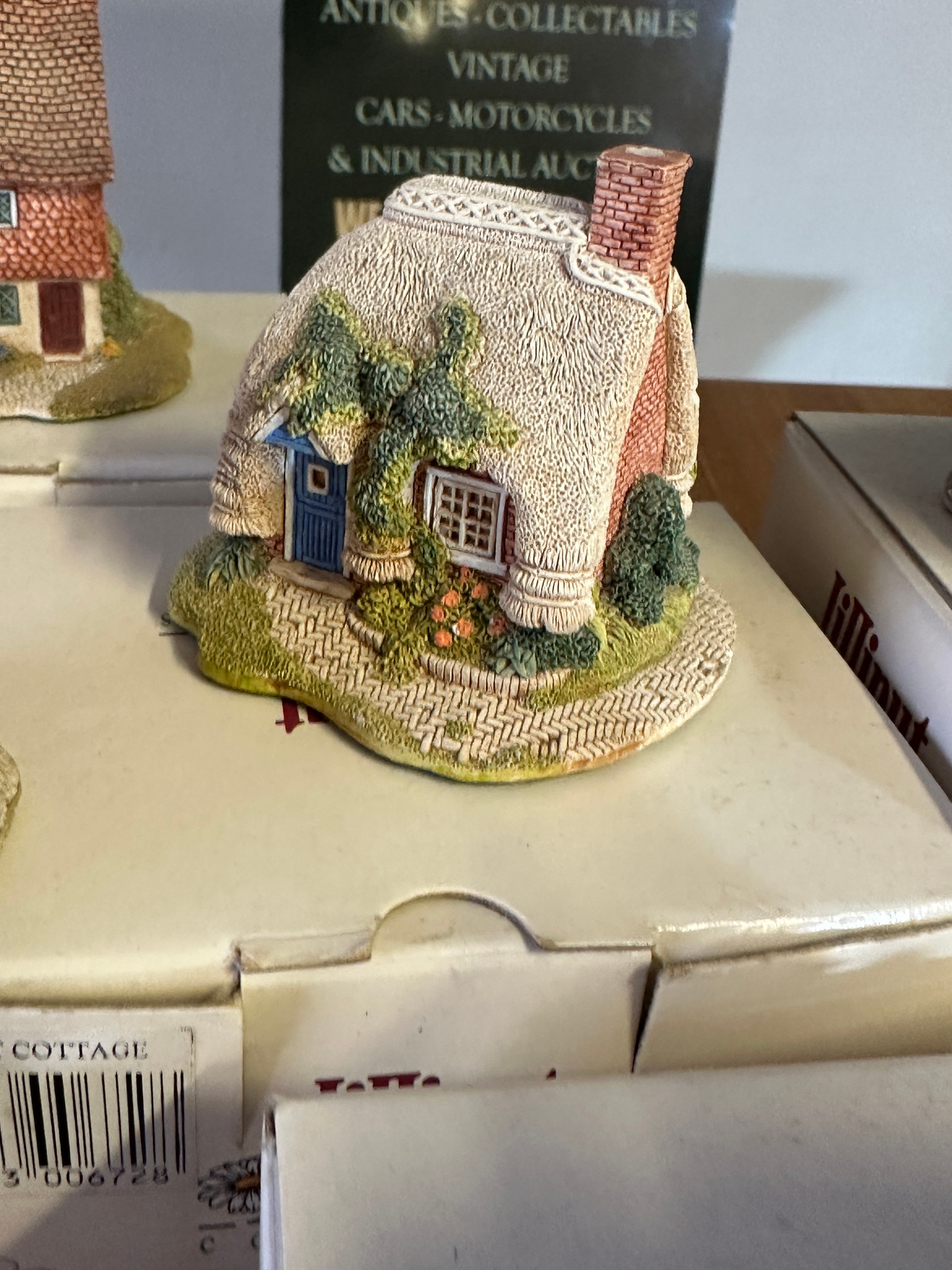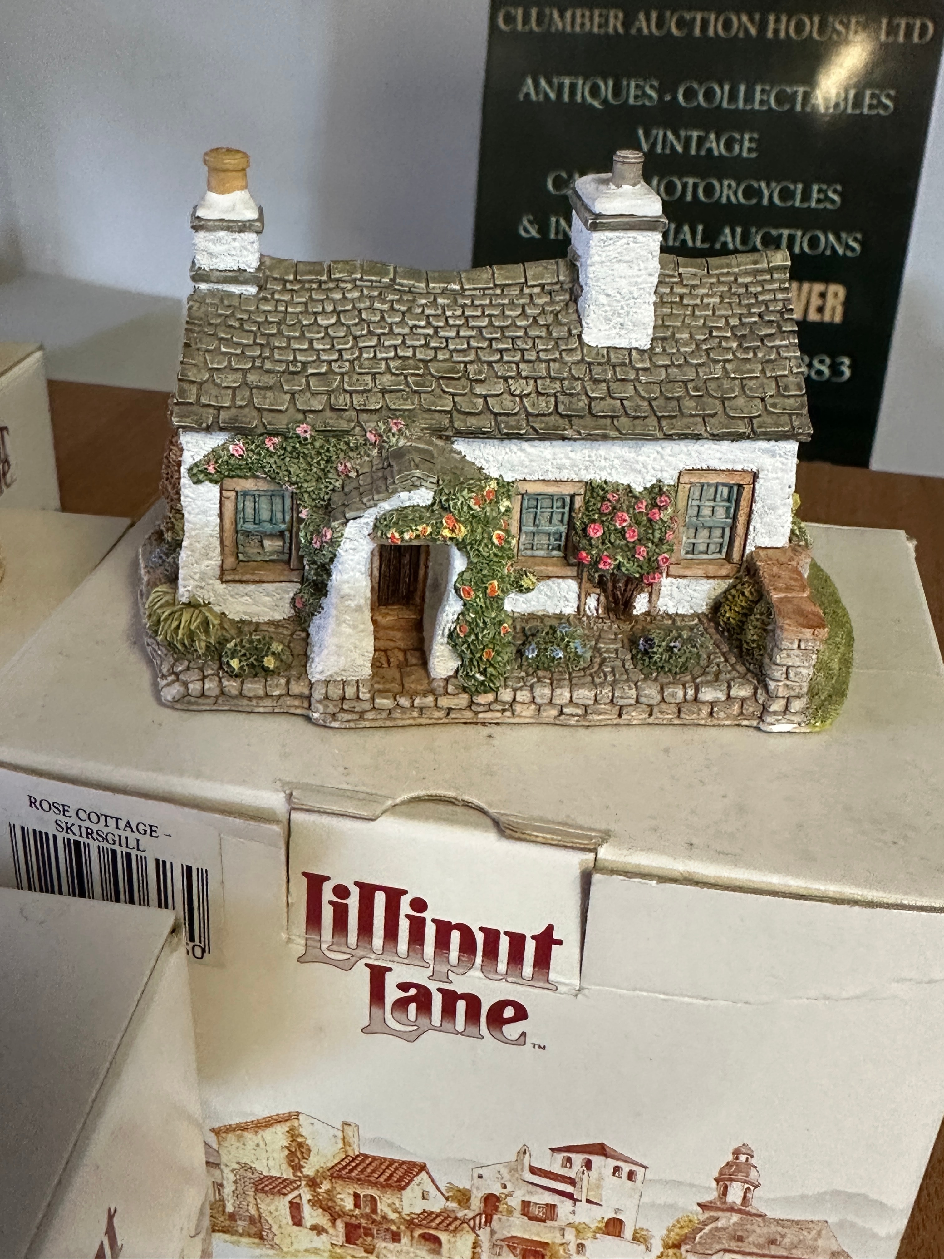 A group of five Lilliput Lane miniature collectible cottage figurines. Each is crafted from hand-painted resin or a similar composite material, depicting rustic, traditional English cottage styles with detailed architecture including thatched or tiled roofs, stone or brick effect walls, and decorative foliage. The collection includes specific named cottages such as ‘PETTICOAT COTTAGE,’ ‘ROSE COTTAGE – SKIRSGILL,’ and ‘CHINE COT’. All five figurines are presented with their original ‘Lilliput Lane’ branded boxes.